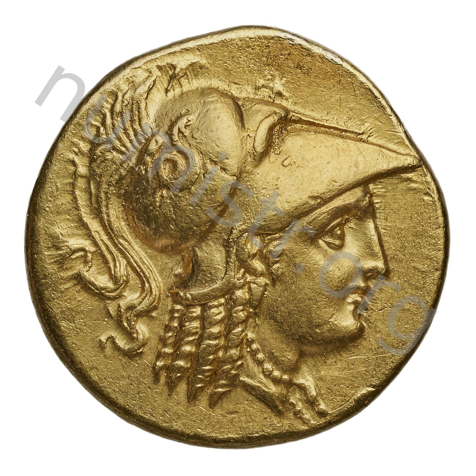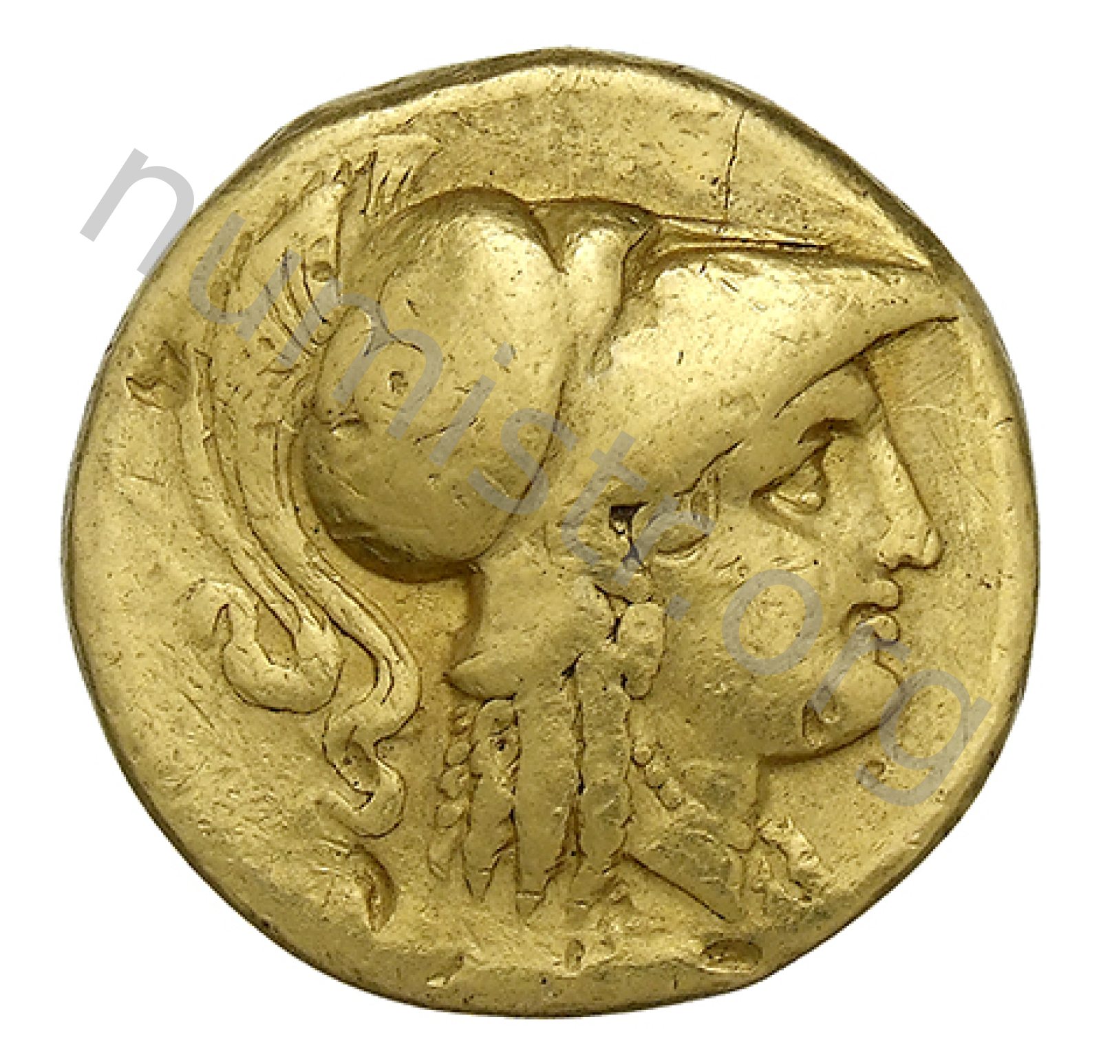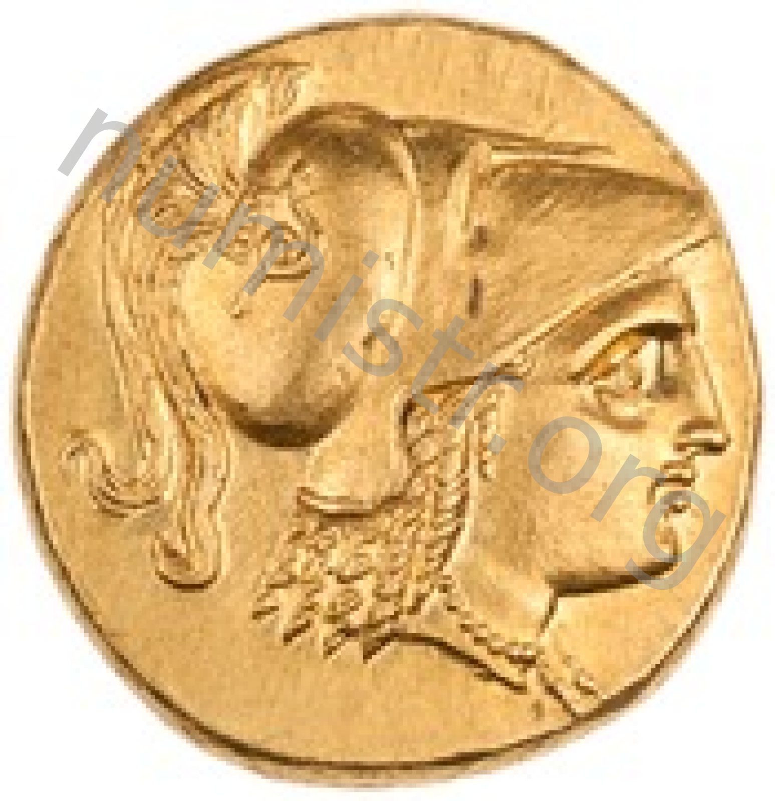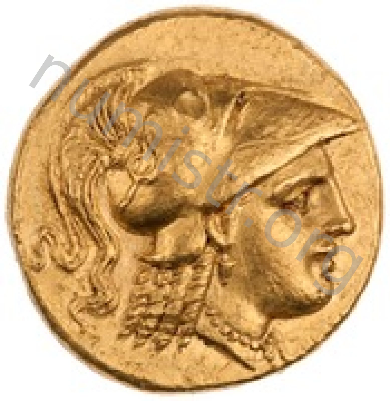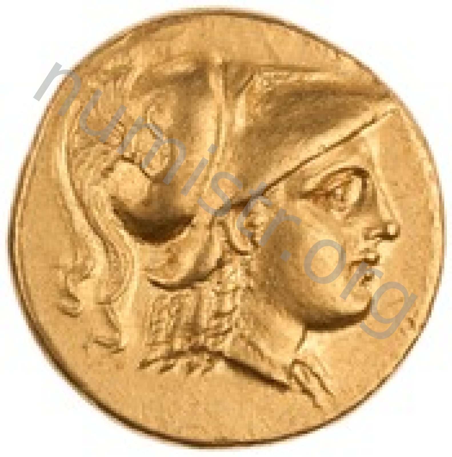 Head of Athena right wearing Corinthian helmet with crest -[en]