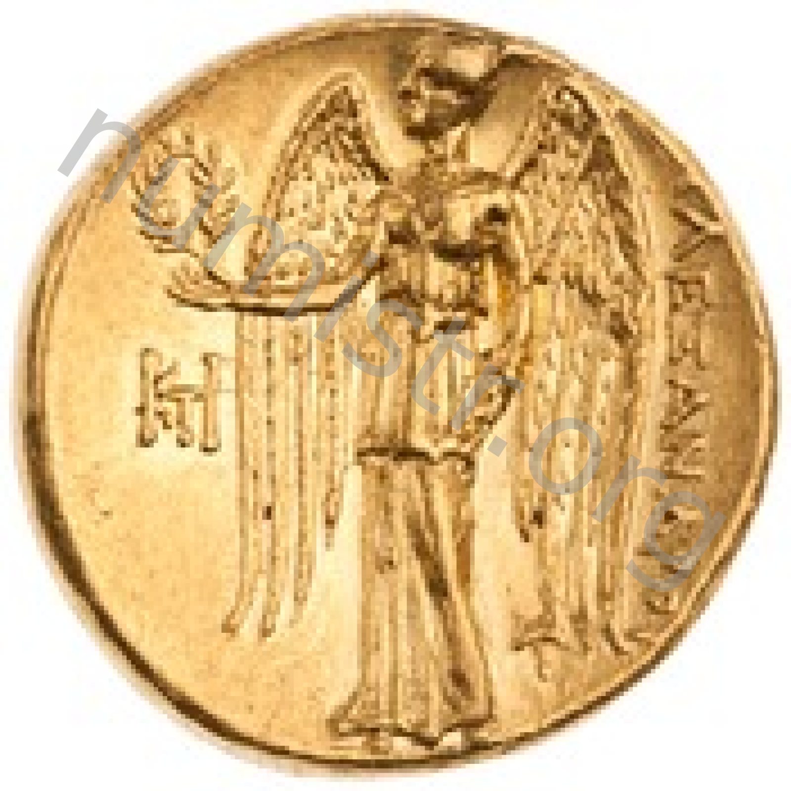 Nike standing left holding wreath in right hand and stylis in her left hand -[en]