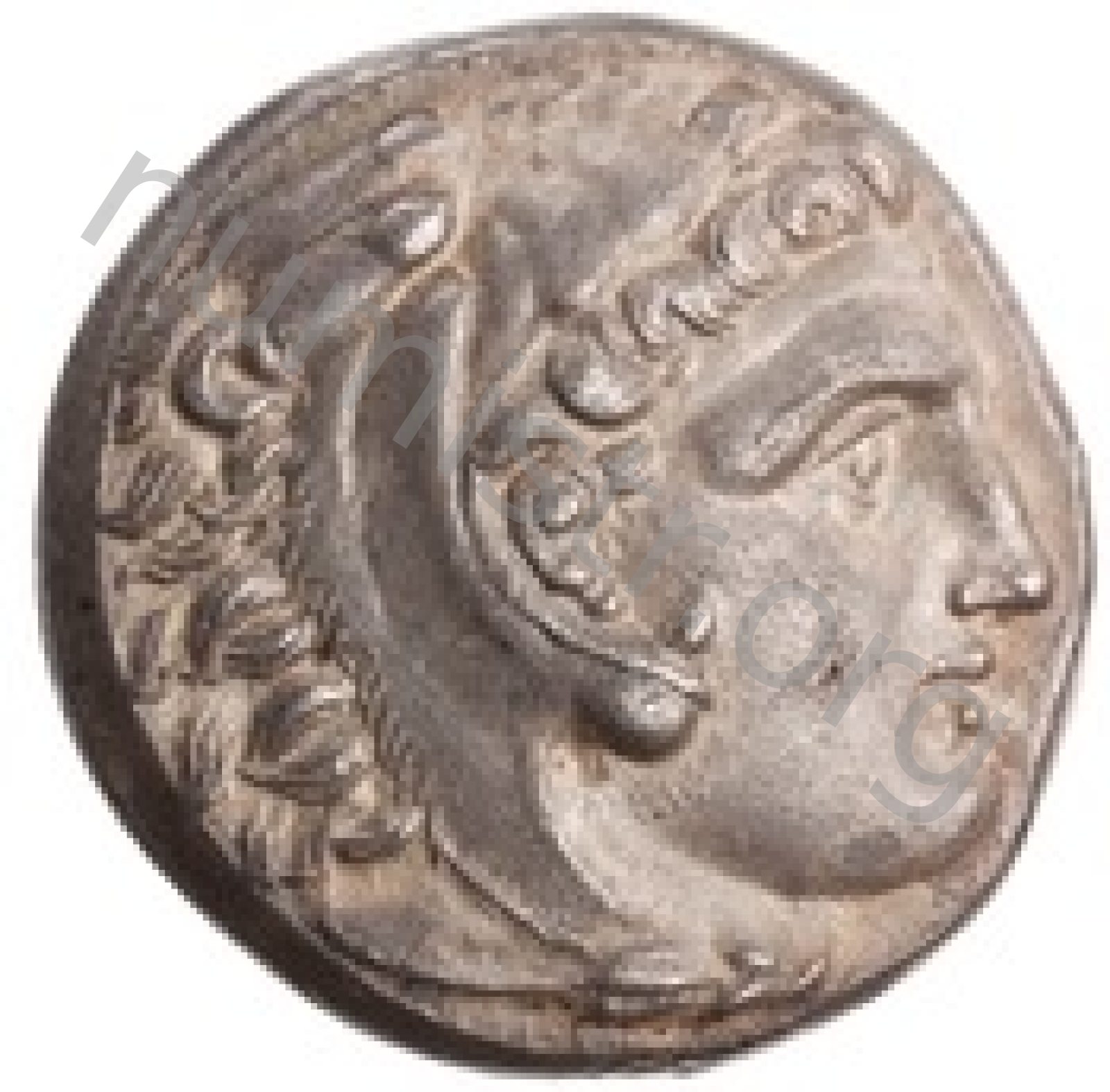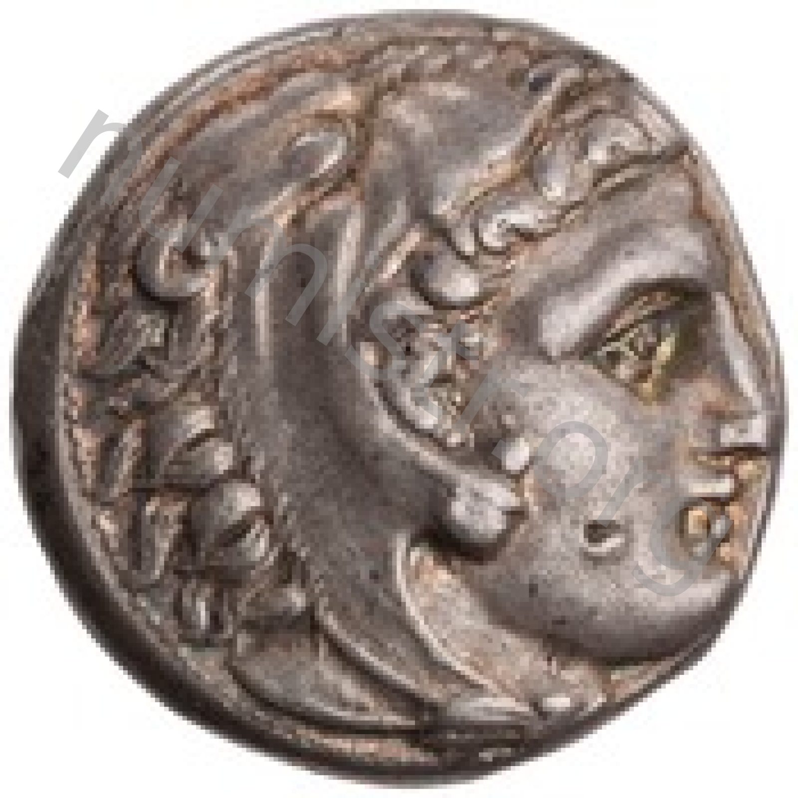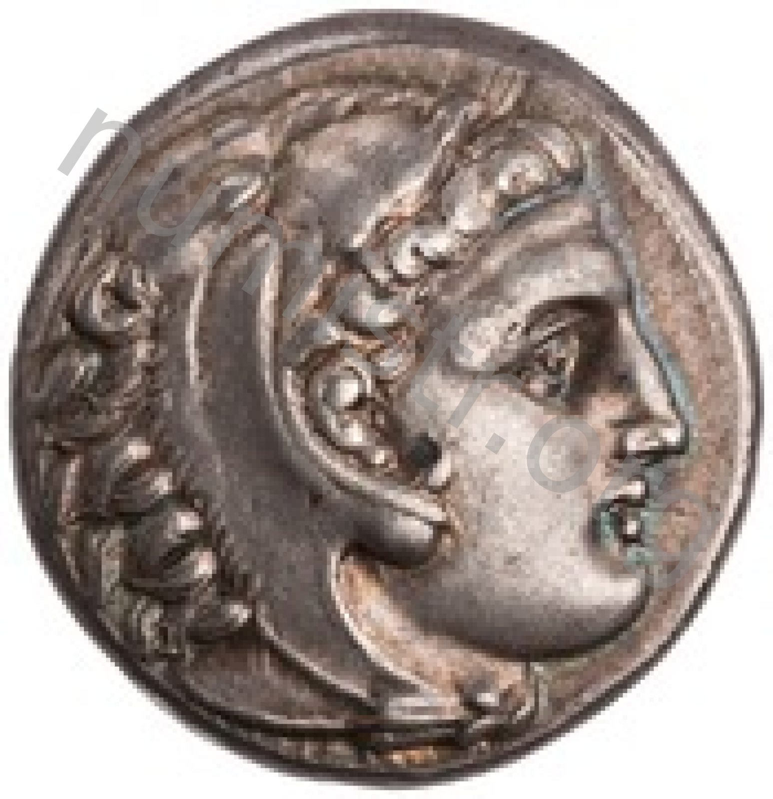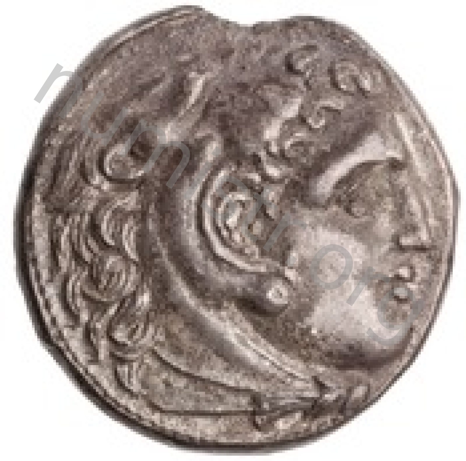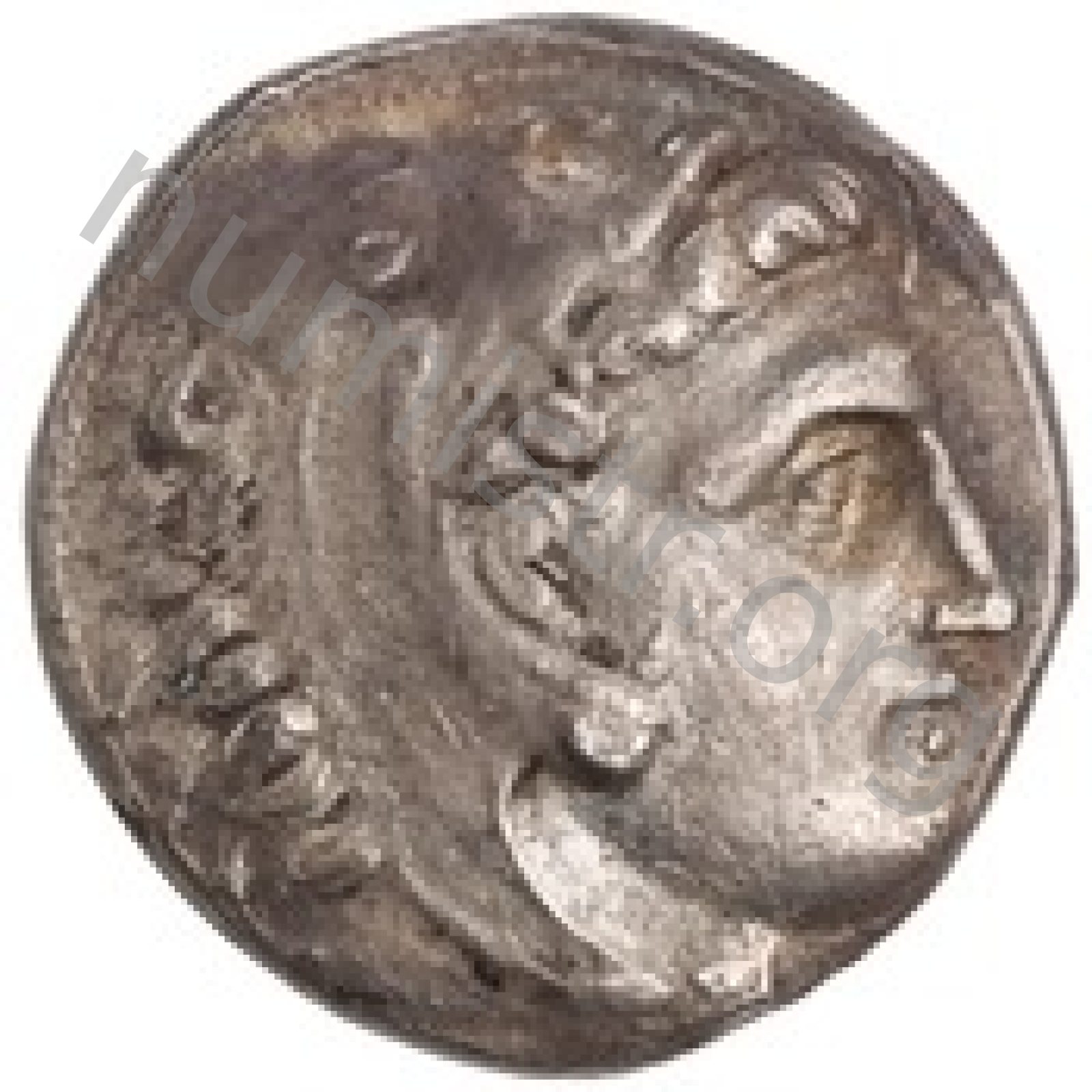 Head of beardless Heracles right wearing lion skin headdress -[en]