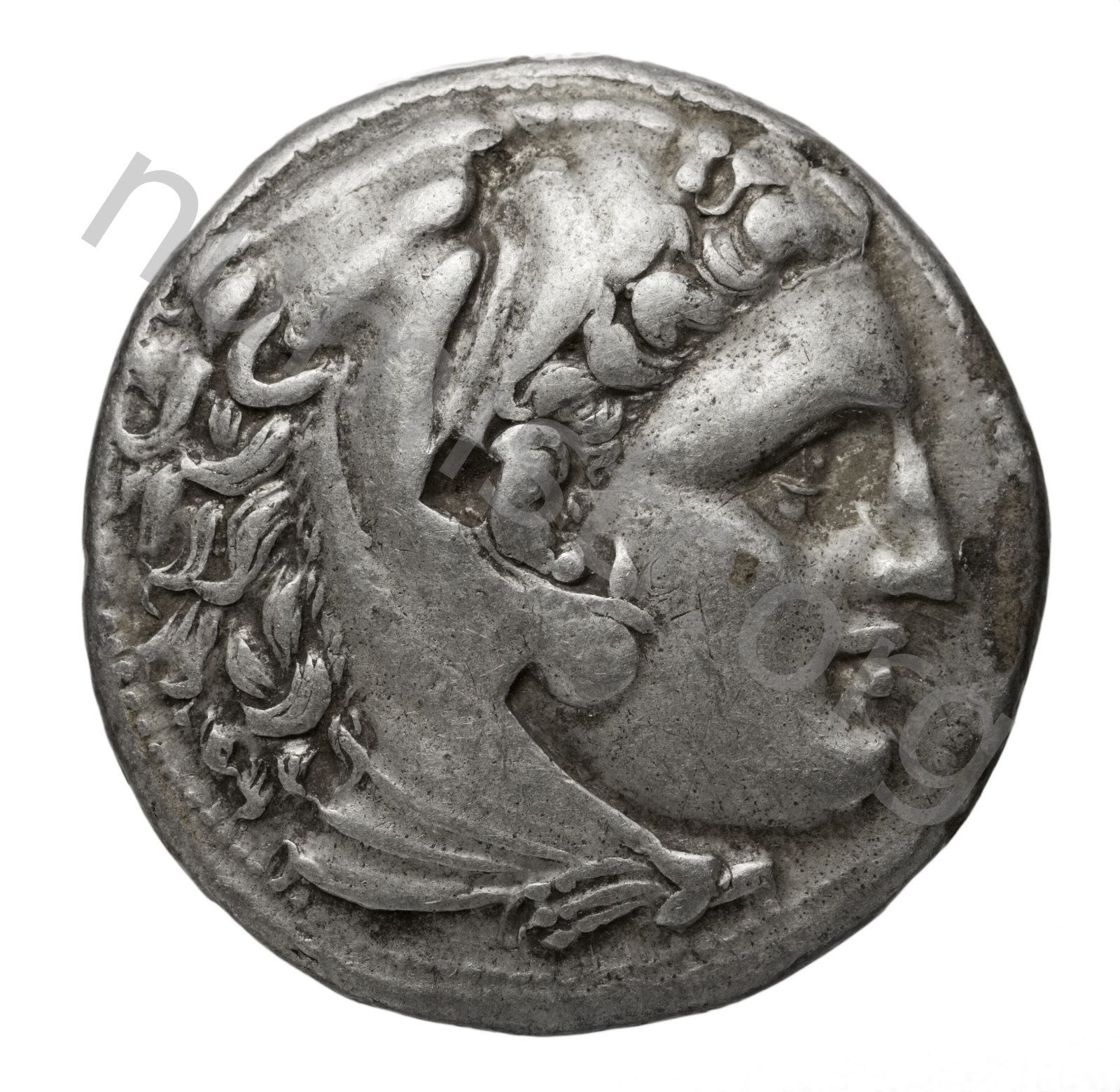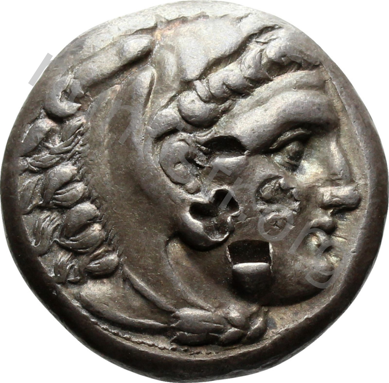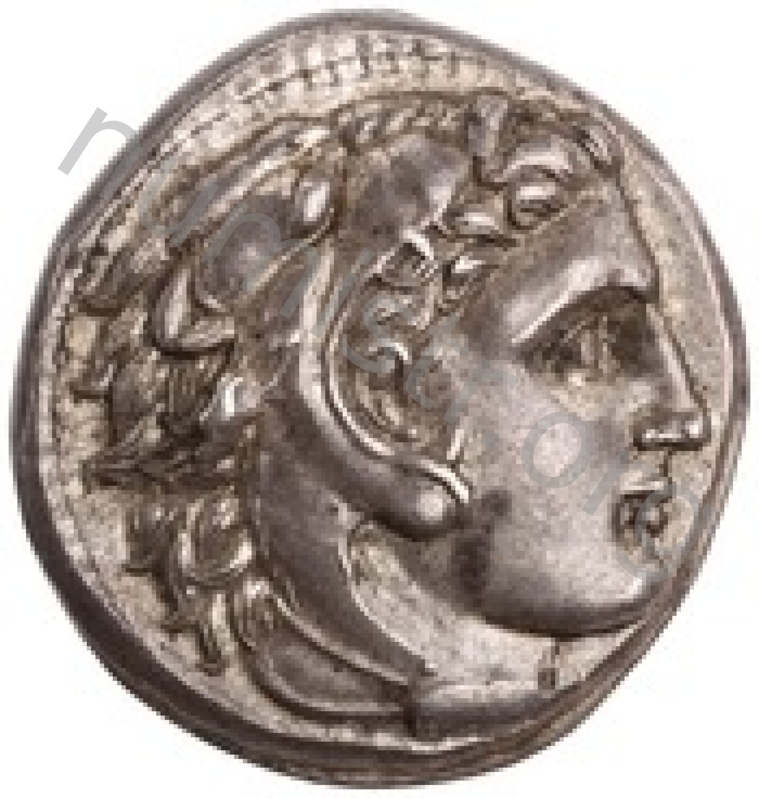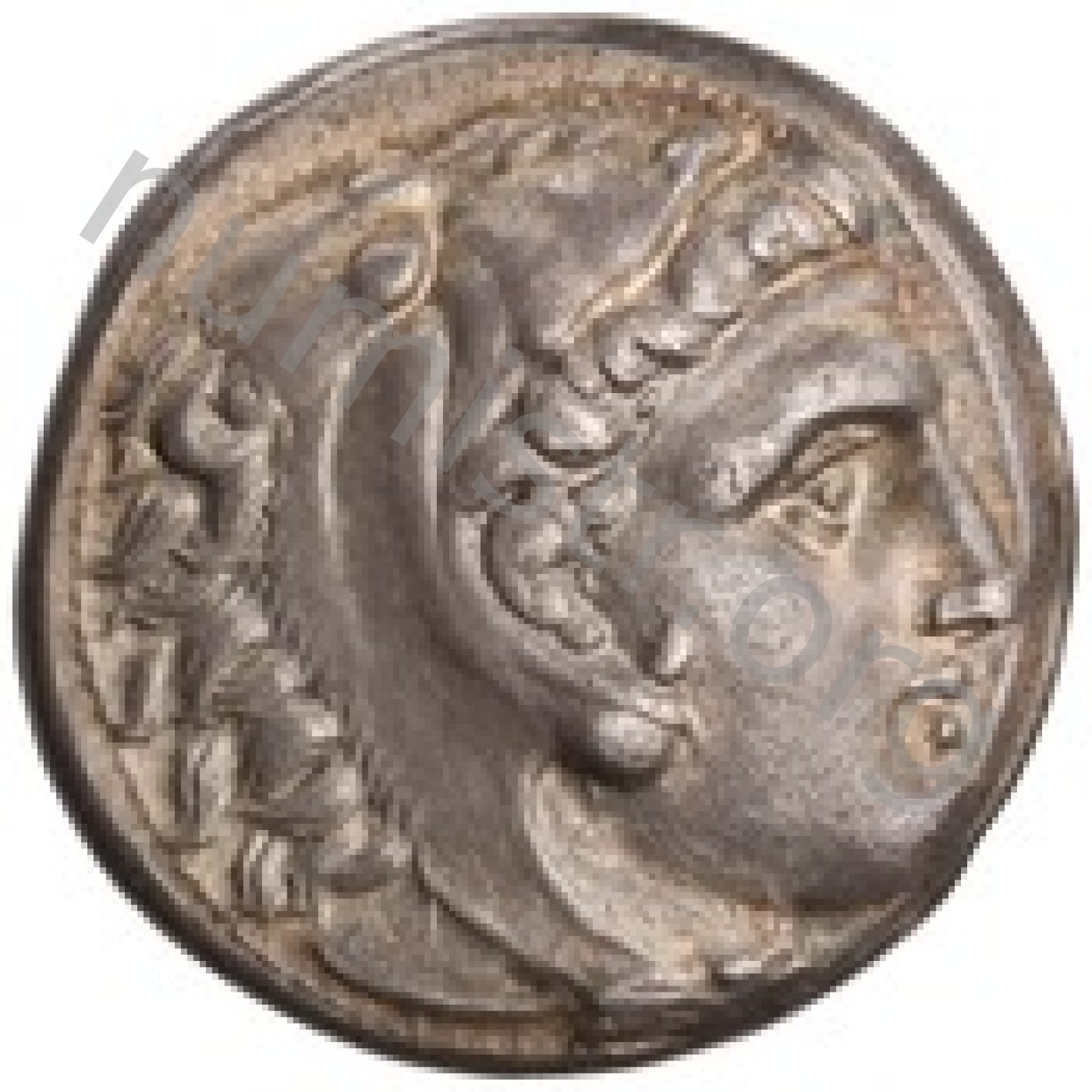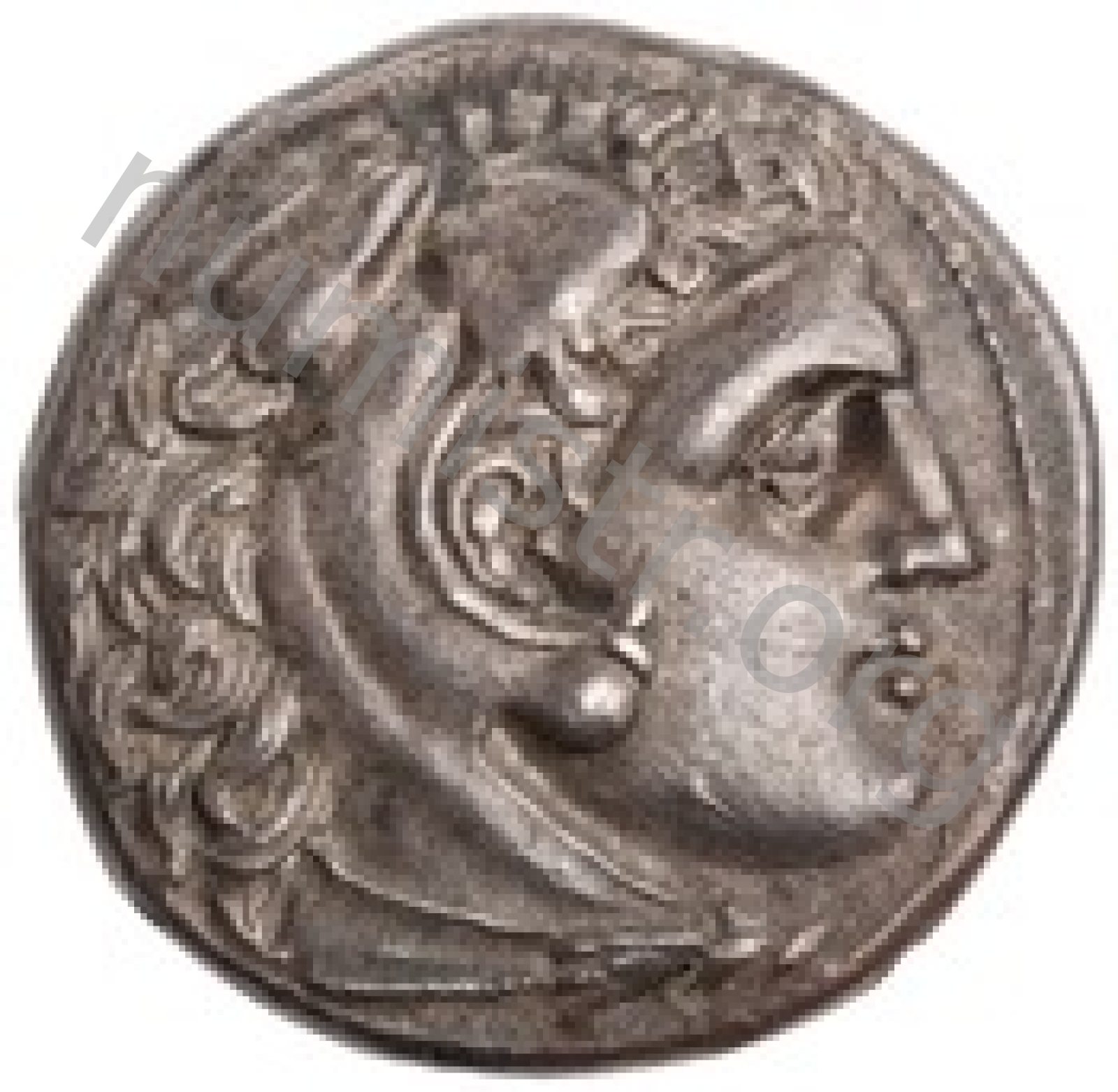 Head of beardless Heracles right wearing lion skin headdress -[en]