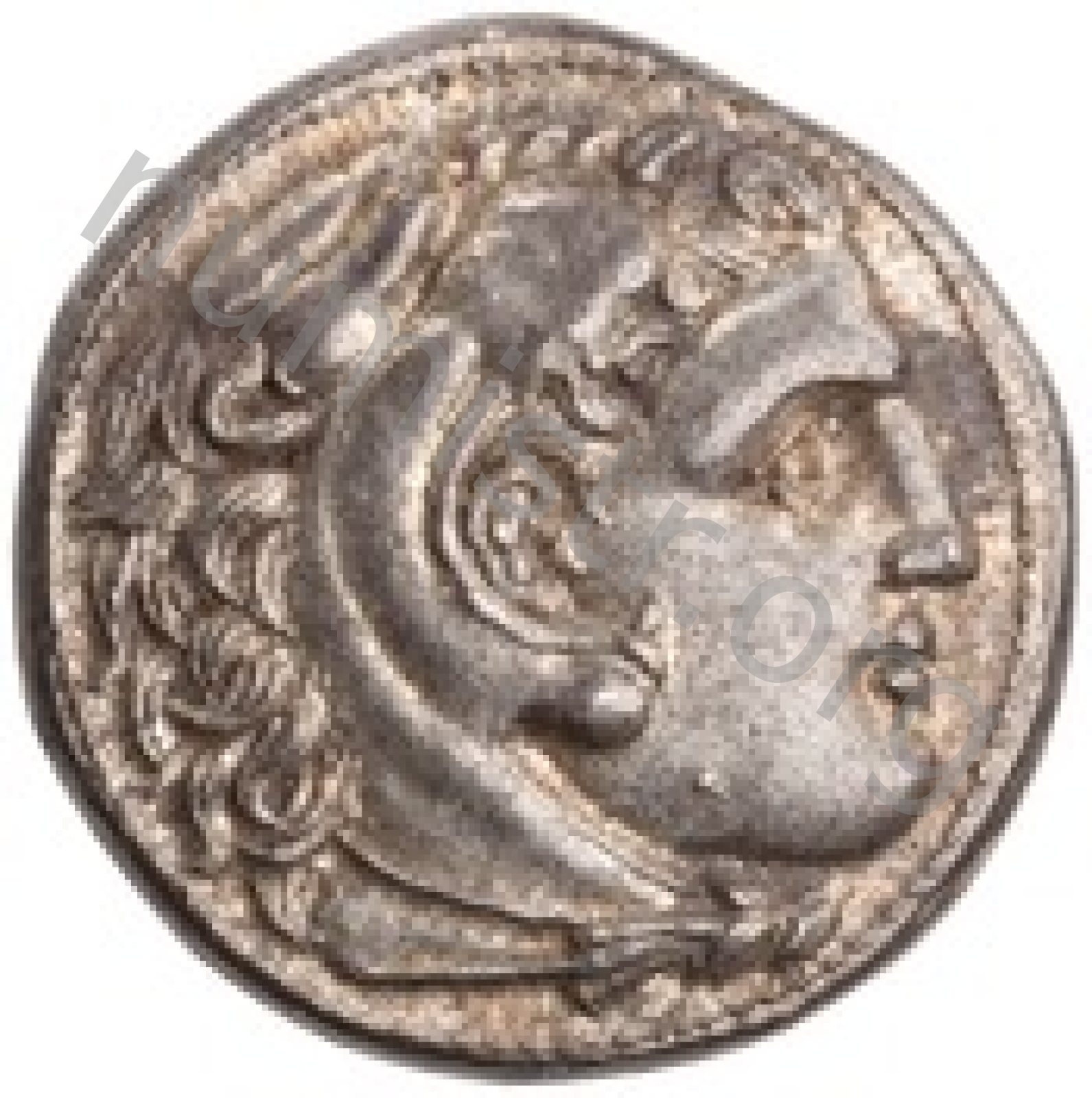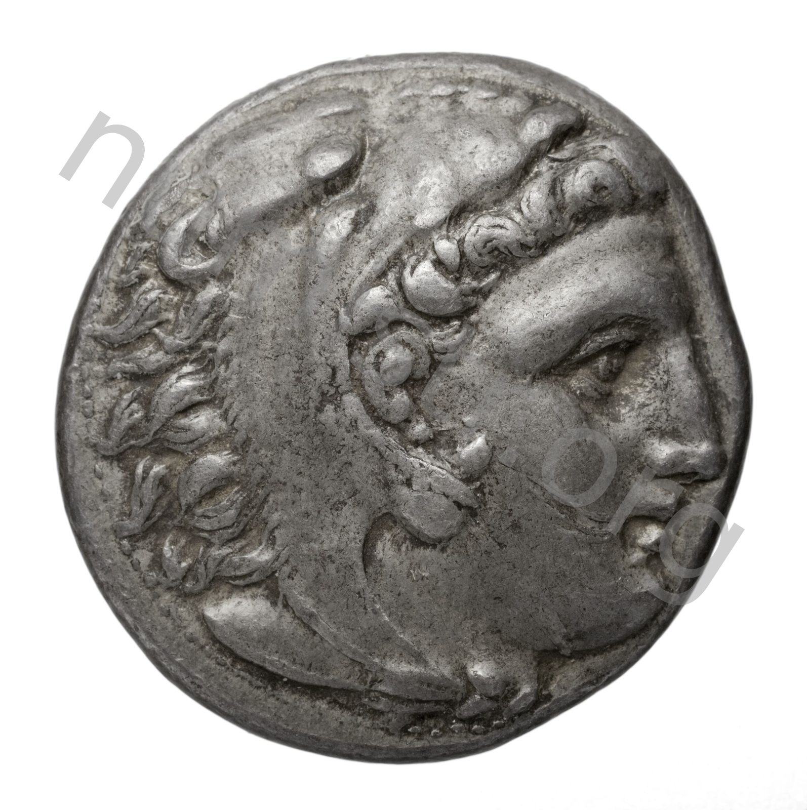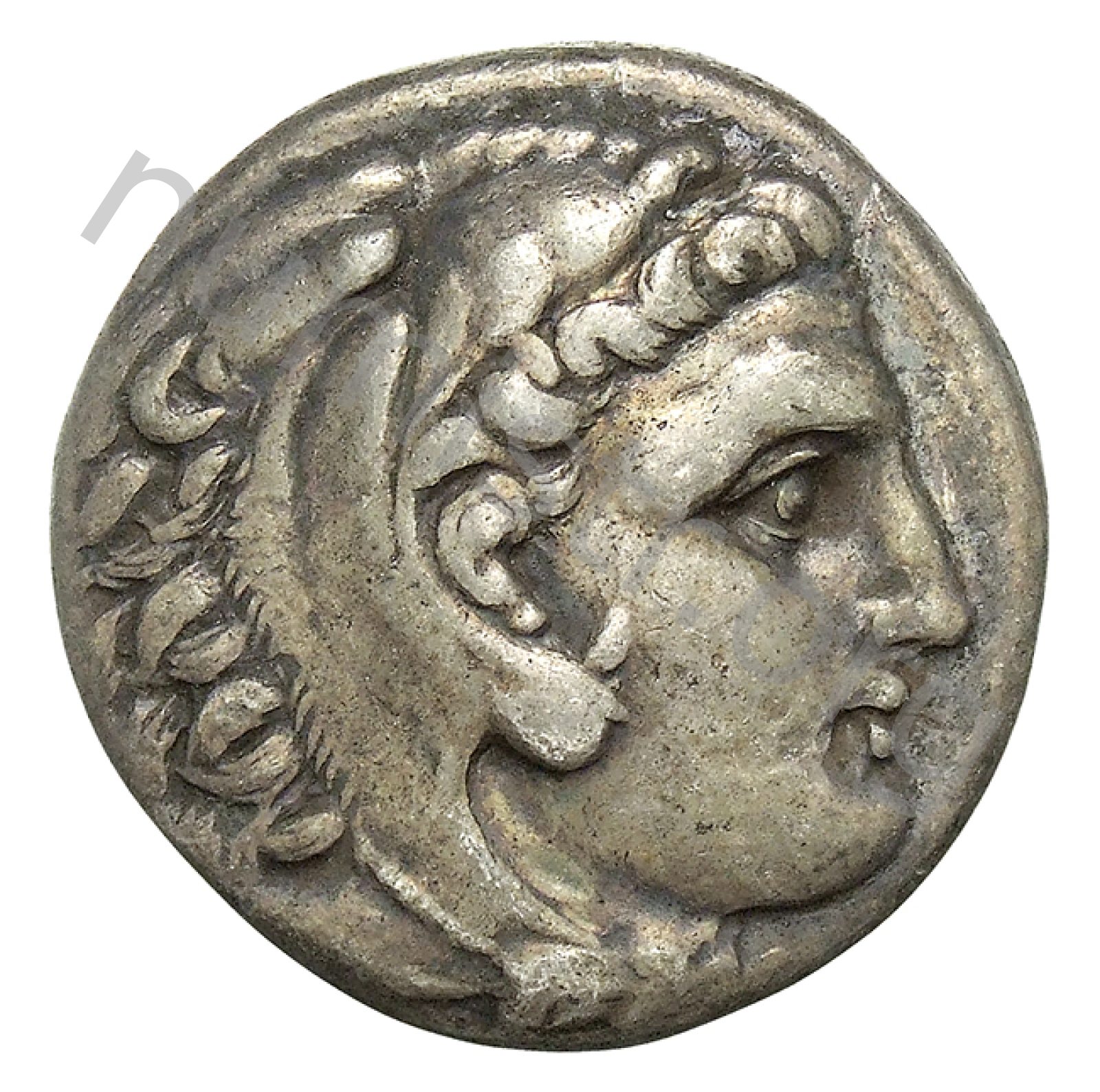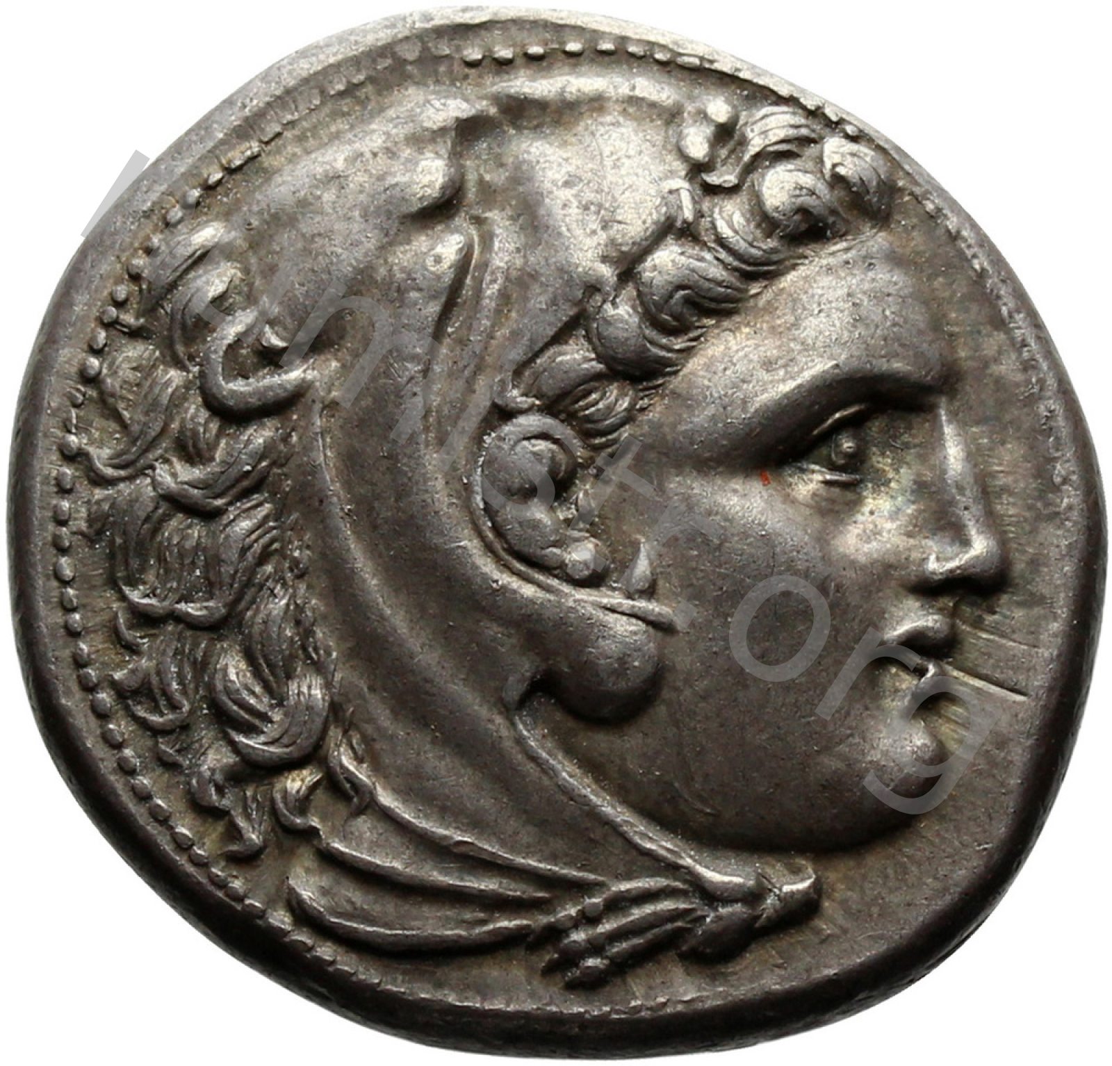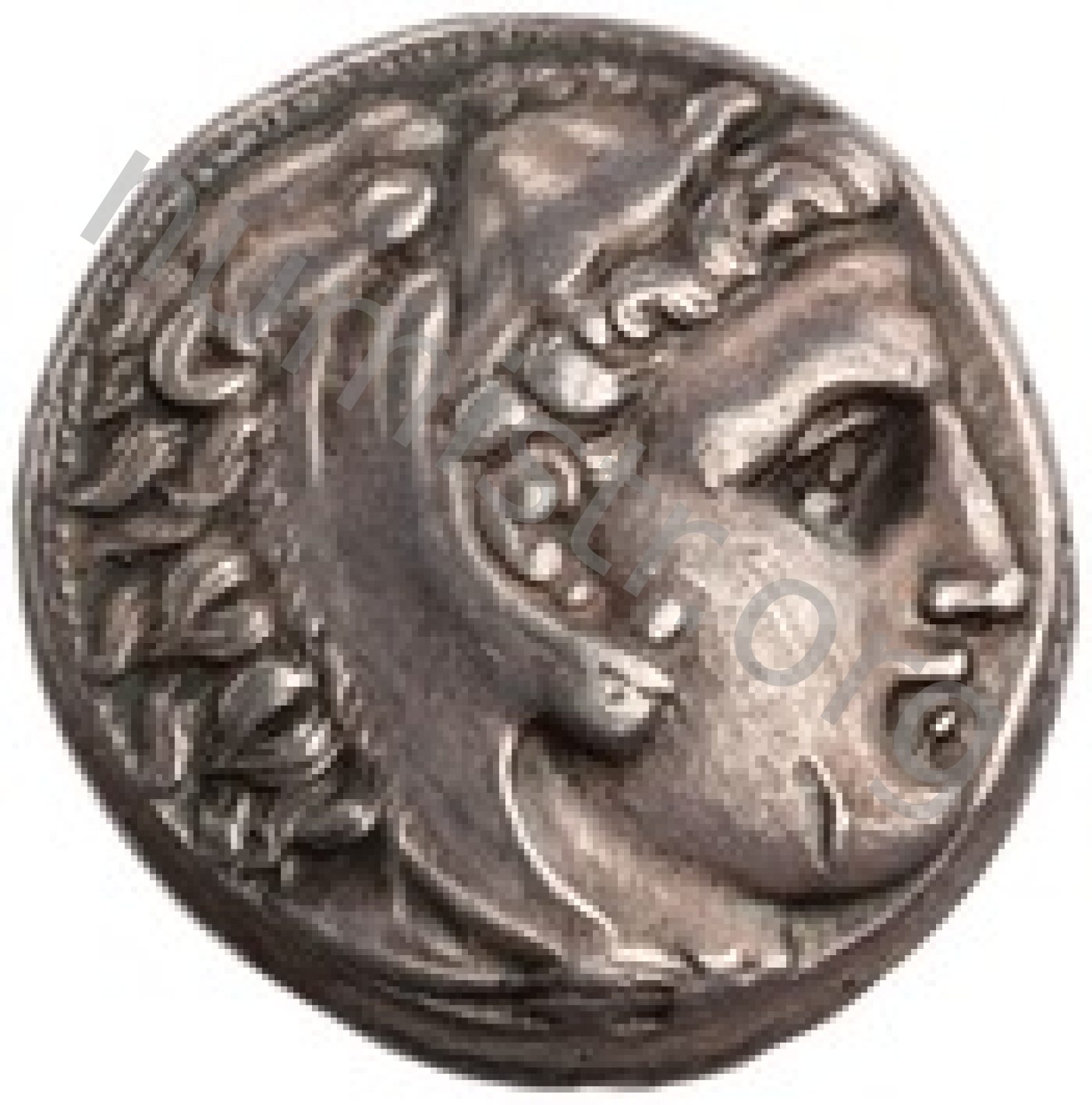 Head of beardless Heracles right wearing lion skin headdress -[en]