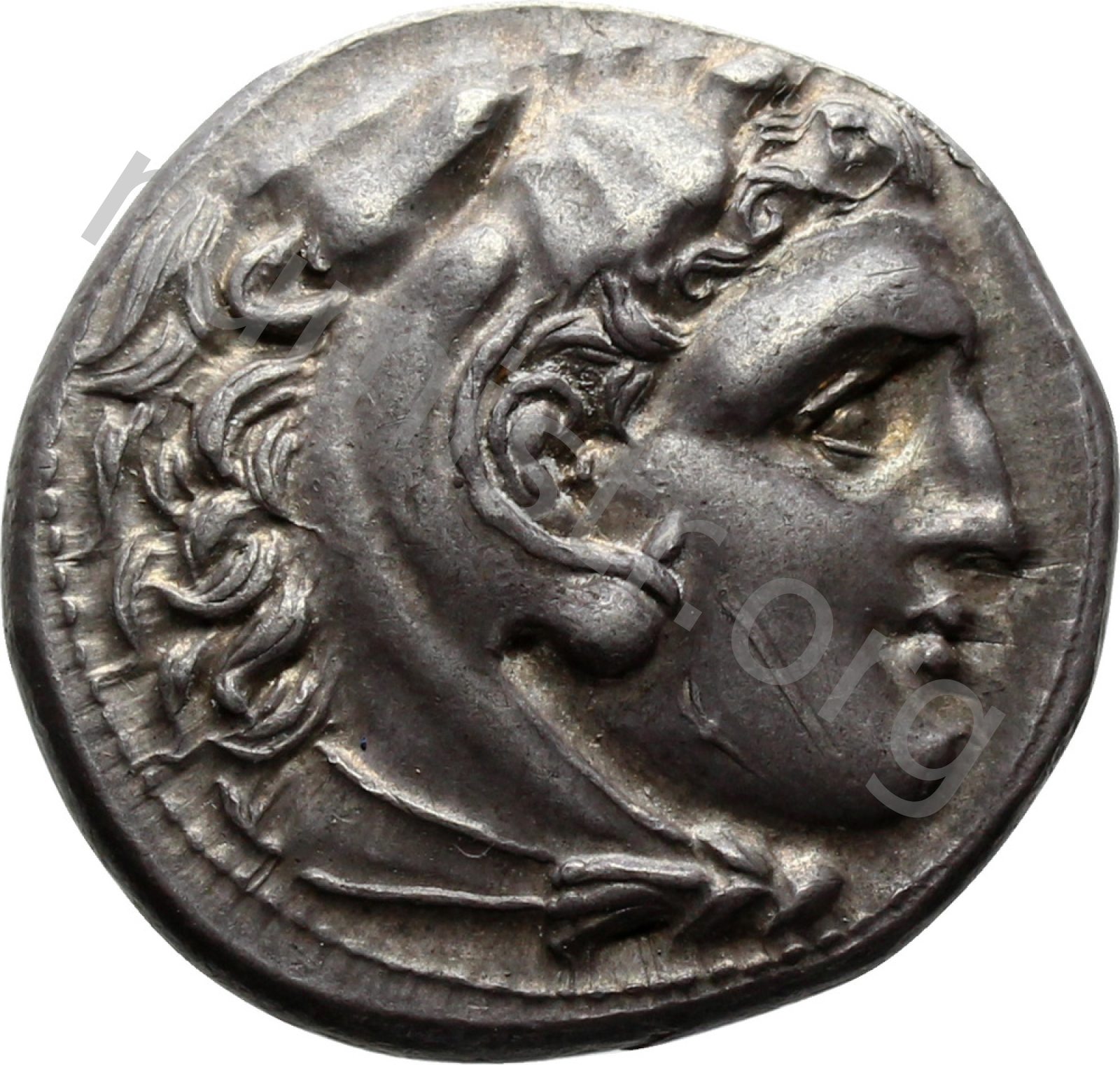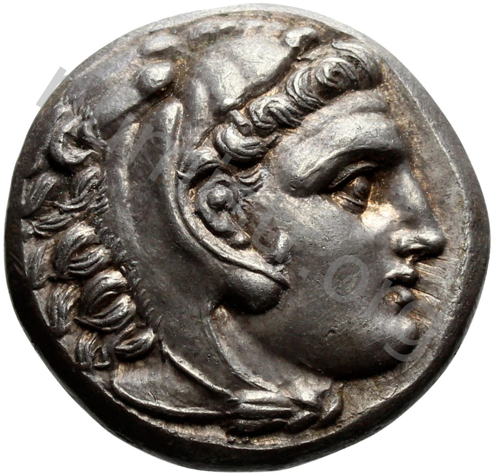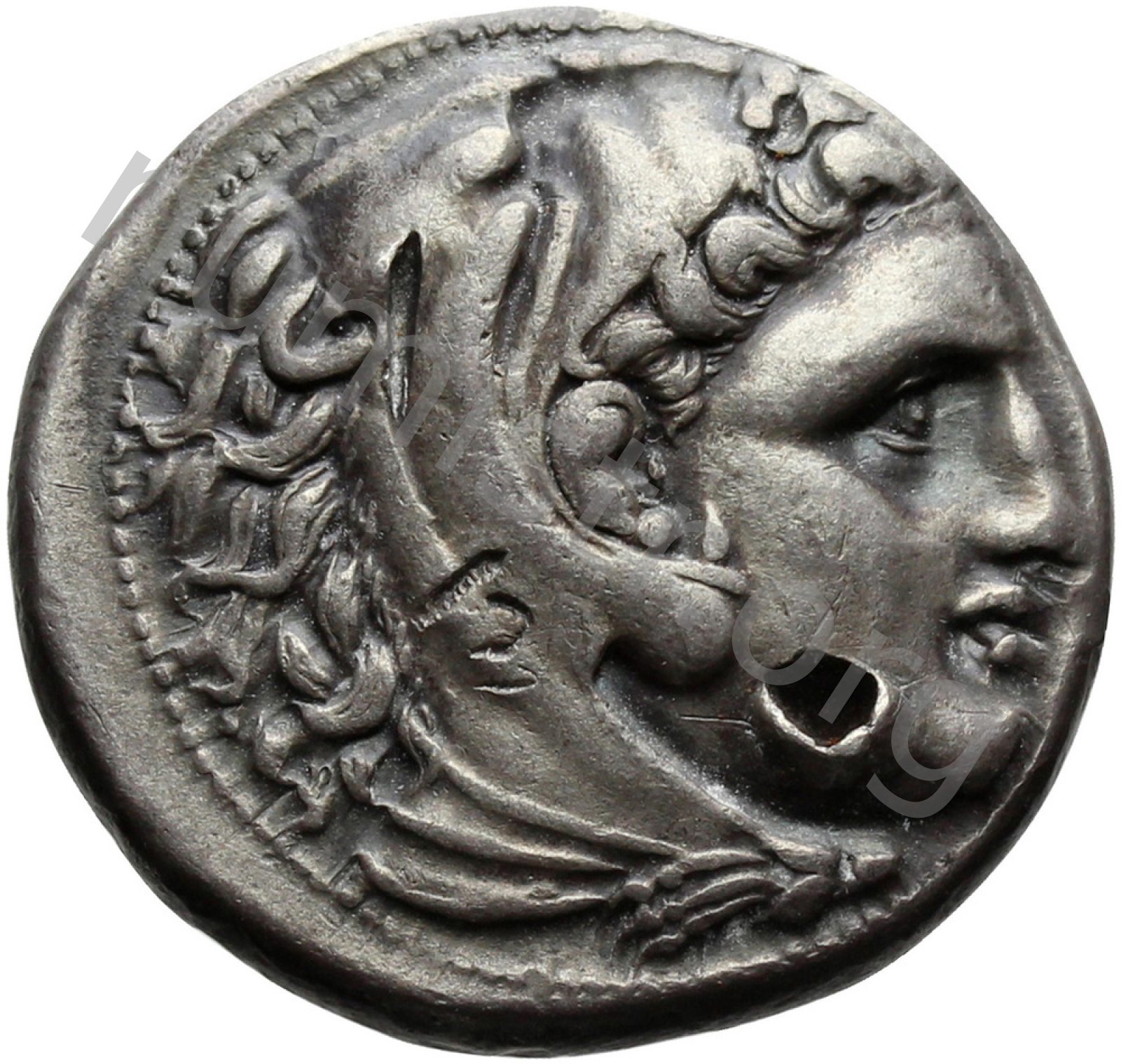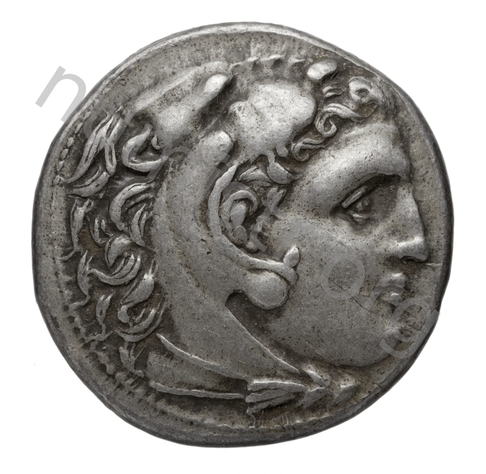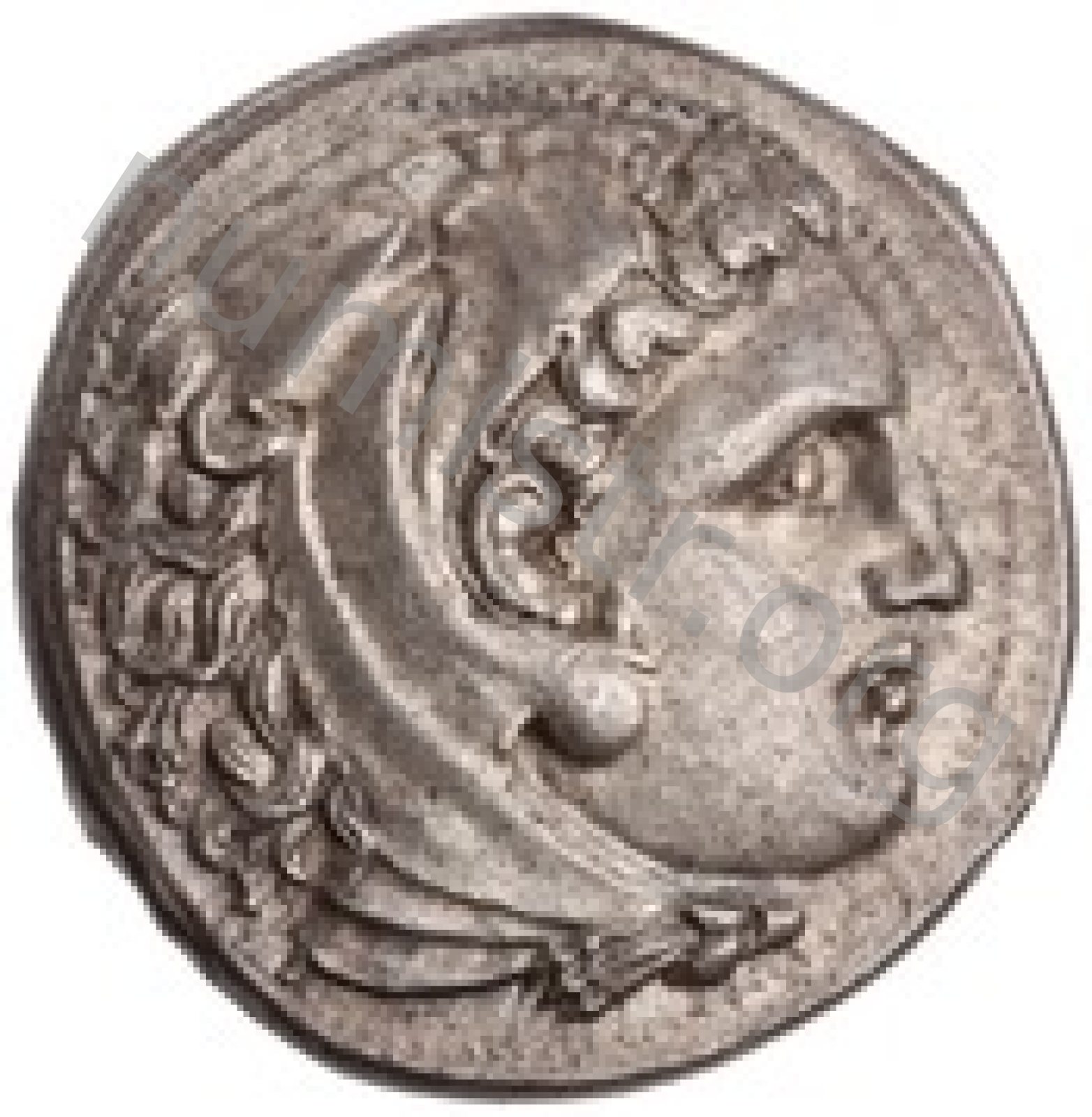 Head of beardless Heracles right wearing lion skin headdress -[en]