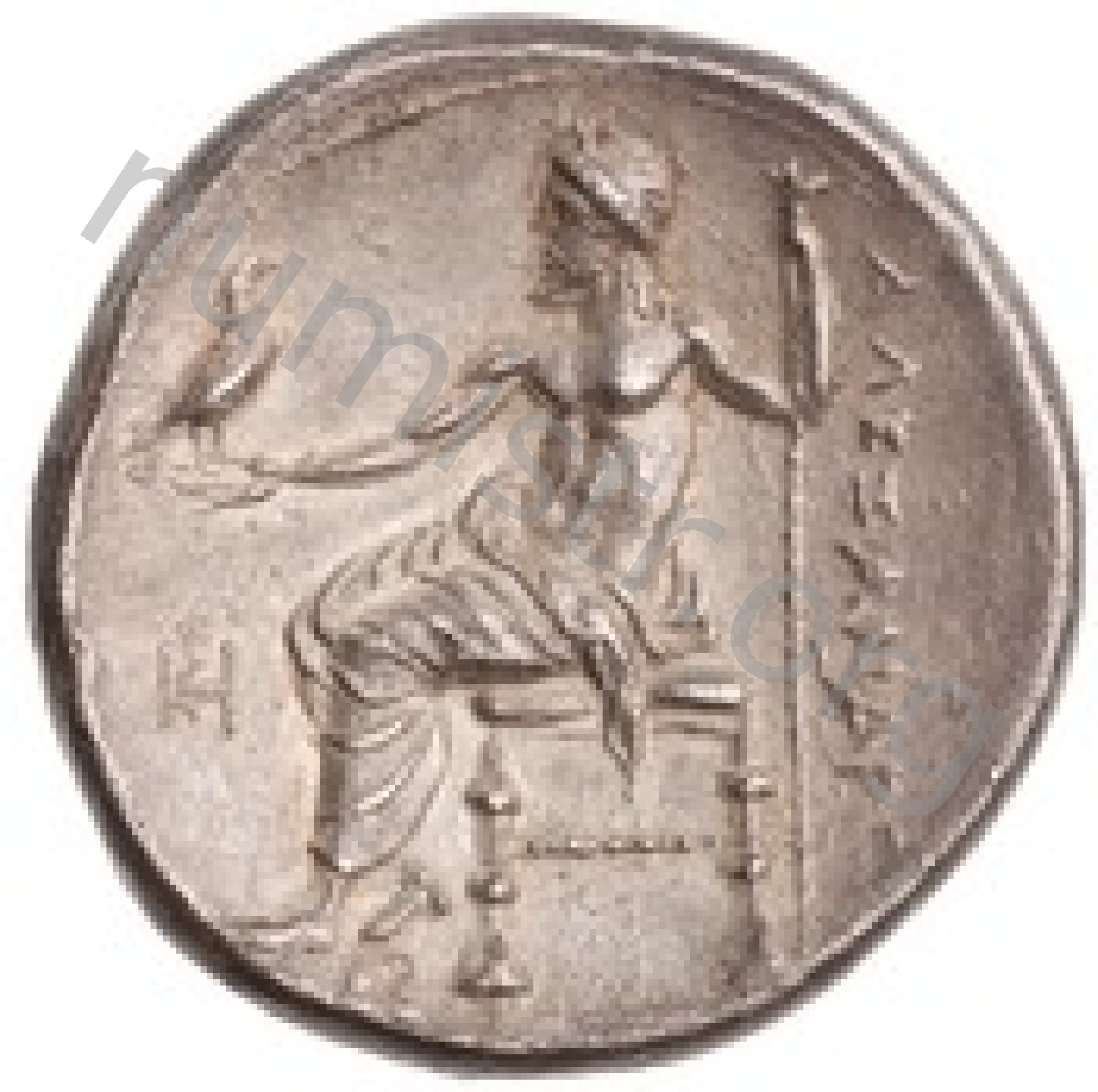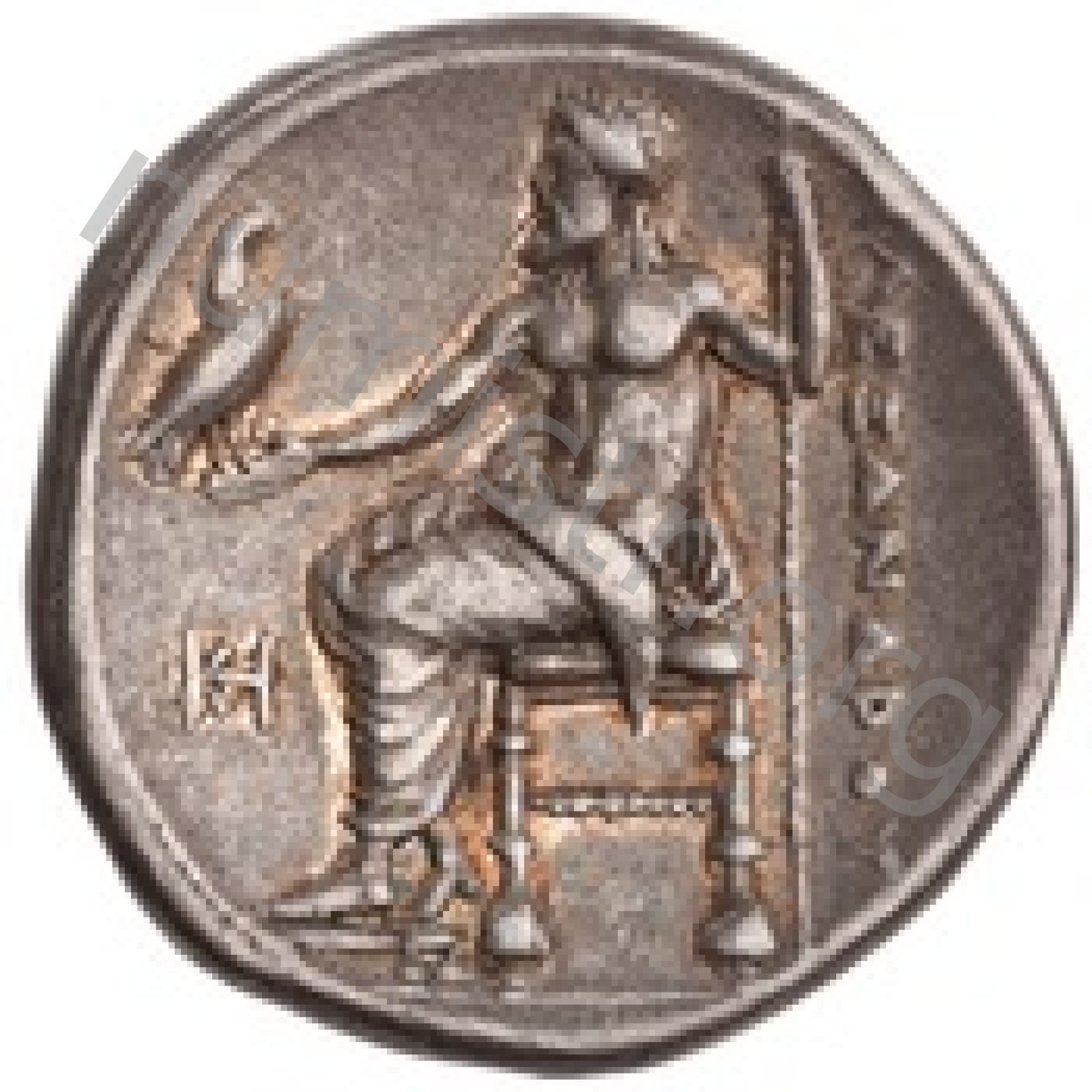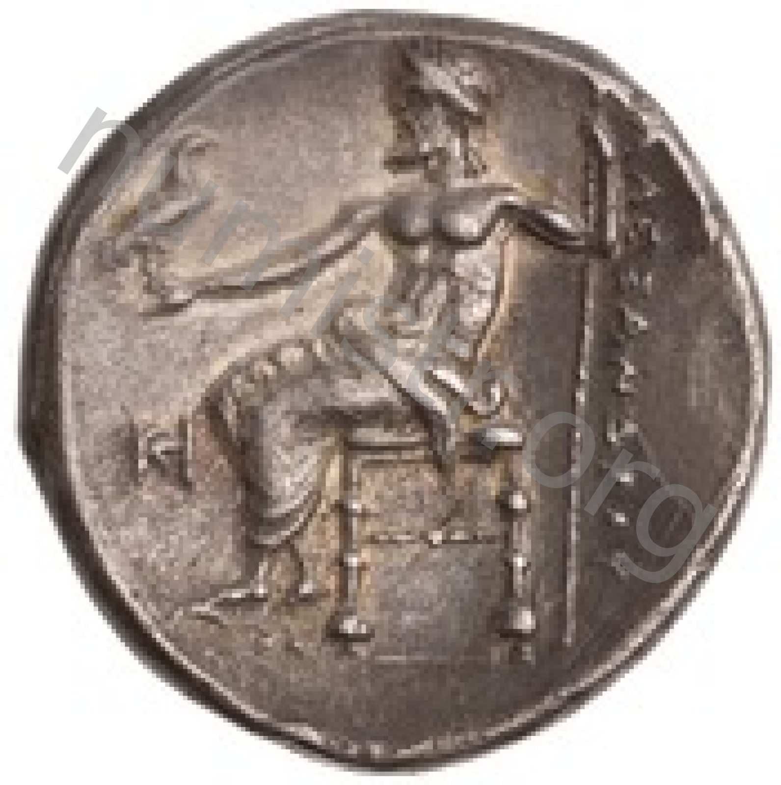 Zeus seated on stool-throne left eagle on outstretched right hand sceptre in left hand -[en]