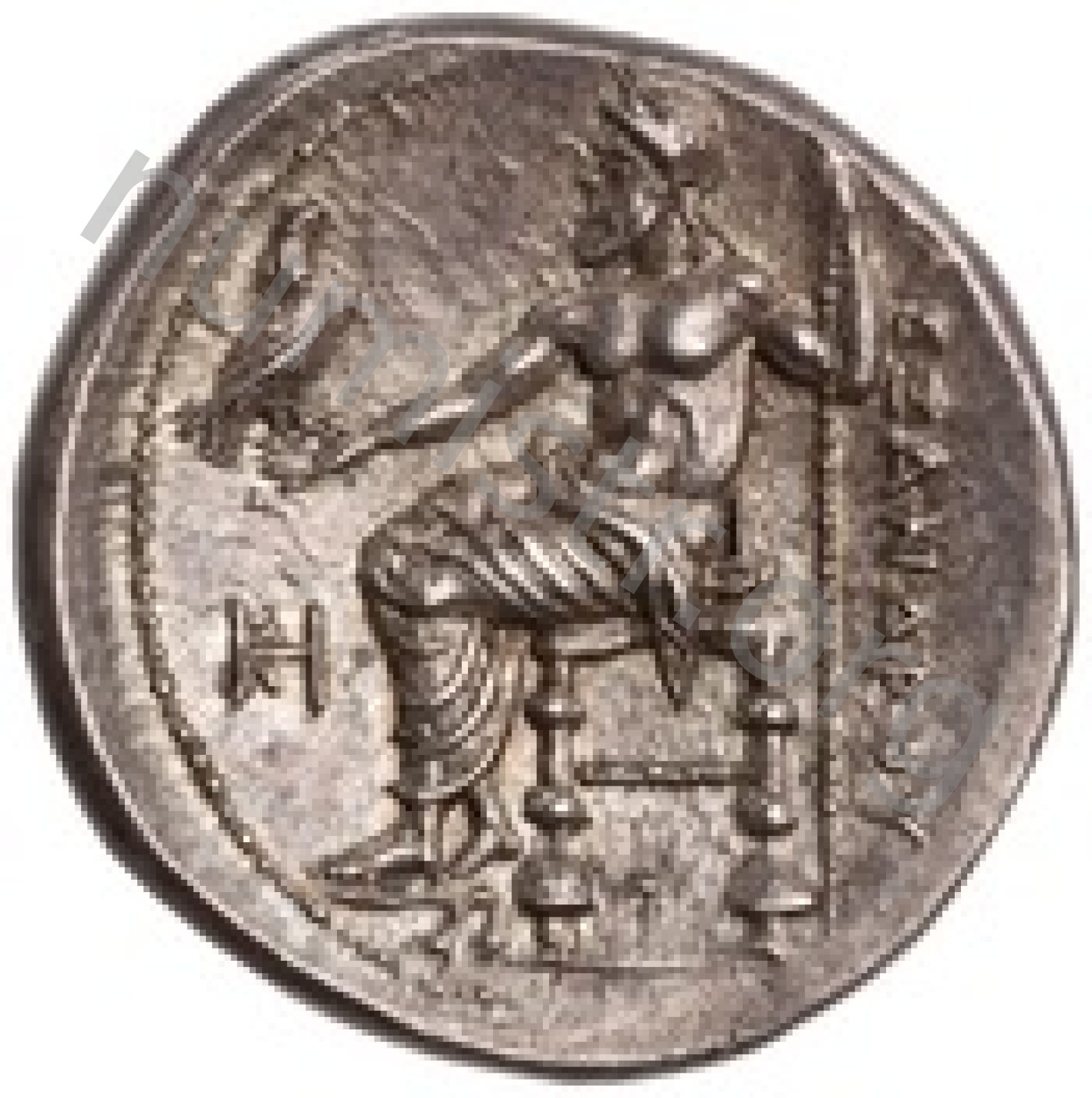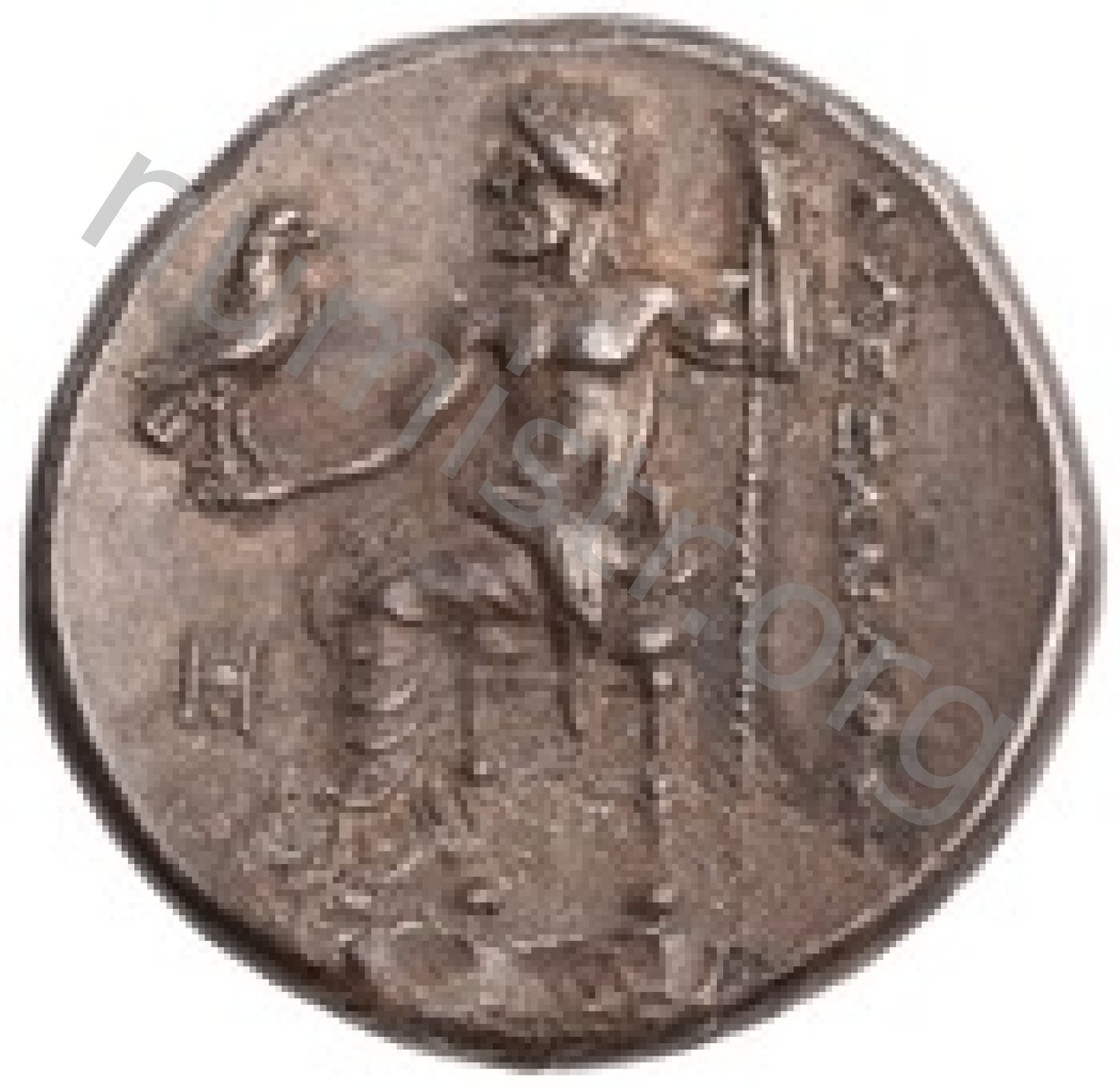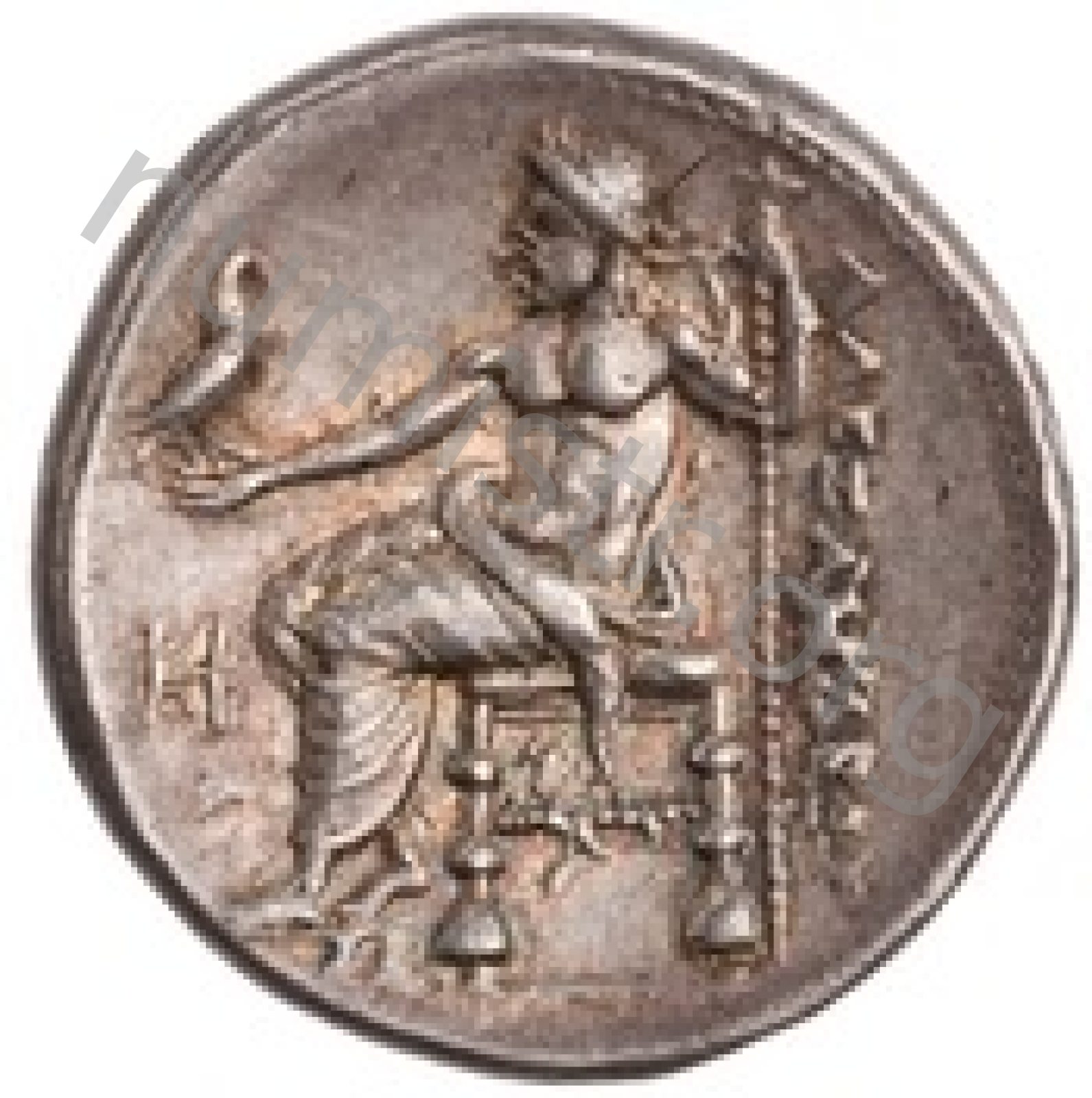 Zeus seated on stool-throne left eagle on outstretched right hand sceptre in left hand -[en]