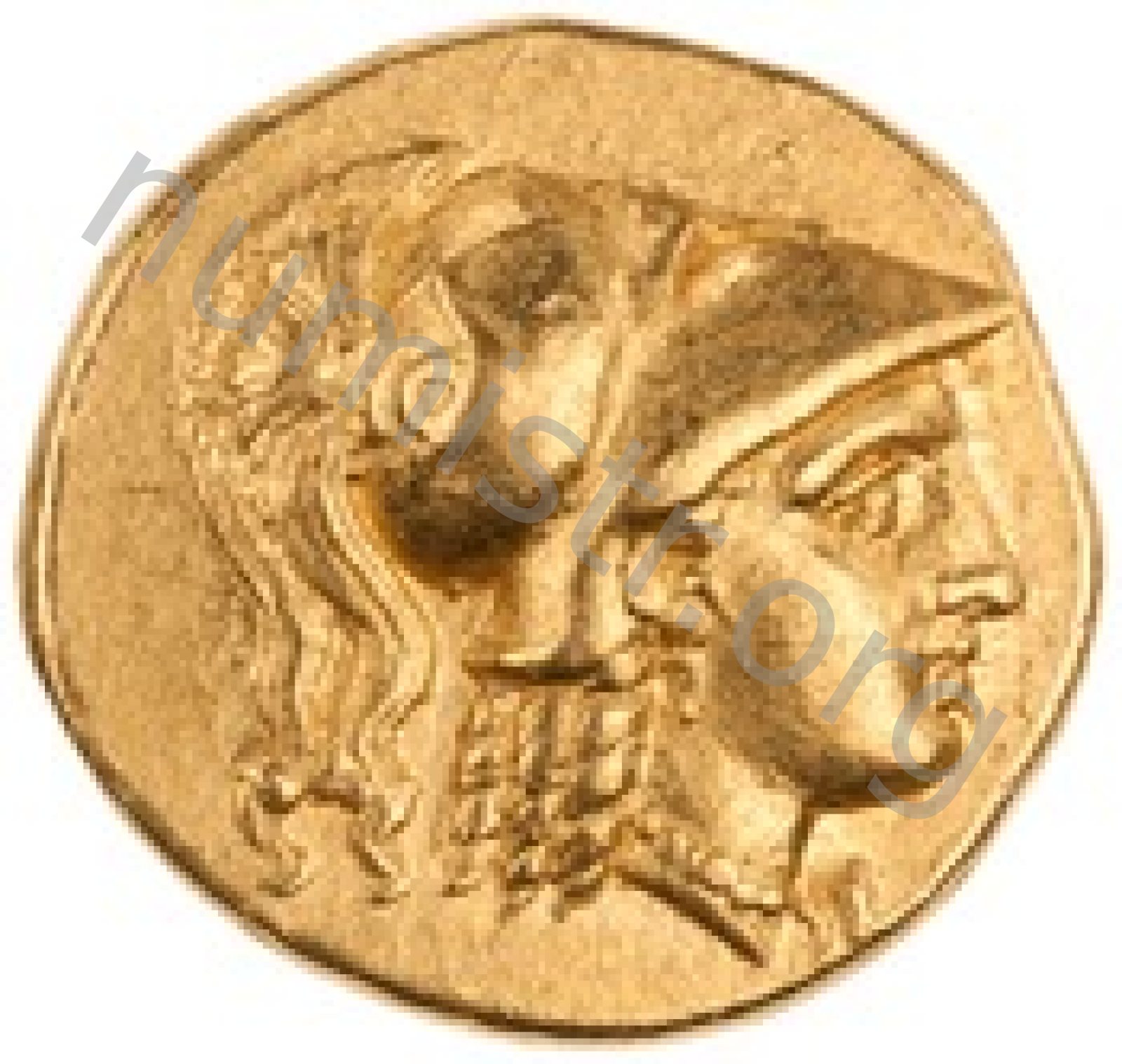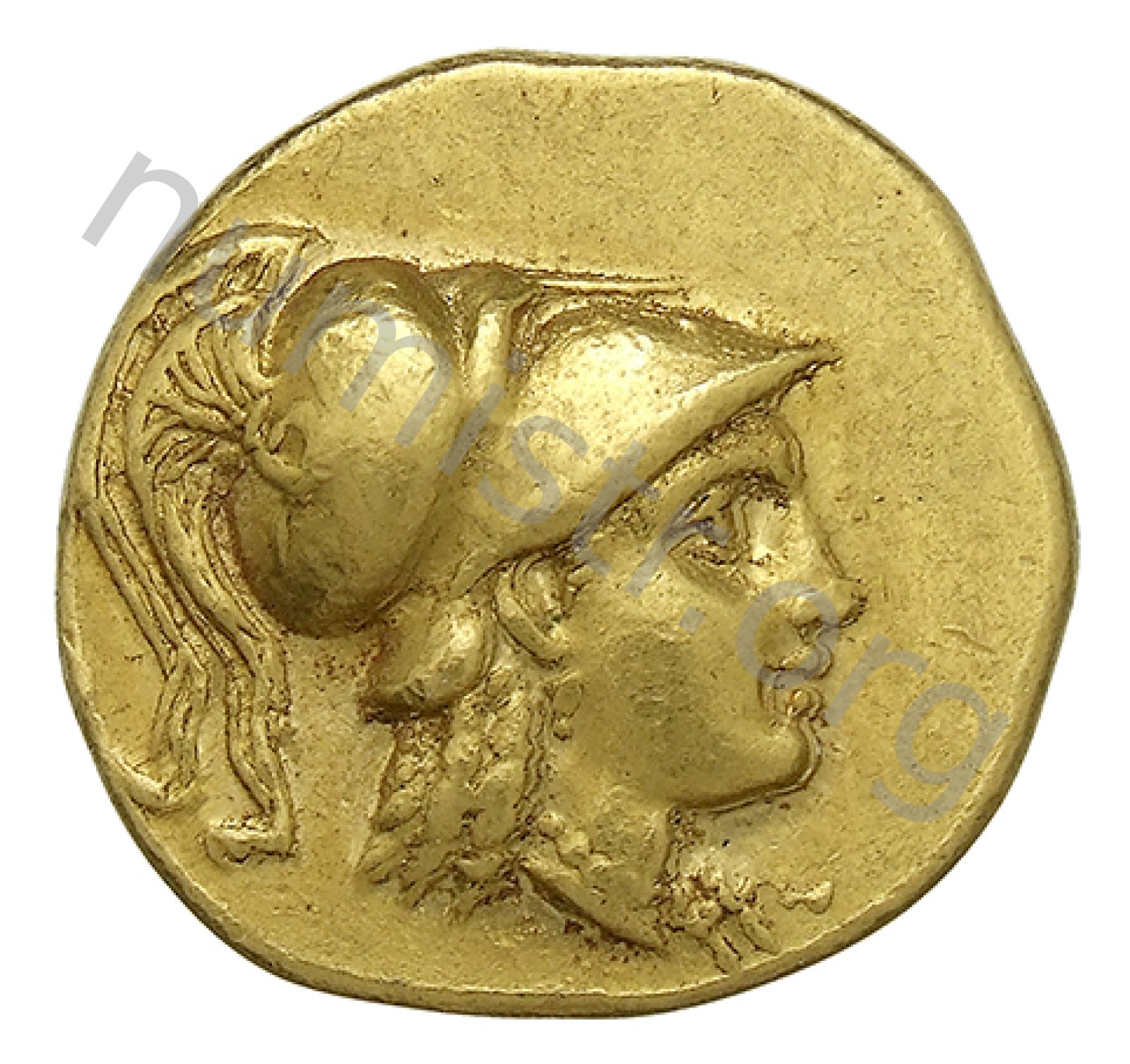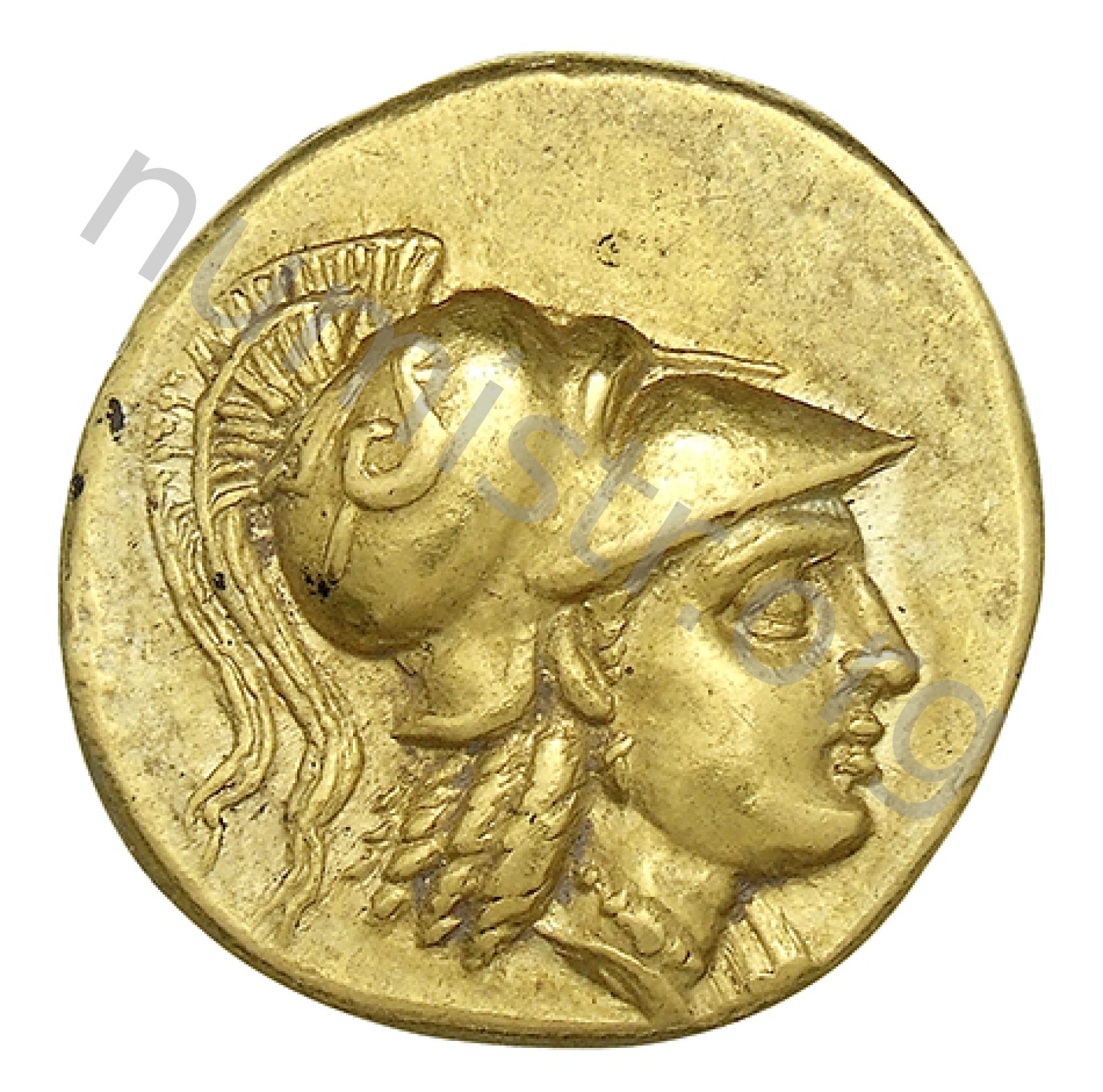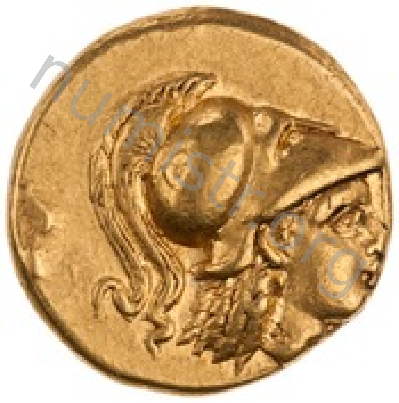 Head of Athena right wearing Corinthian helmet with crest -[en]