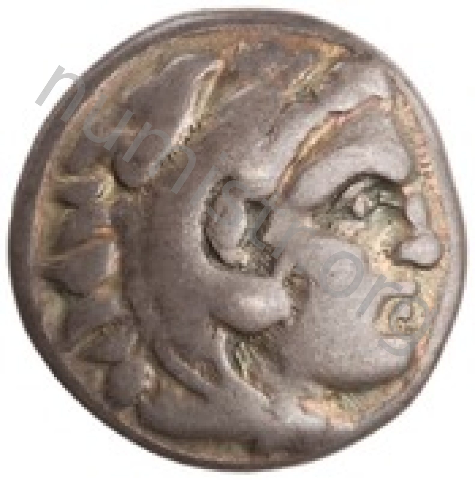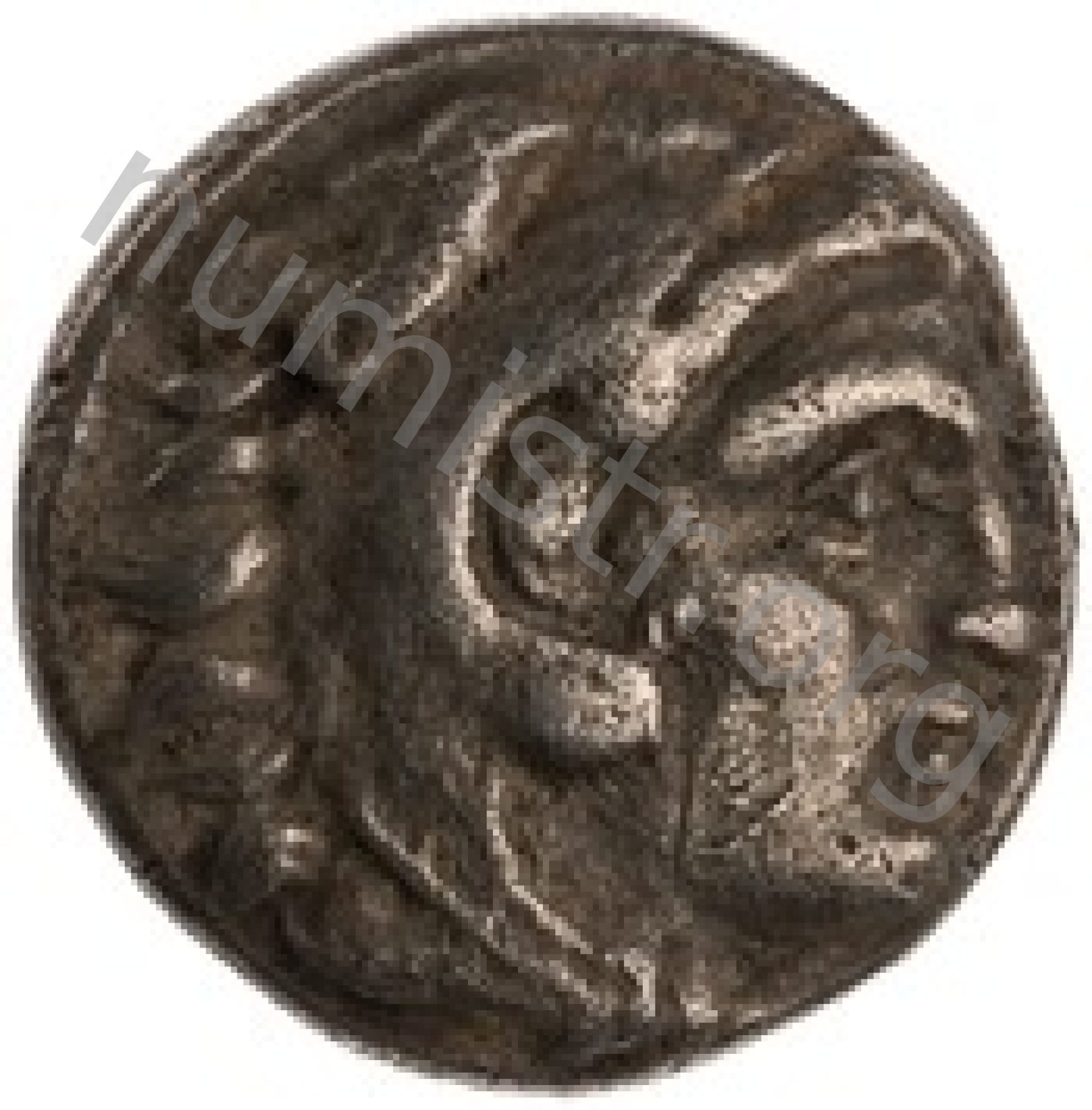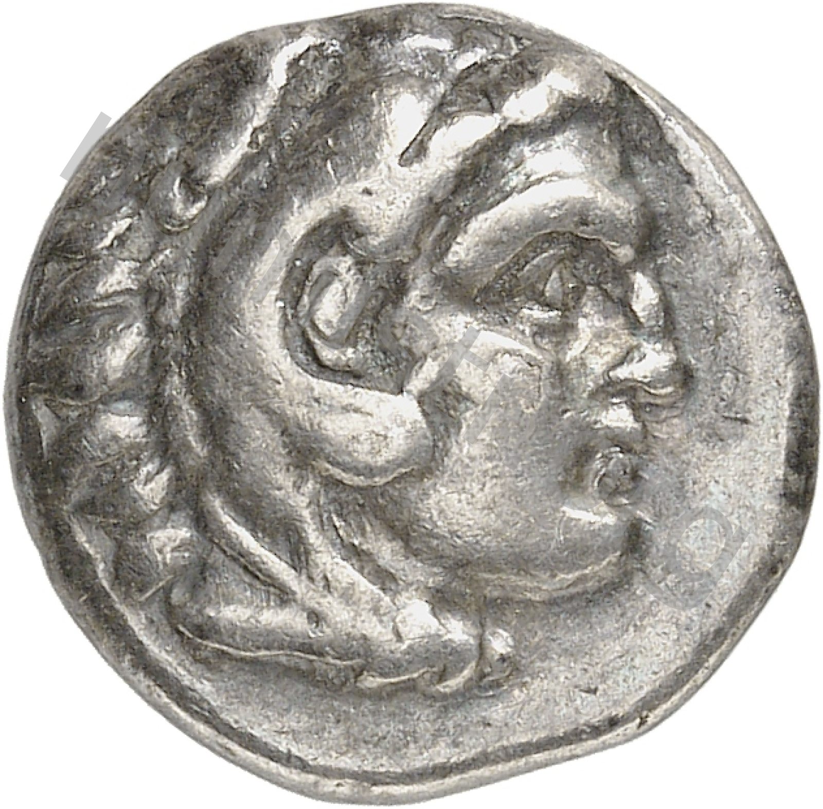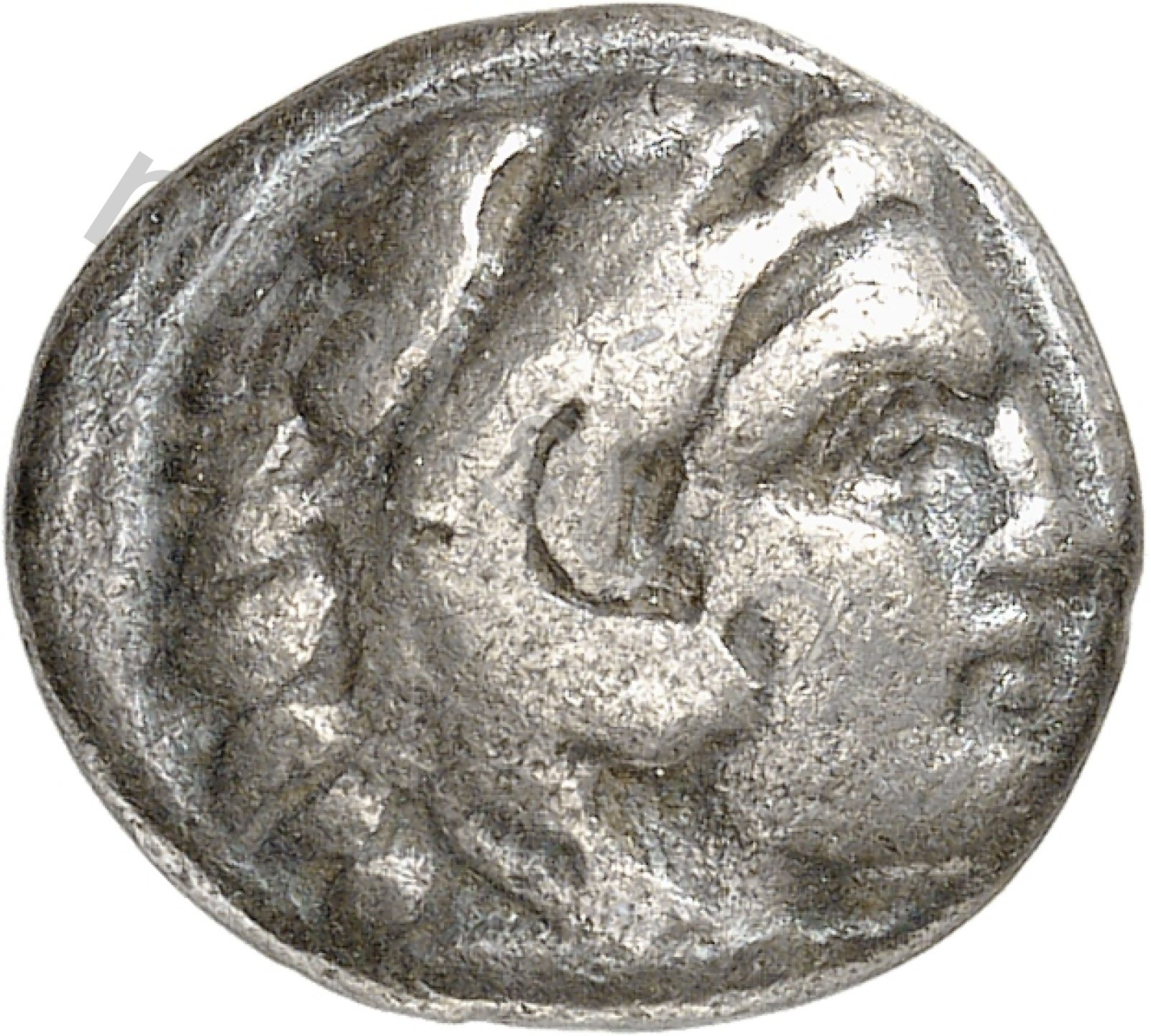 Head of beardless Heracles right wearing lion skin headdress -[en]