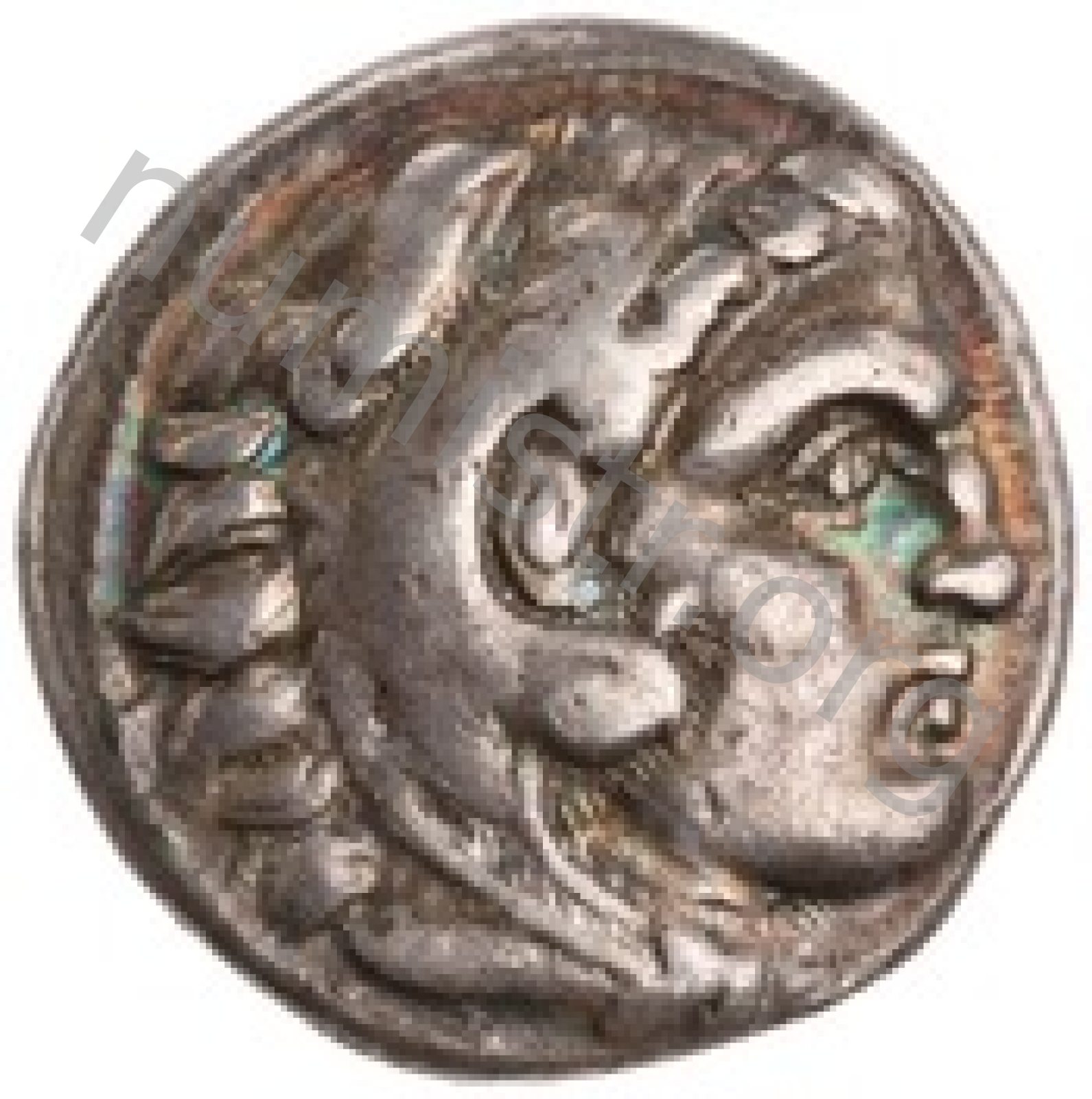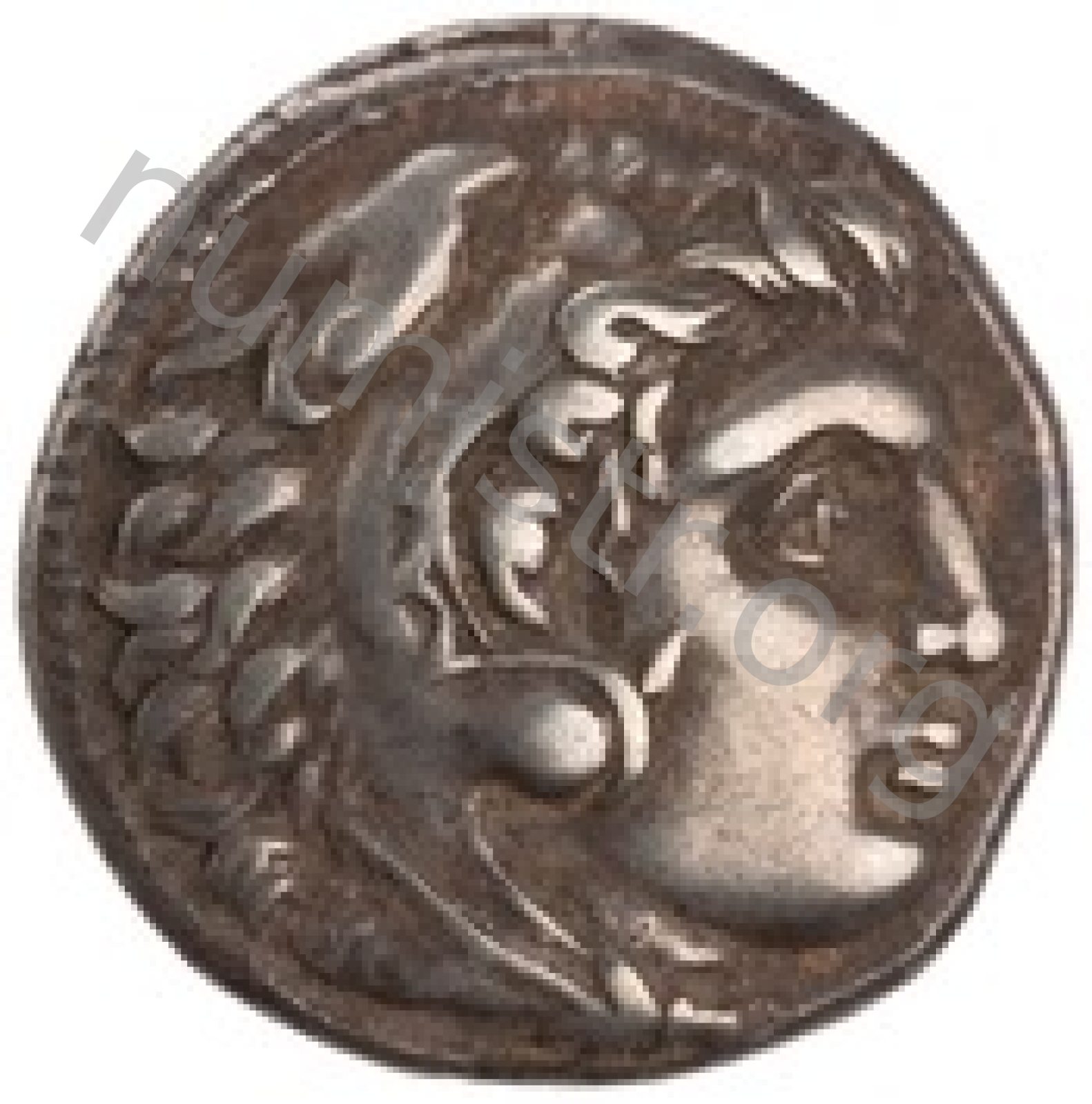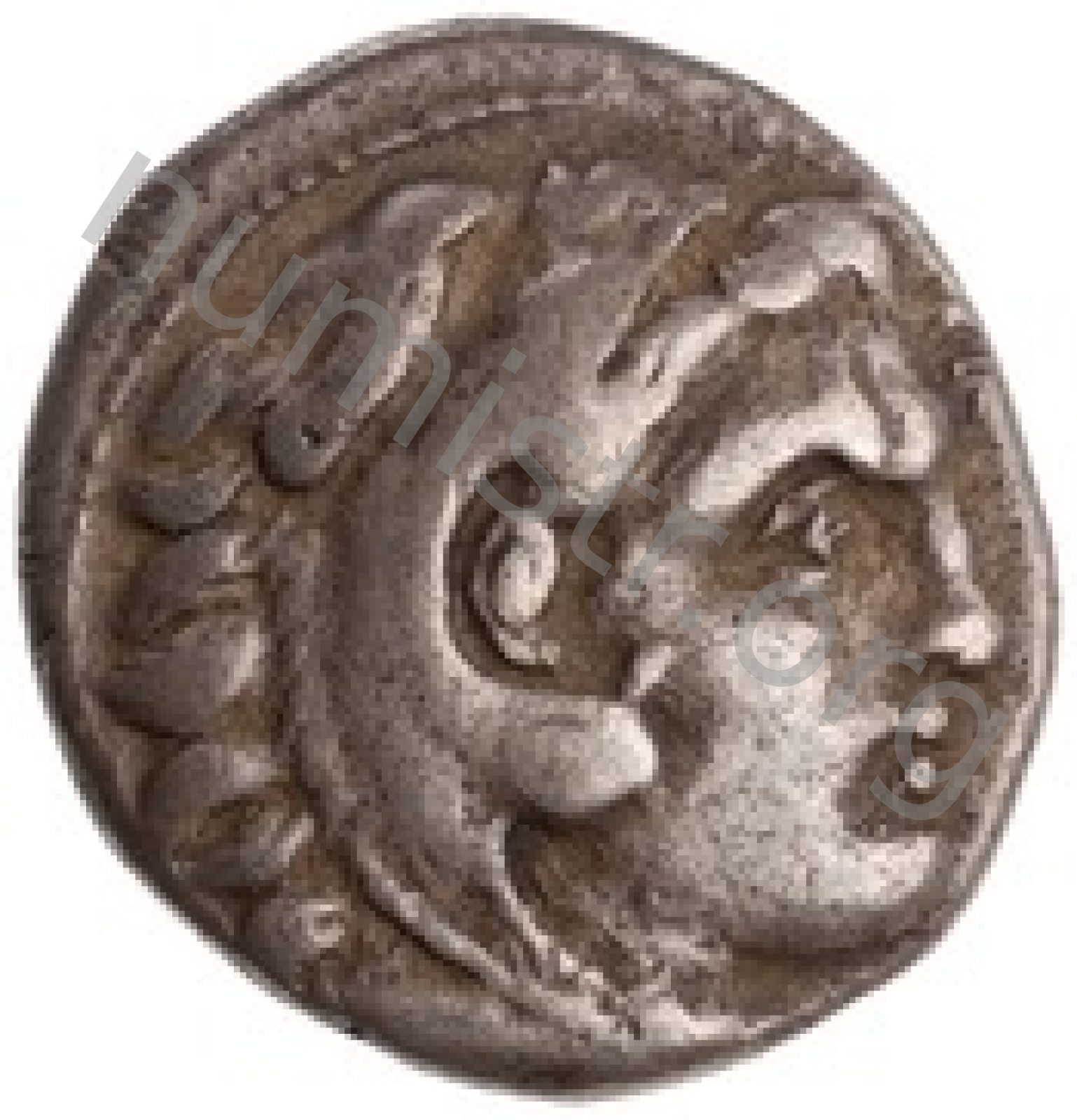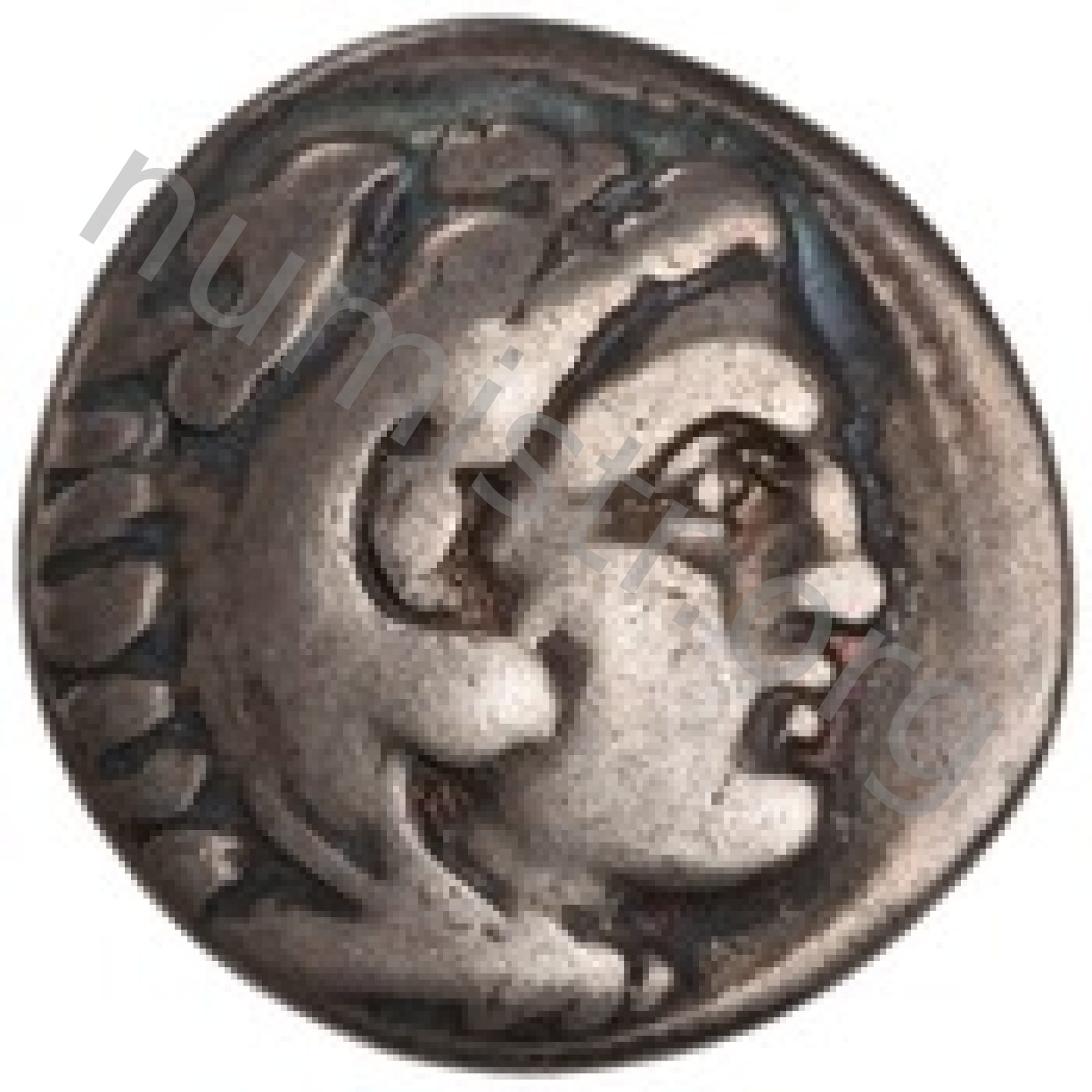 Head of beardless Heracles right wearing lion skin headdress -[en]