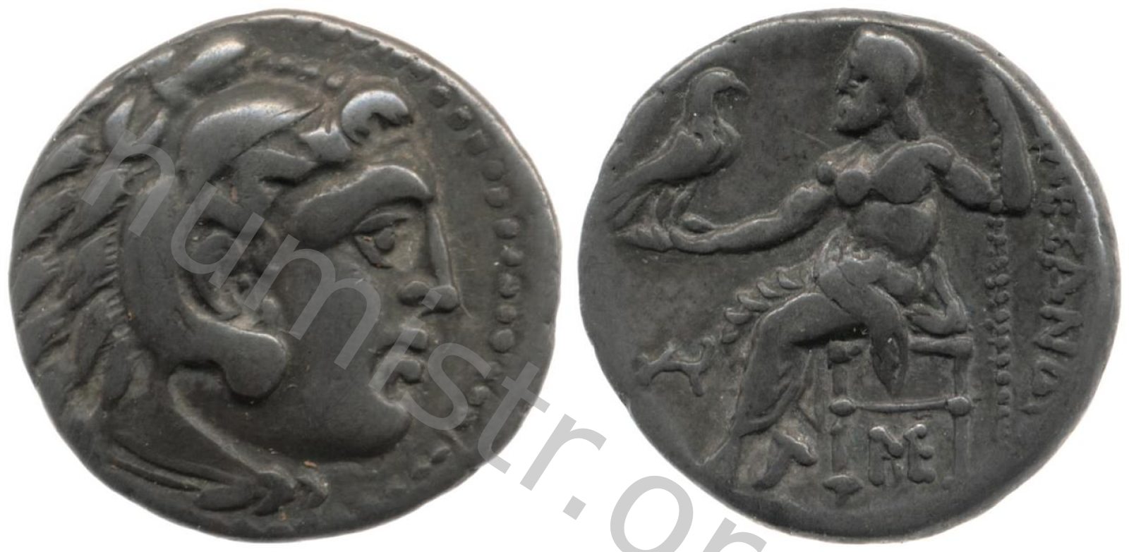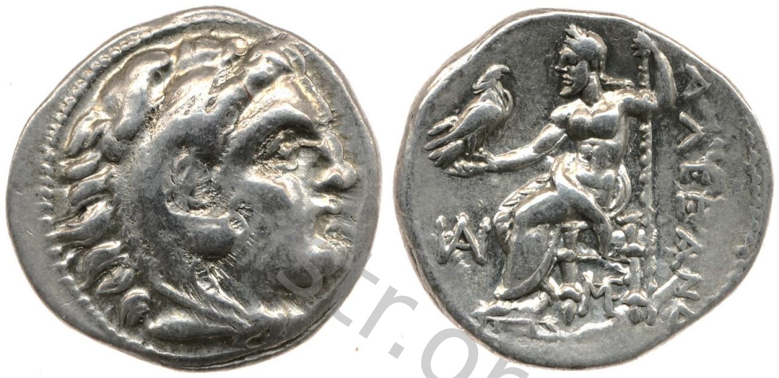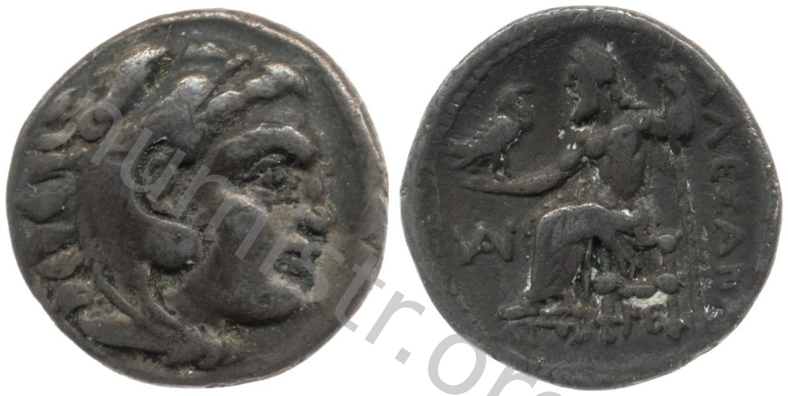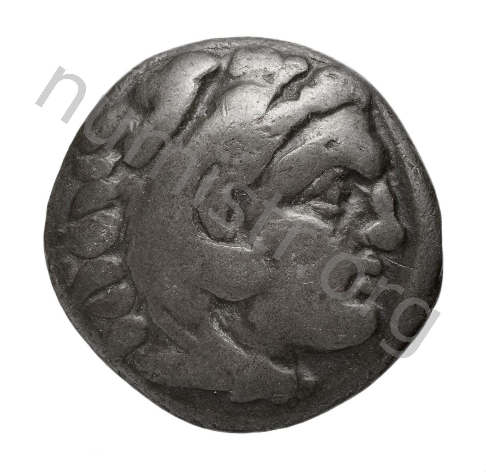 Head of beardless Heracles right wearing lion skin headdress -[en]