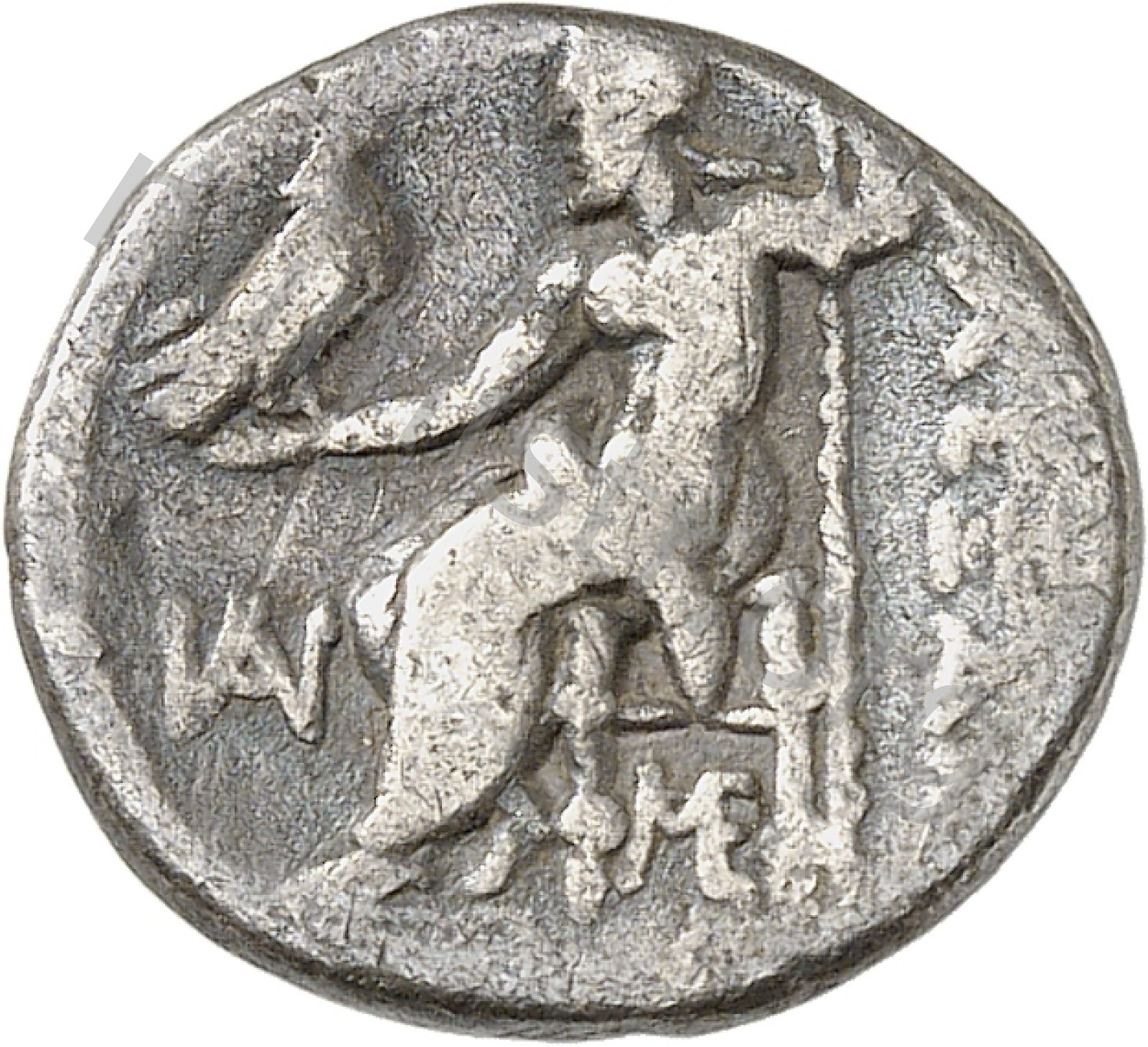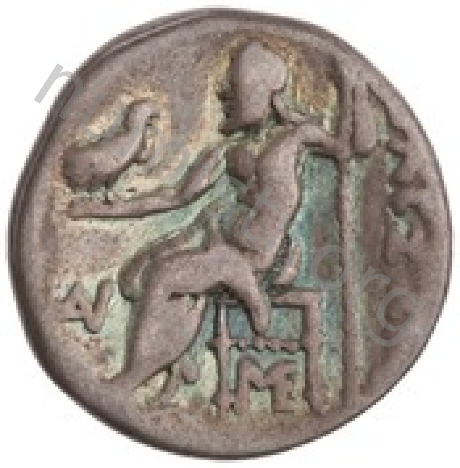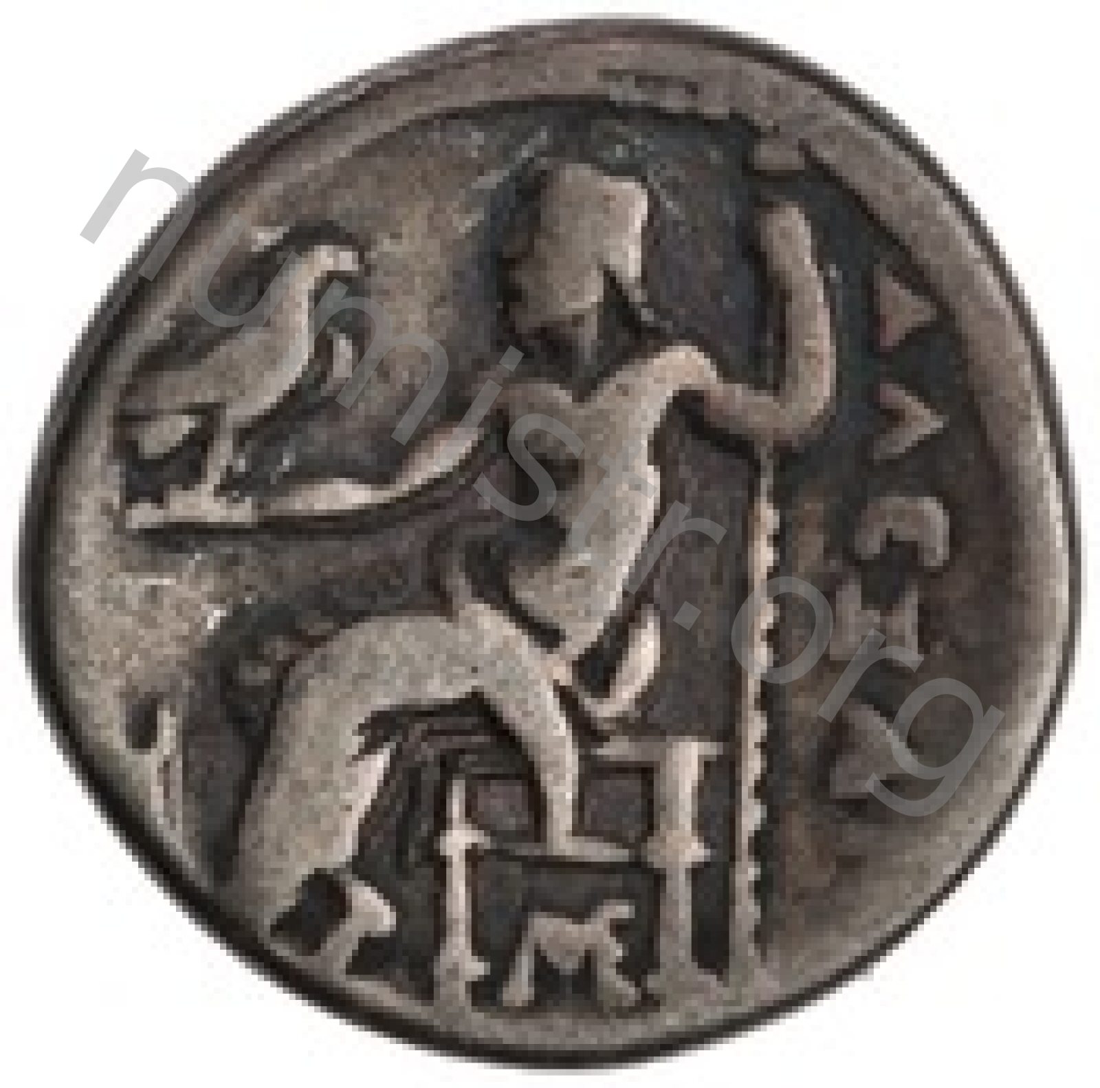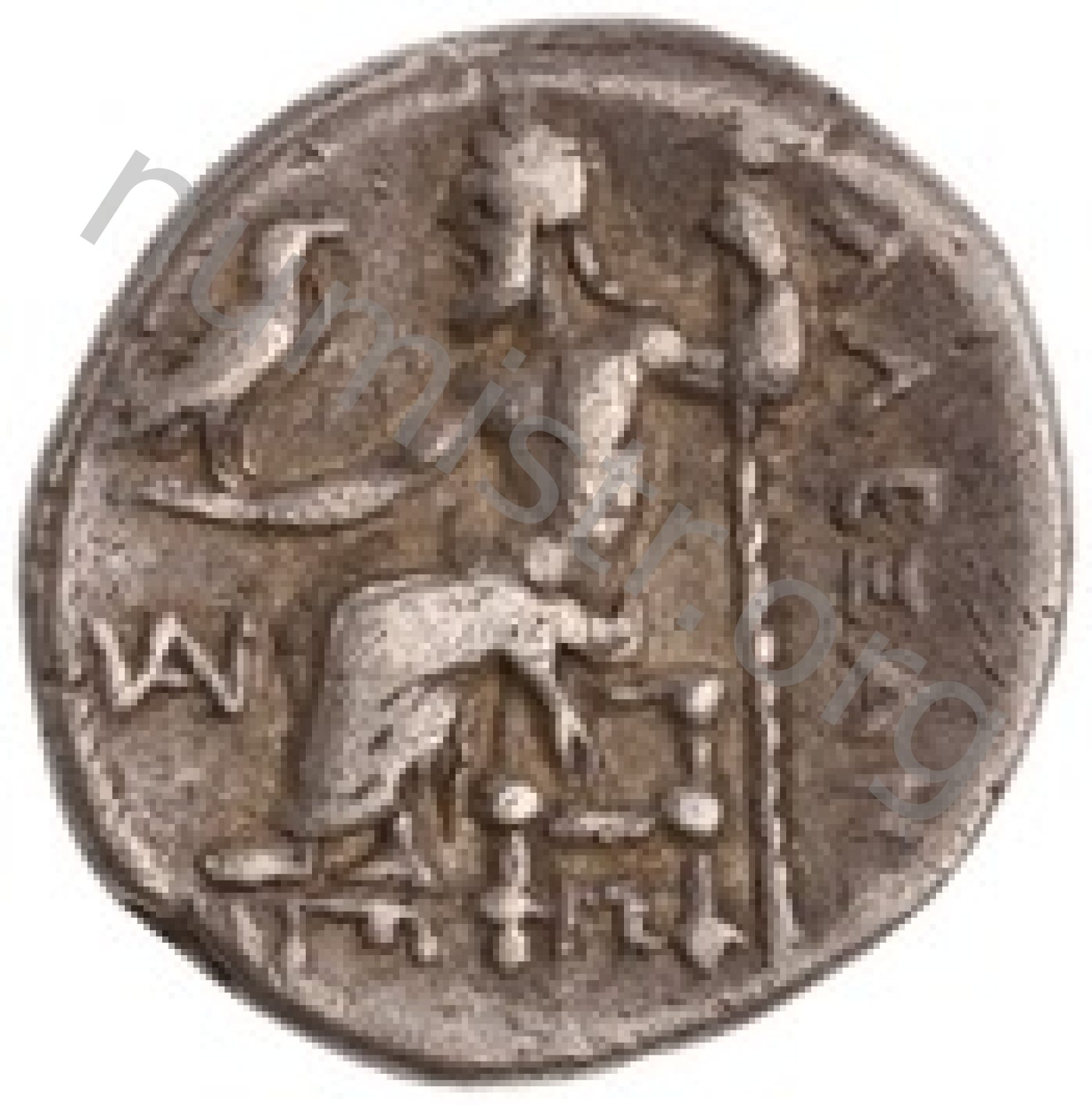 Zeus seated on stool-throne left eagle on outstretched right hand sceptre in left hand -[en]