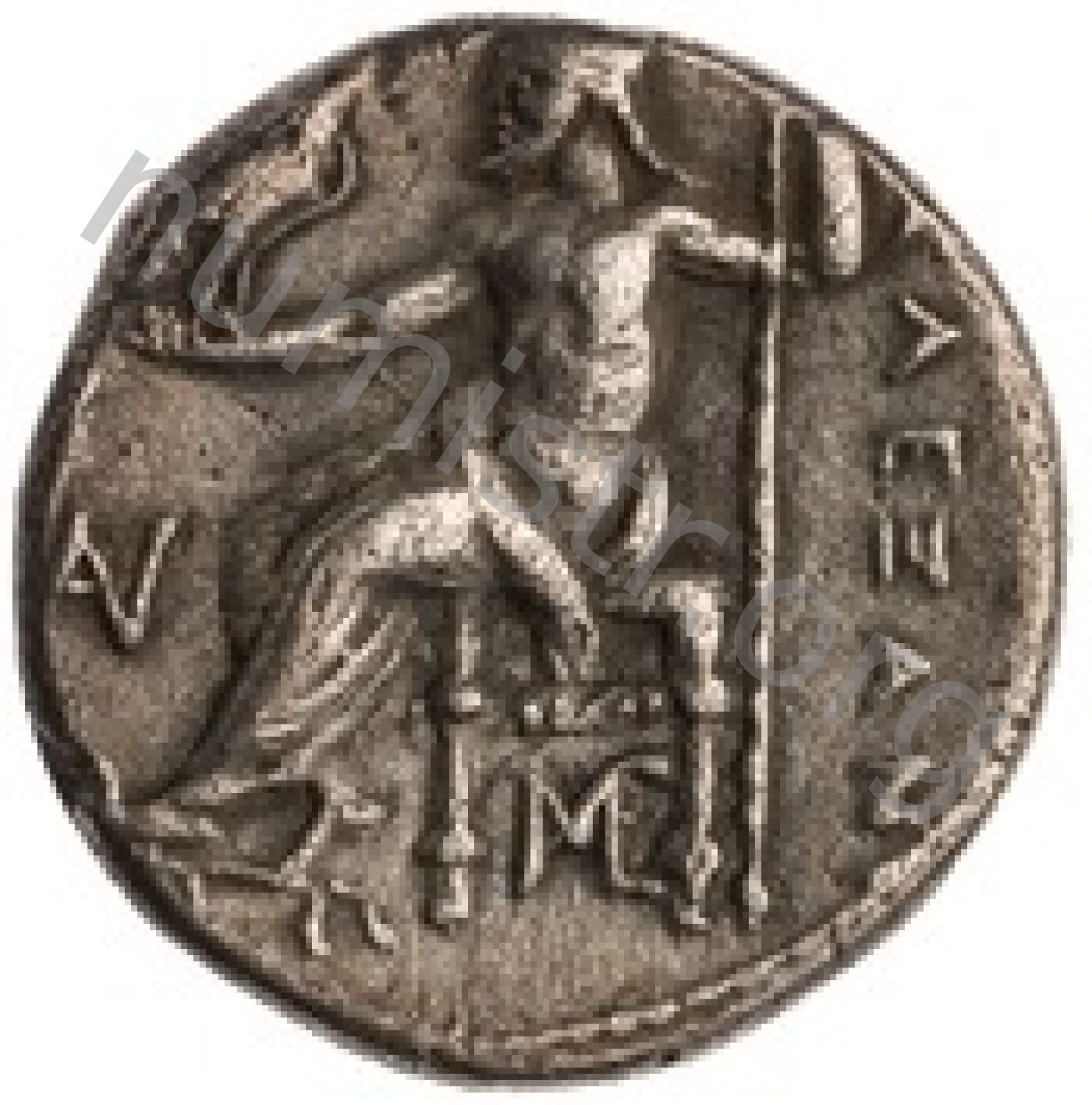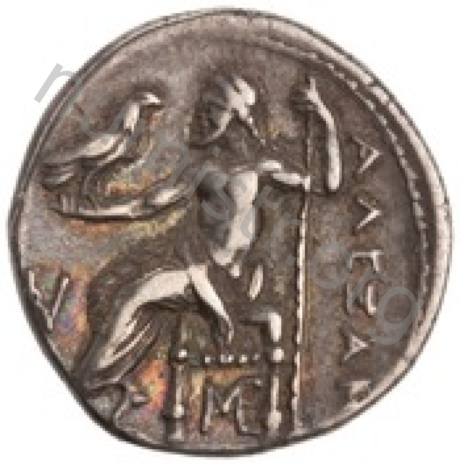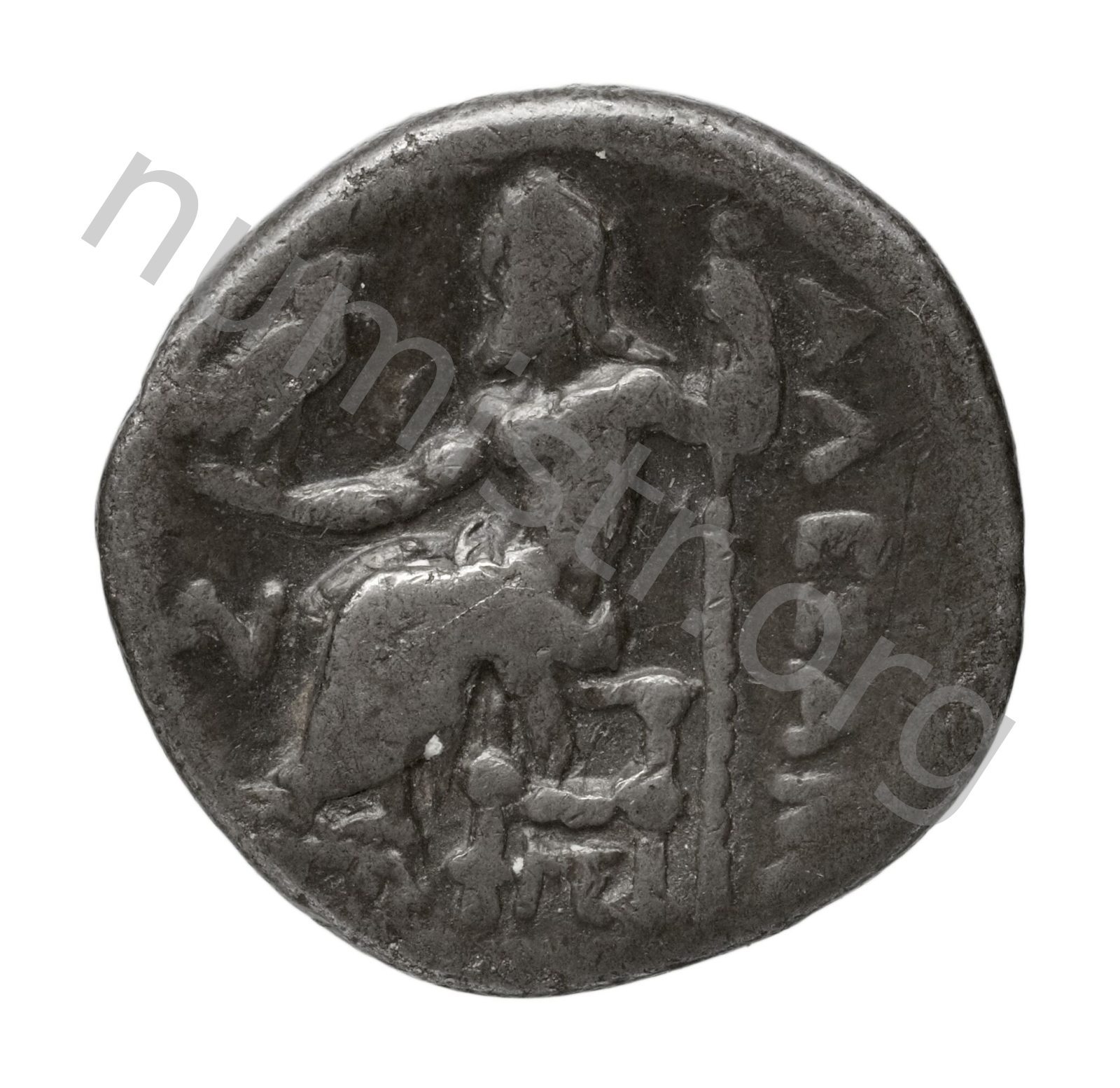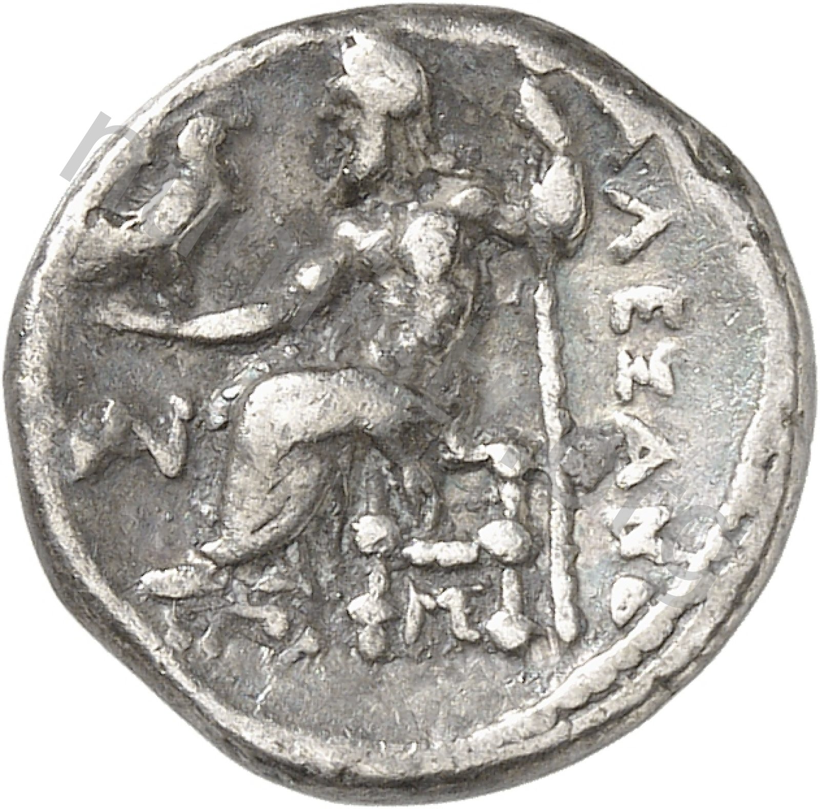 Zeus seated on stool-throne left eagle on outstretched right hand sceptre in left hand -[en]