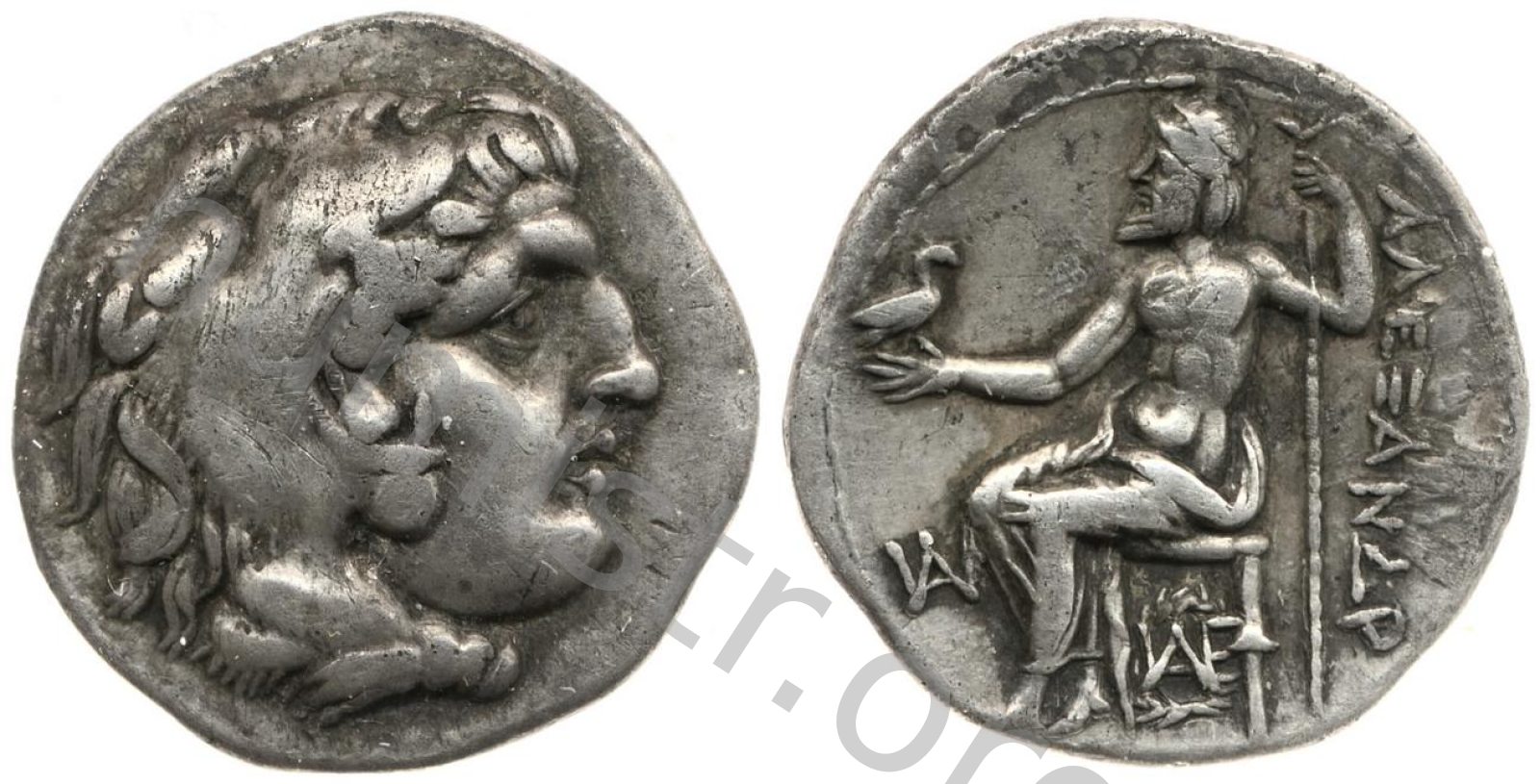 Sağda aslan postu başlığı giyen sakalsız Herakles'in başı