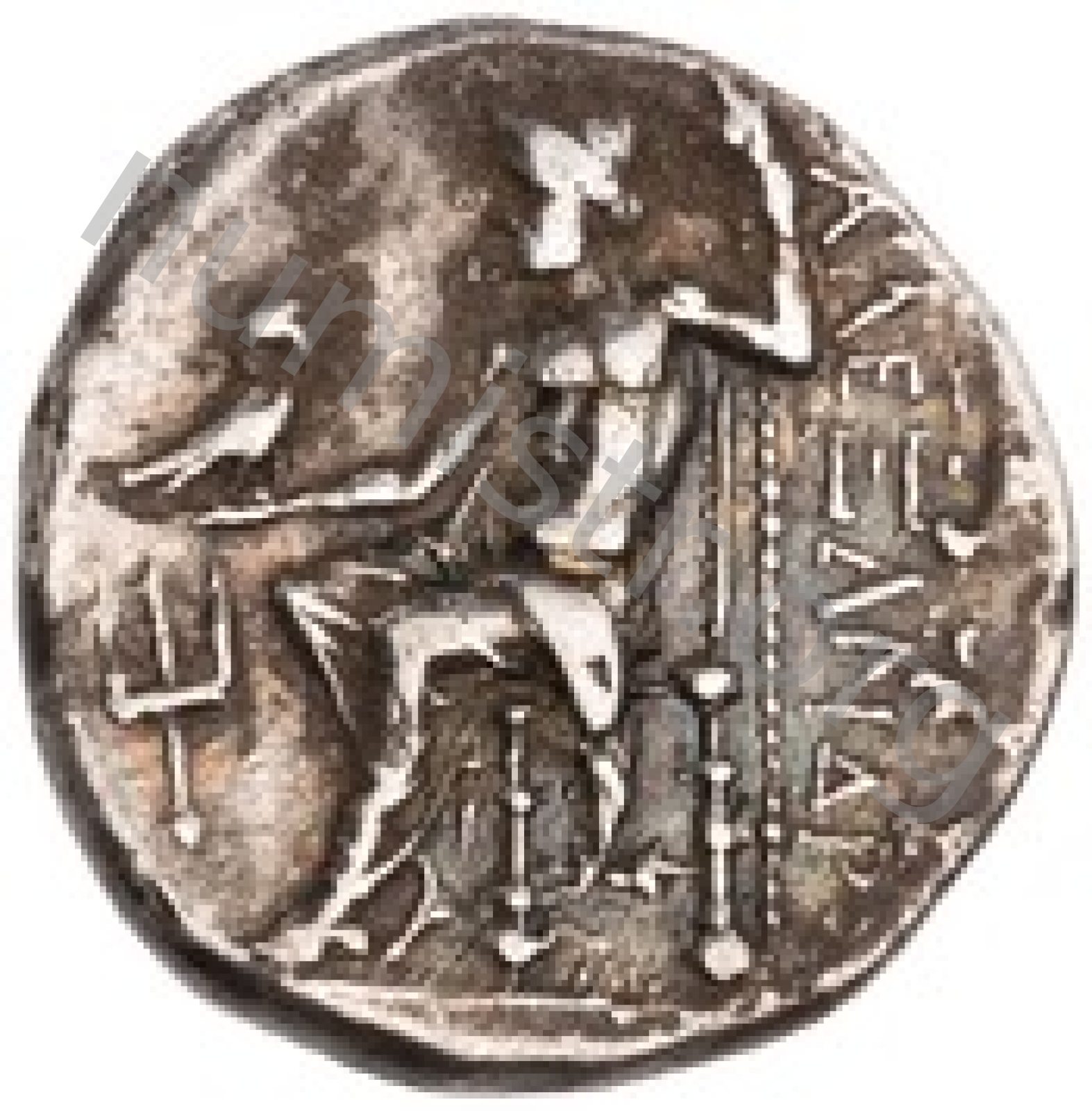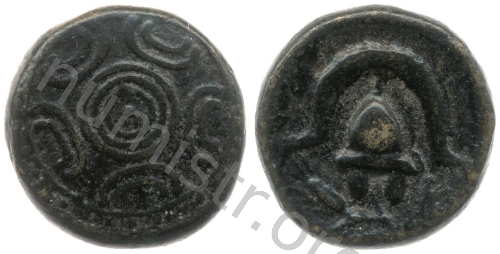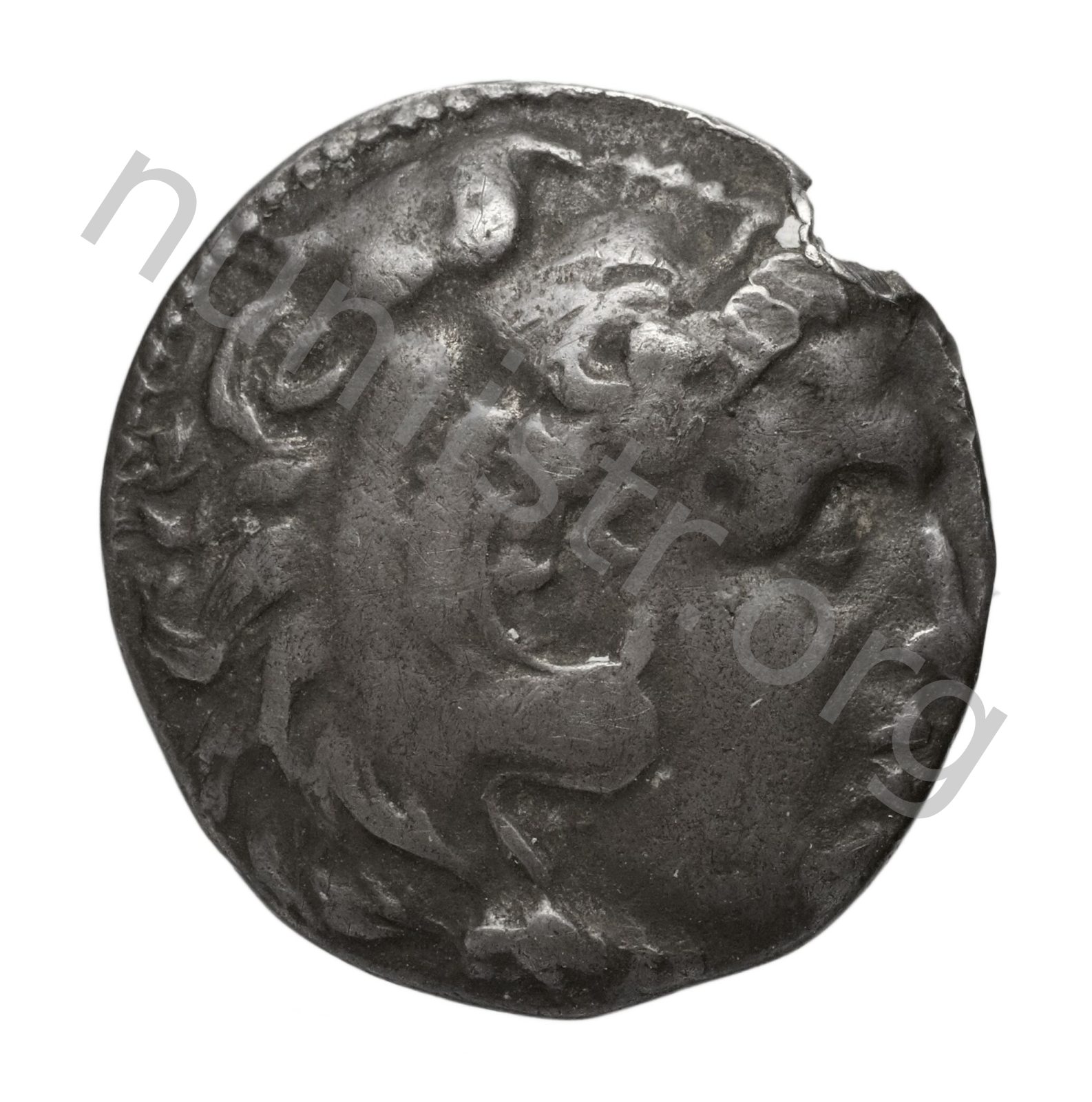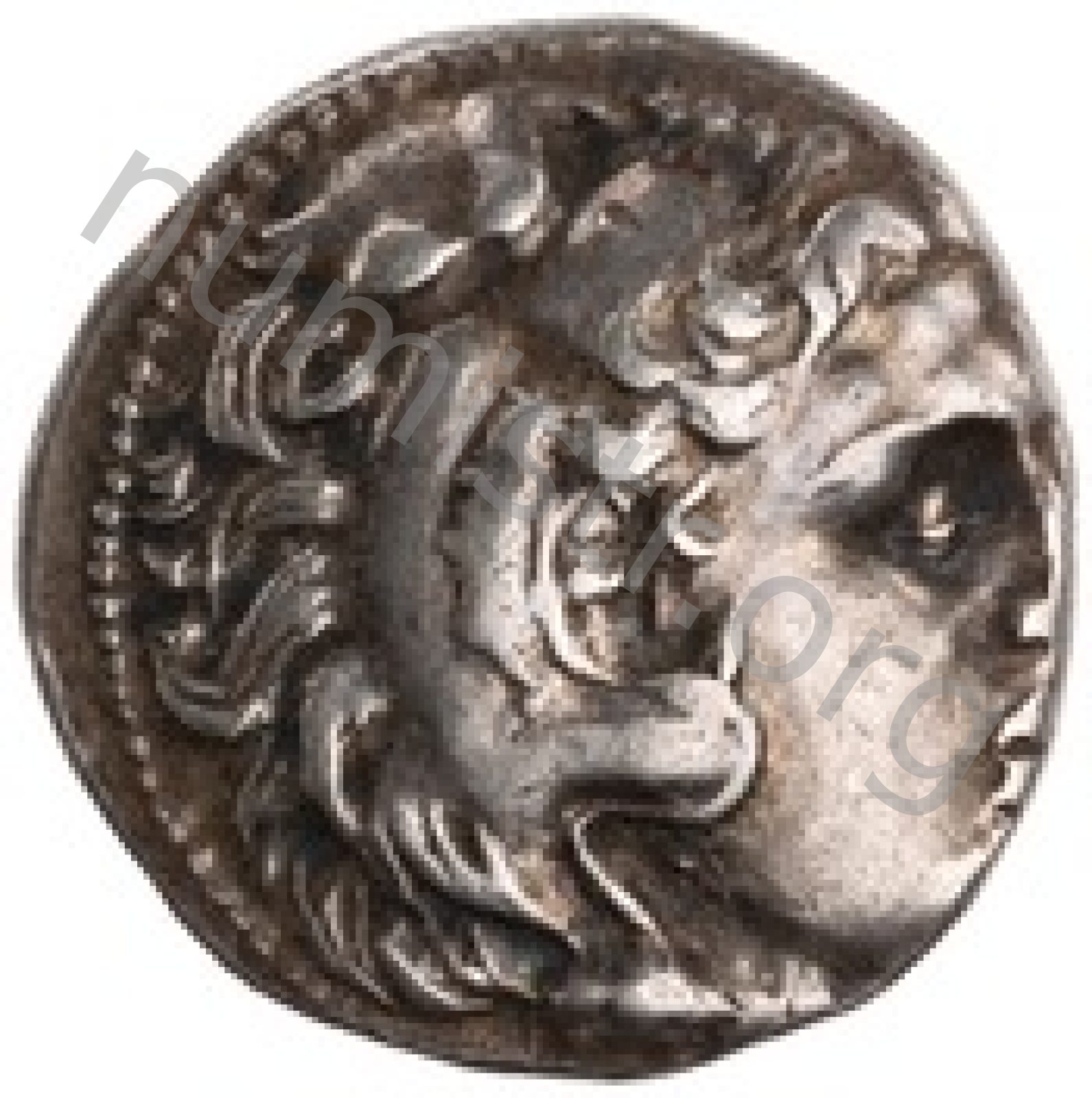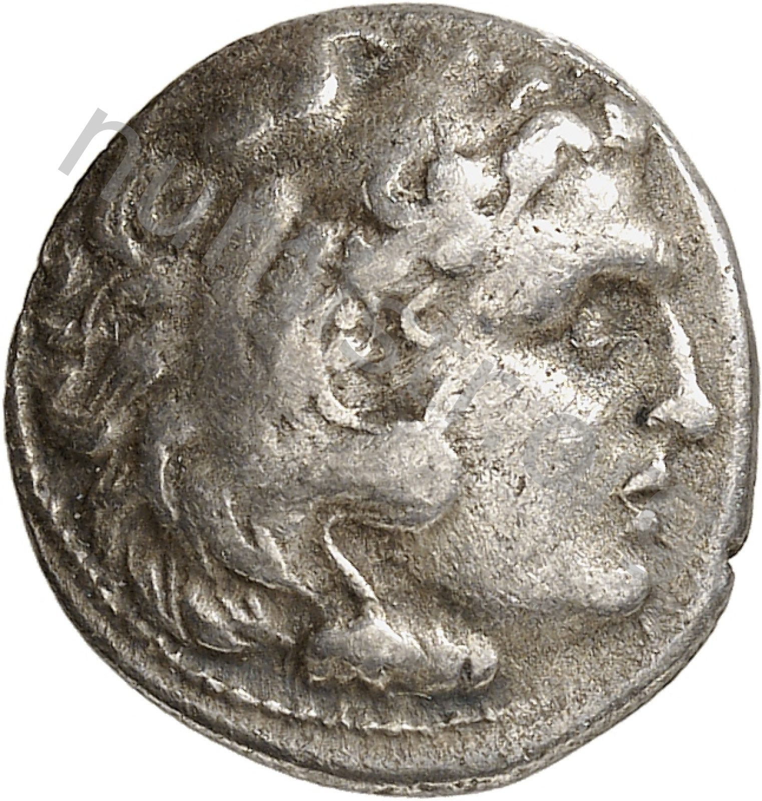 Head of beardless Heracles right wearing lion skin headdress -[en]