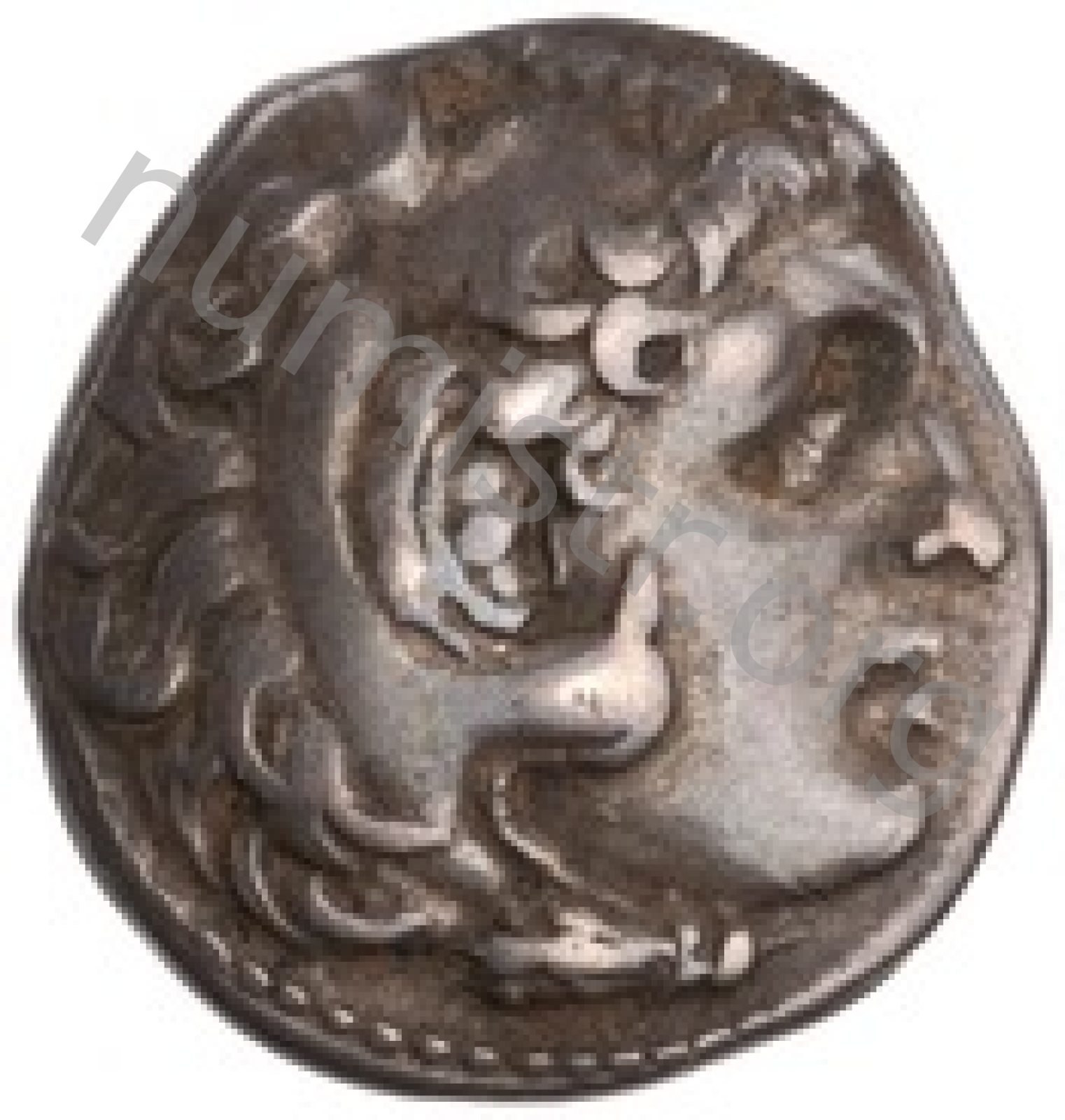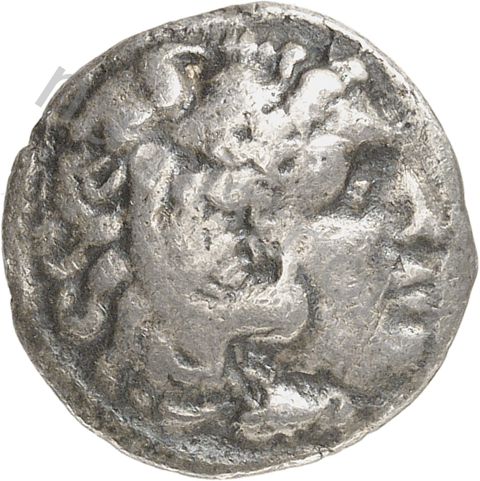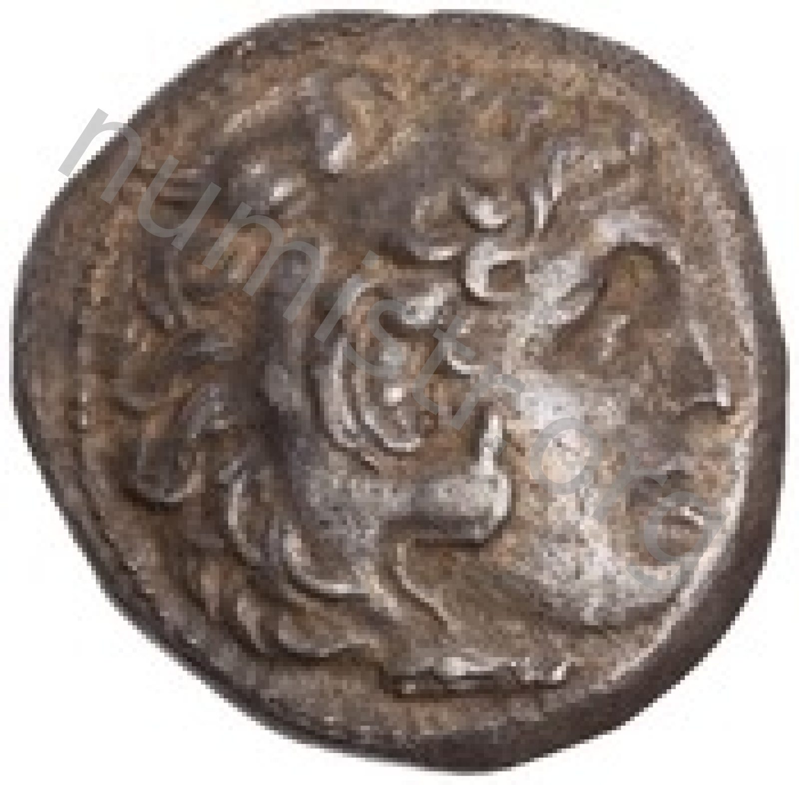 Head of beardless Heracles right wearing lion skin headdress -[en]