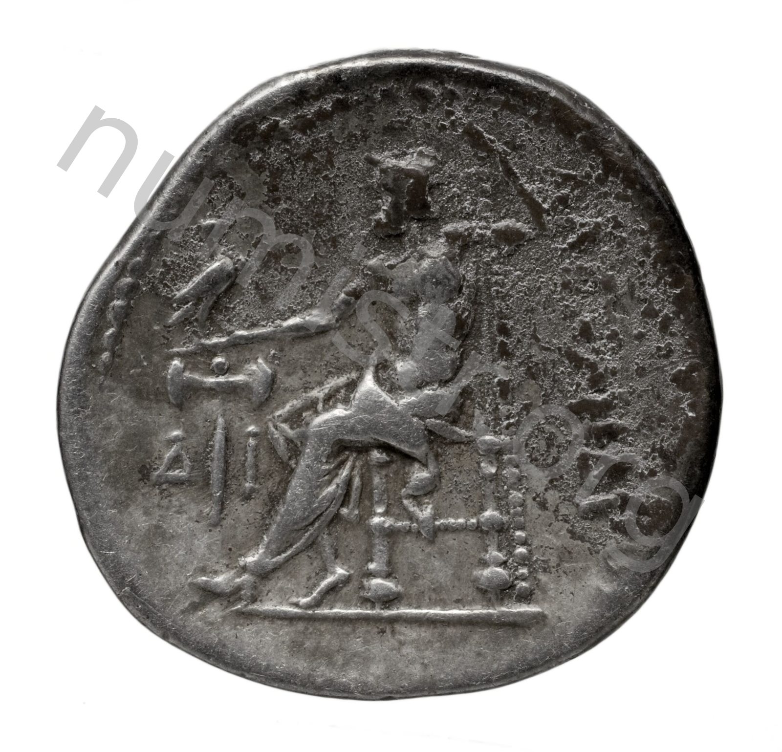 Zeus seated on stool-throne left eagle on outstretched right hand sceptre in left hand -[en]