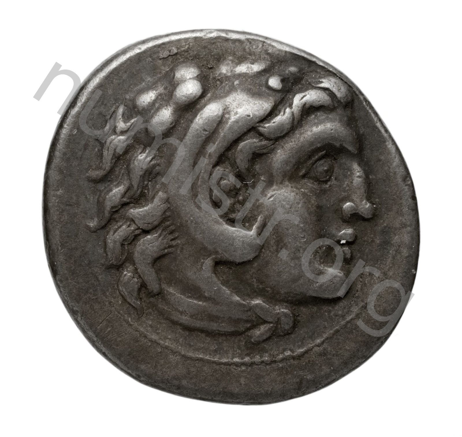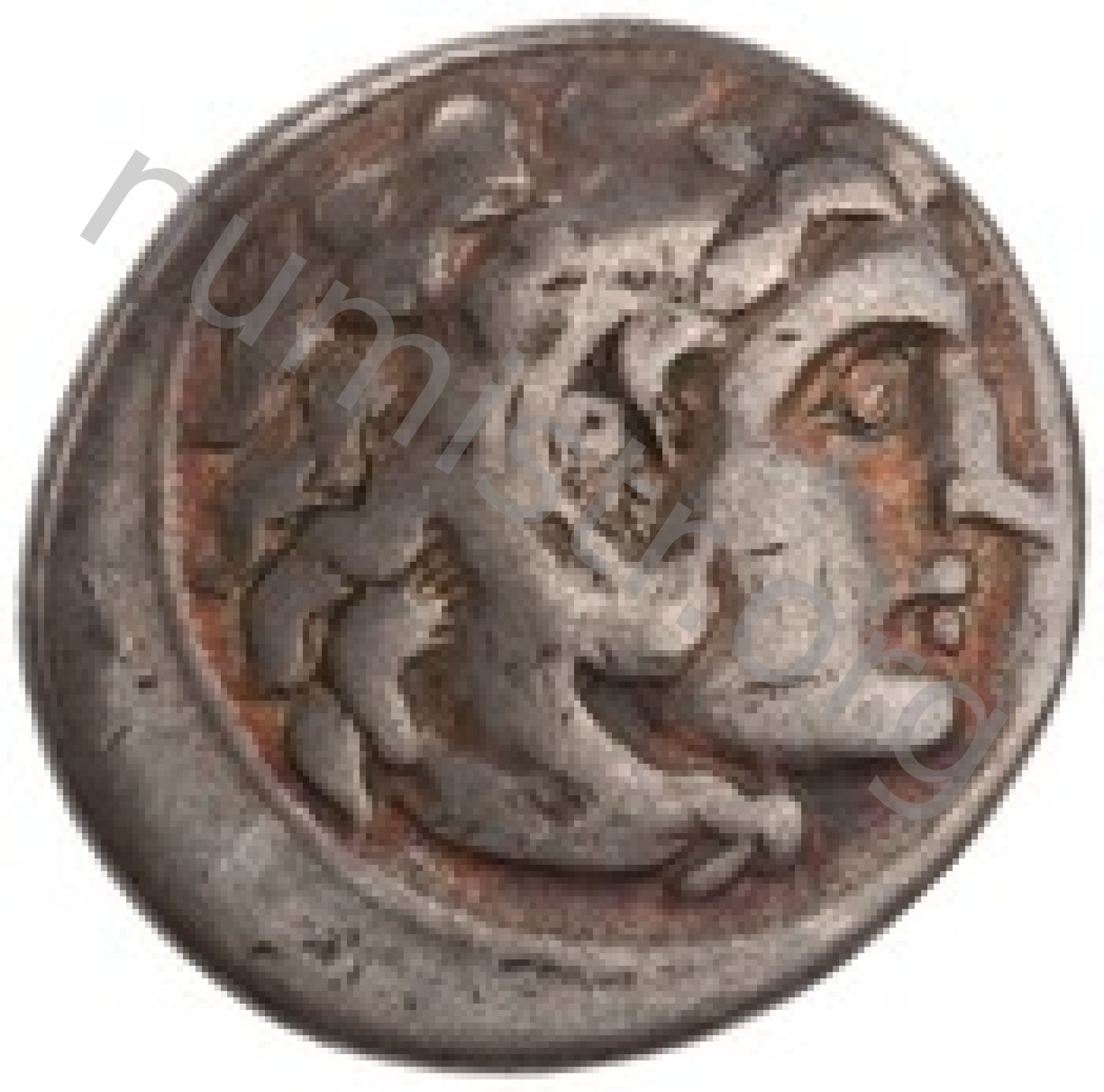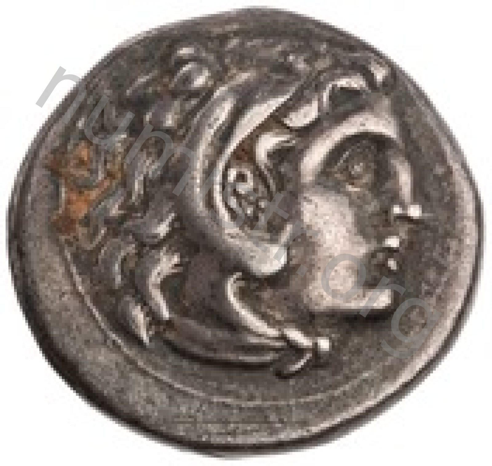 Head of beardless Heracles right wearing lion skin headdress -[en]