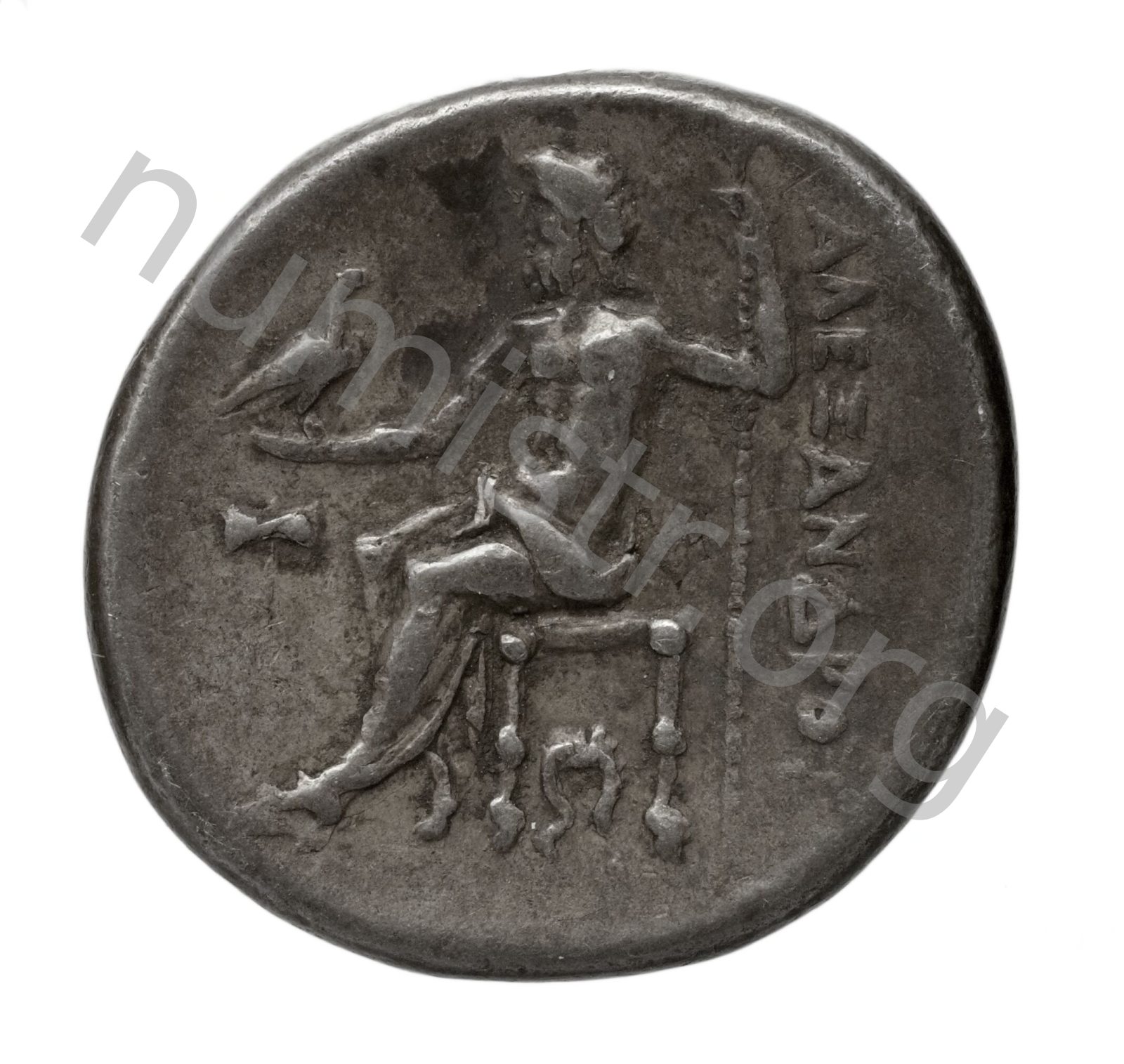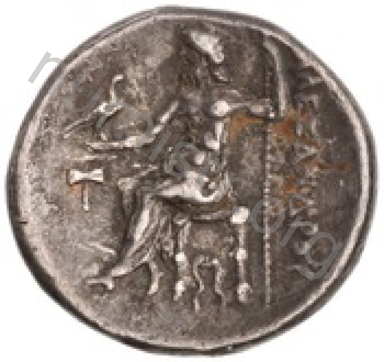 Zeus seated on stool-throne left eagle on outstretched right hand sceptre in left hand -[en]