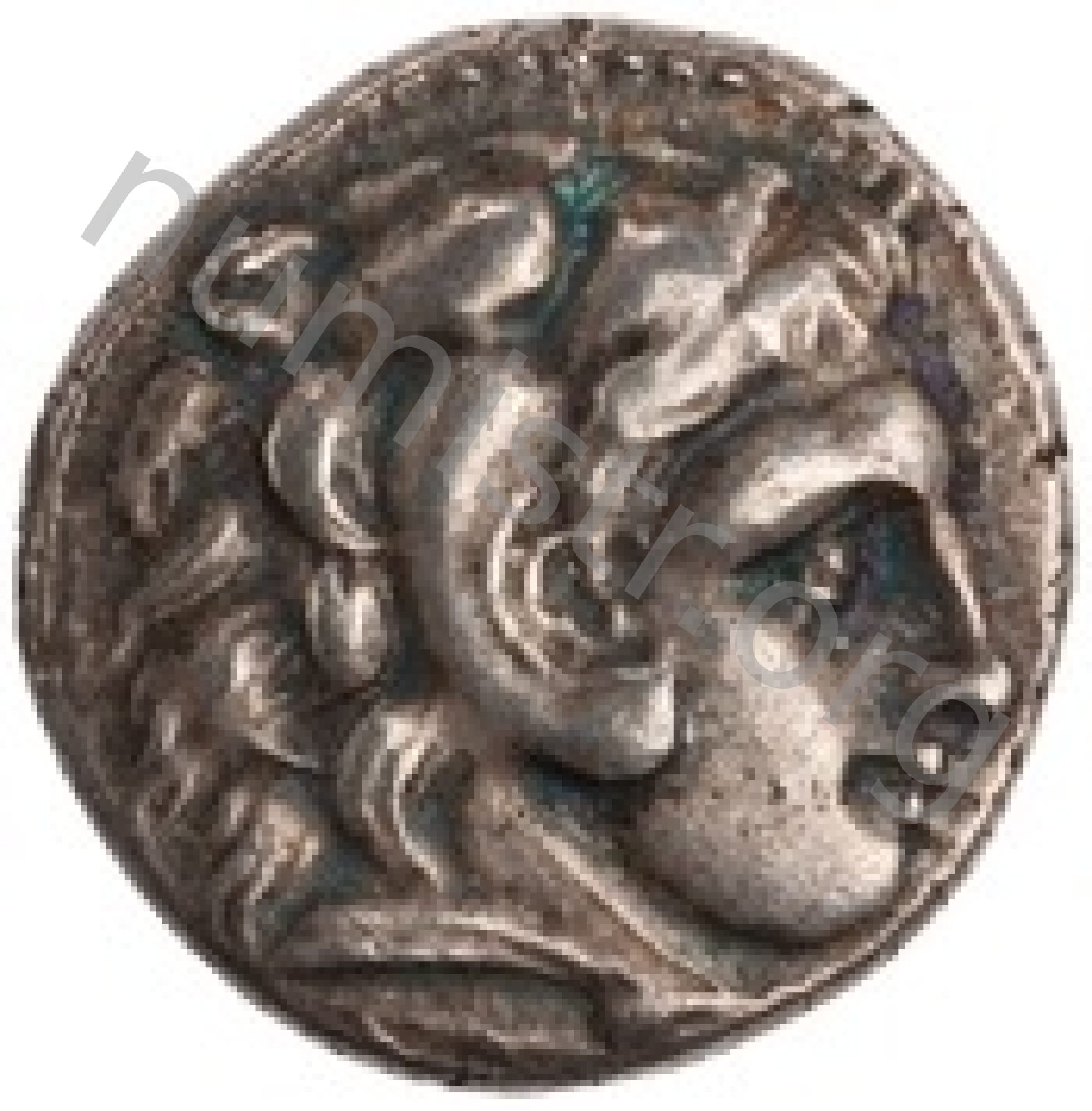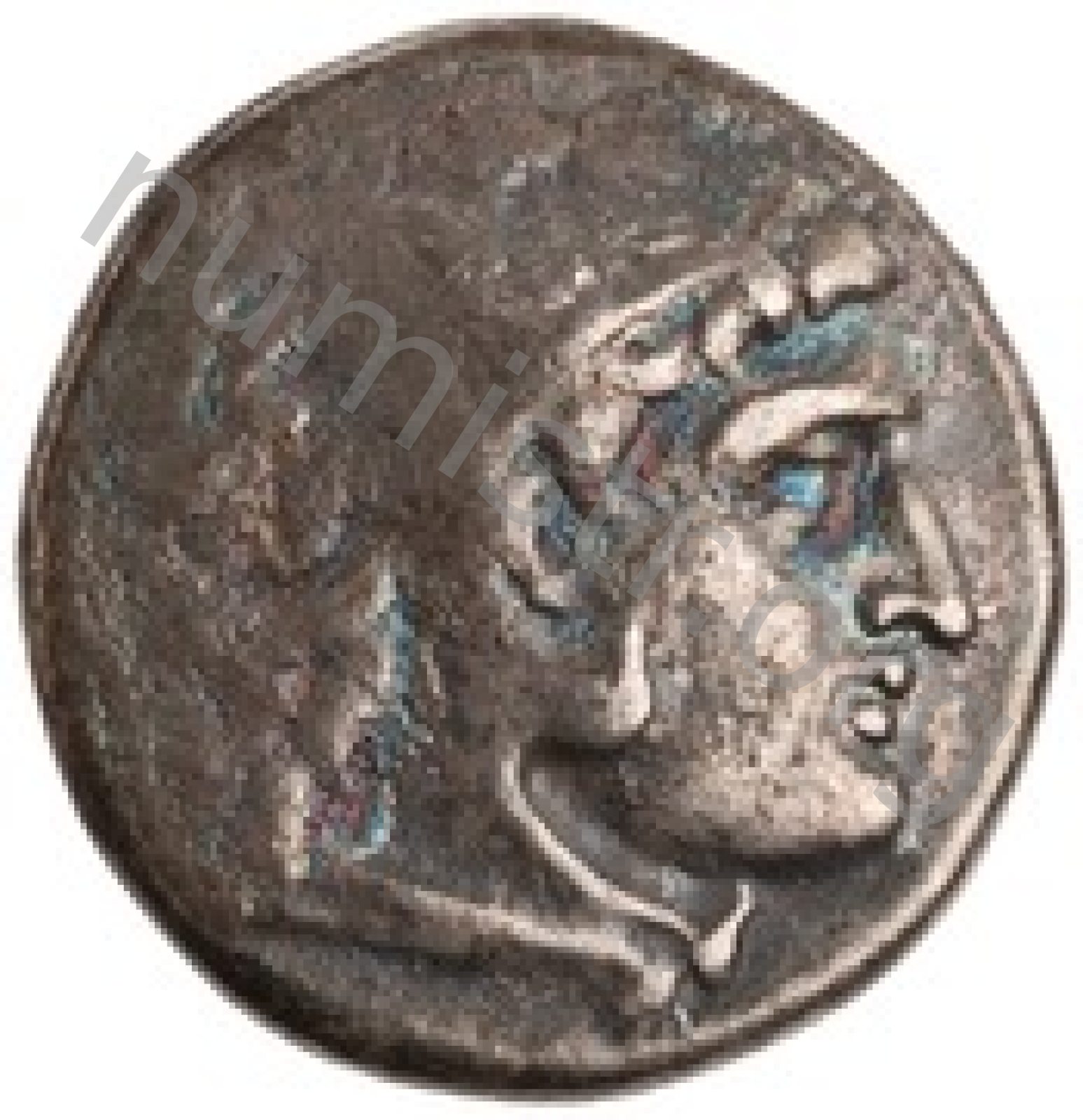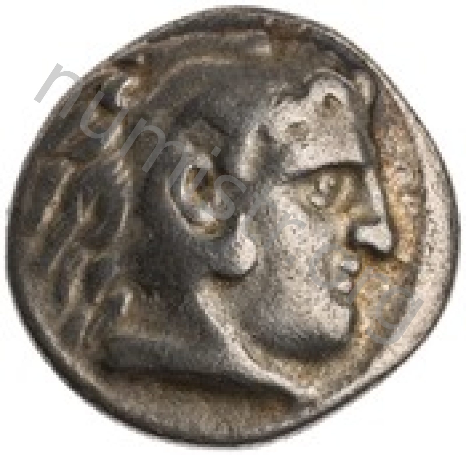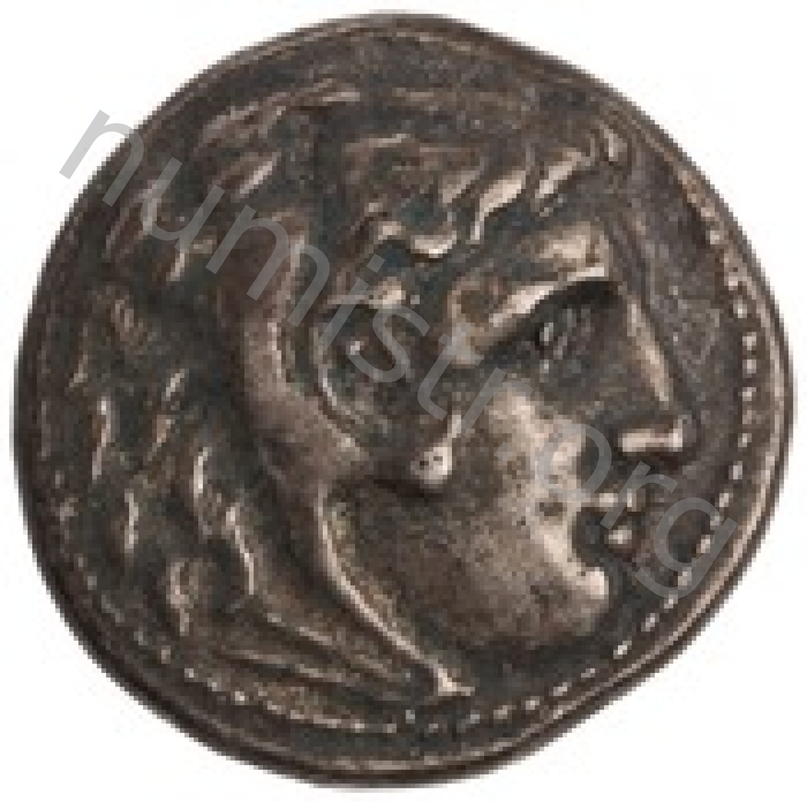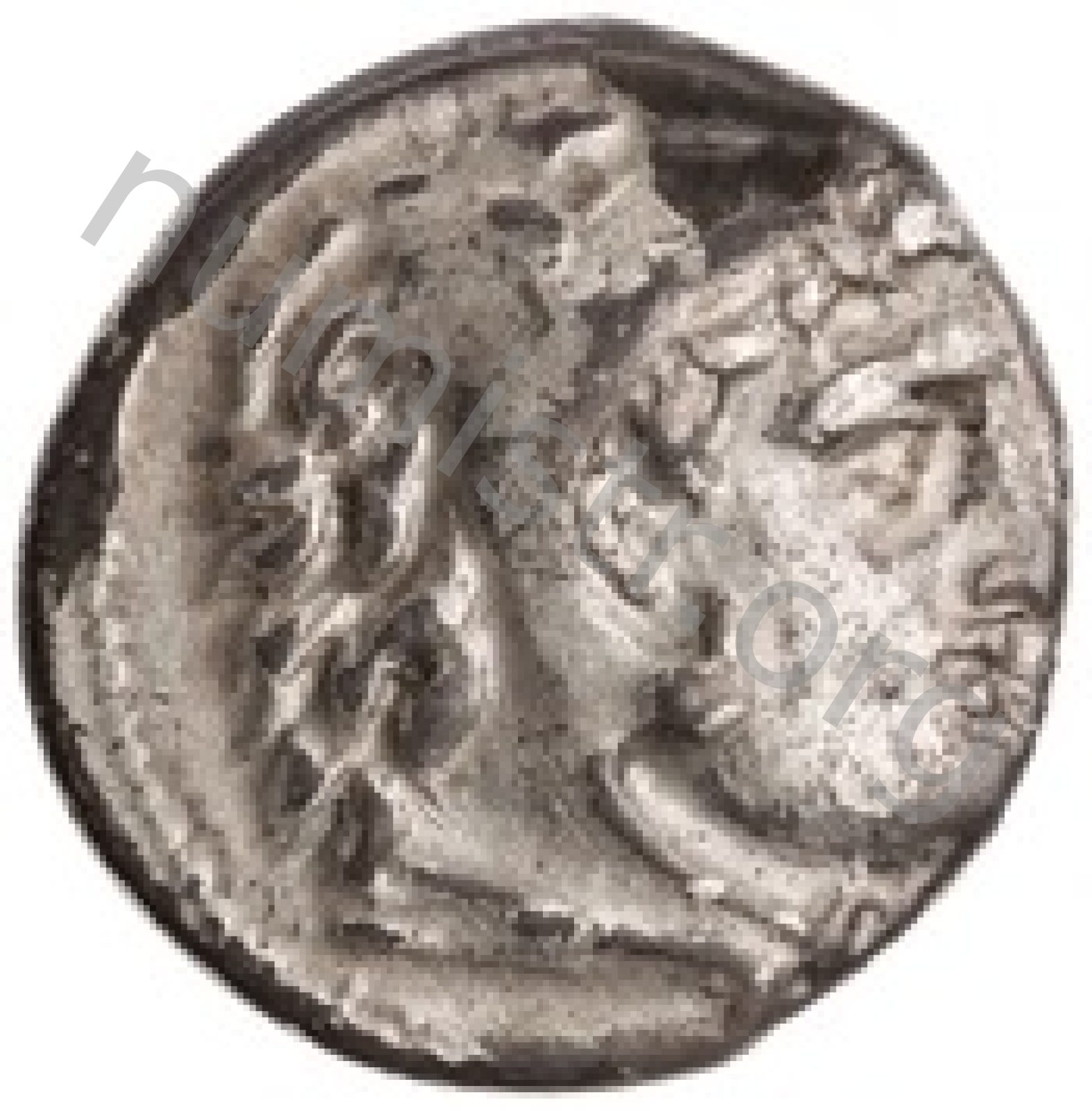 Head of beardless Heracles right wearing lion skin headdress -[en]