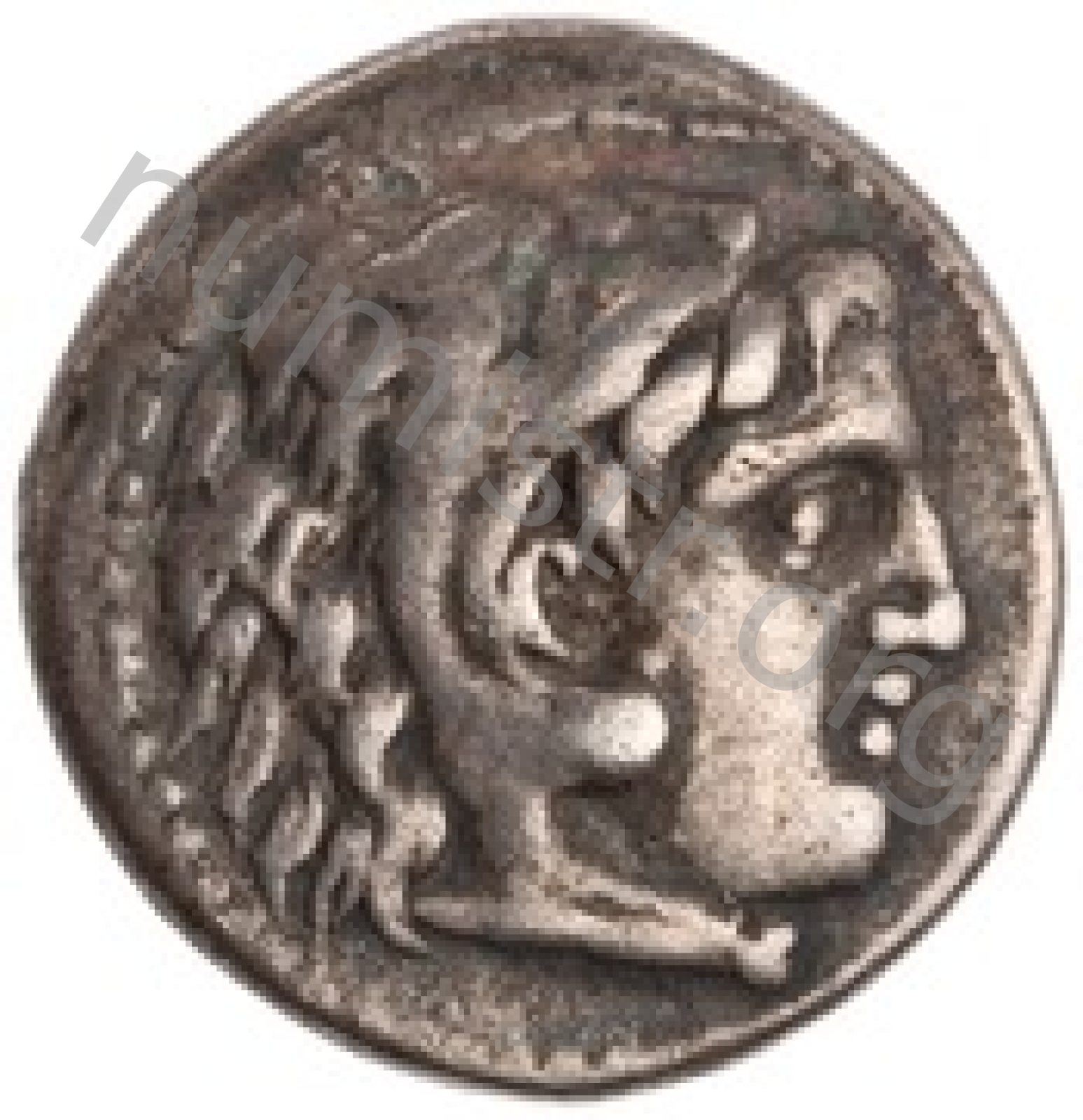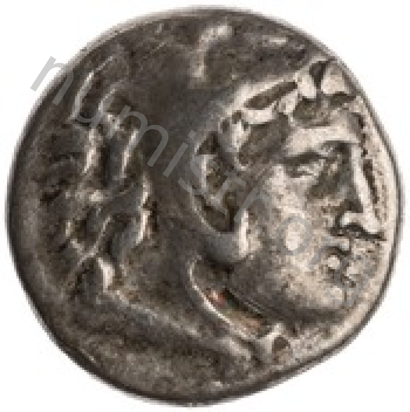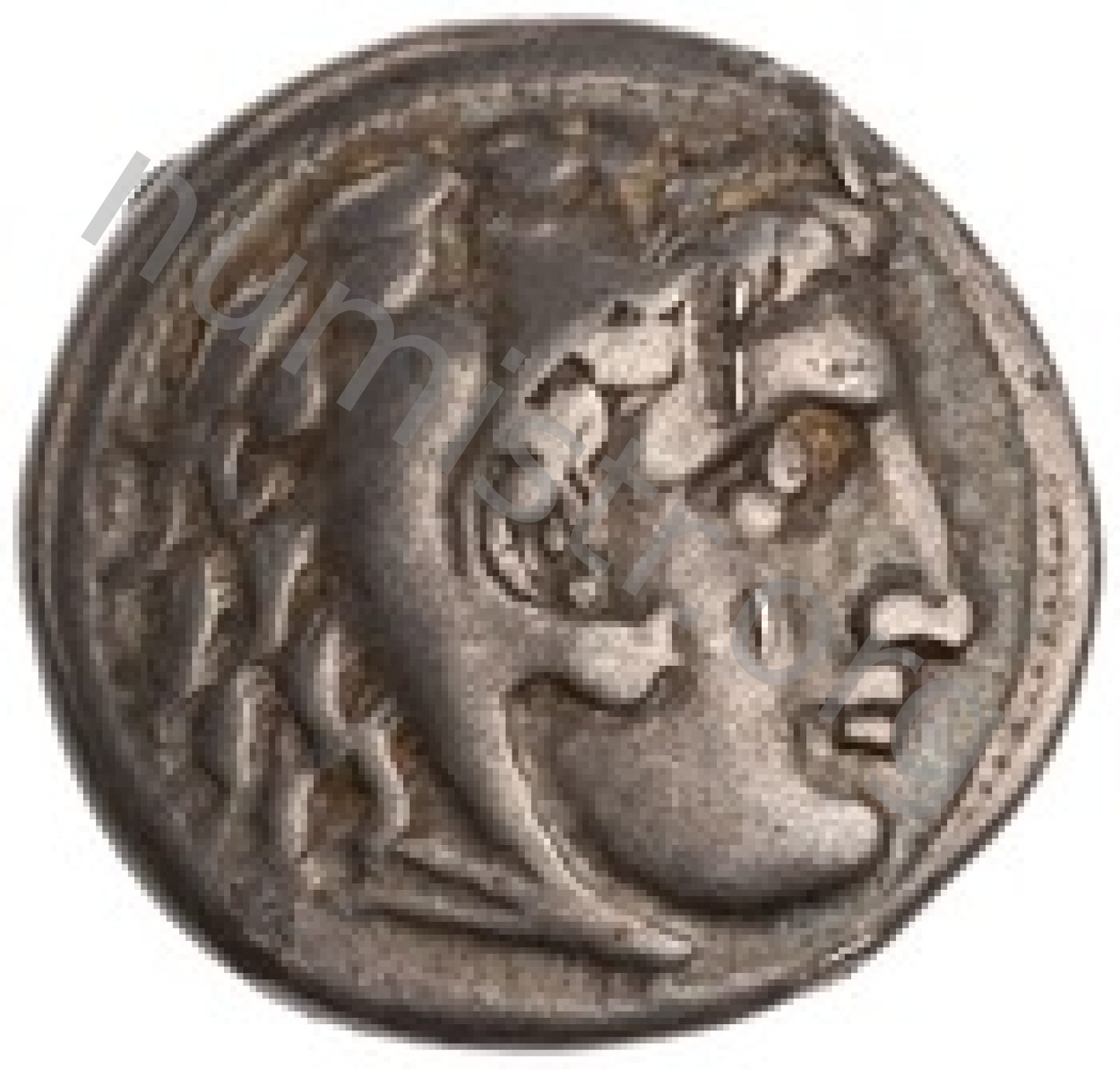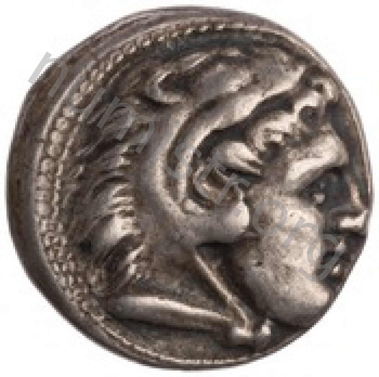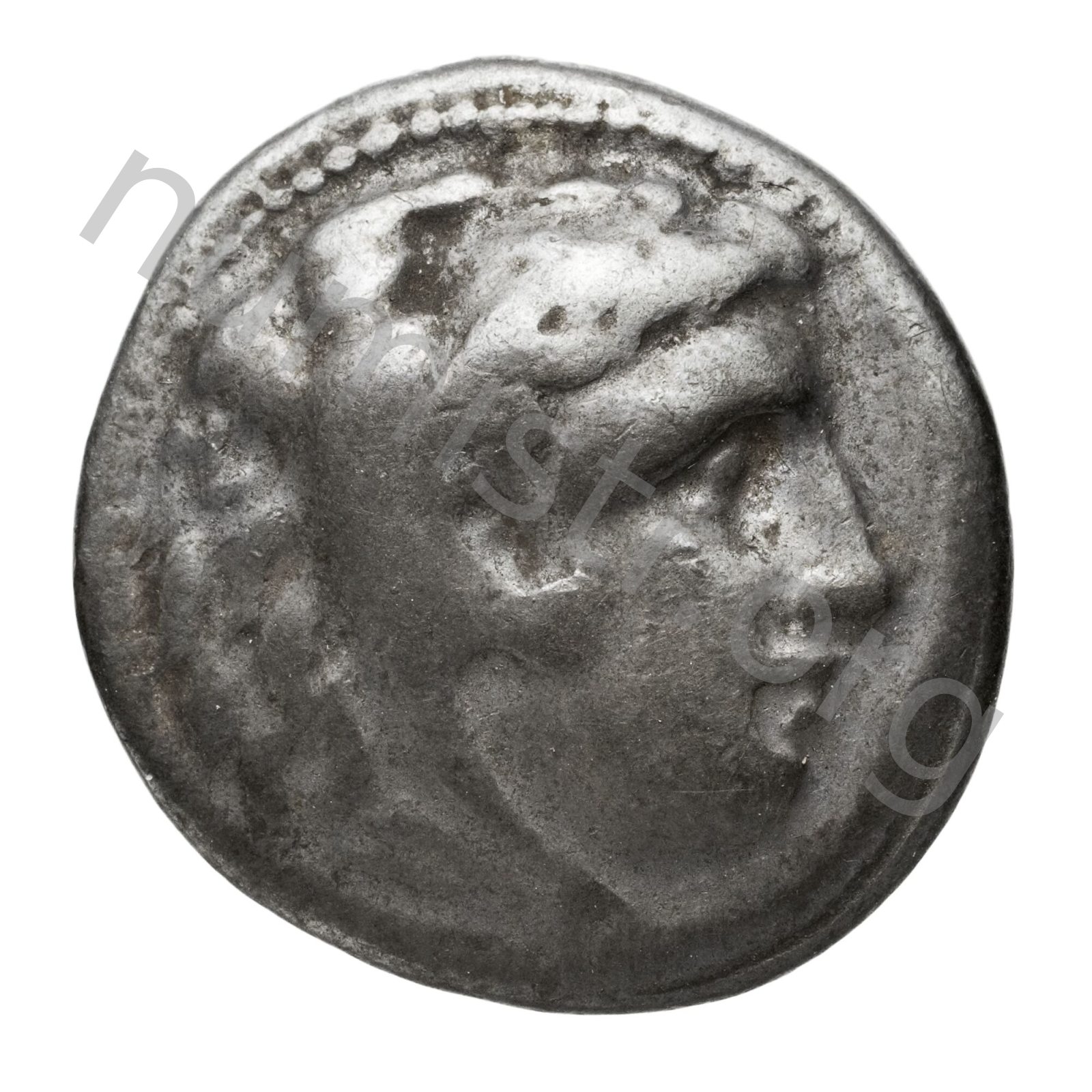 Head of beardless Heracles right wearing lion skin headdress -[en]