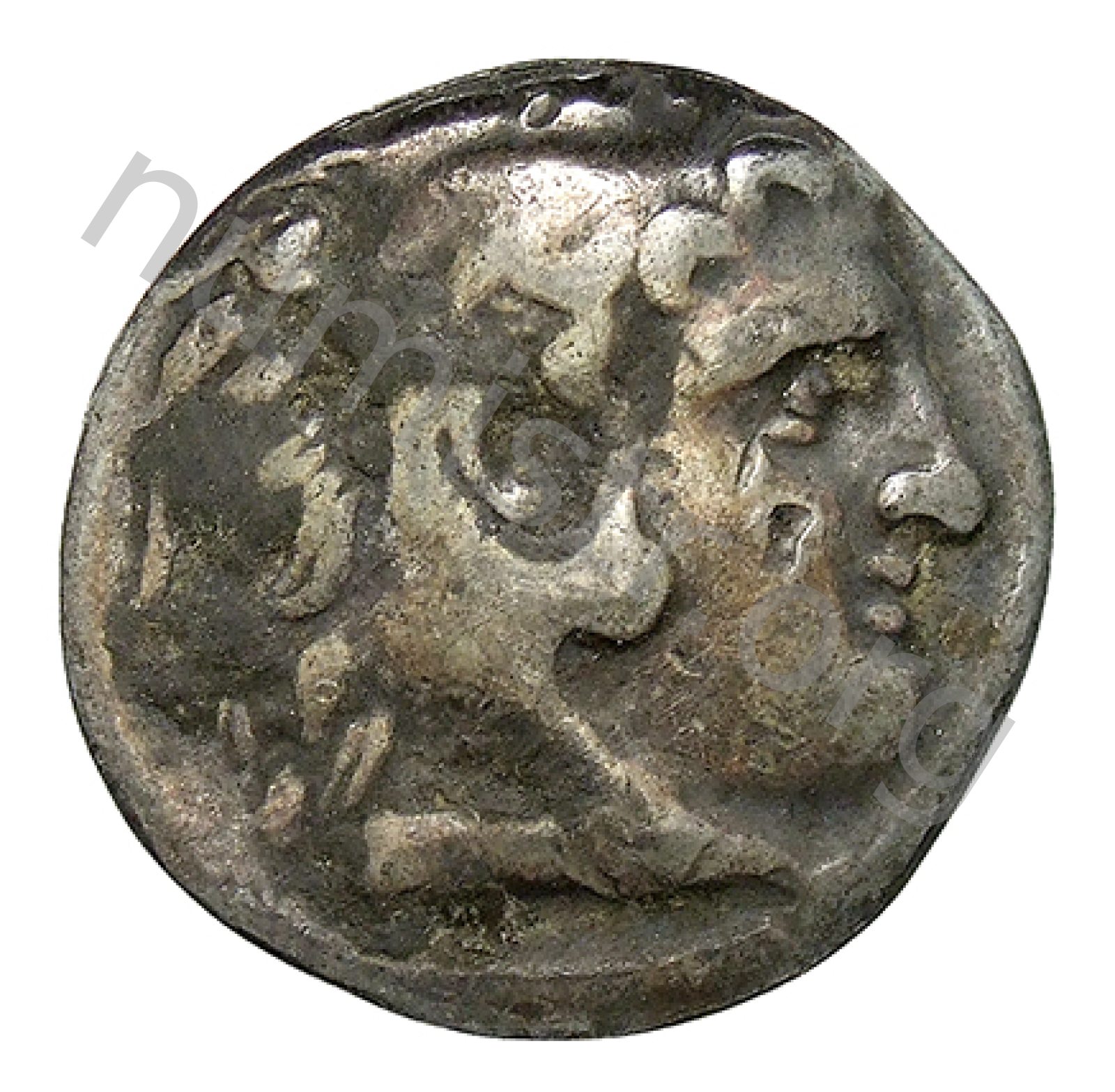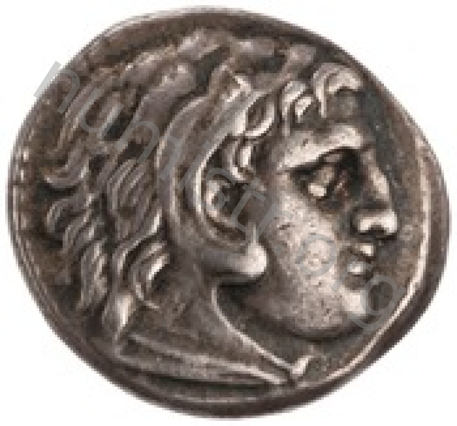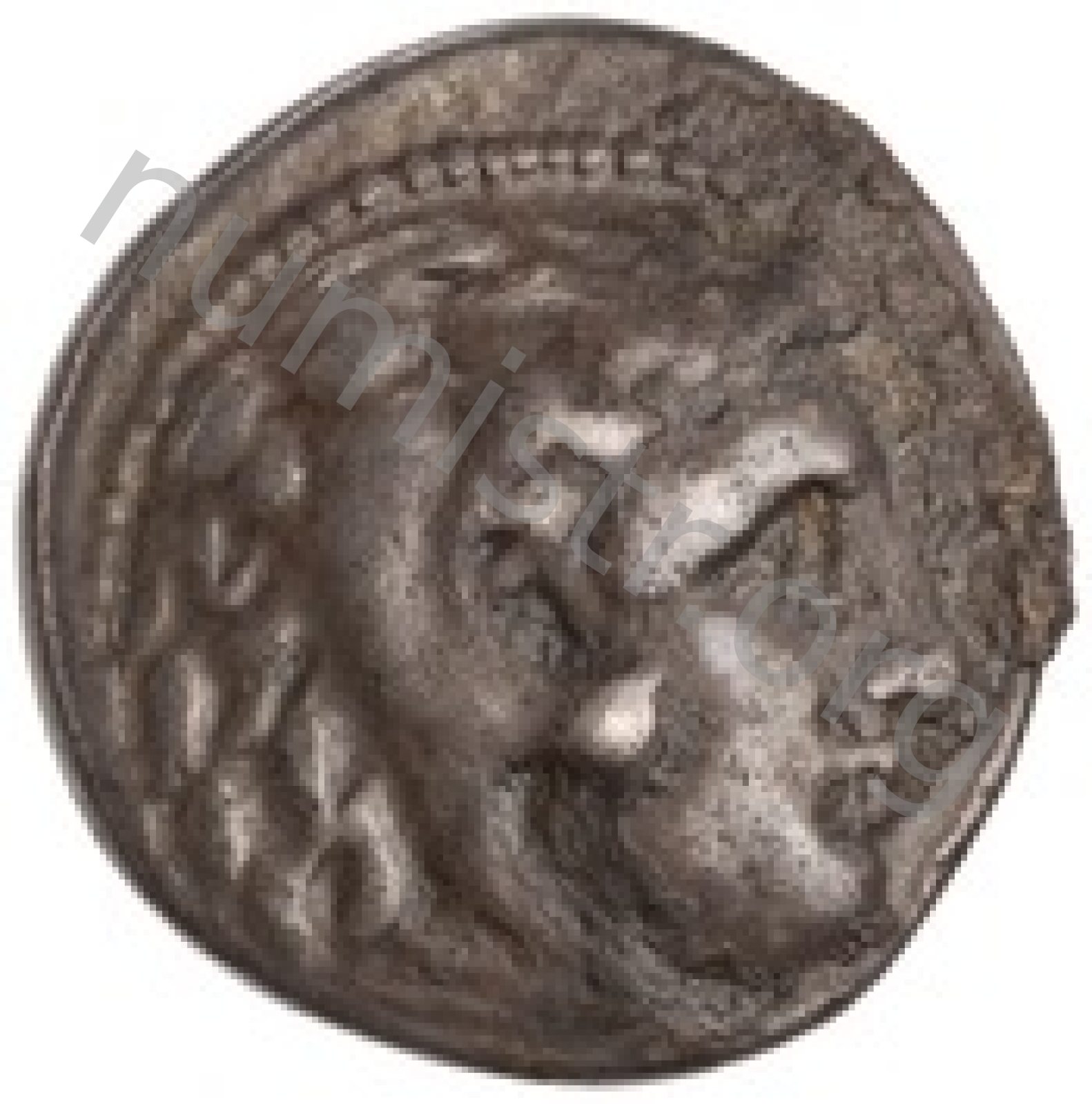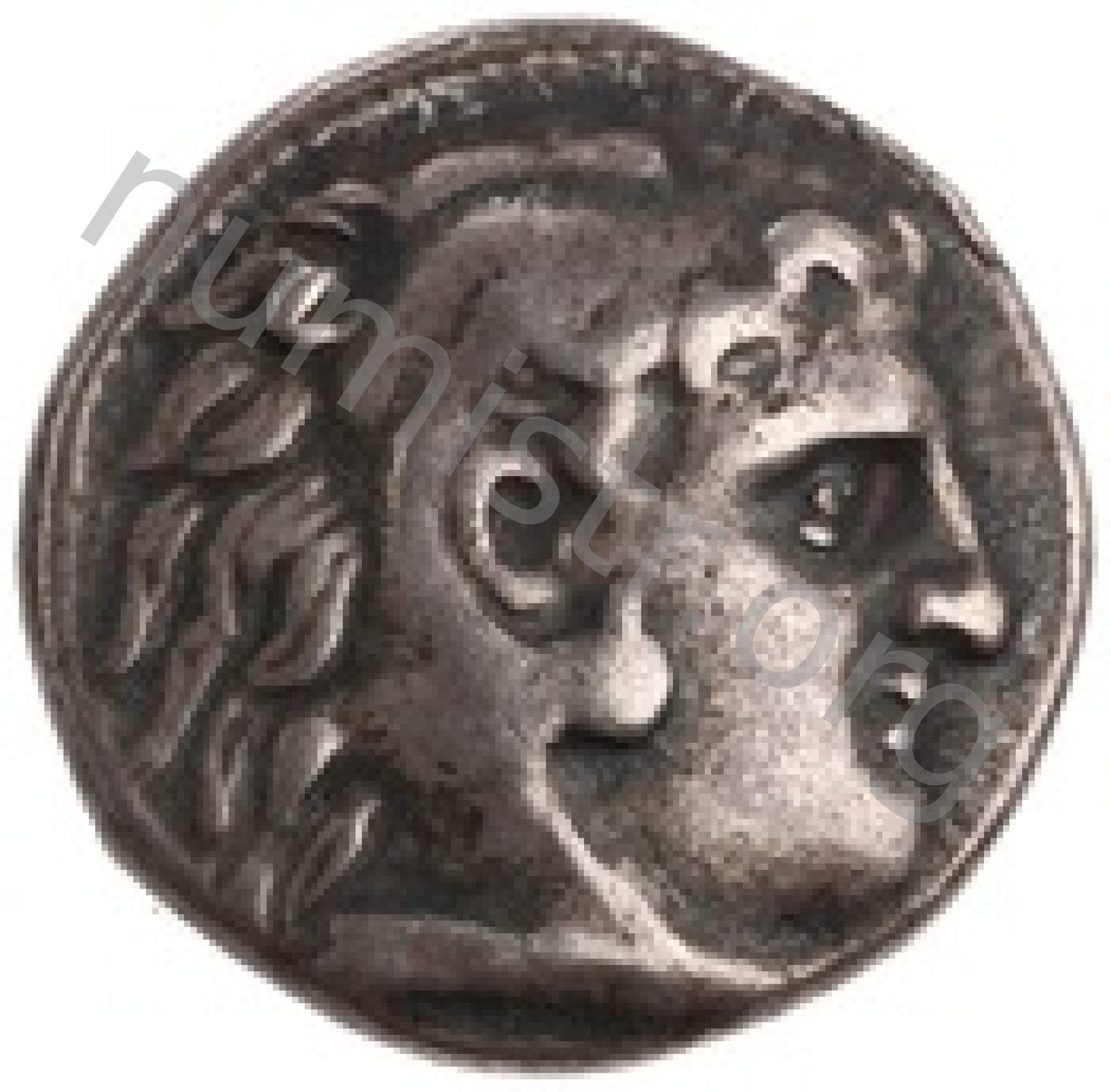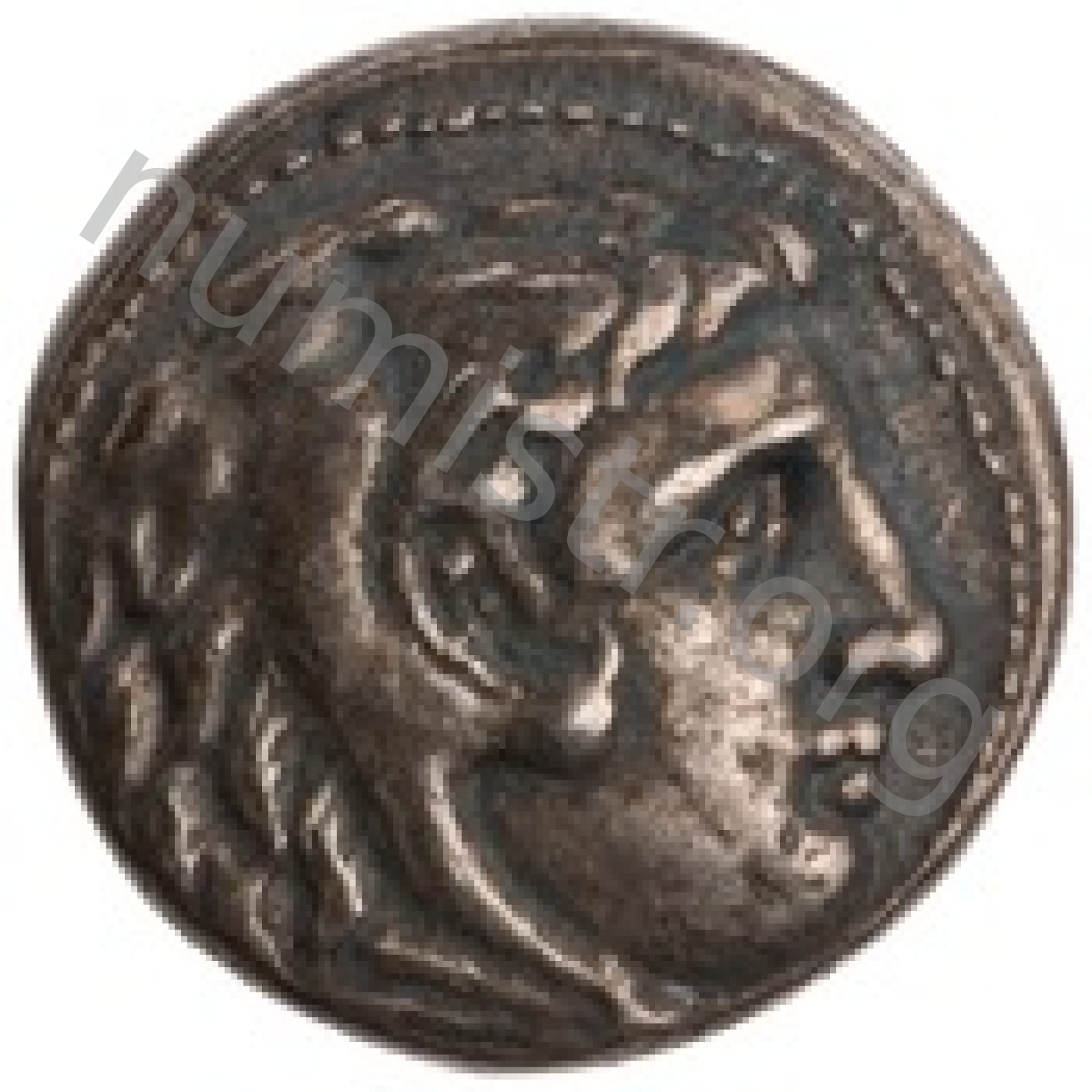 Head of beardless Heracles right wearing lion skin headdress -[en]
