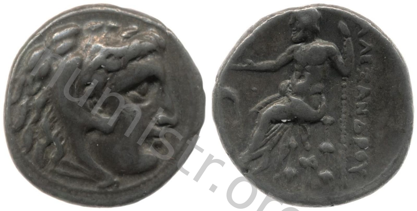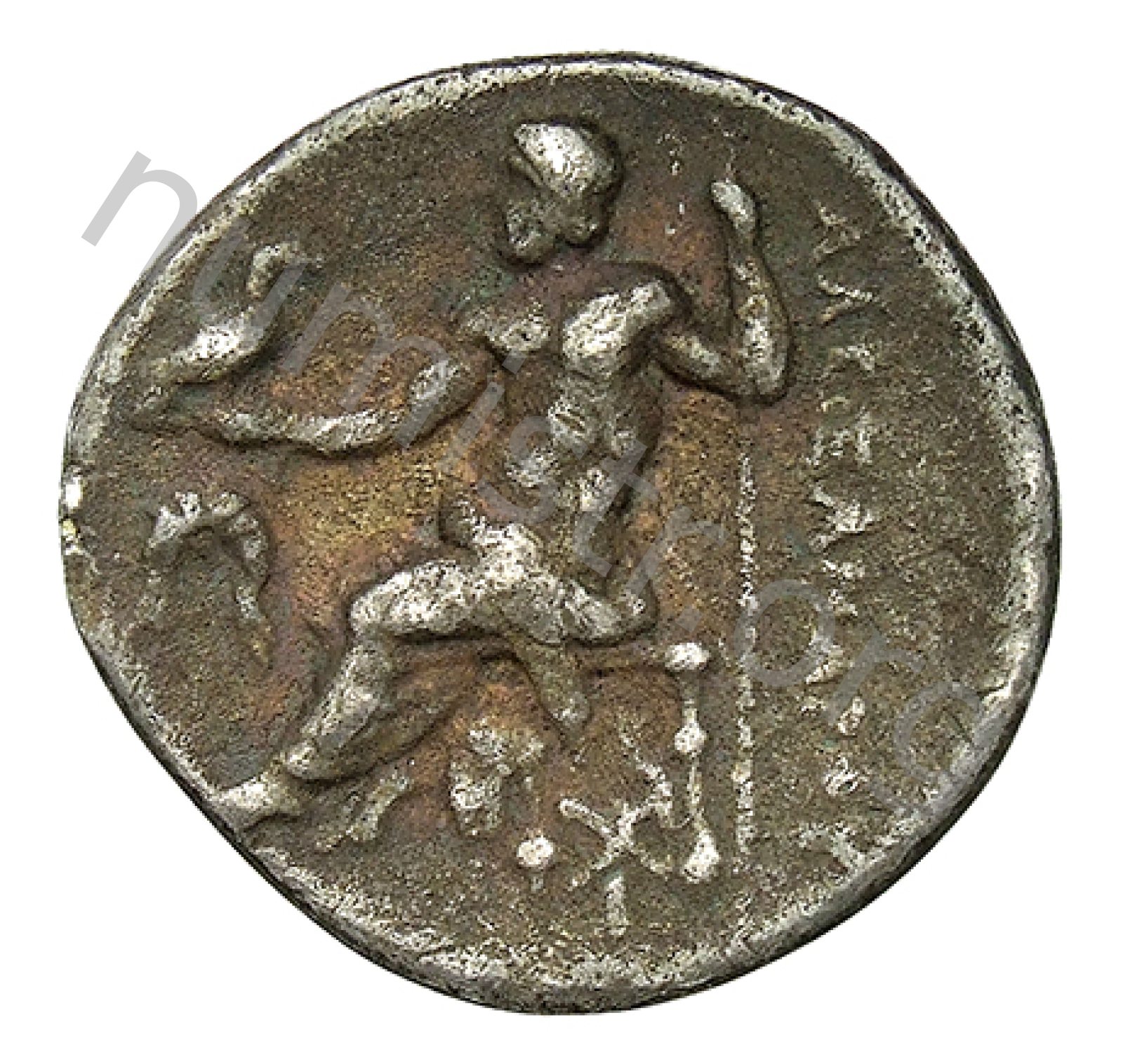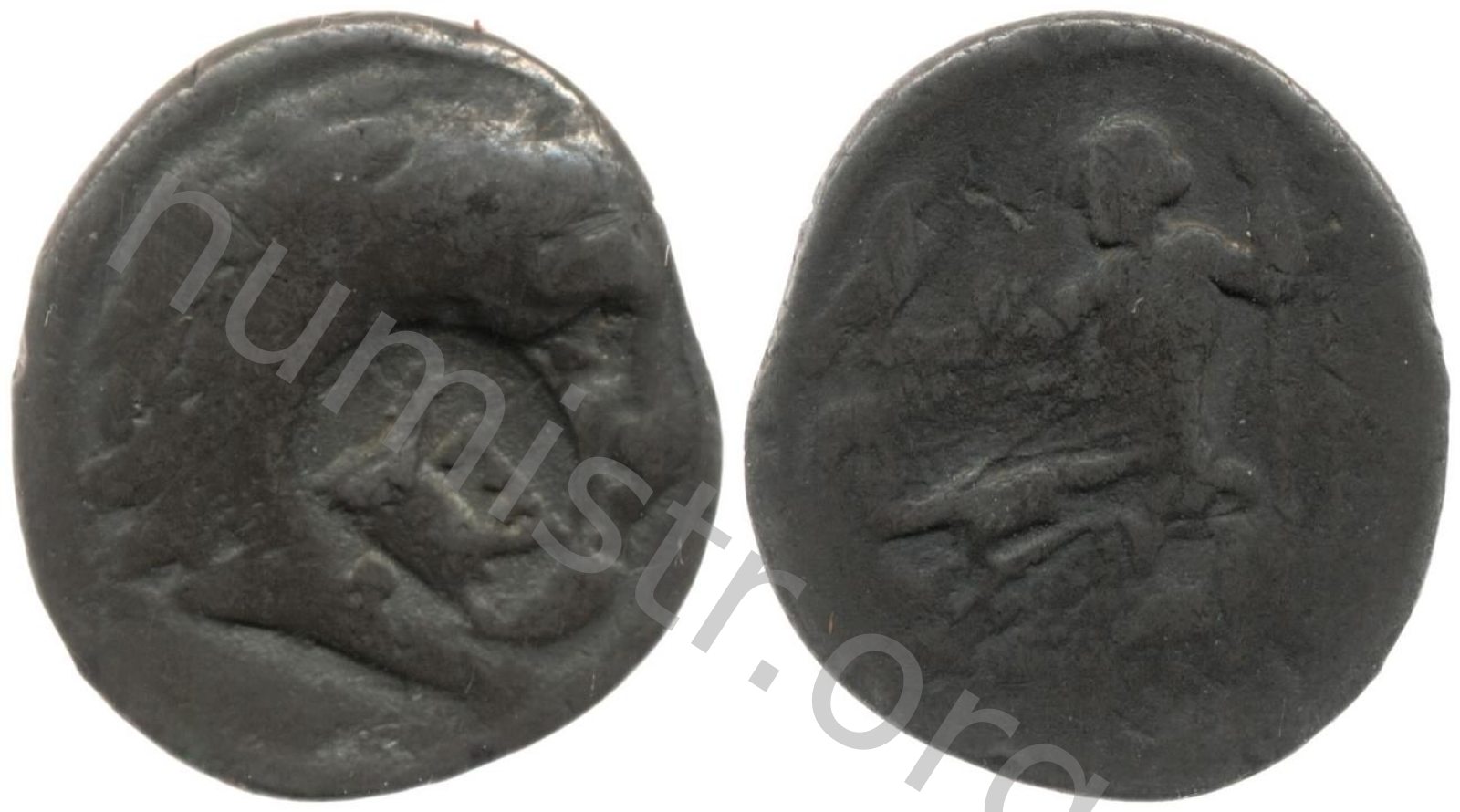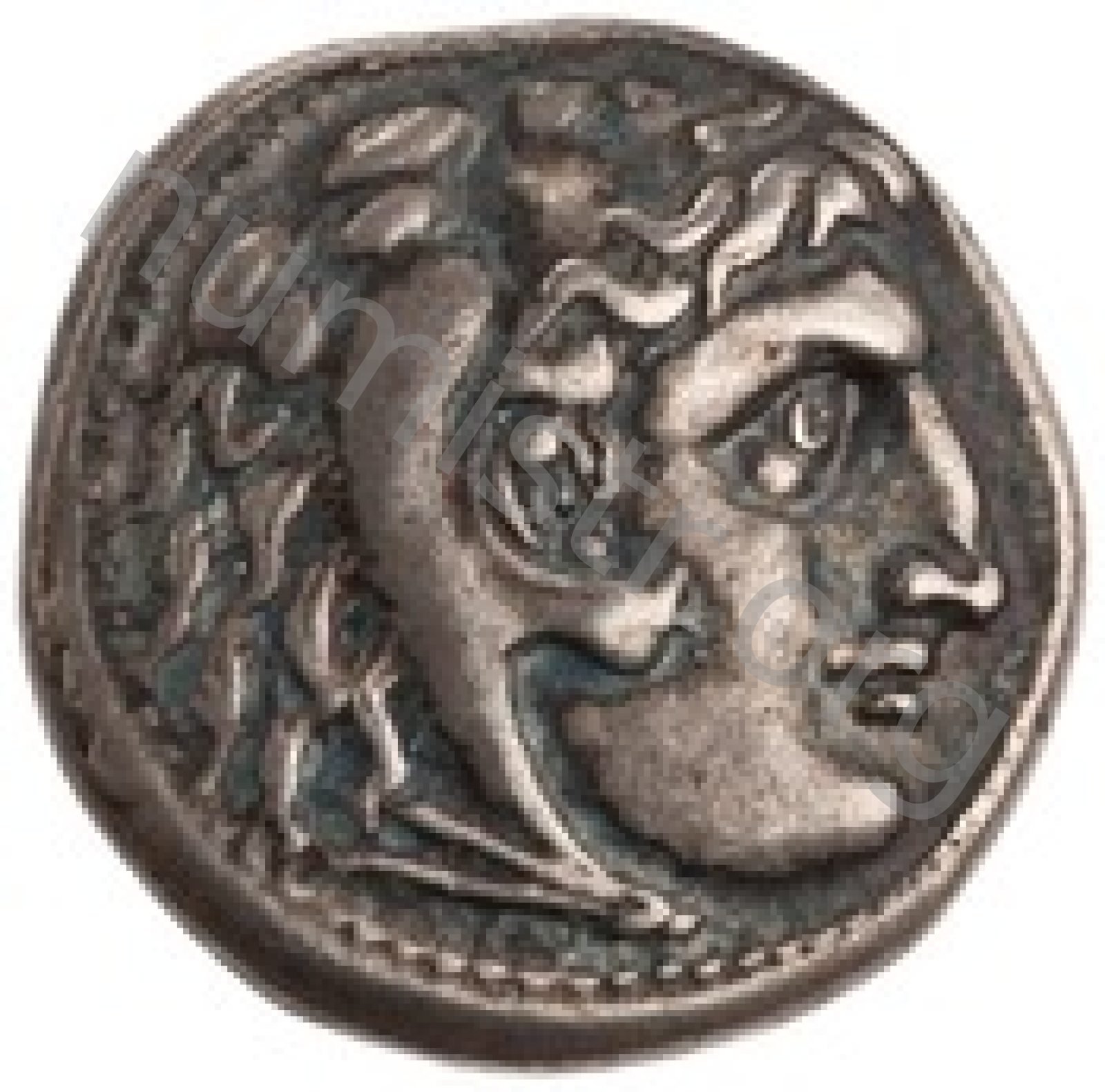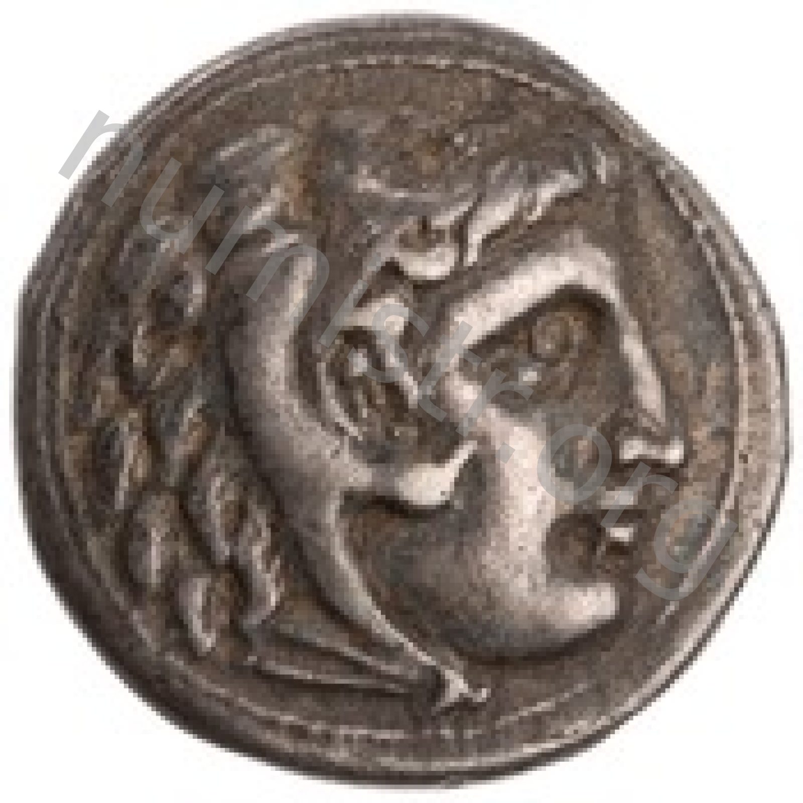 Head of beardless Heracles right wearing lion skin headdress -[en]