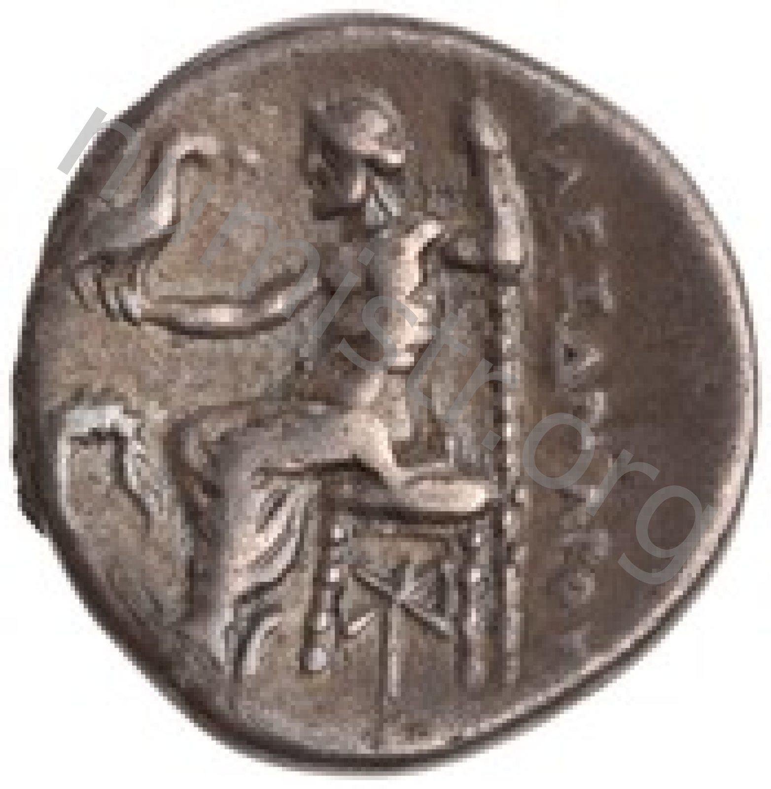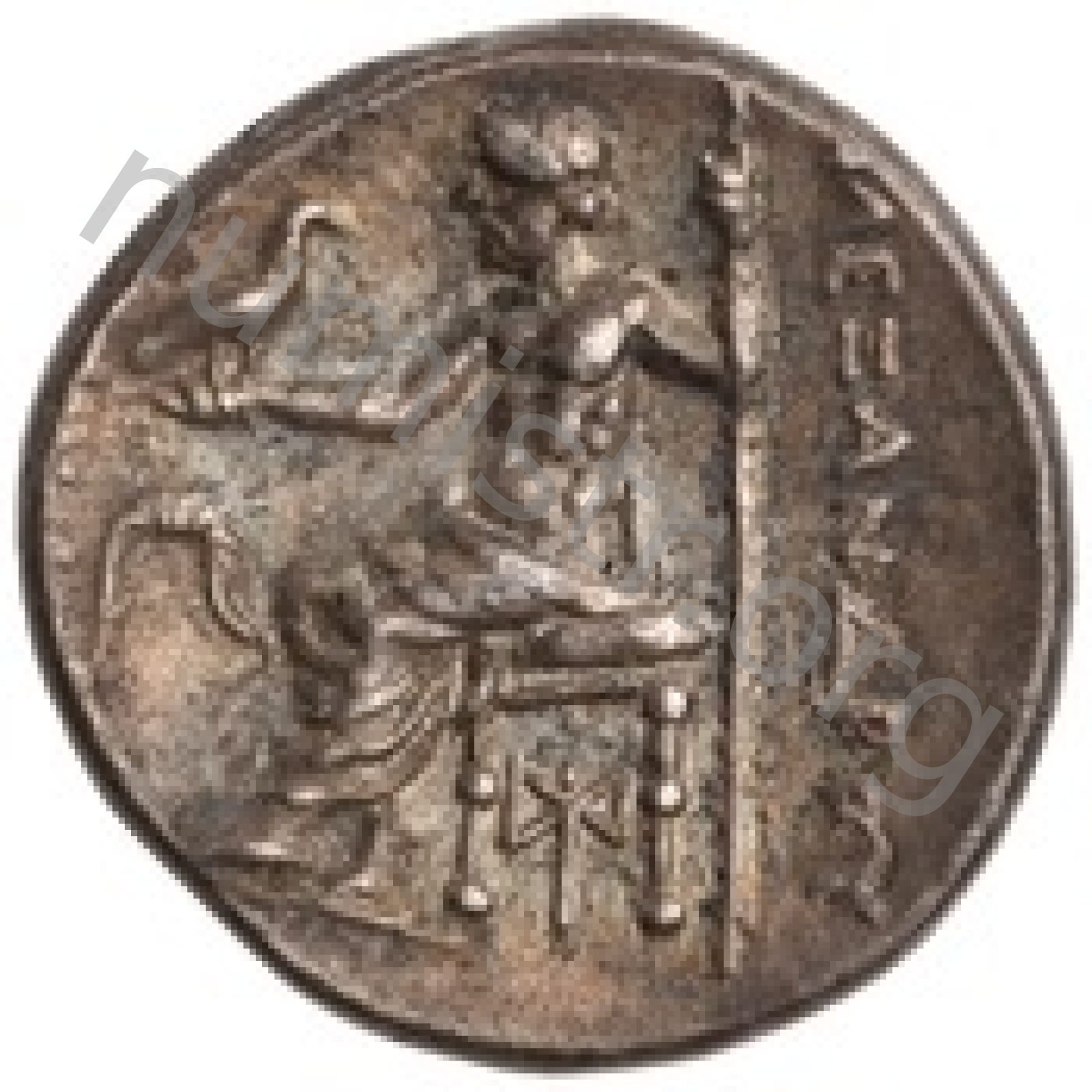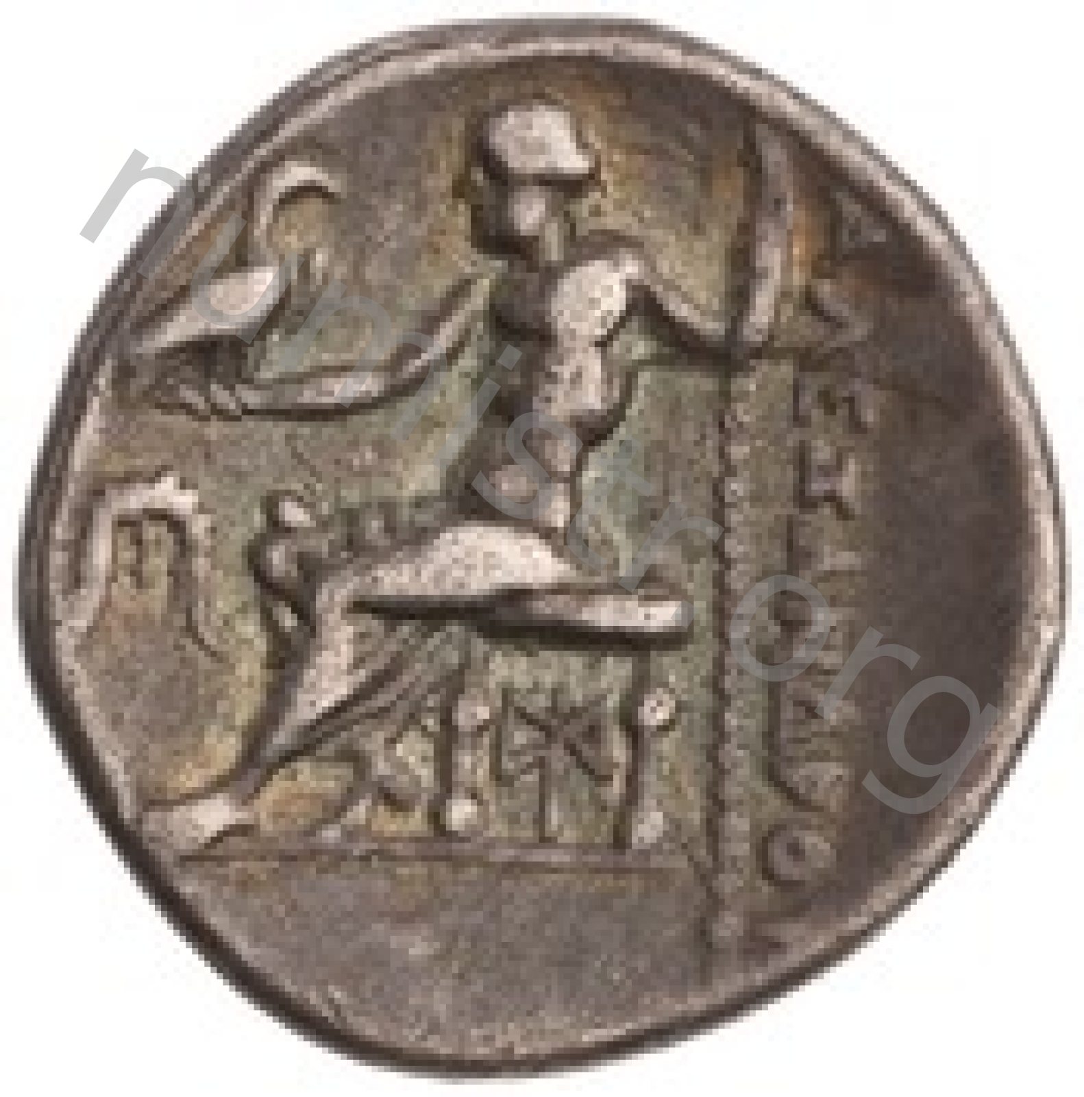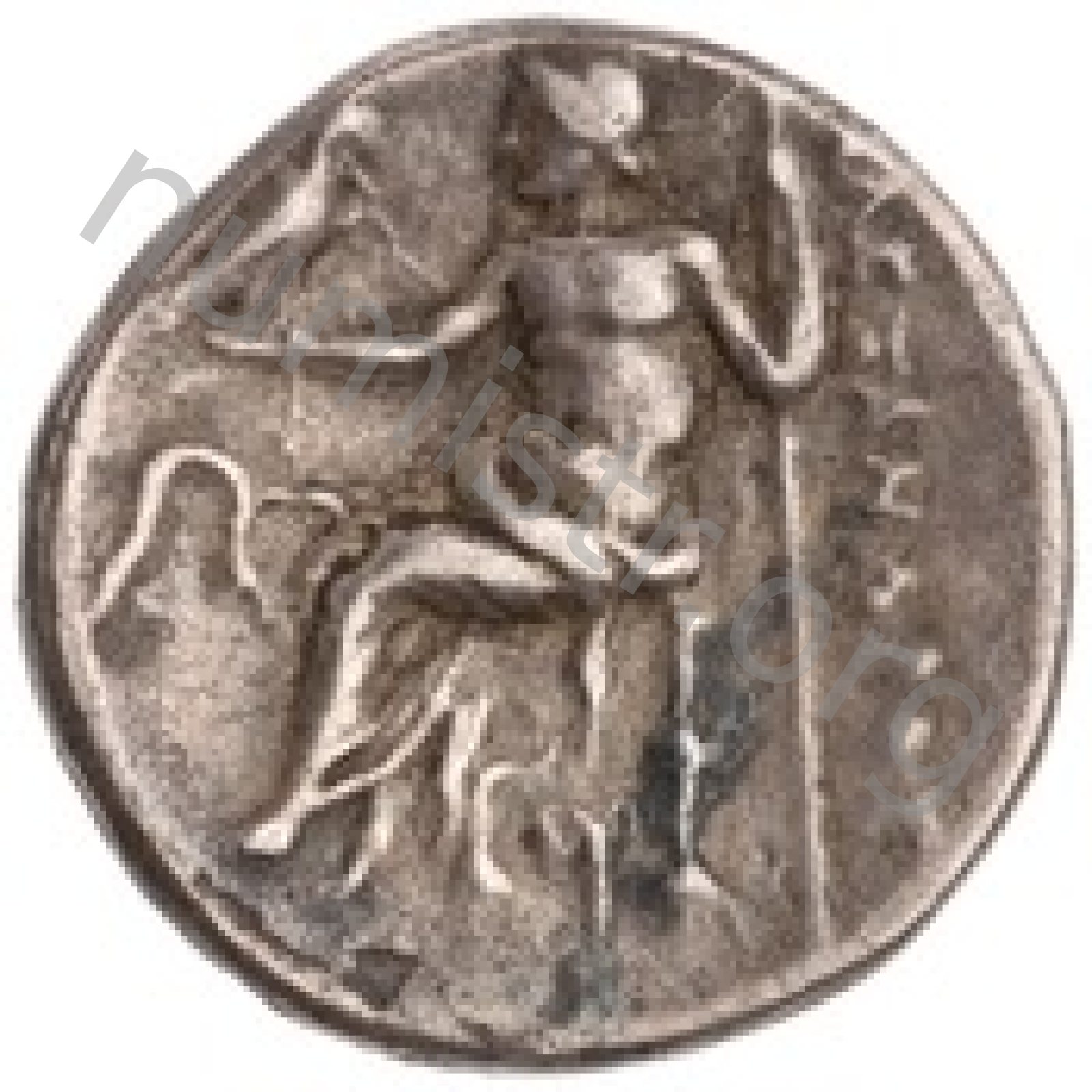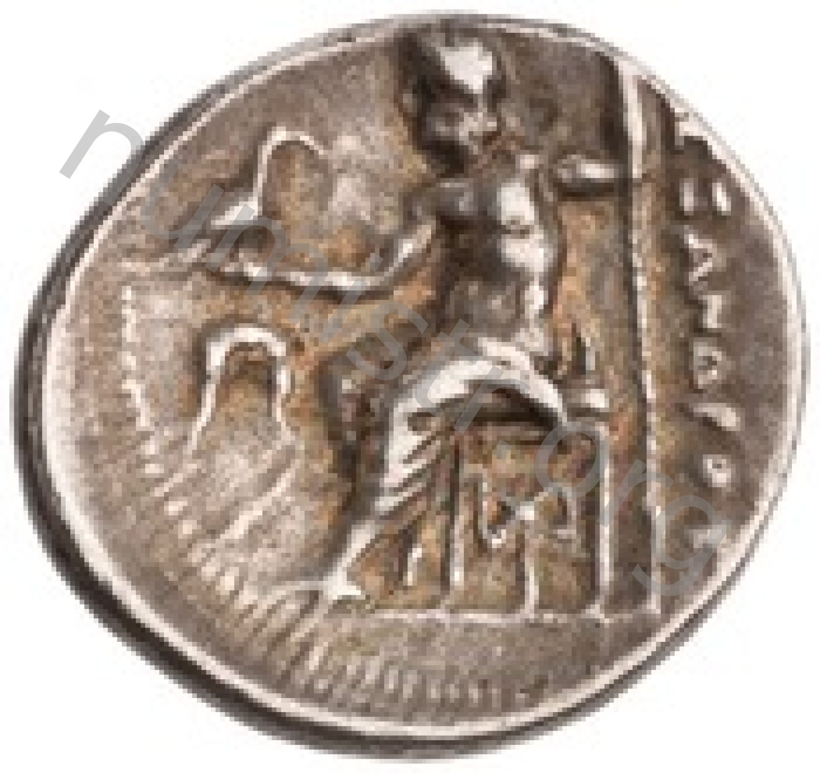 Zeus seated on stool-throne left eagle on outstretched right hand sceptre in left hand -[en]