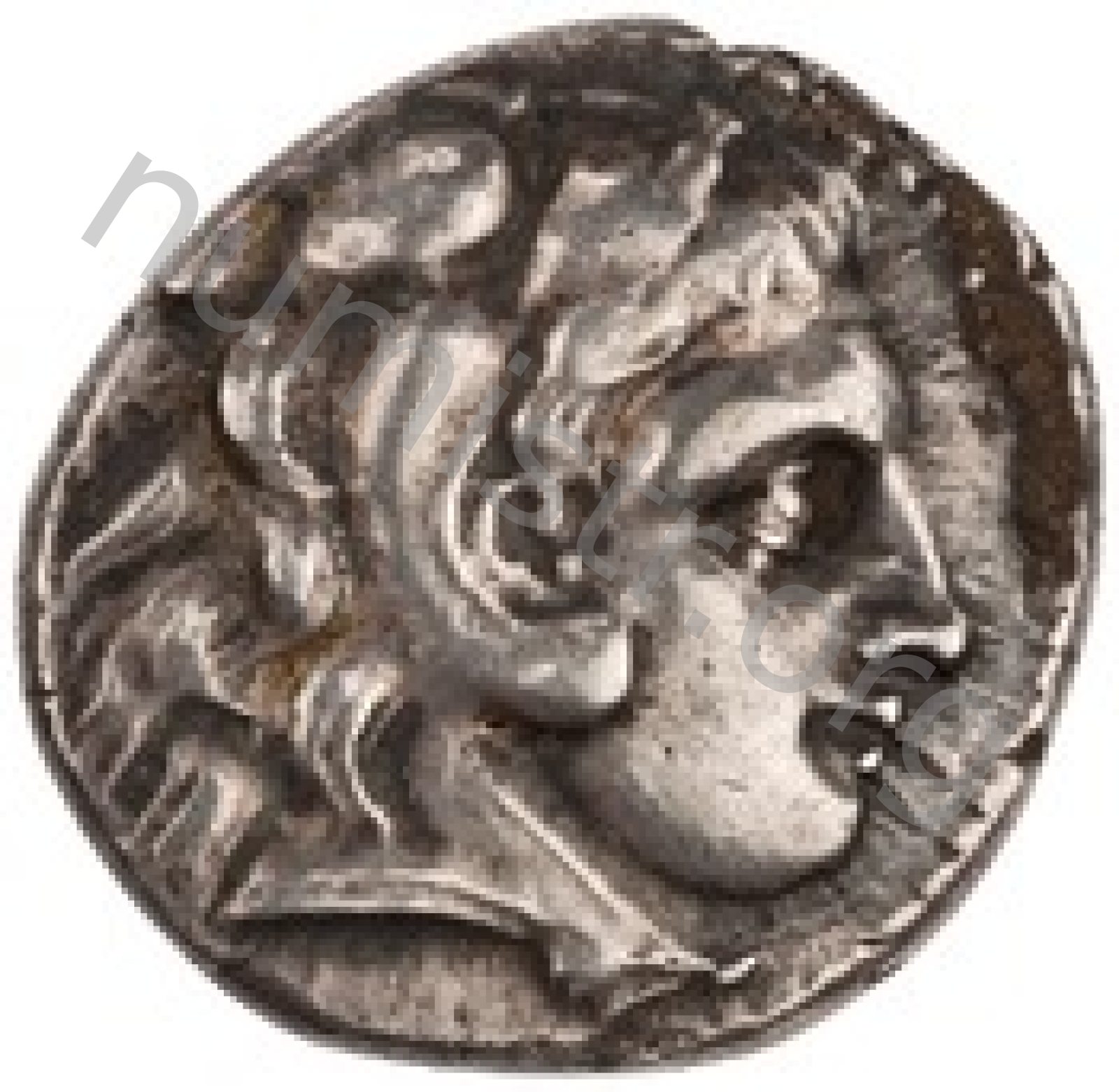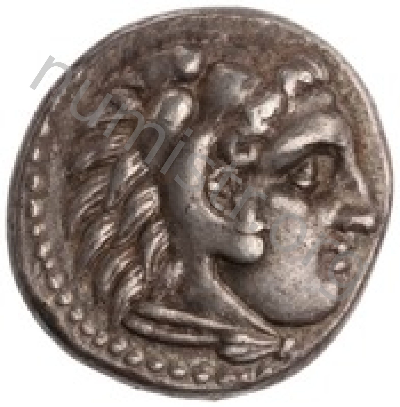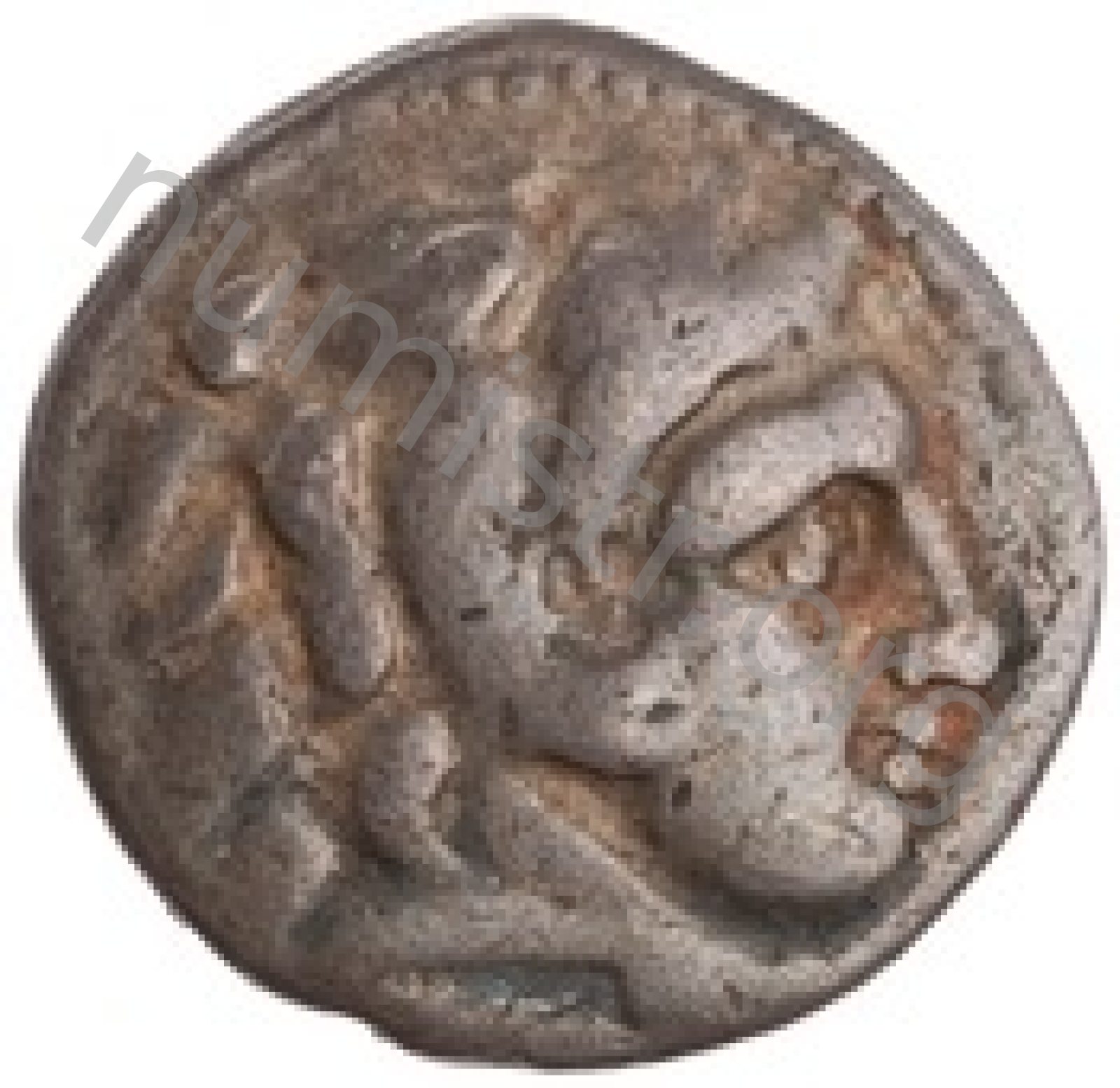 Head of beardless Heracles right wearing lion skin headdress -[en]