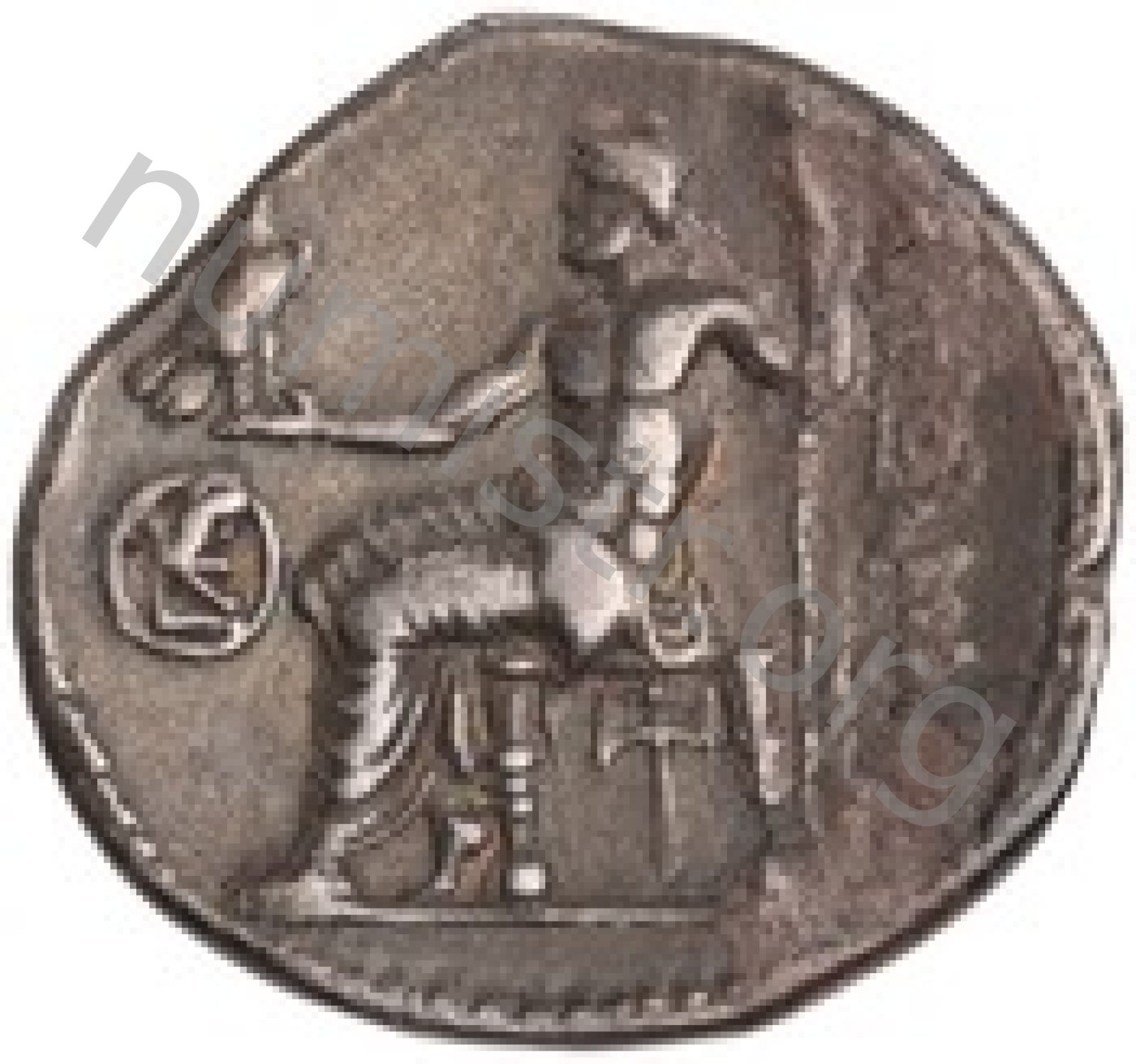 Zeus seated on stool-throne left eagle on outstretched right hand sceptre in left hand -[en]