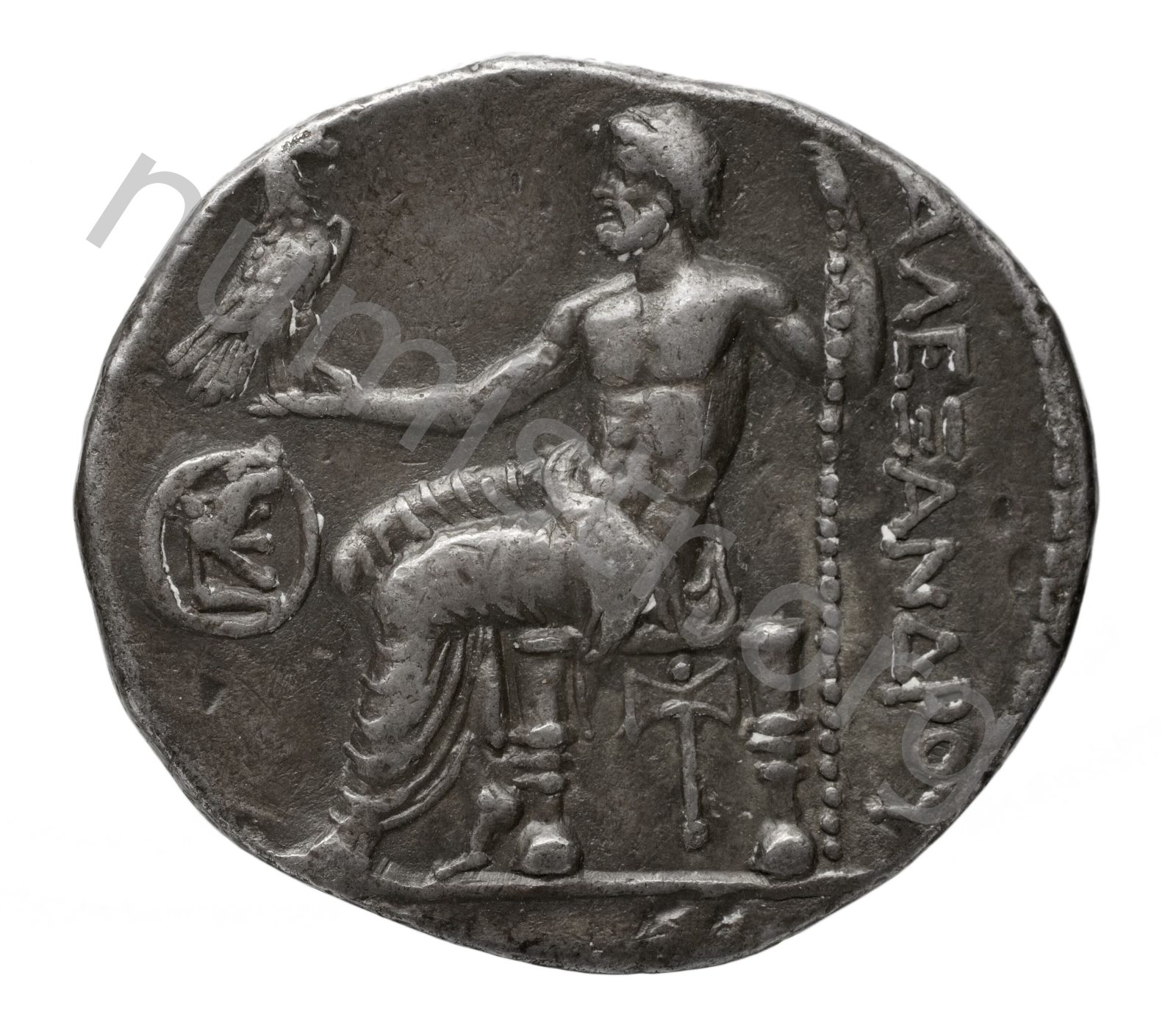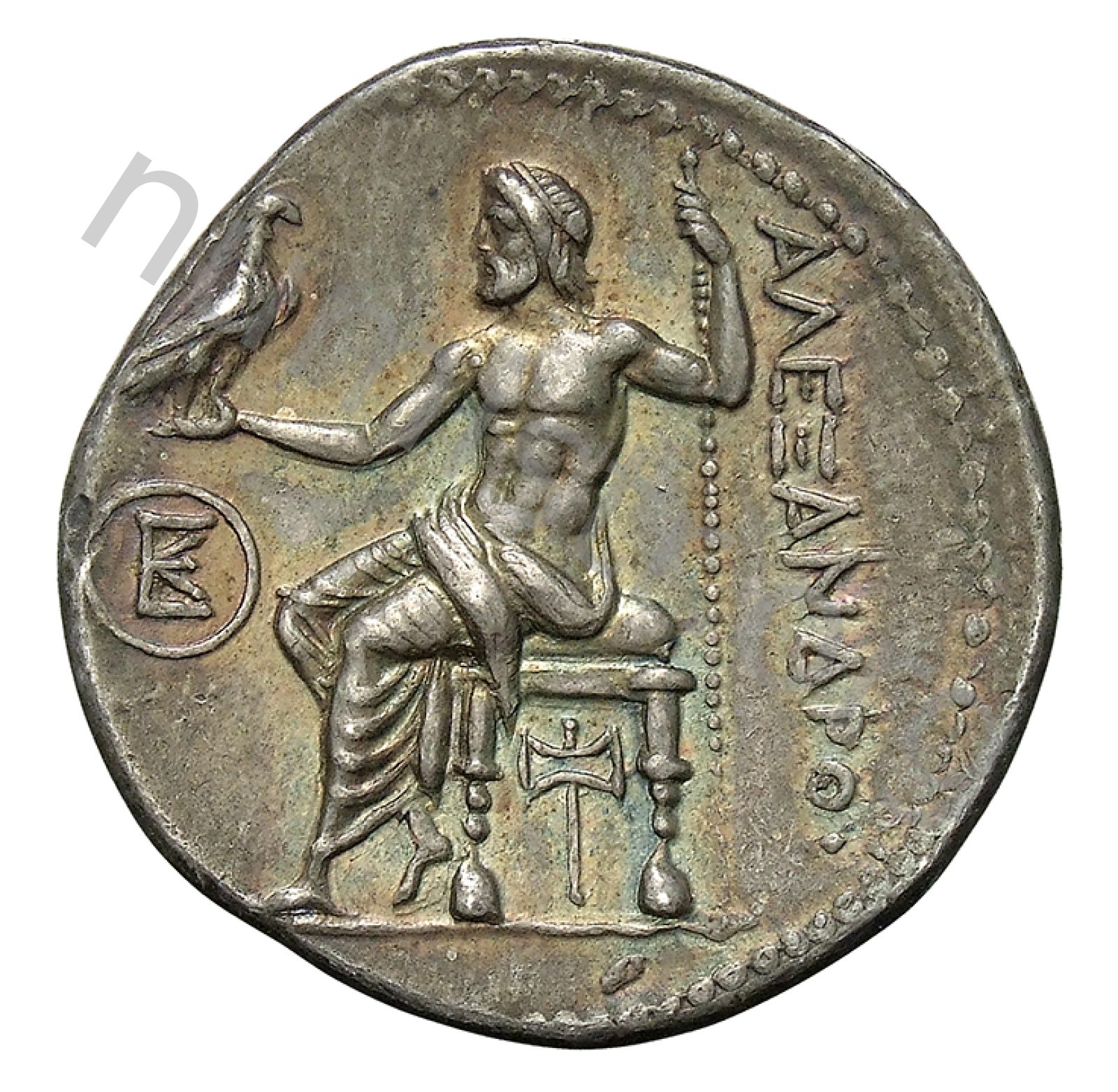 Zeus tabure-tahtta oturuyor sol elinde kartal sağ elinde asa var.