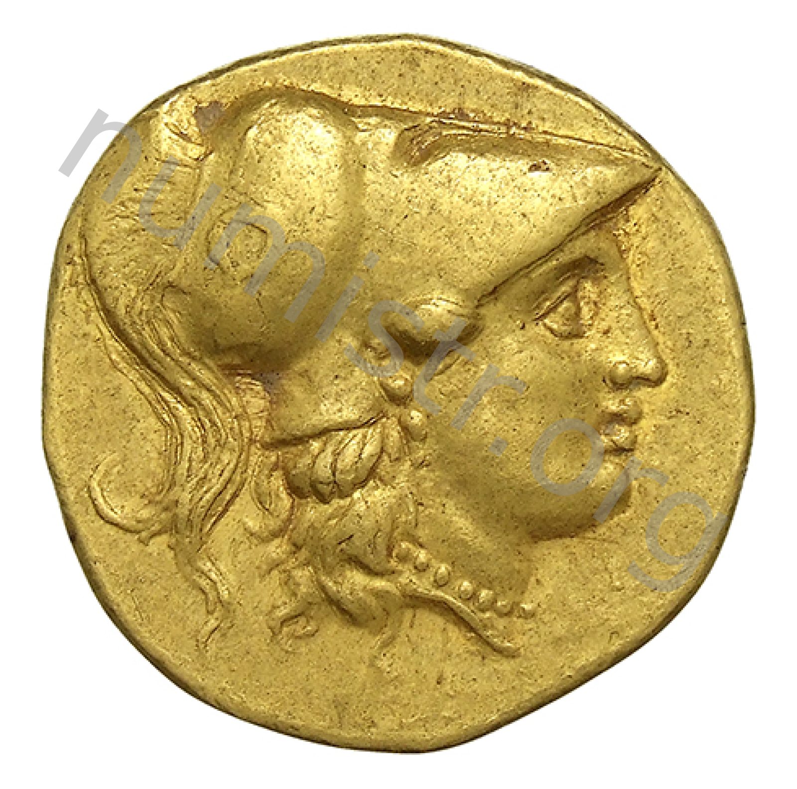 Head of Athena right wearing Corinthian helmet with crest -[en]