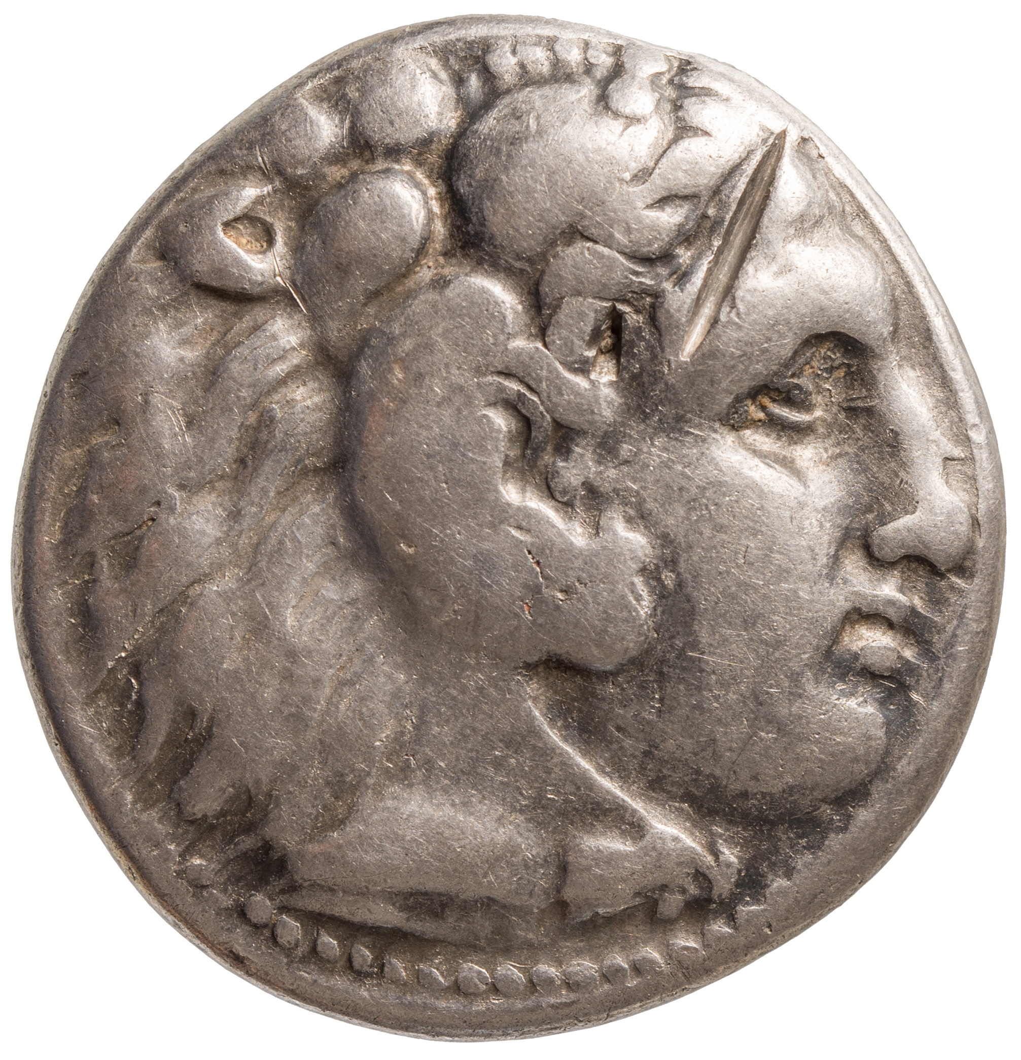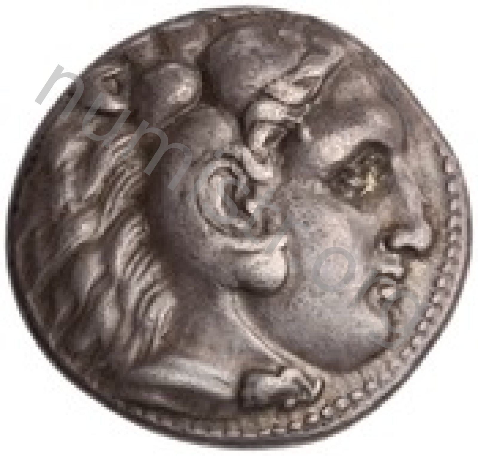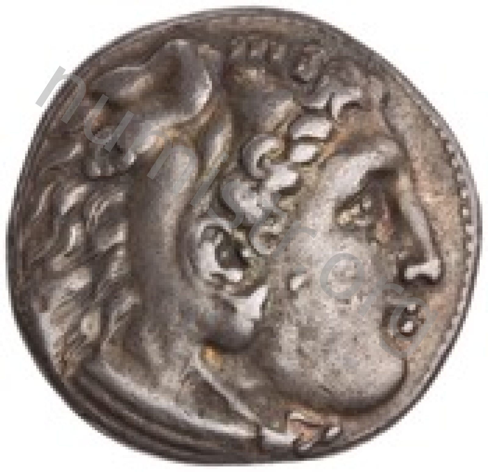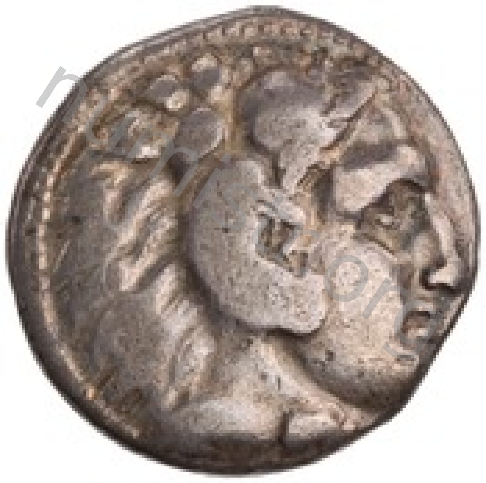 Head of beardless Heracles right wearing lion skin headdress -[en]
