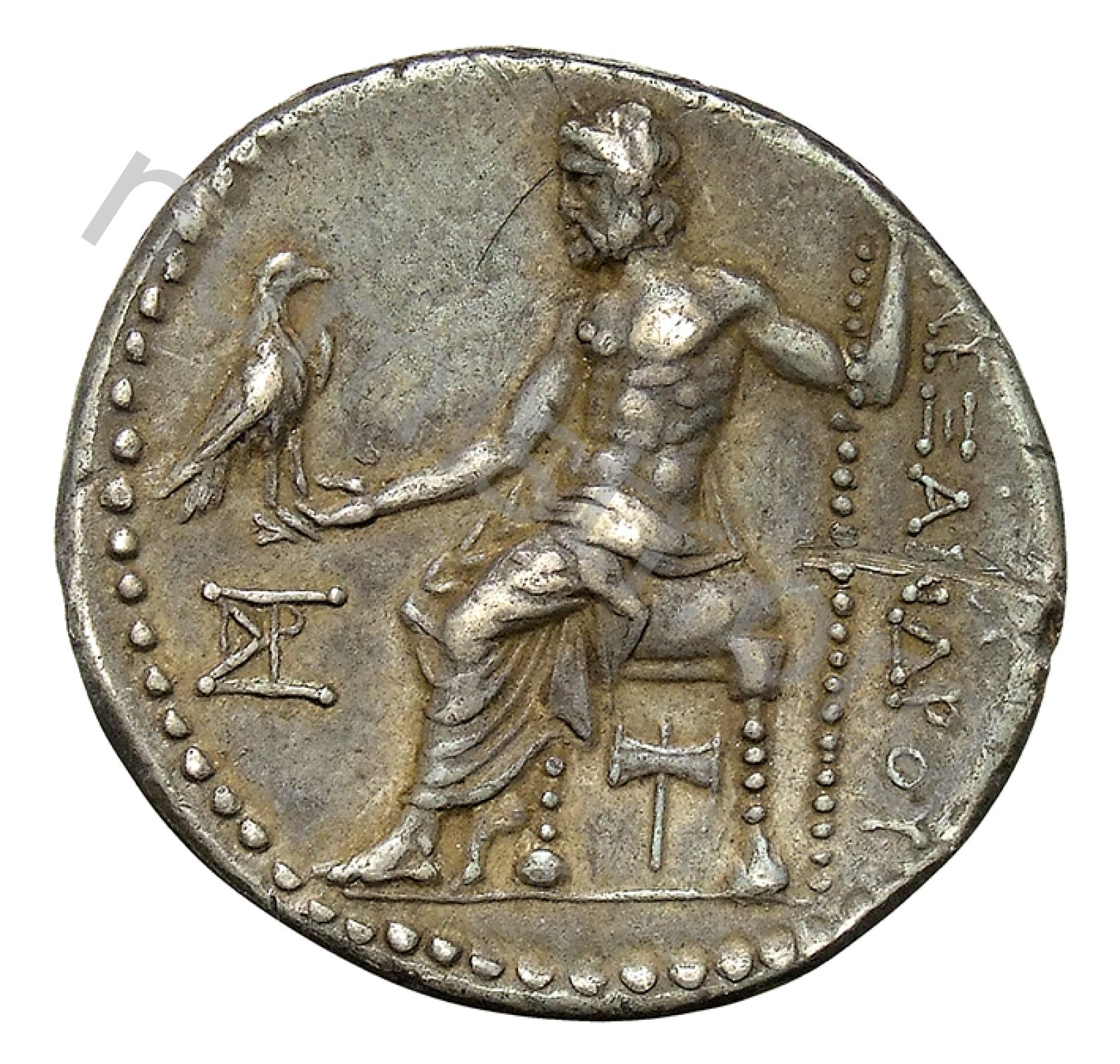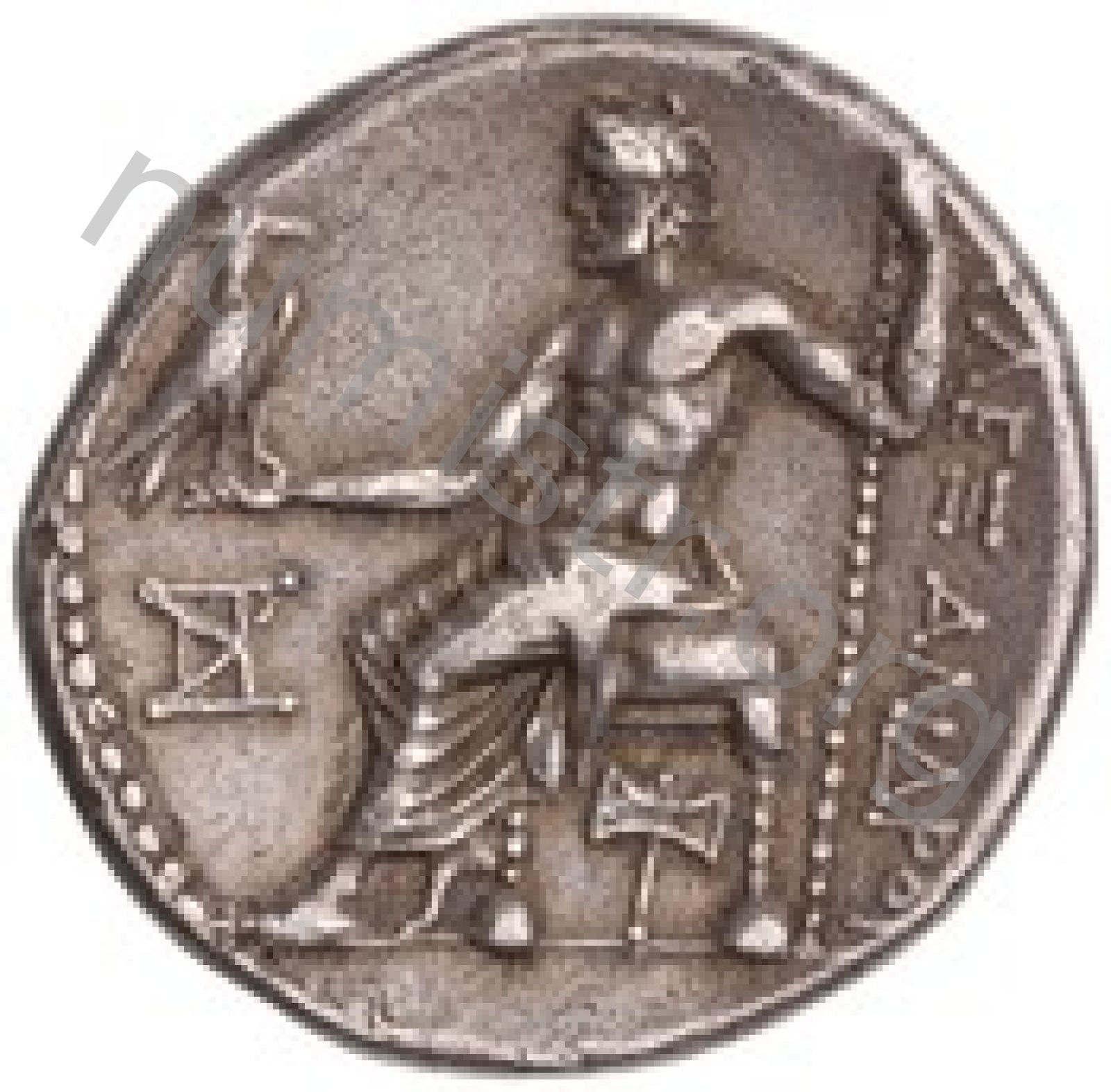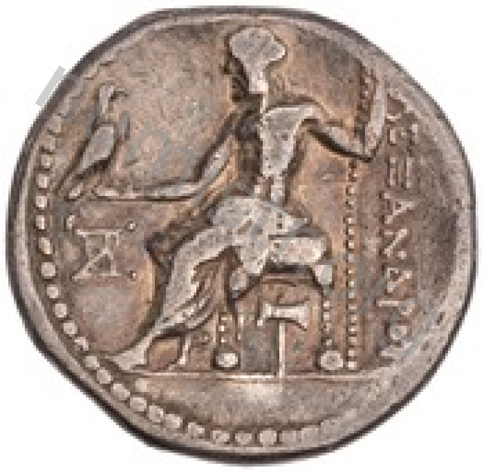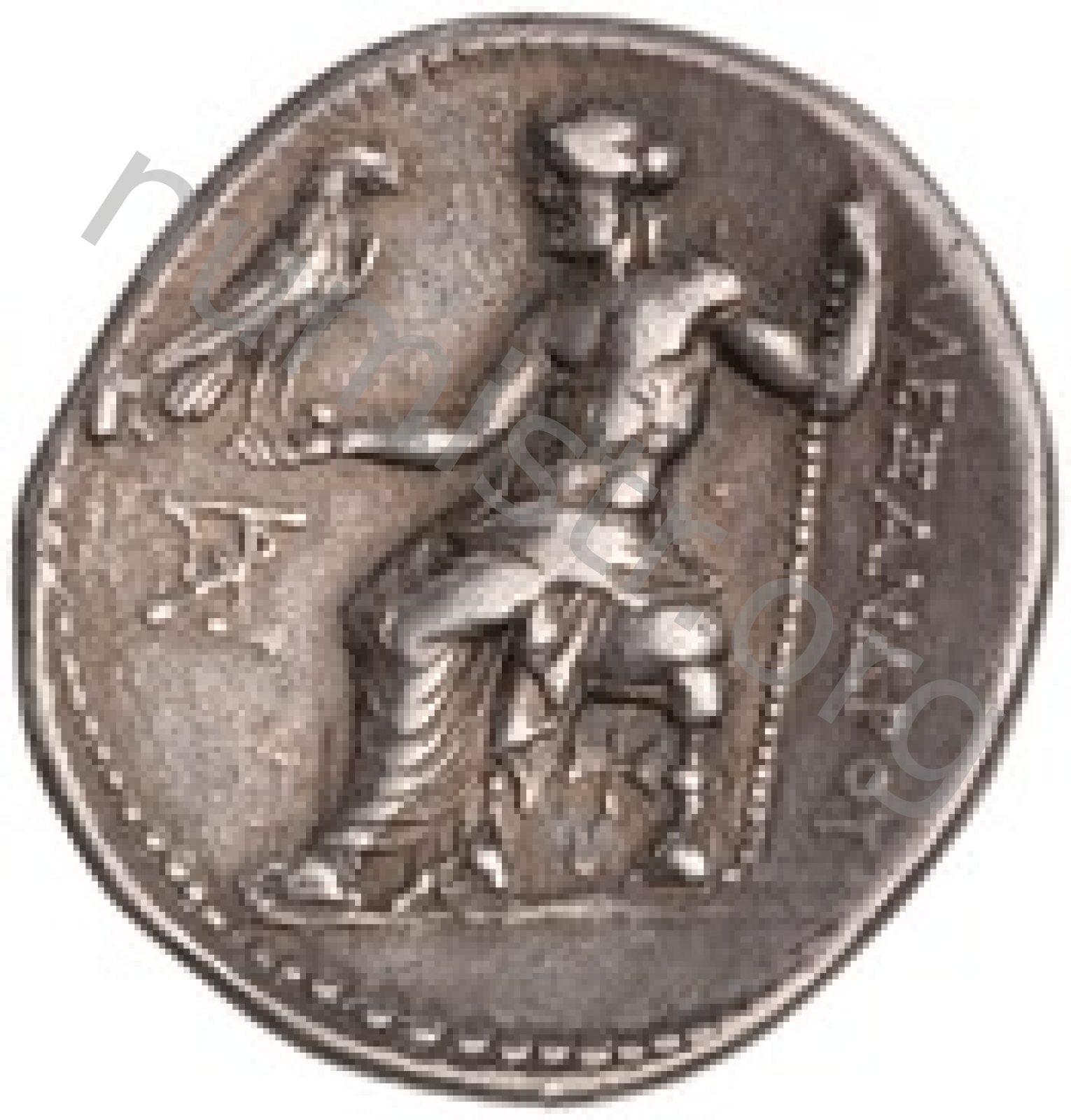 Zeus tabure-tahtta oturuyor sol elinde kartal sağ elinde asa var.