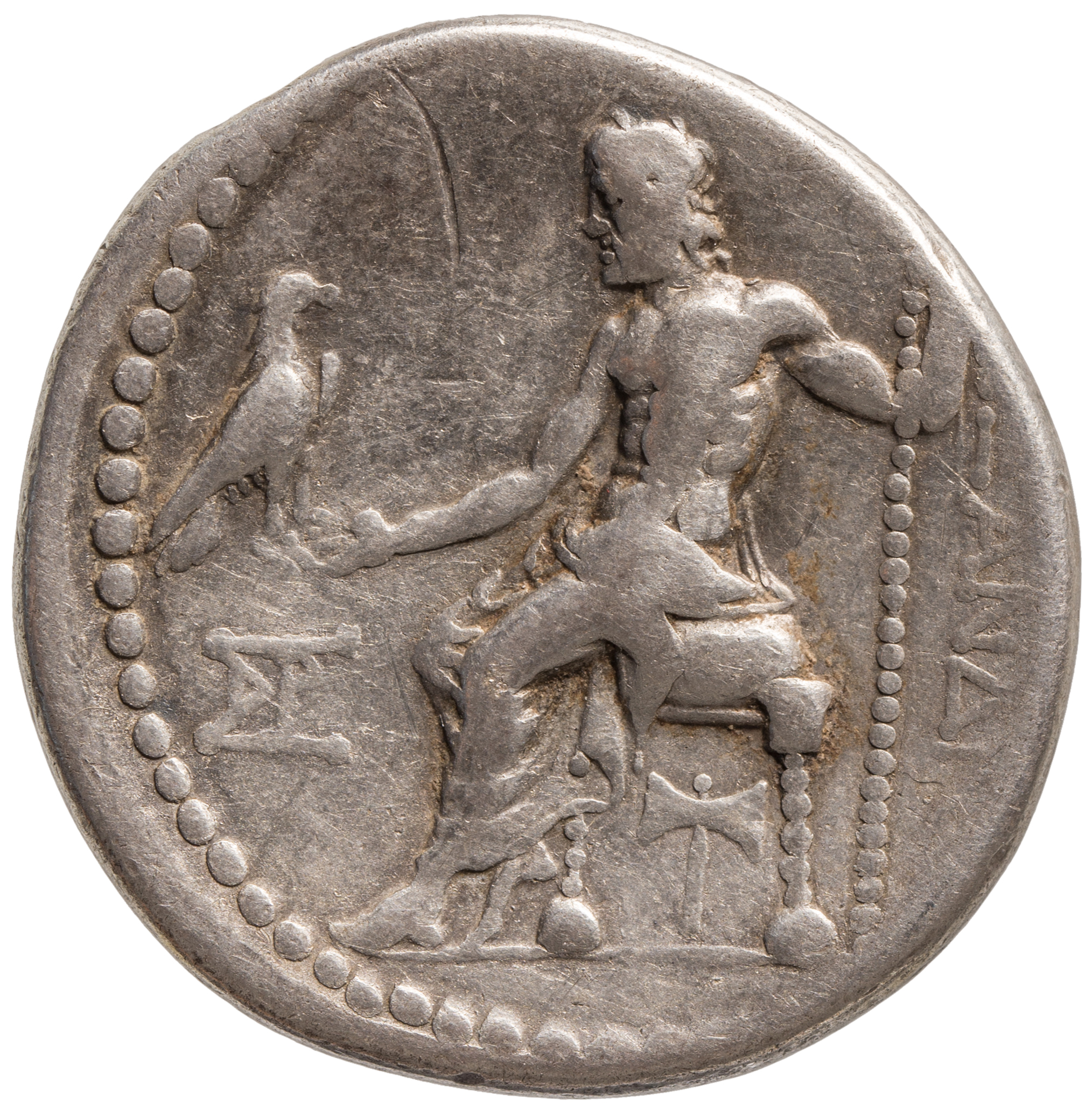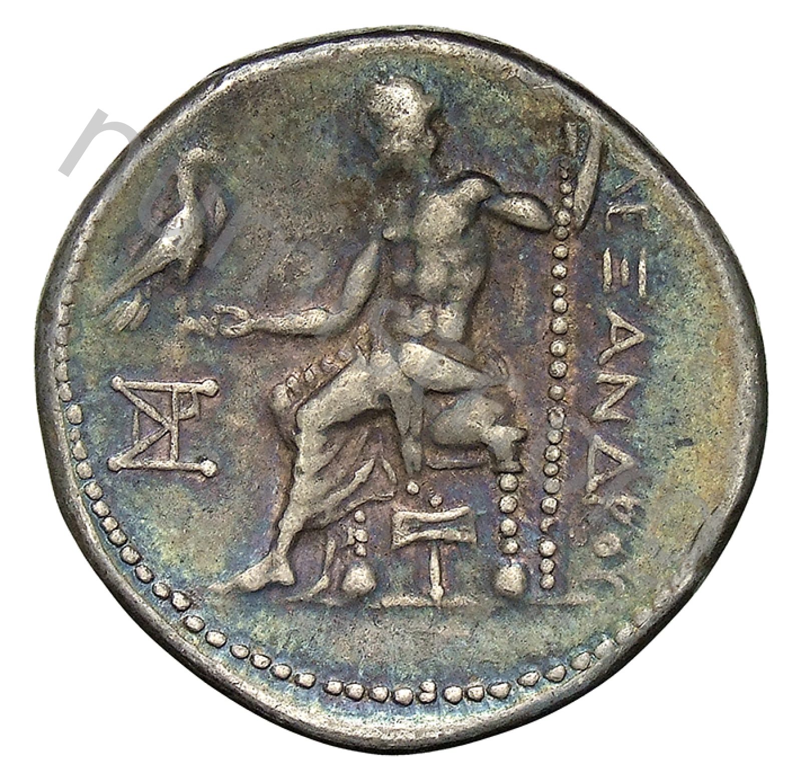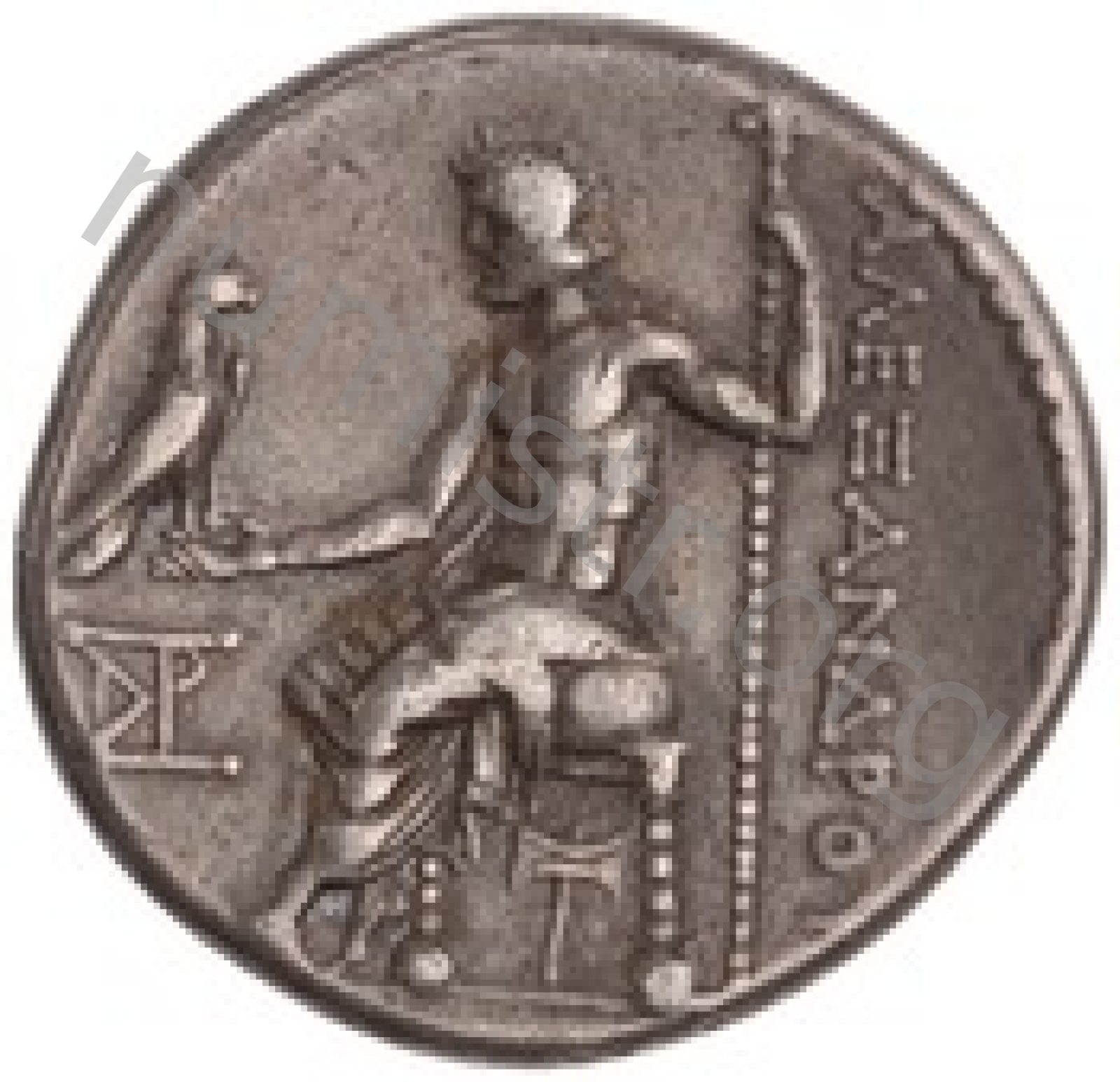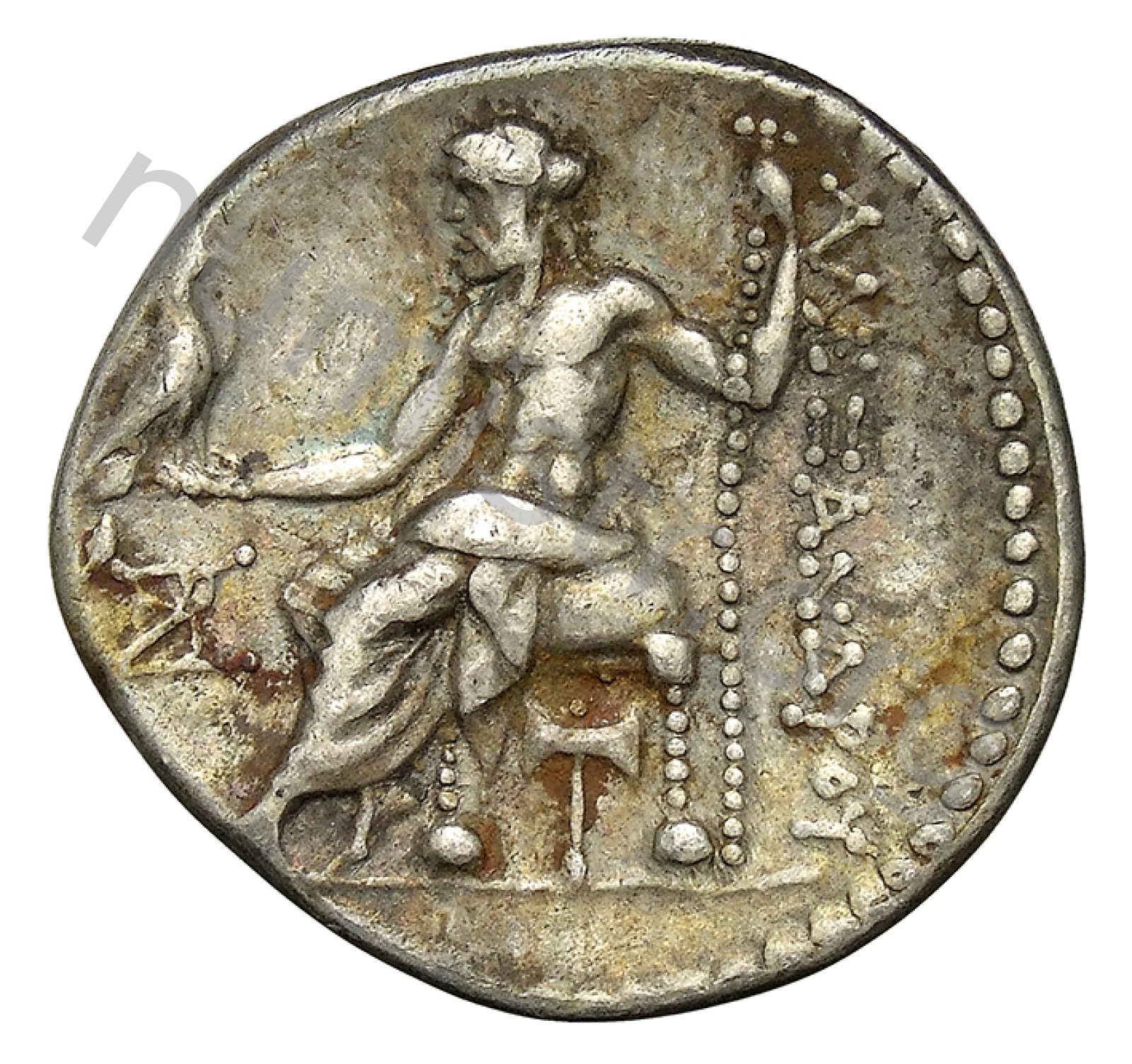 Zeus seated on stool-throne left eagle on outstretched right hand sceptre in left hand -[en]