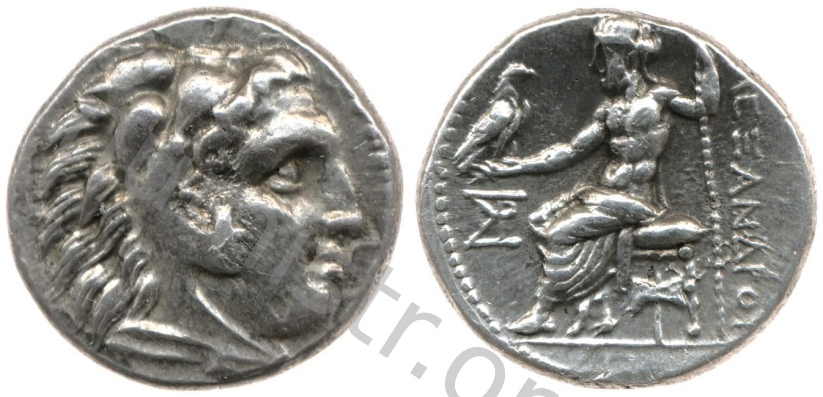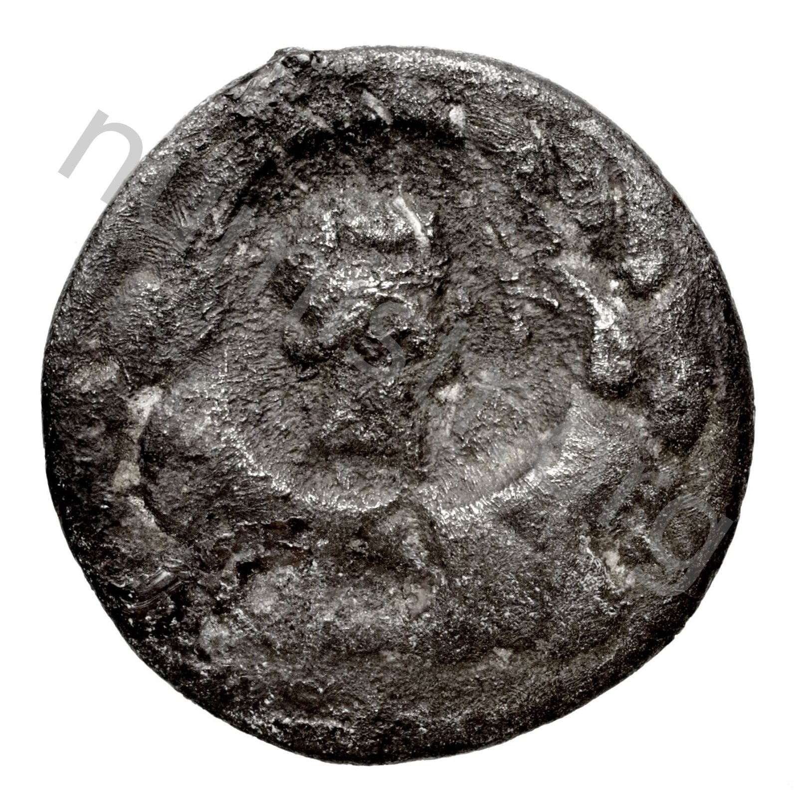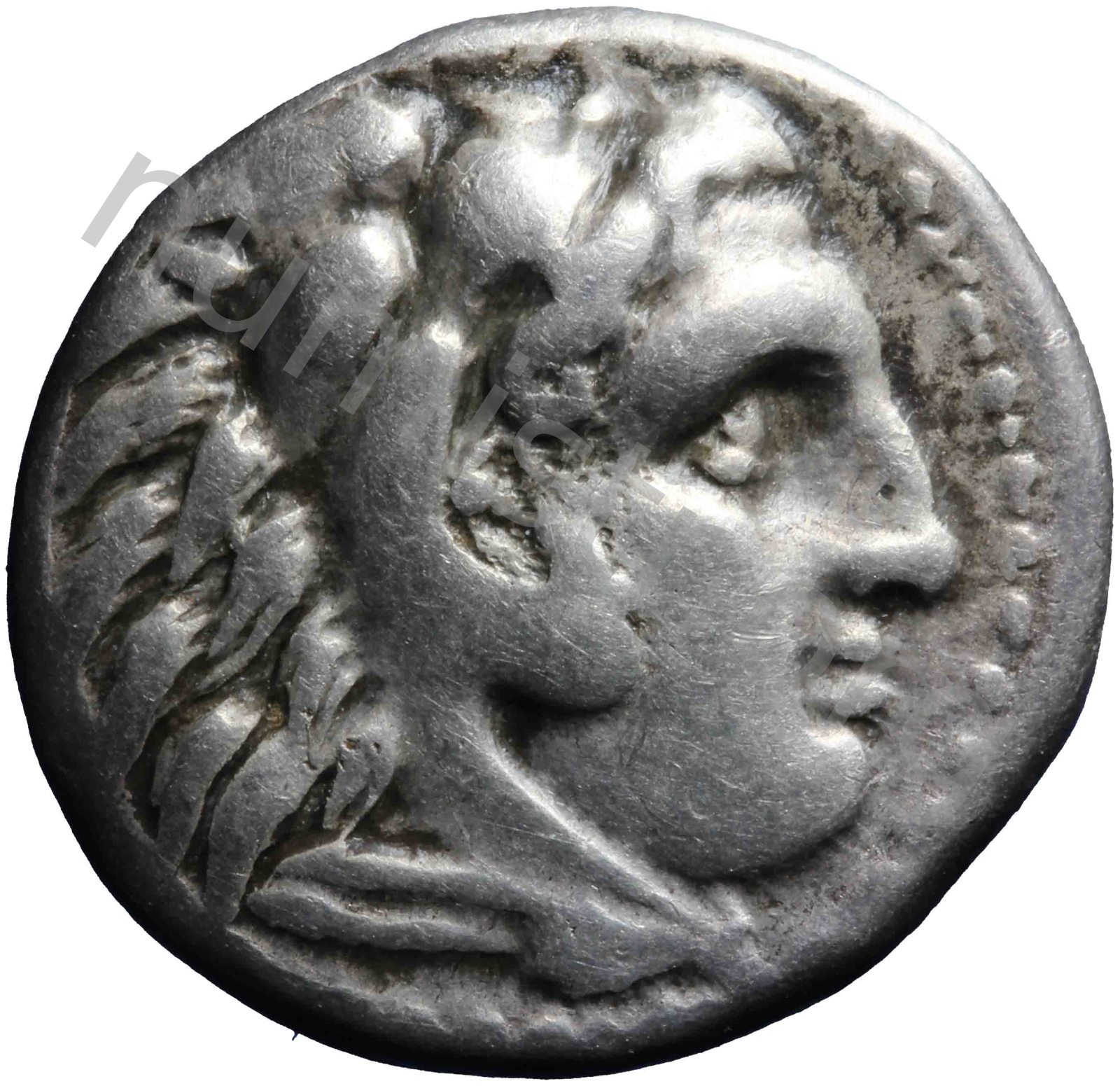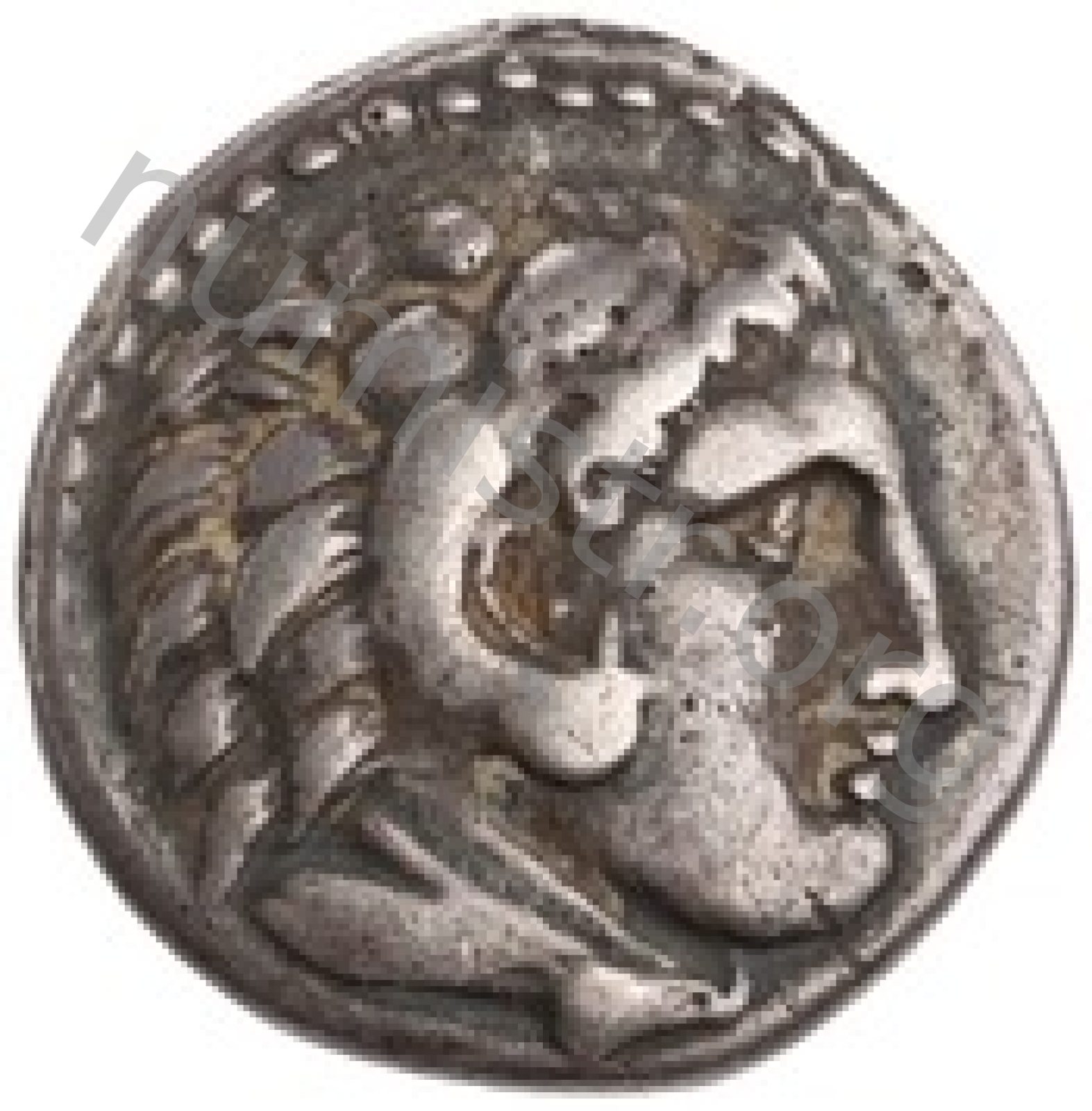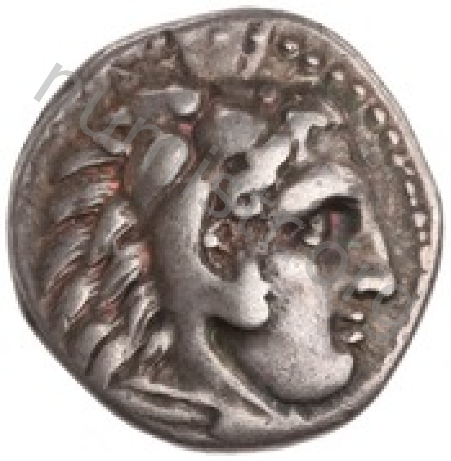 Head of beardless Heracles right wearing lion skin headdress -[en]