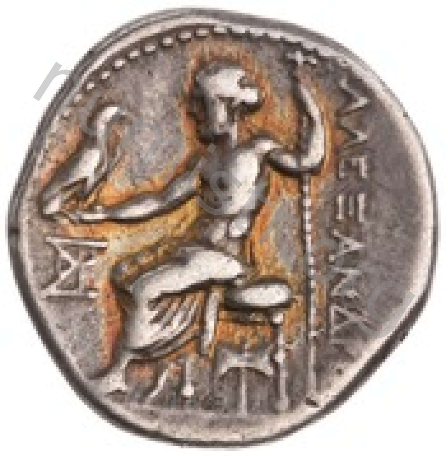 Zeus tabure-tahtta oturuyor sol elinde kartal sağ elinde asa var.
