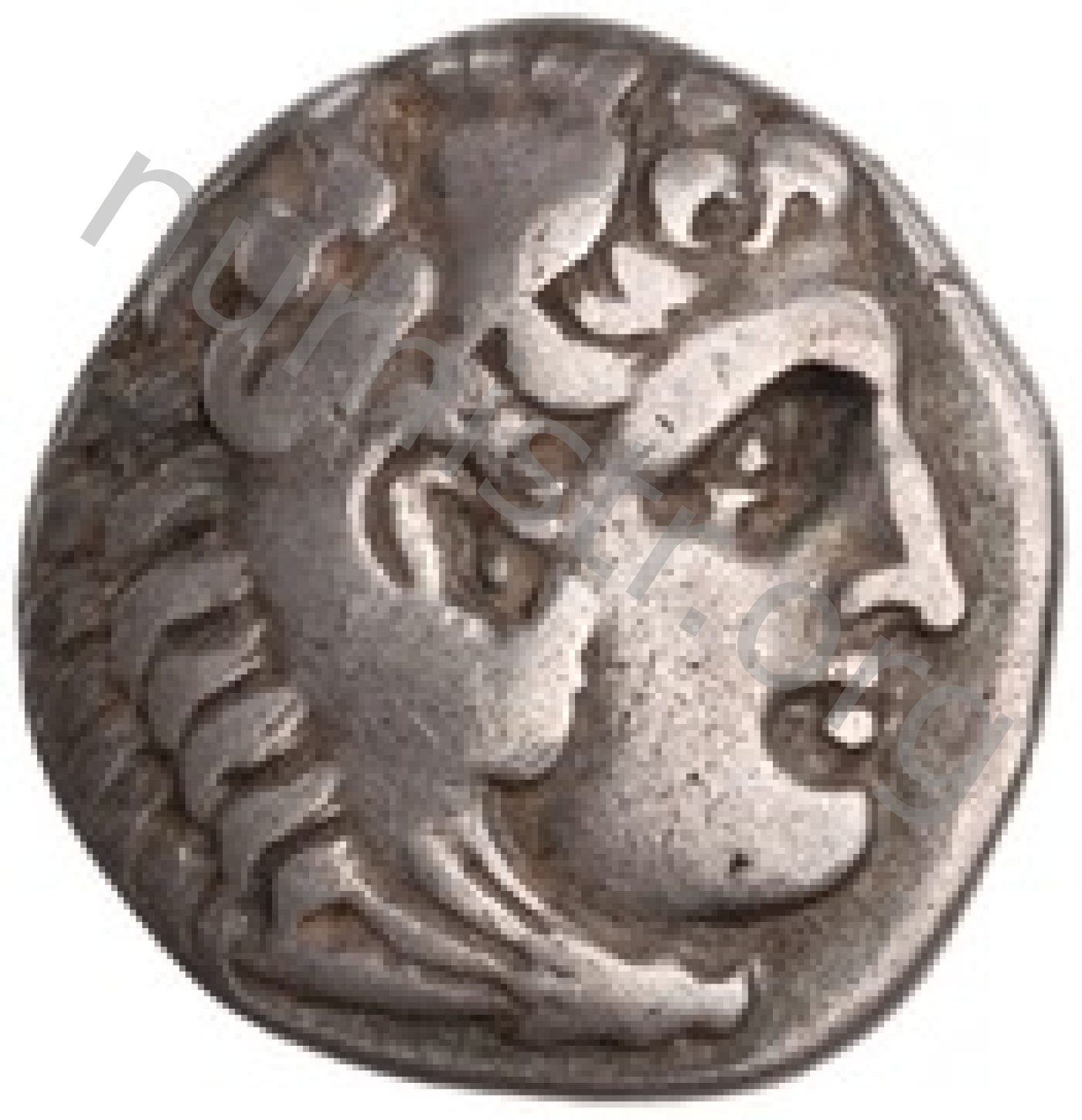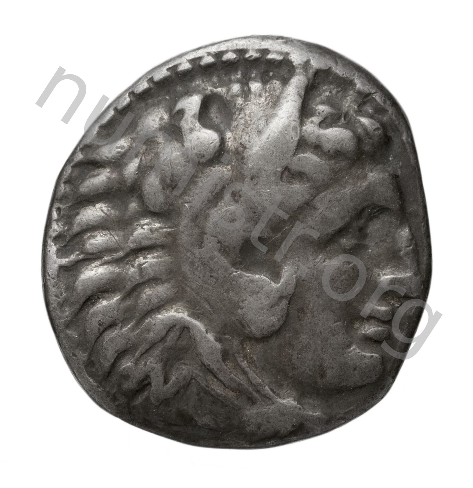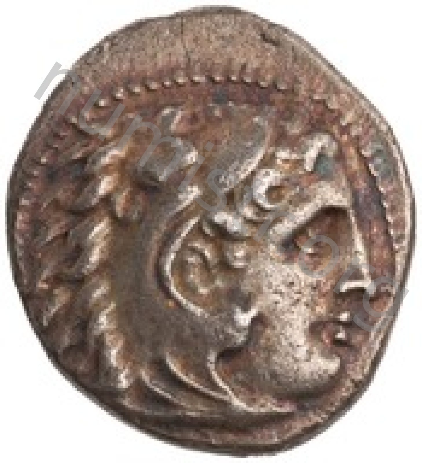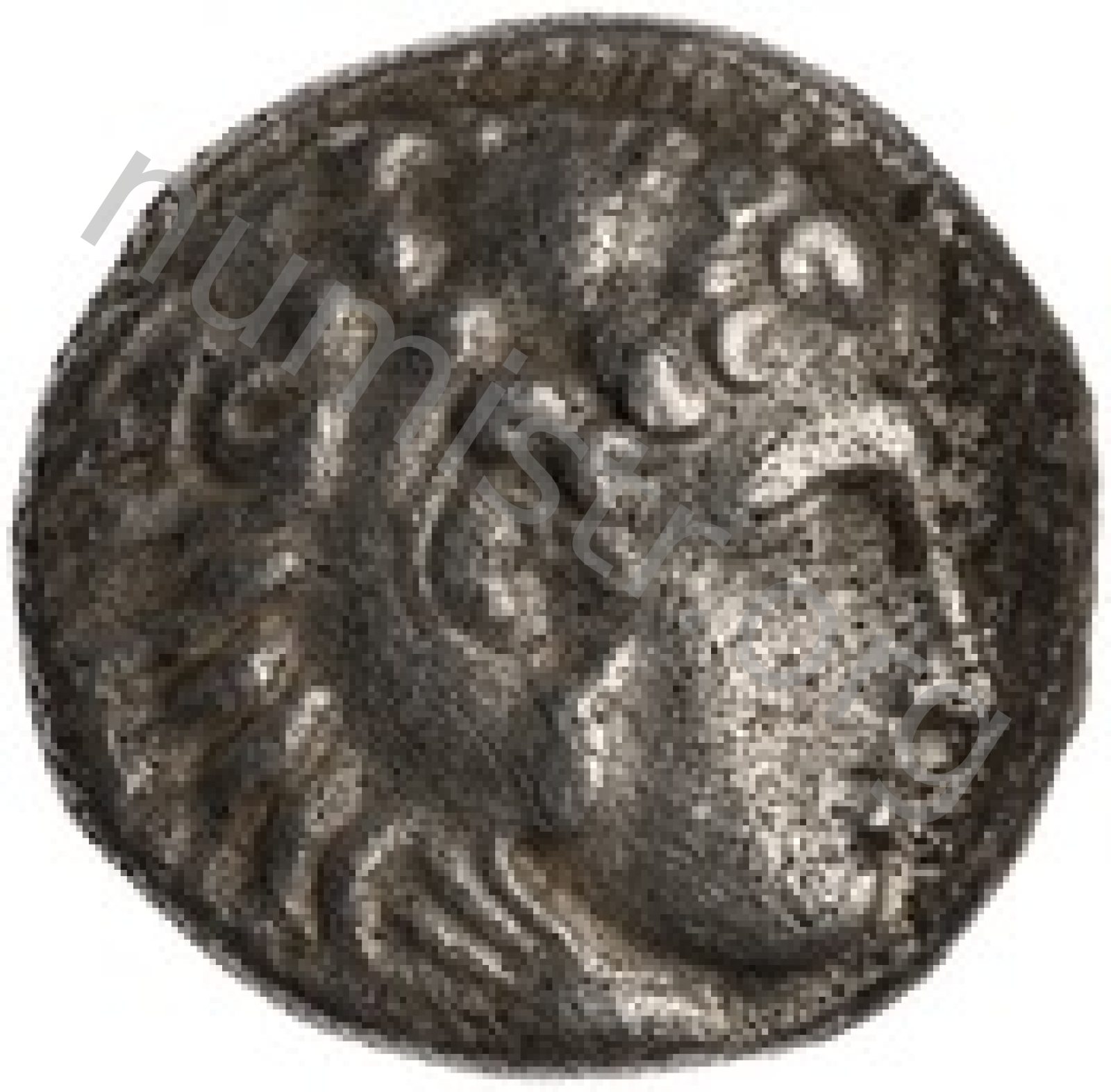 Head of beardless Heracles right wearing lion skin headdress -[en]