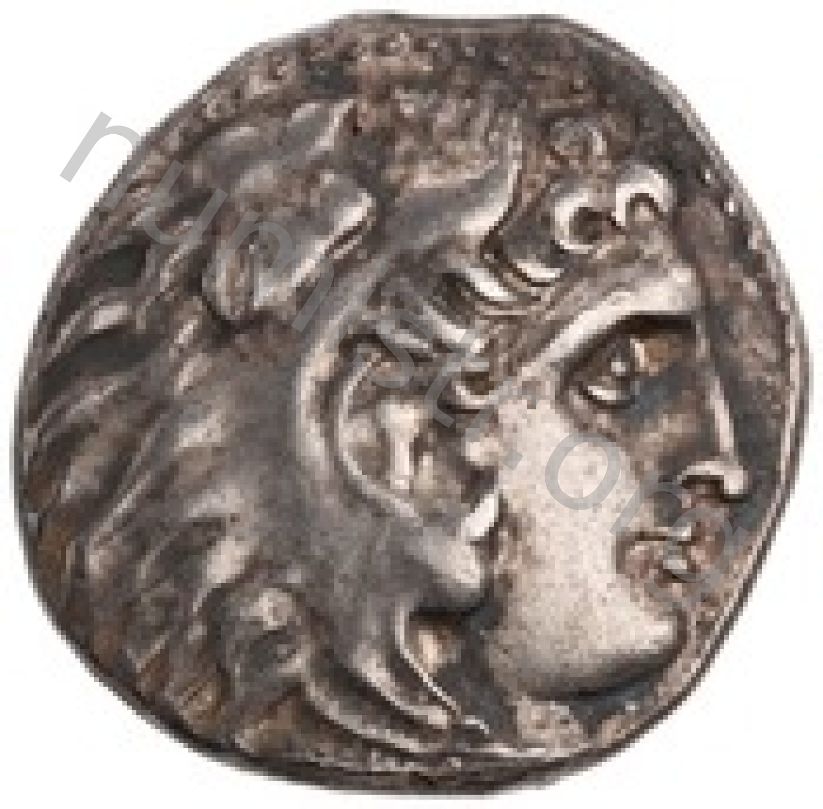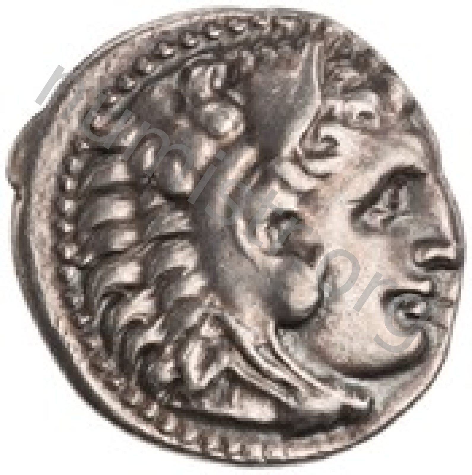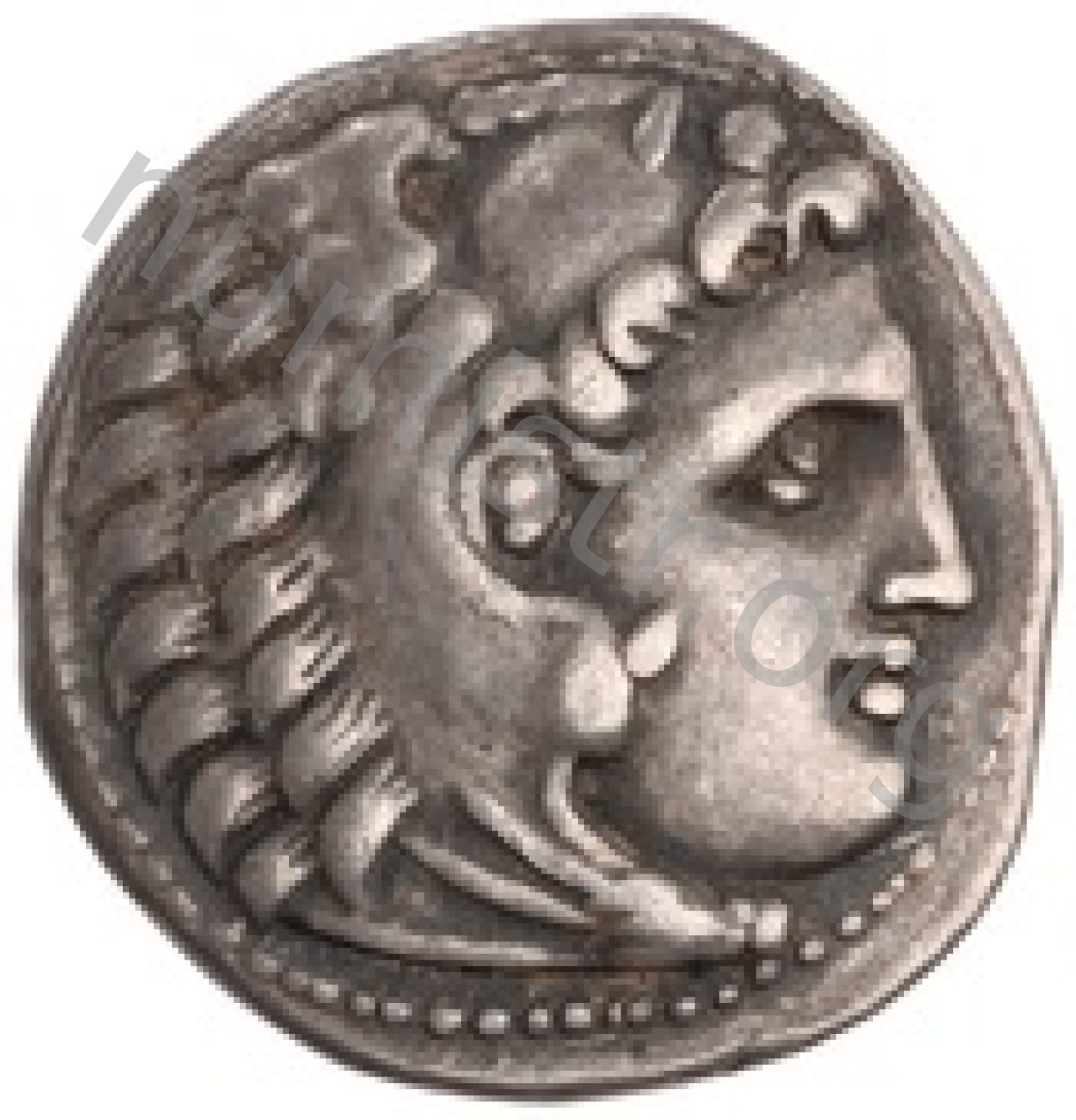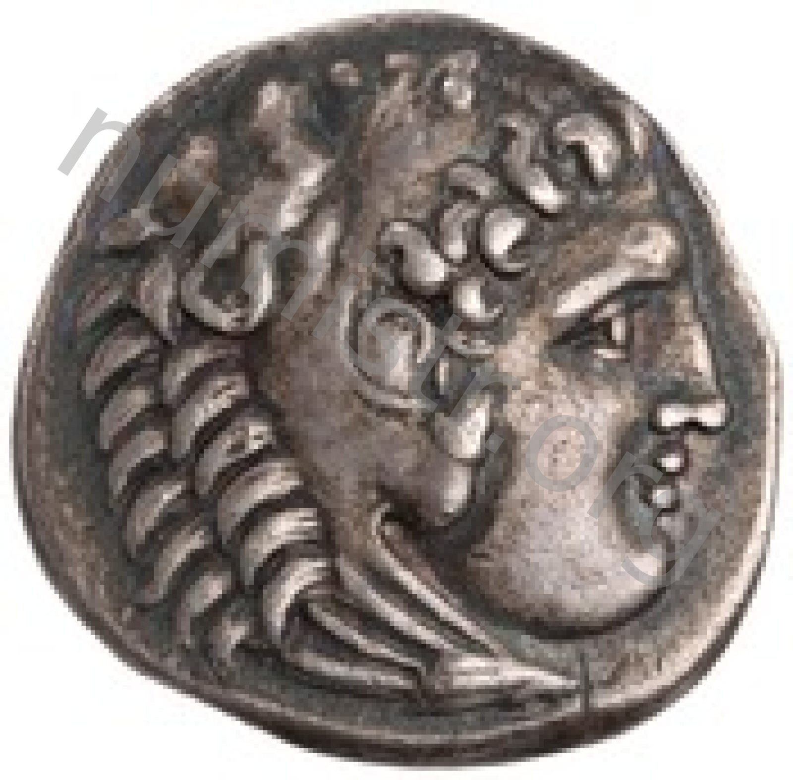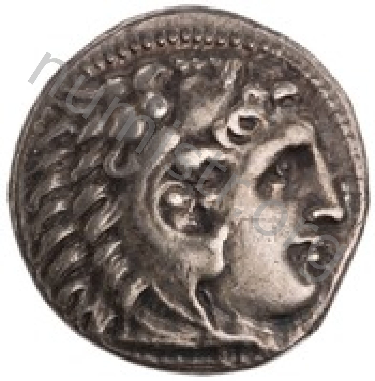 Head of beardless Heracles right wearing lion skin headdress -[en]