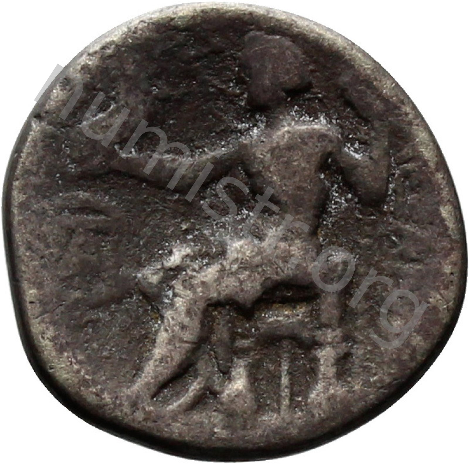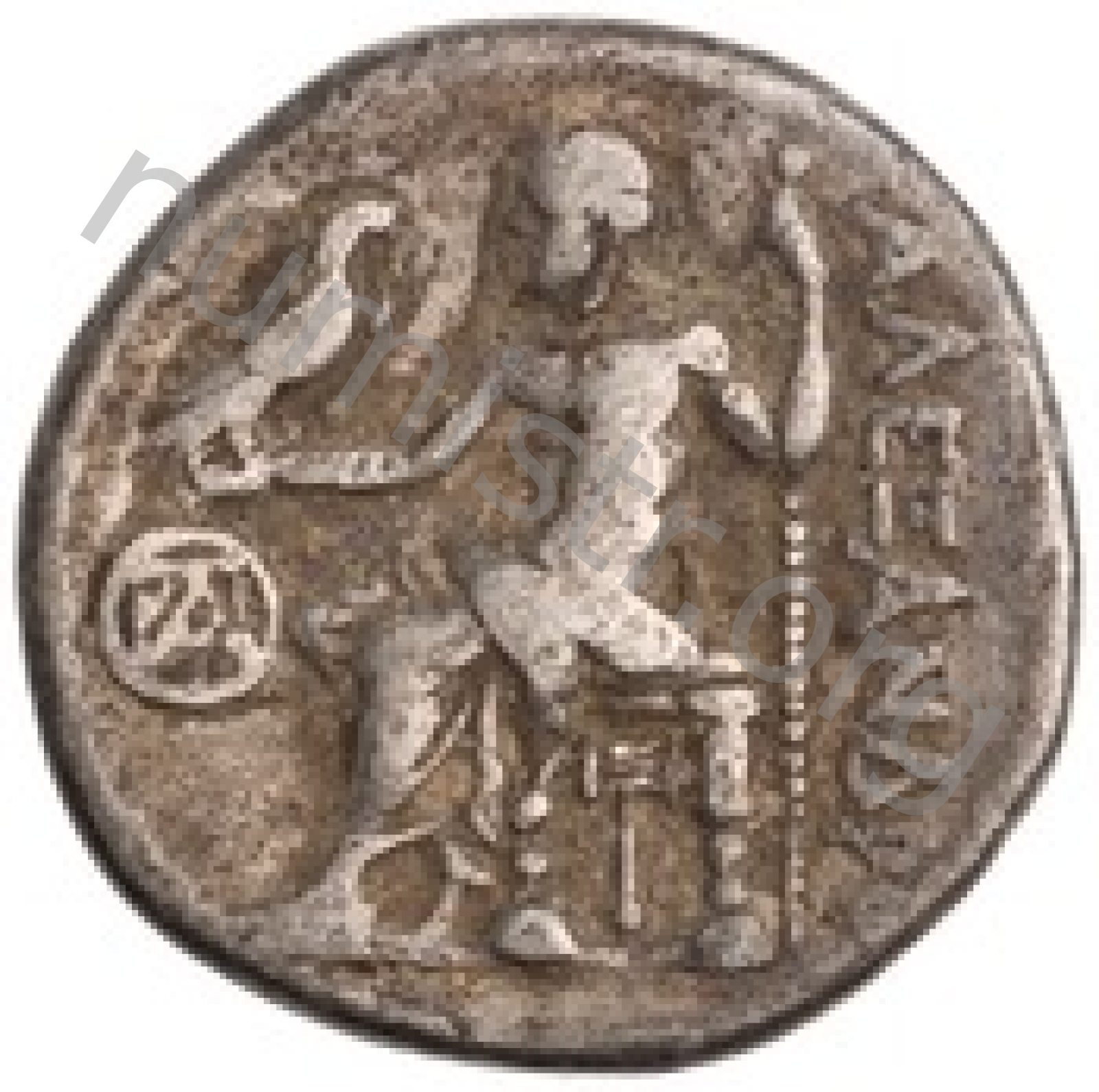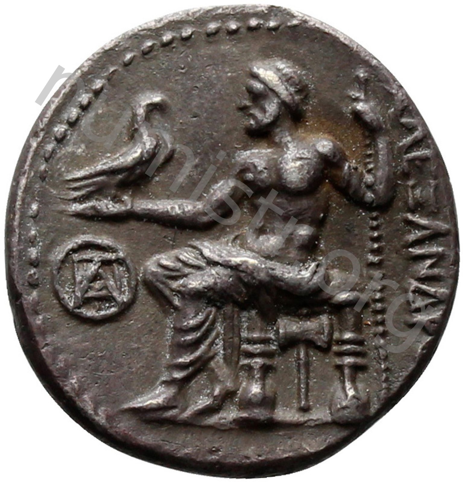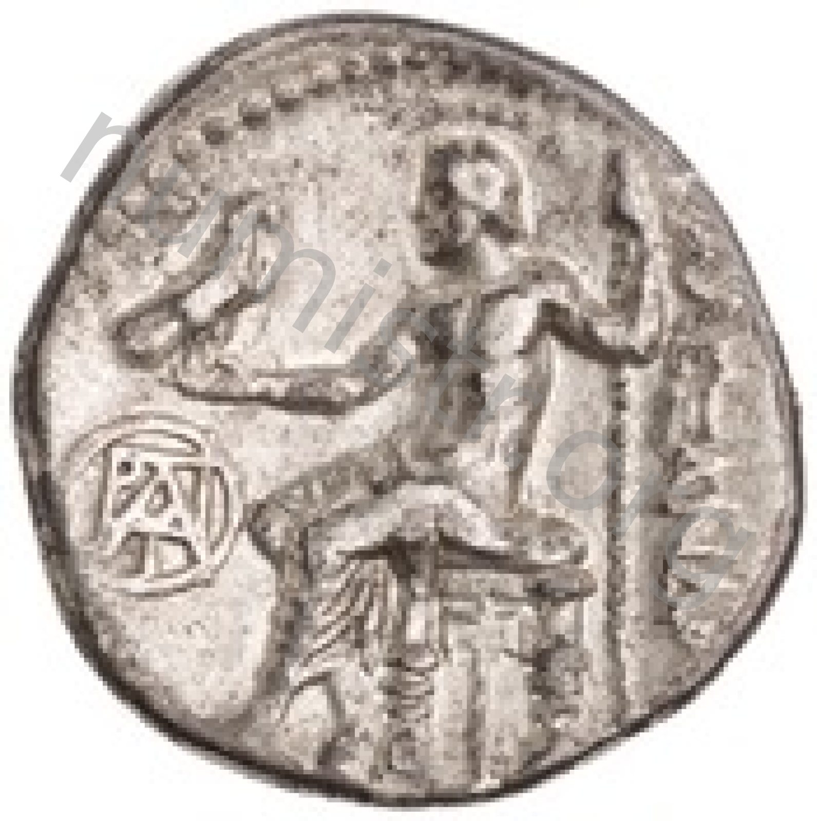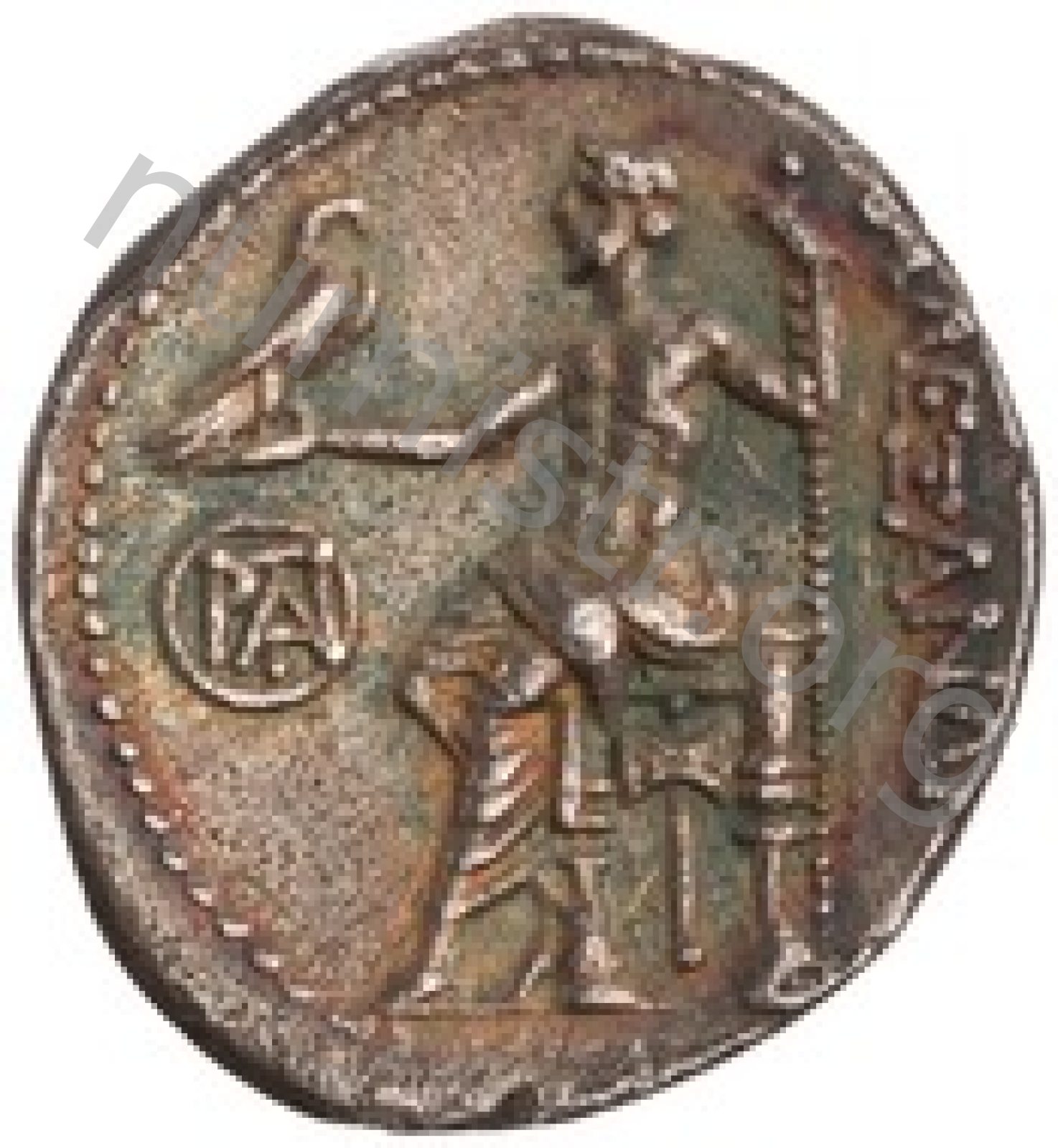 Zeus seated on stool-throne left eagle on outstretched right hand sceptre in left hand -[en]