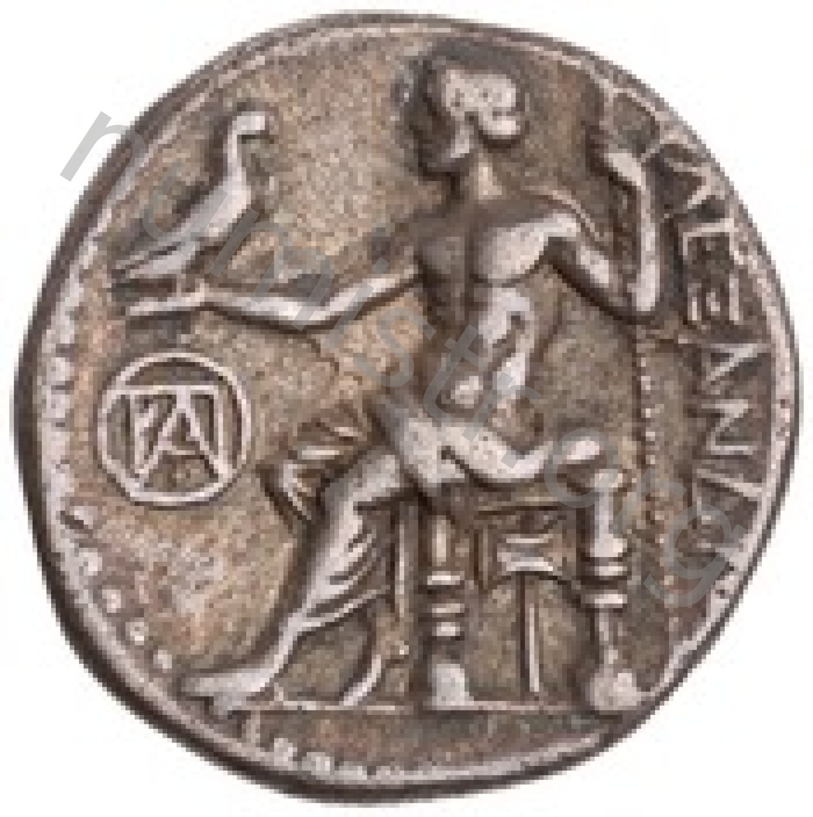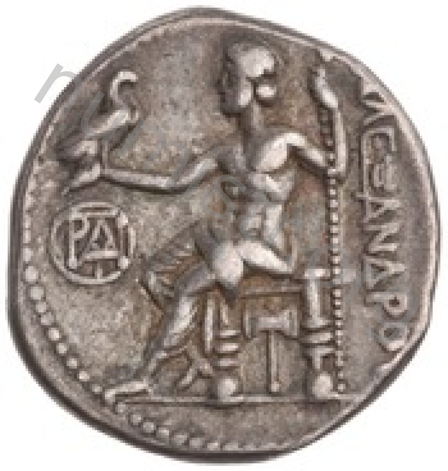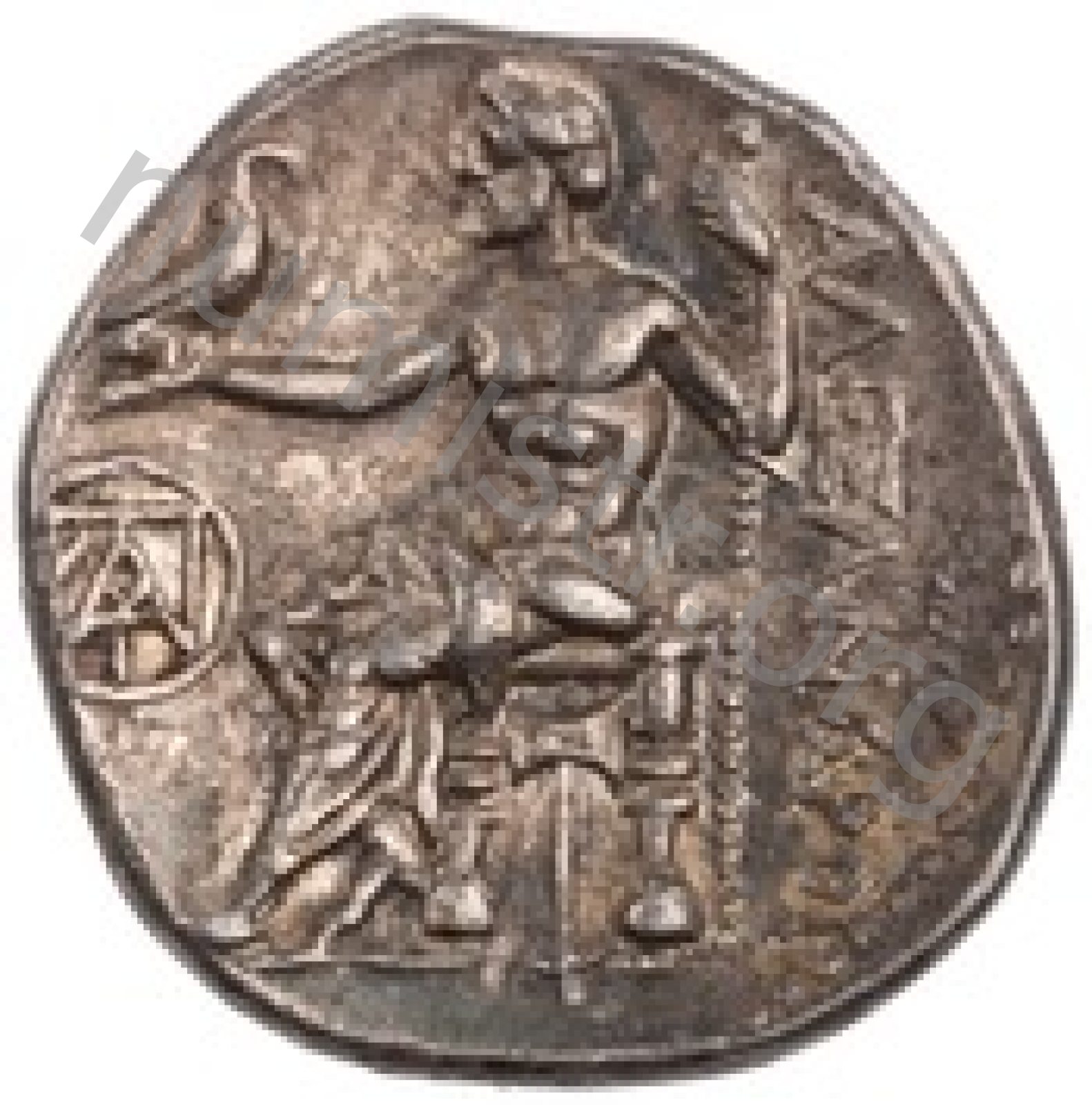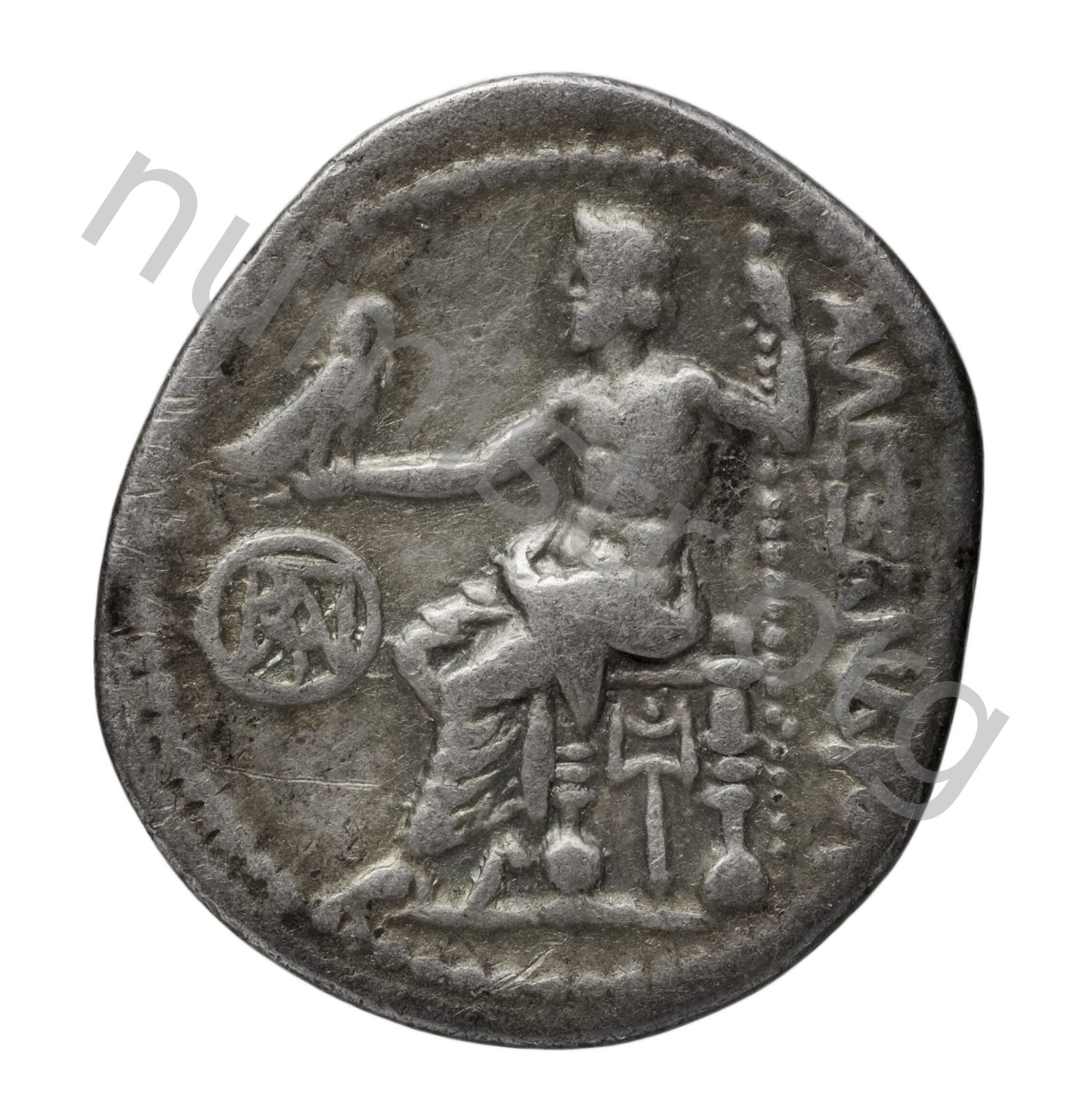 Zeus seated on stool-throne left eagle on outstretched right hand sceptre in left hand -[en]