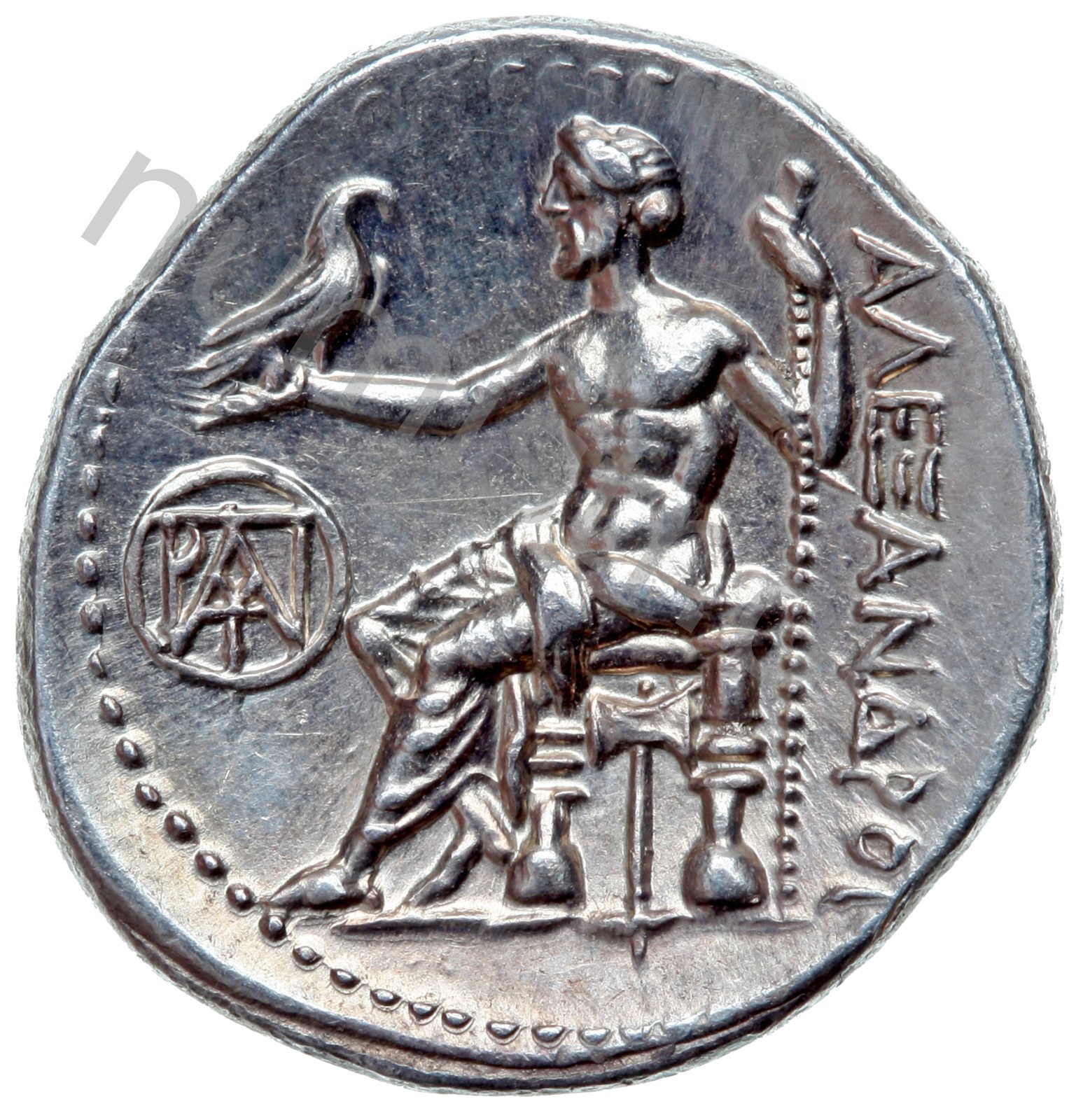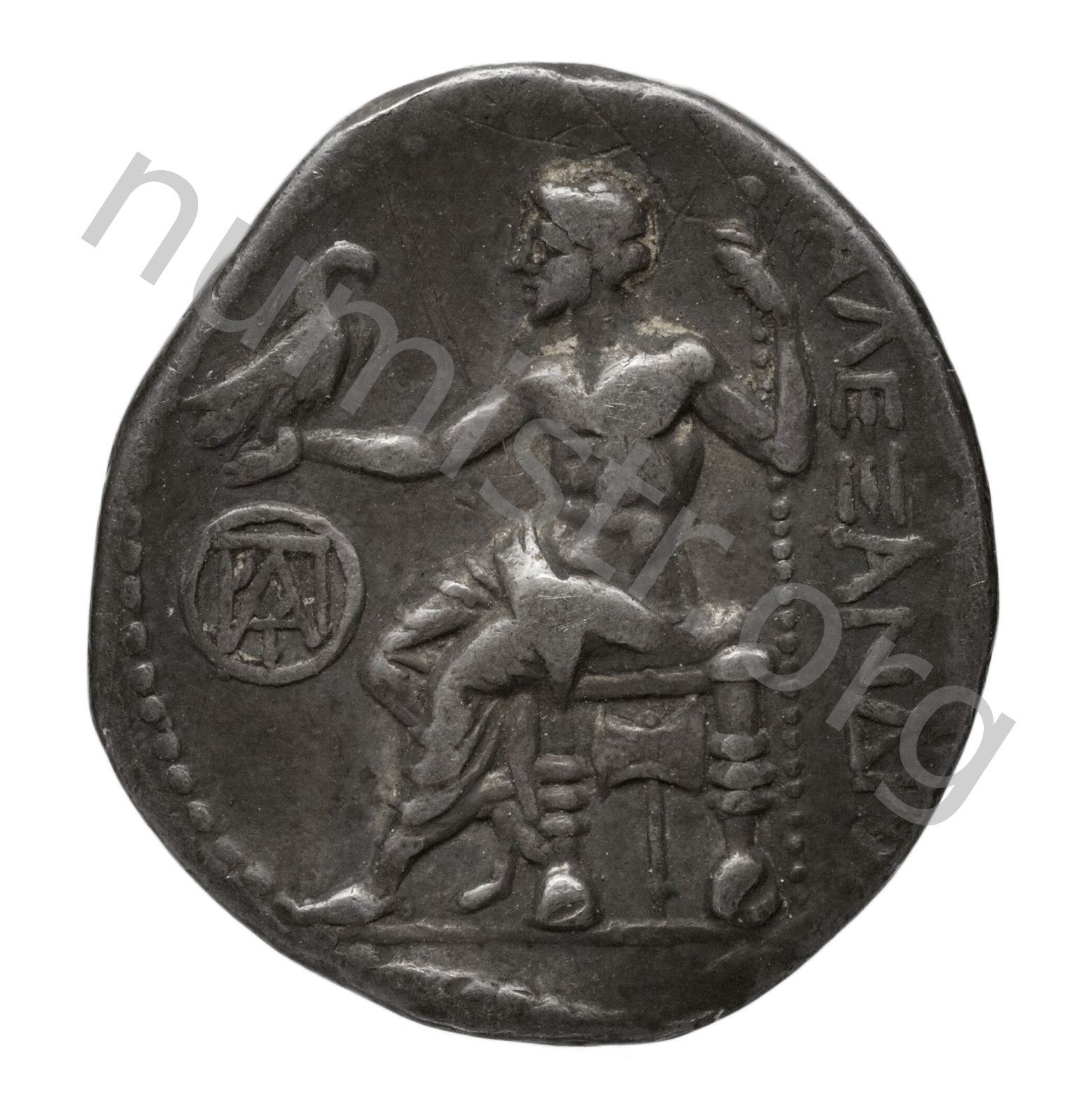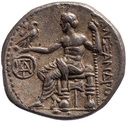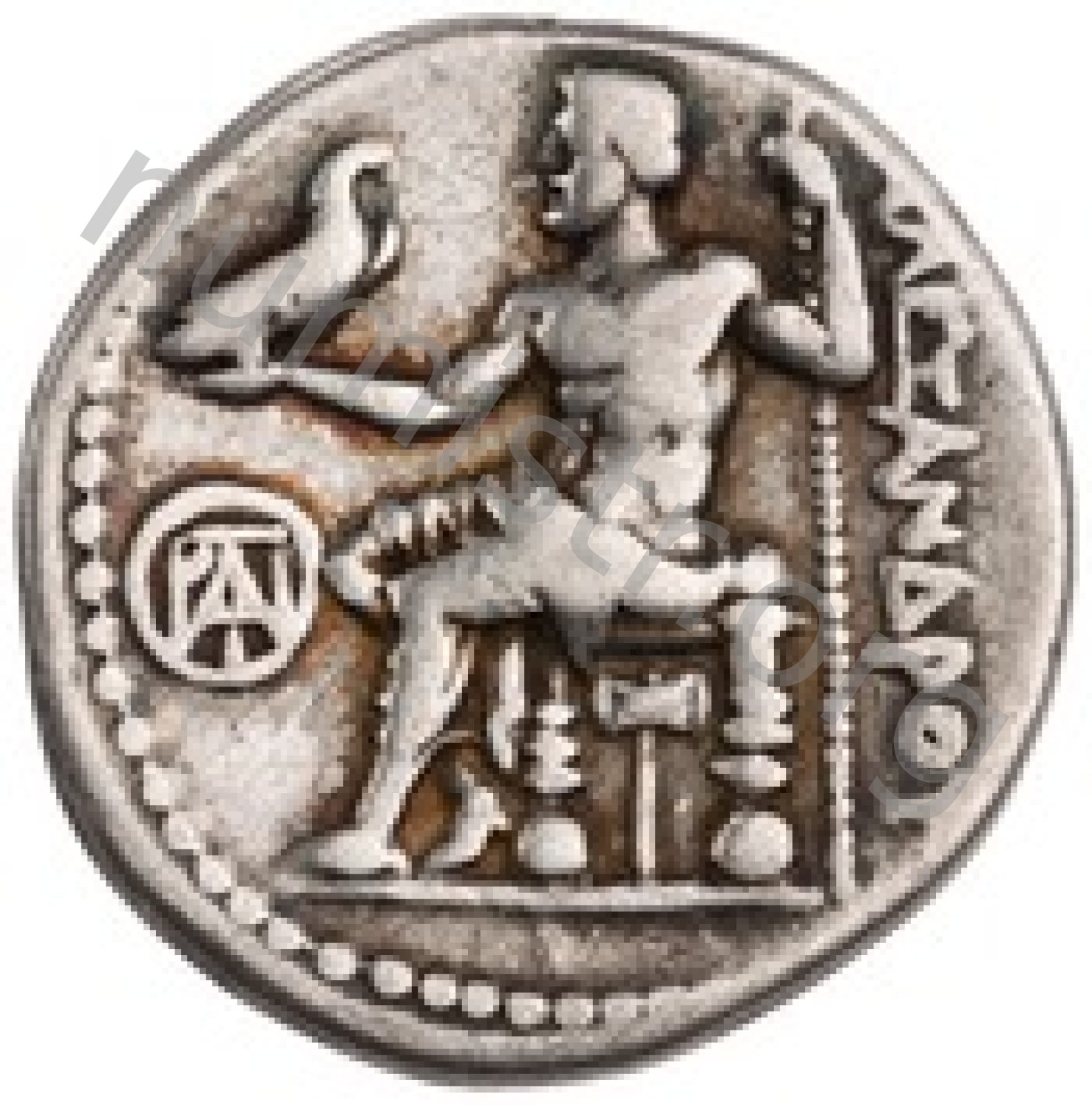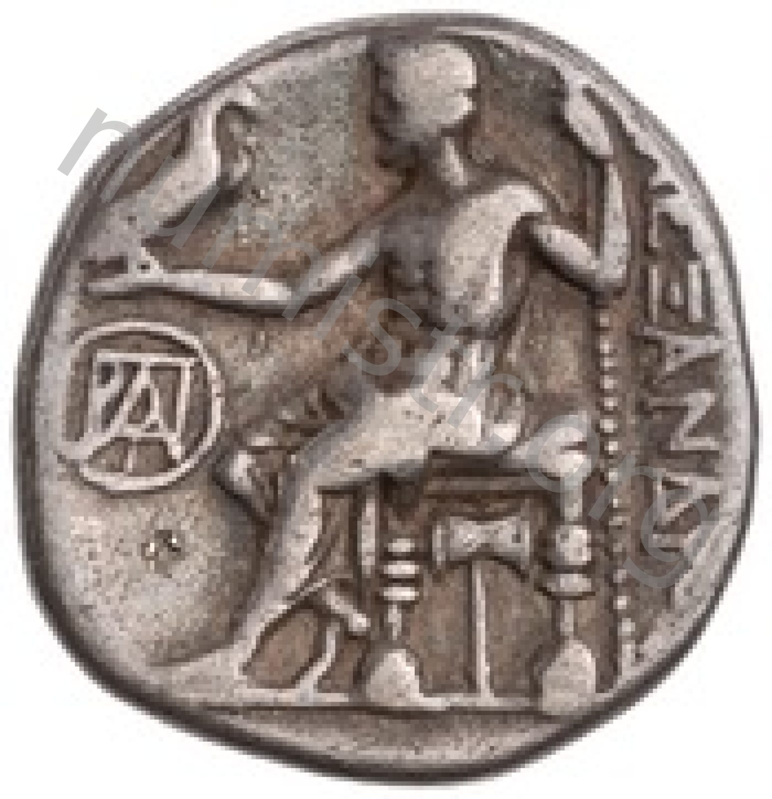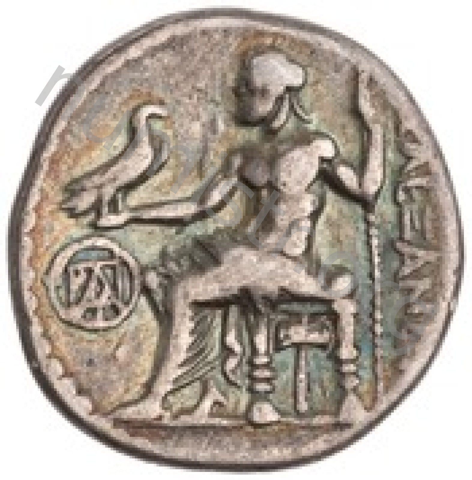 Zeus seated on stool-throne left eagle on outstretched right hand sceptre in left hand -[en]
