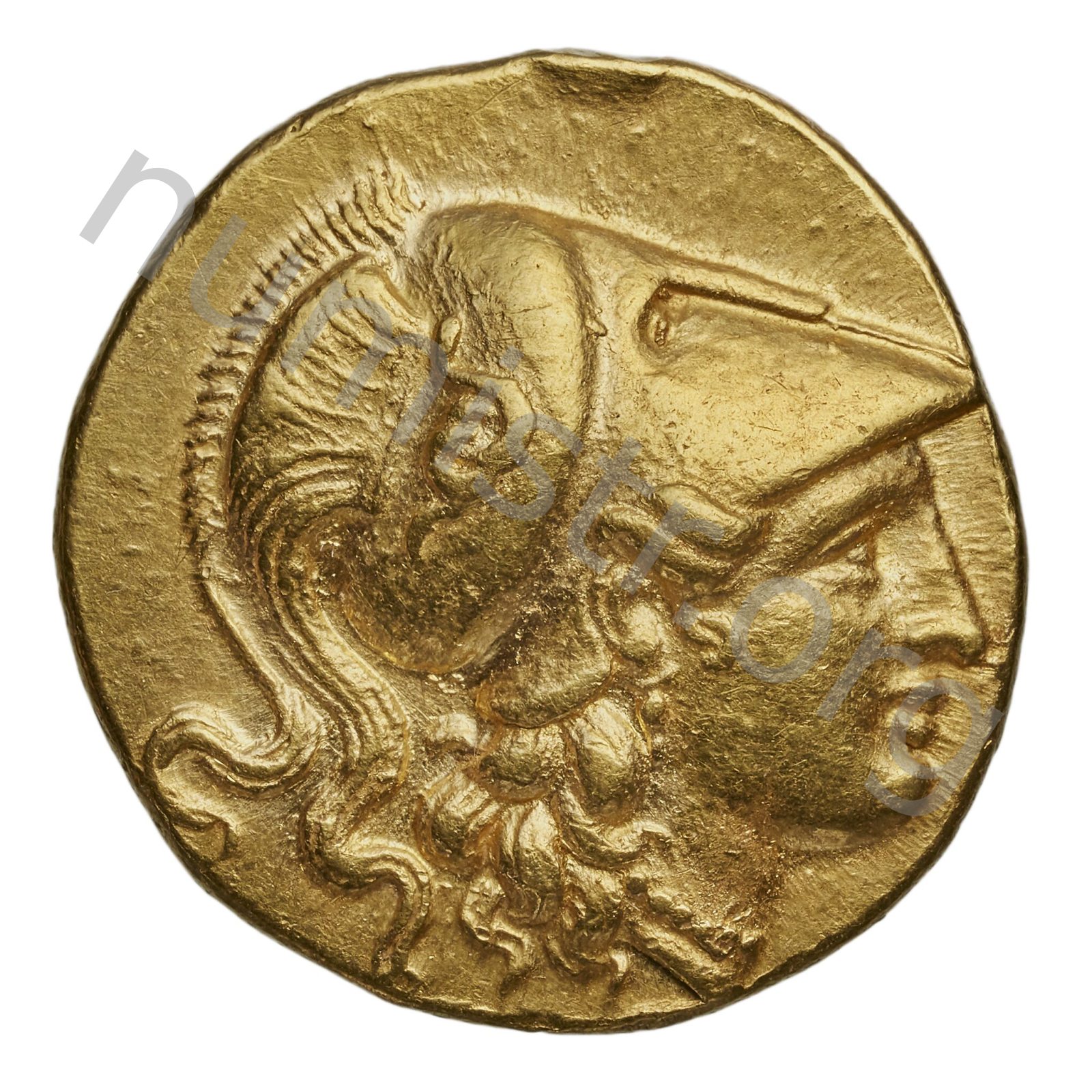 Head of Athena right wearing Corinthian helmet with crest -[en]