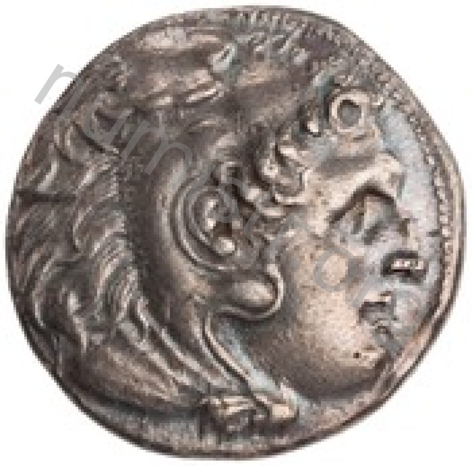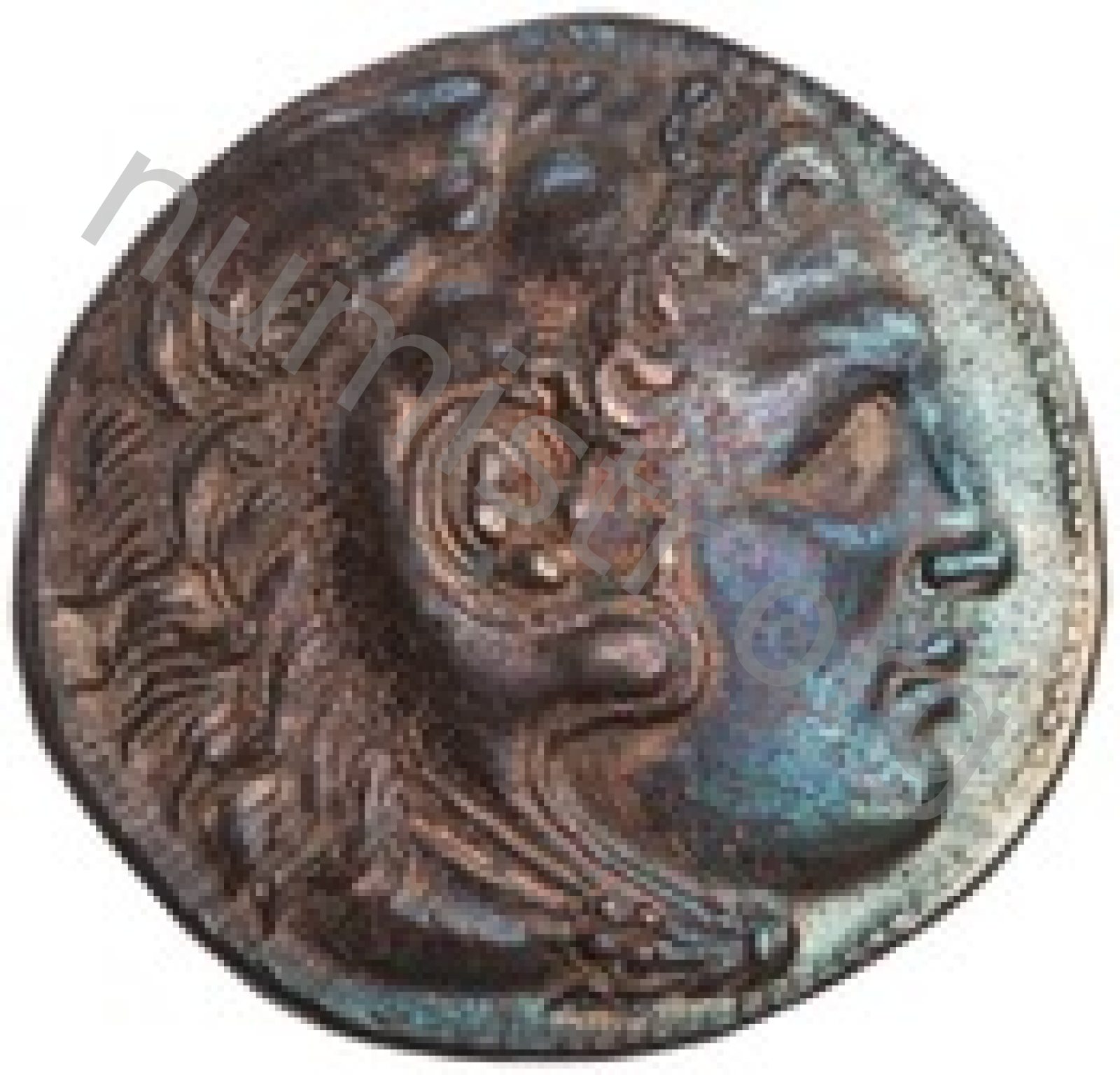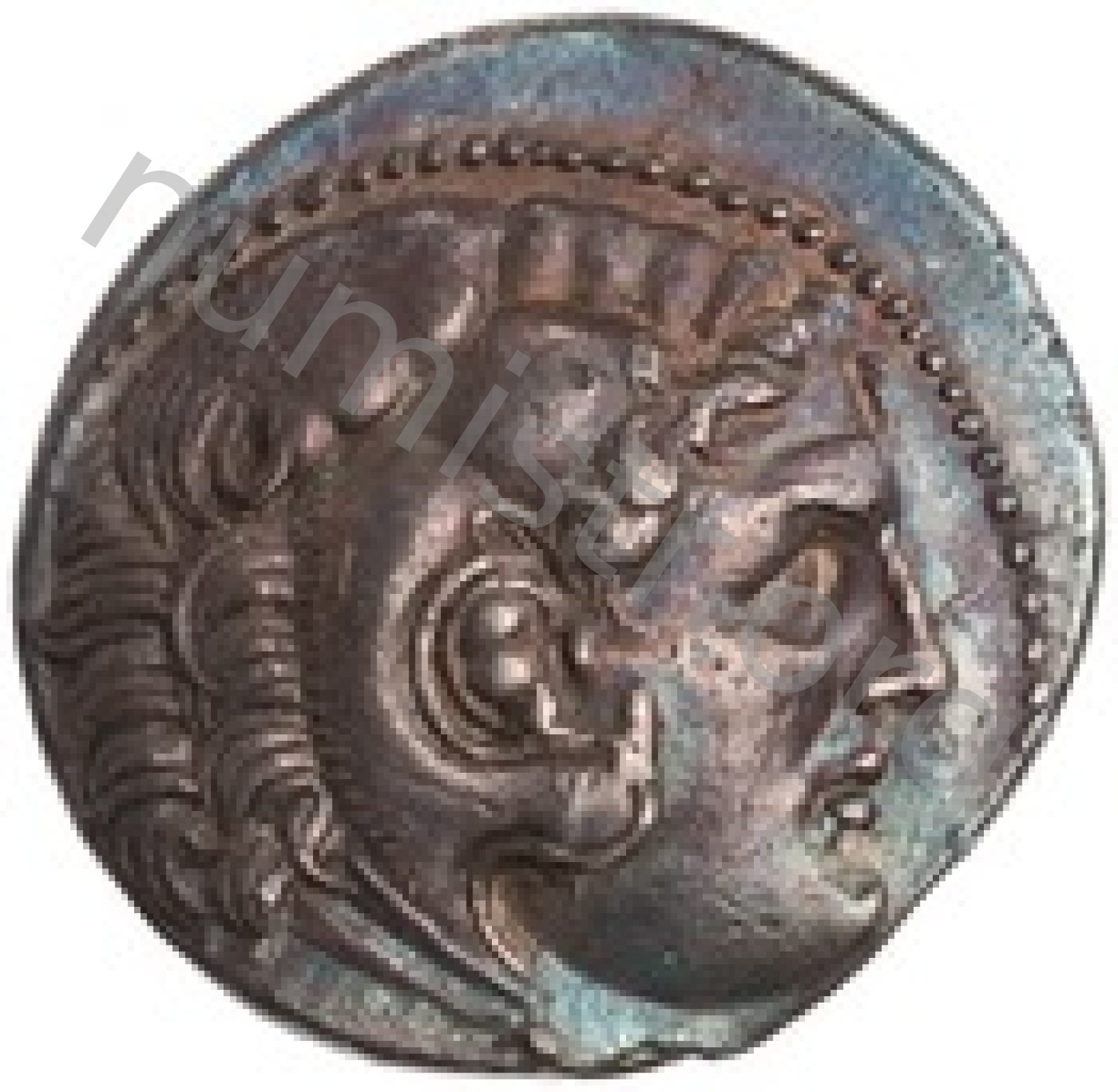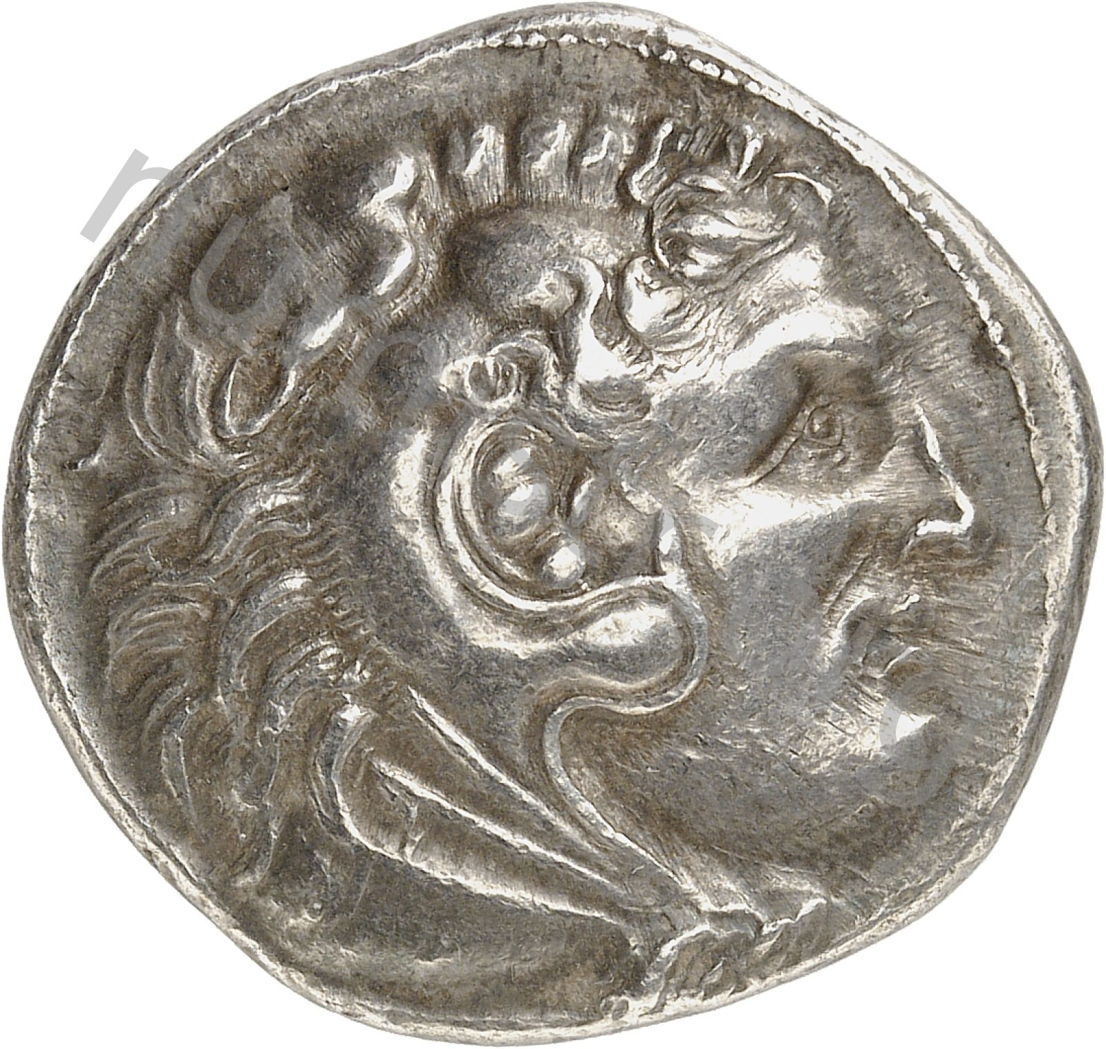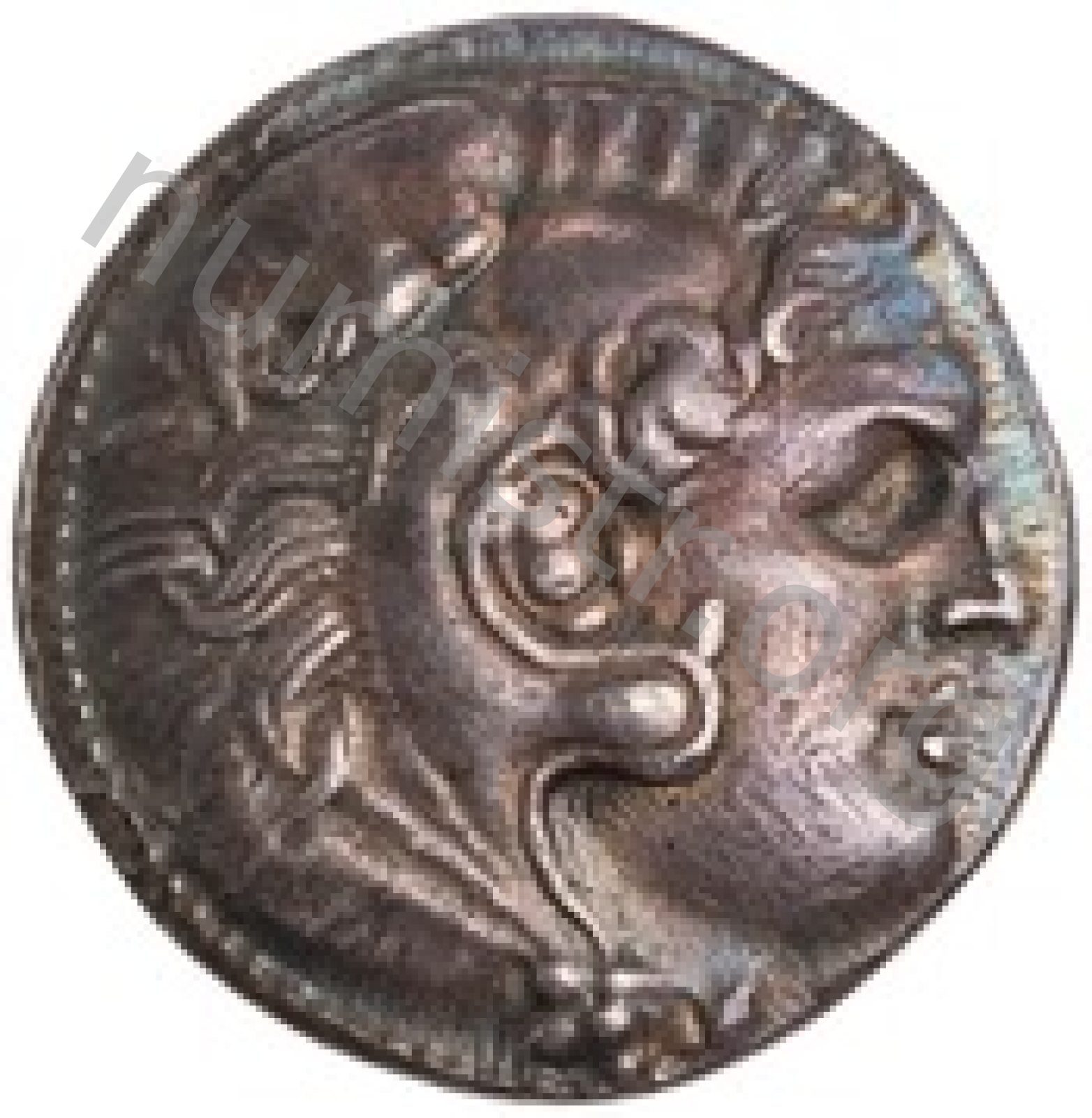 Head of beardless Heracles right wearing lion skin headdress -[en]