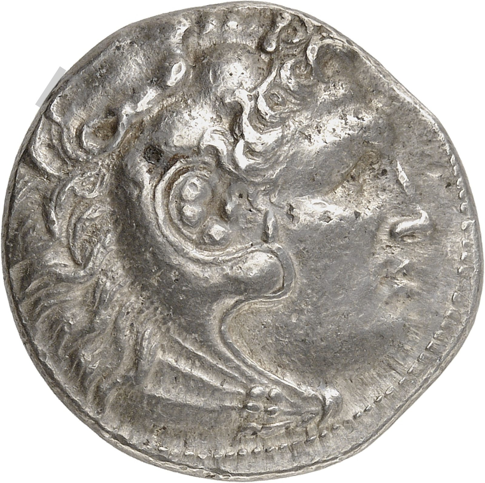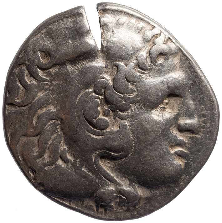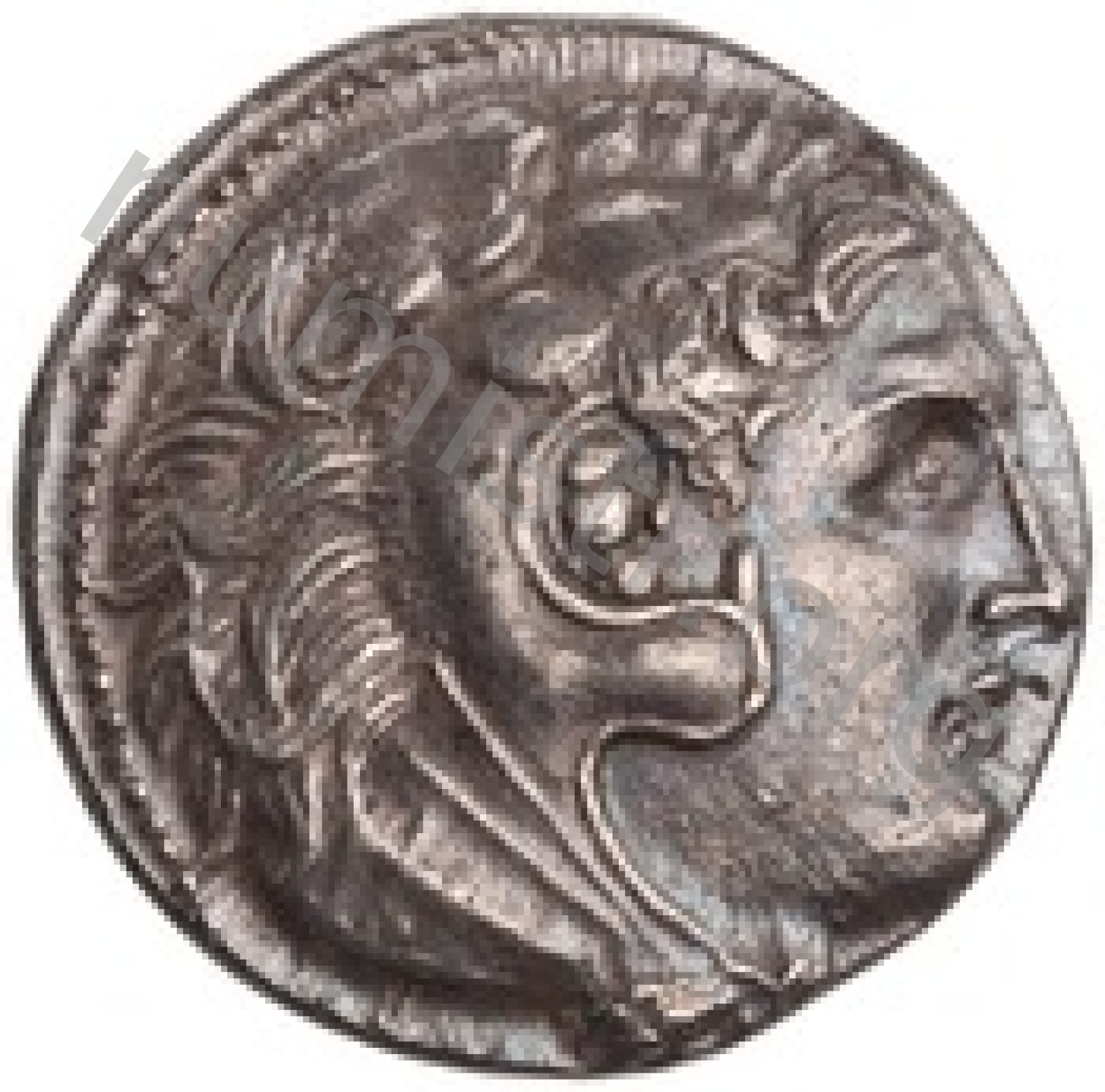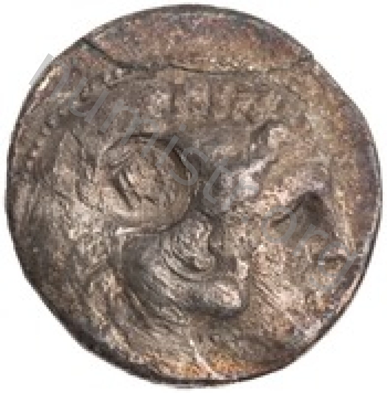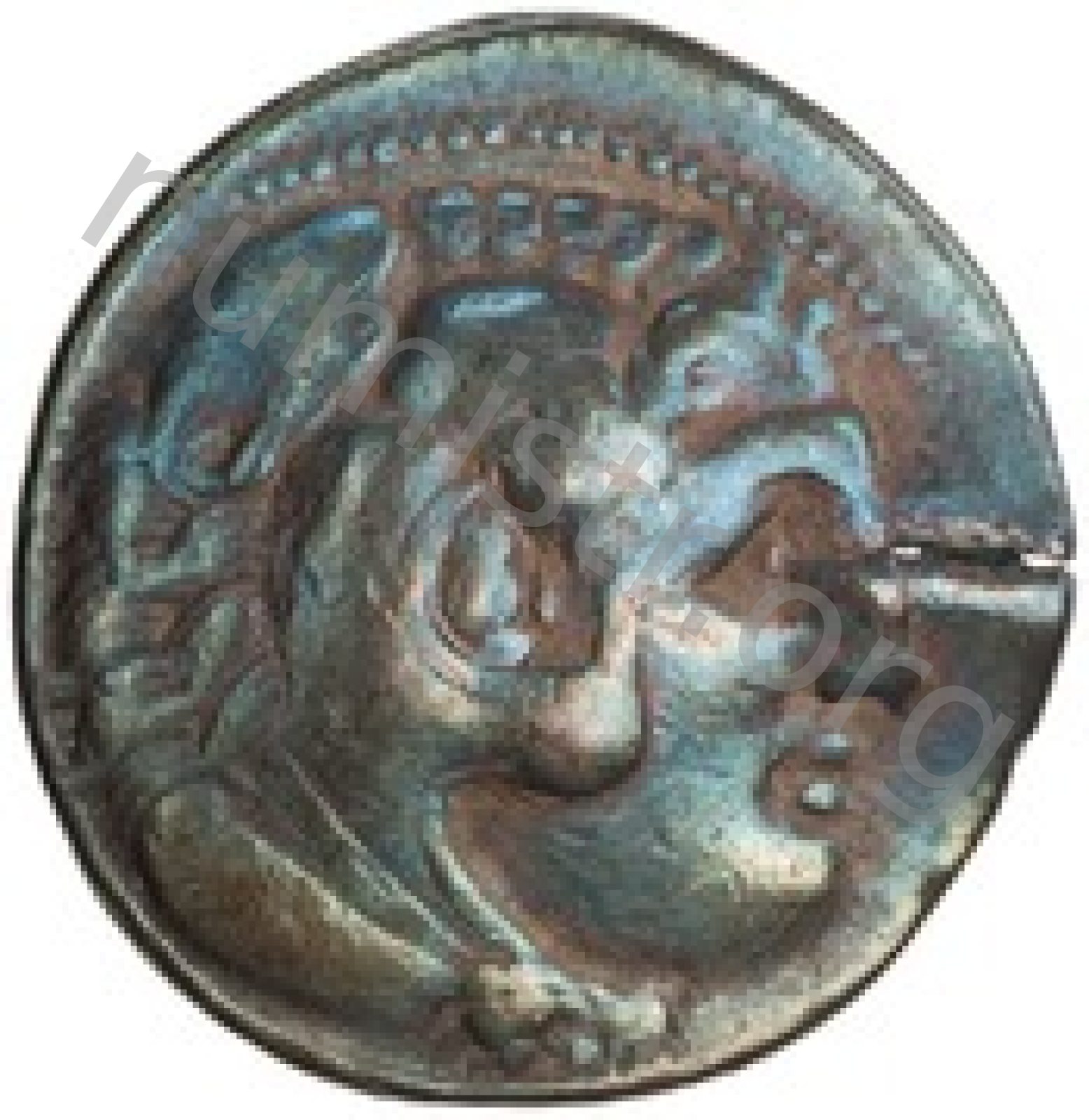 Head of beardless Heracles right wearing lion skin headdress -[en]