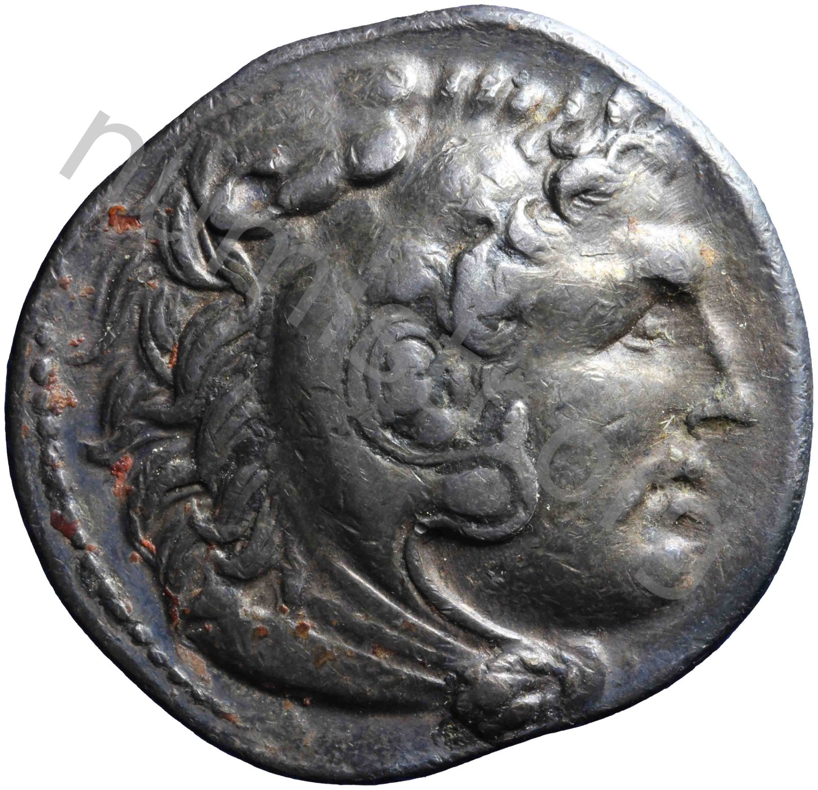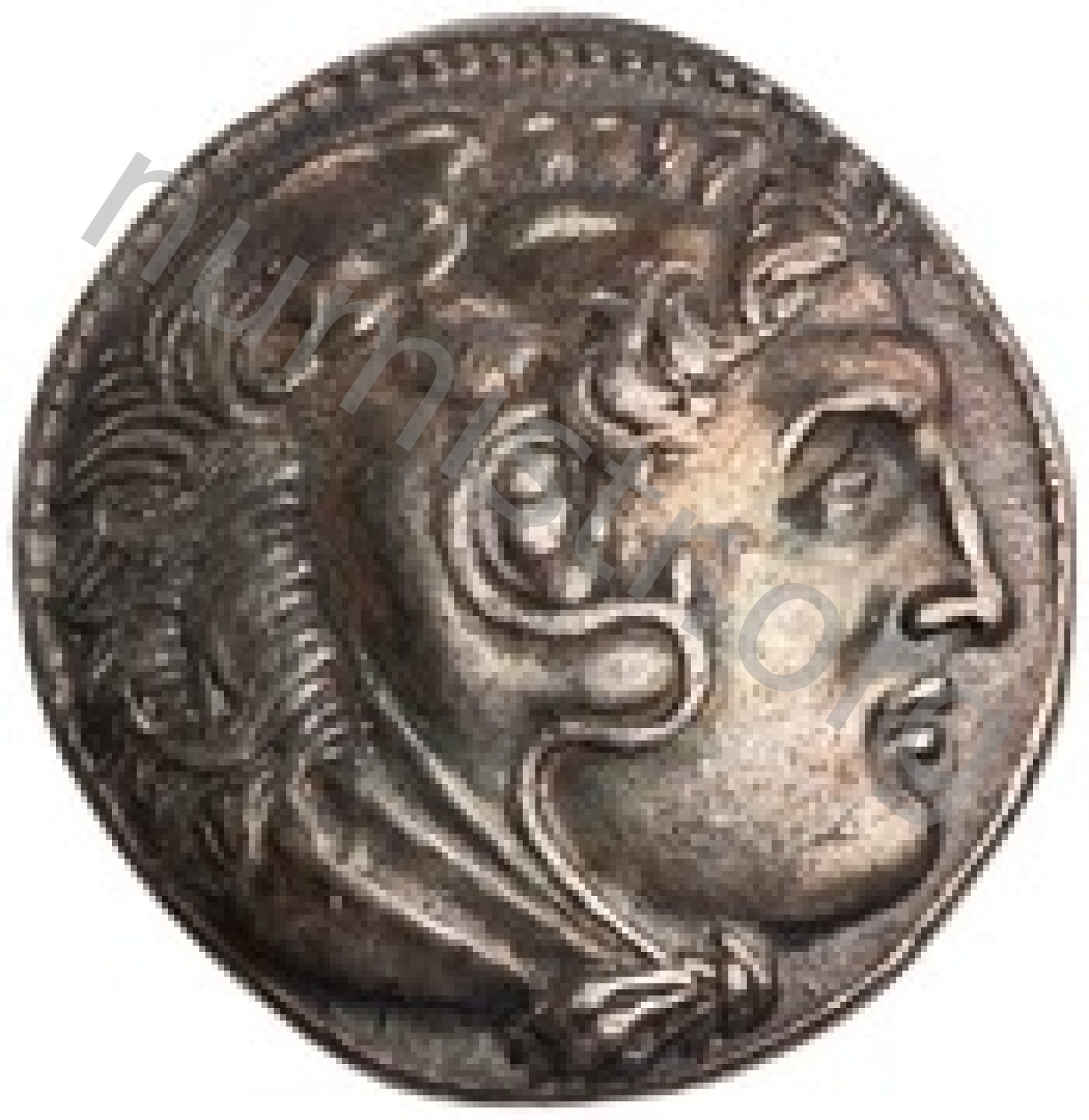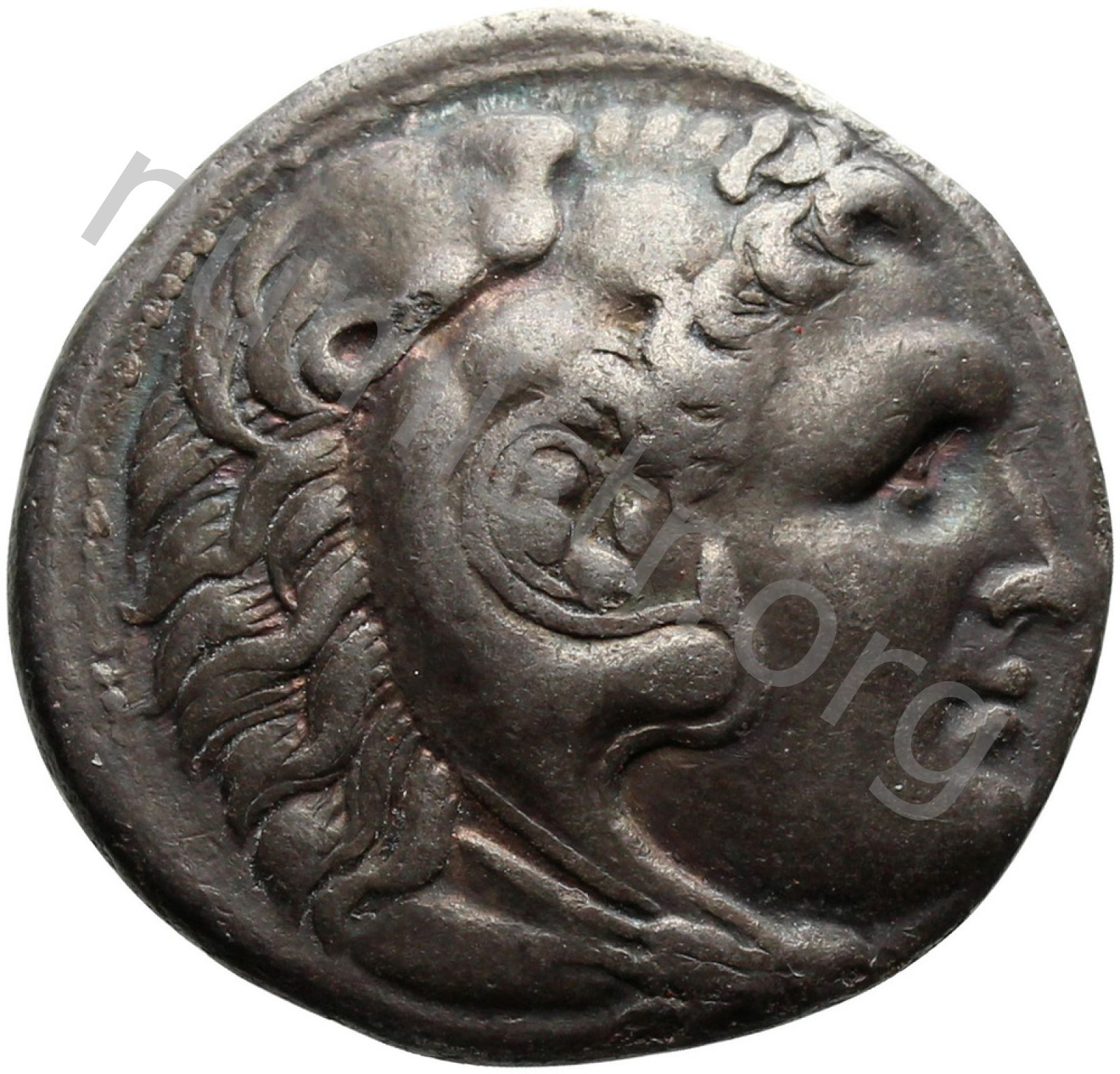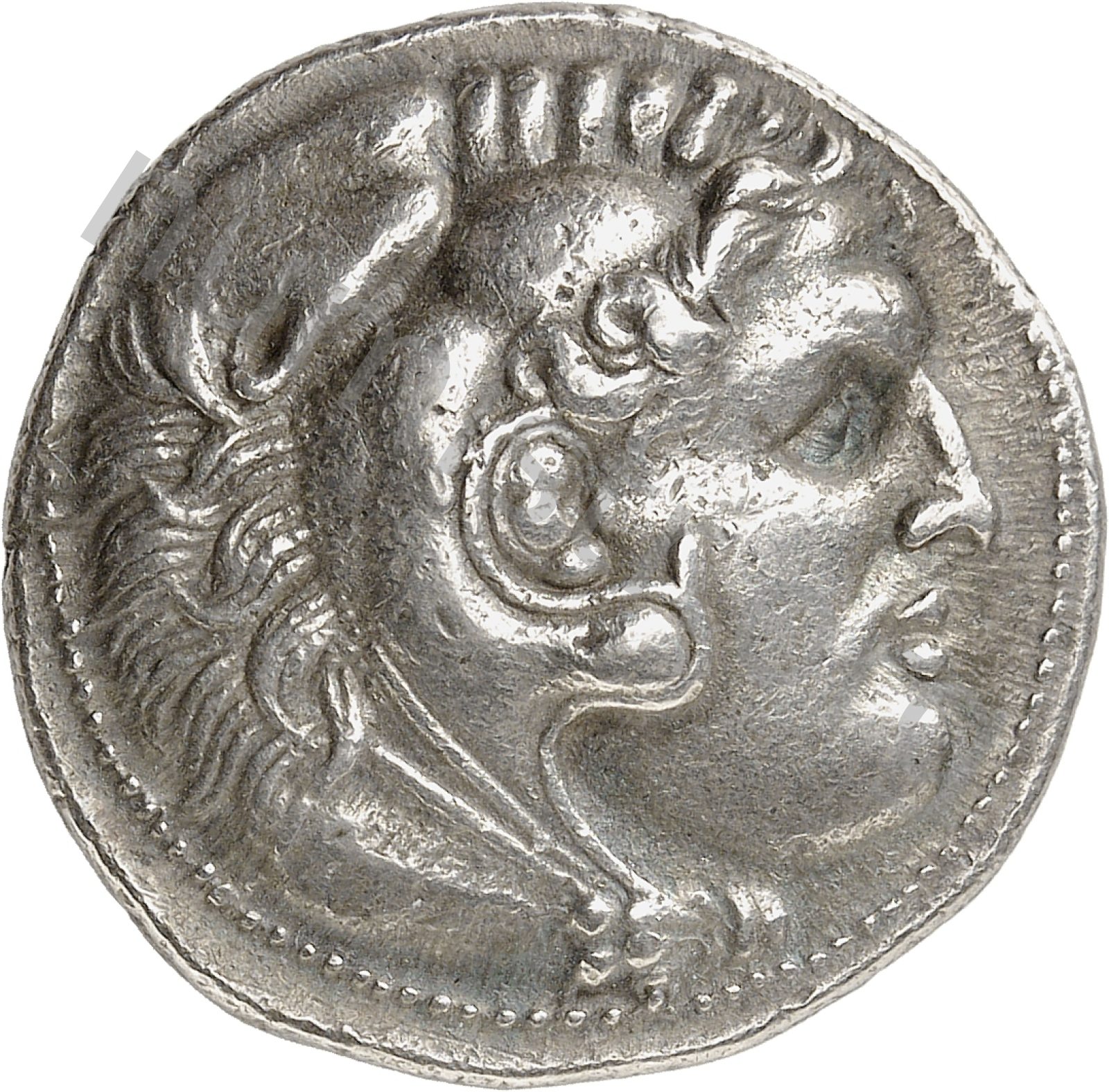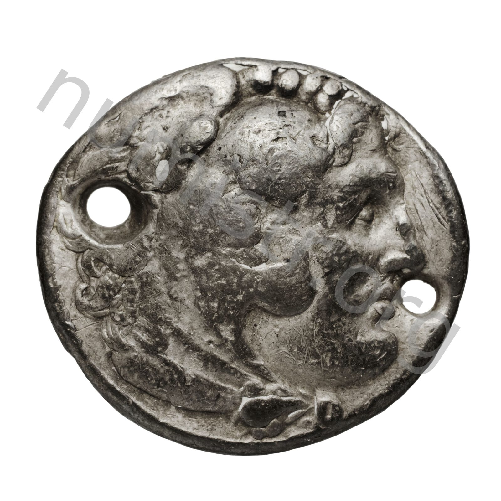 Head of beardless Heracles right wearing lion skin headdress -[en]