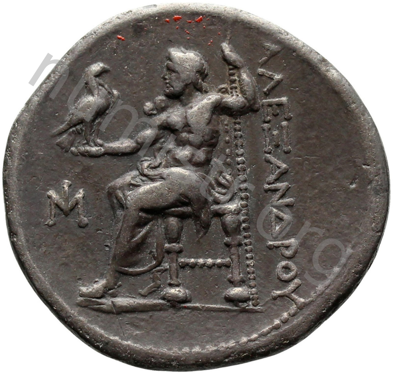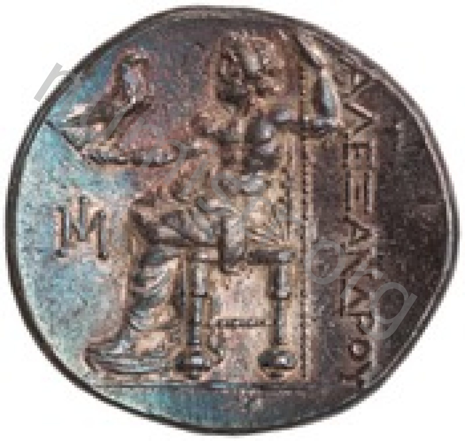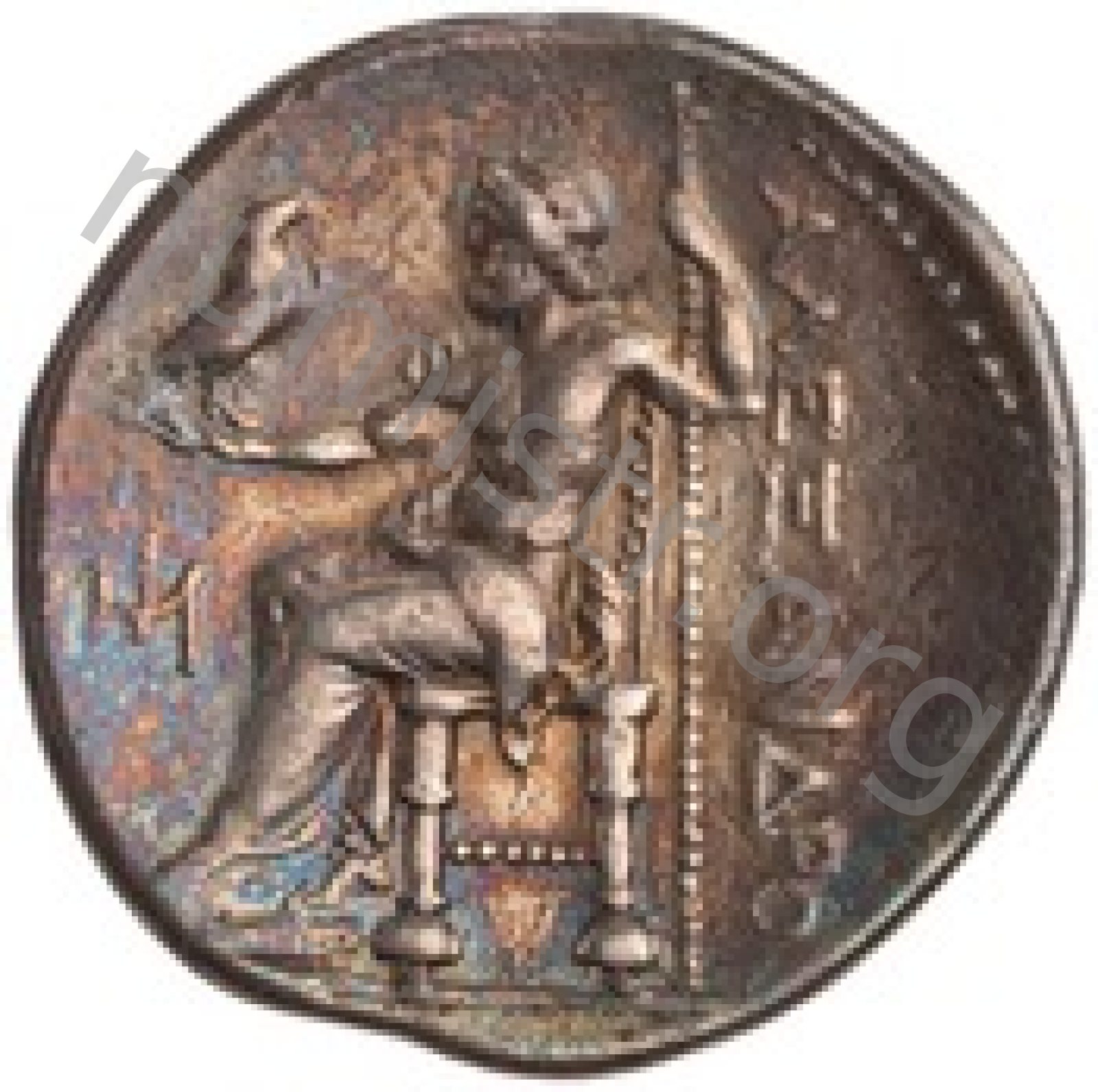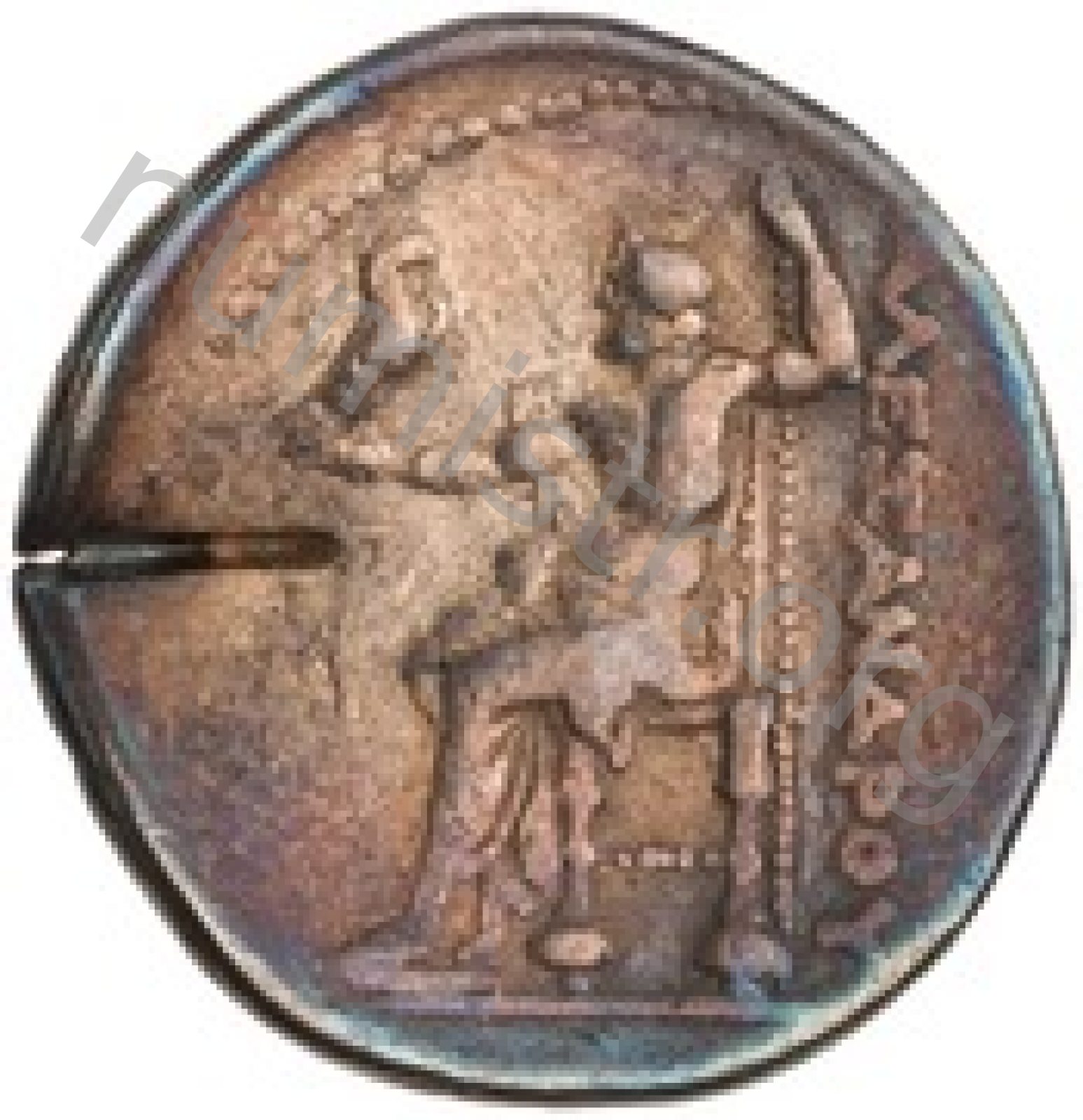 Zeus tabure-tahtta oturuyor sol elinde kartal sağ elinde asa var.