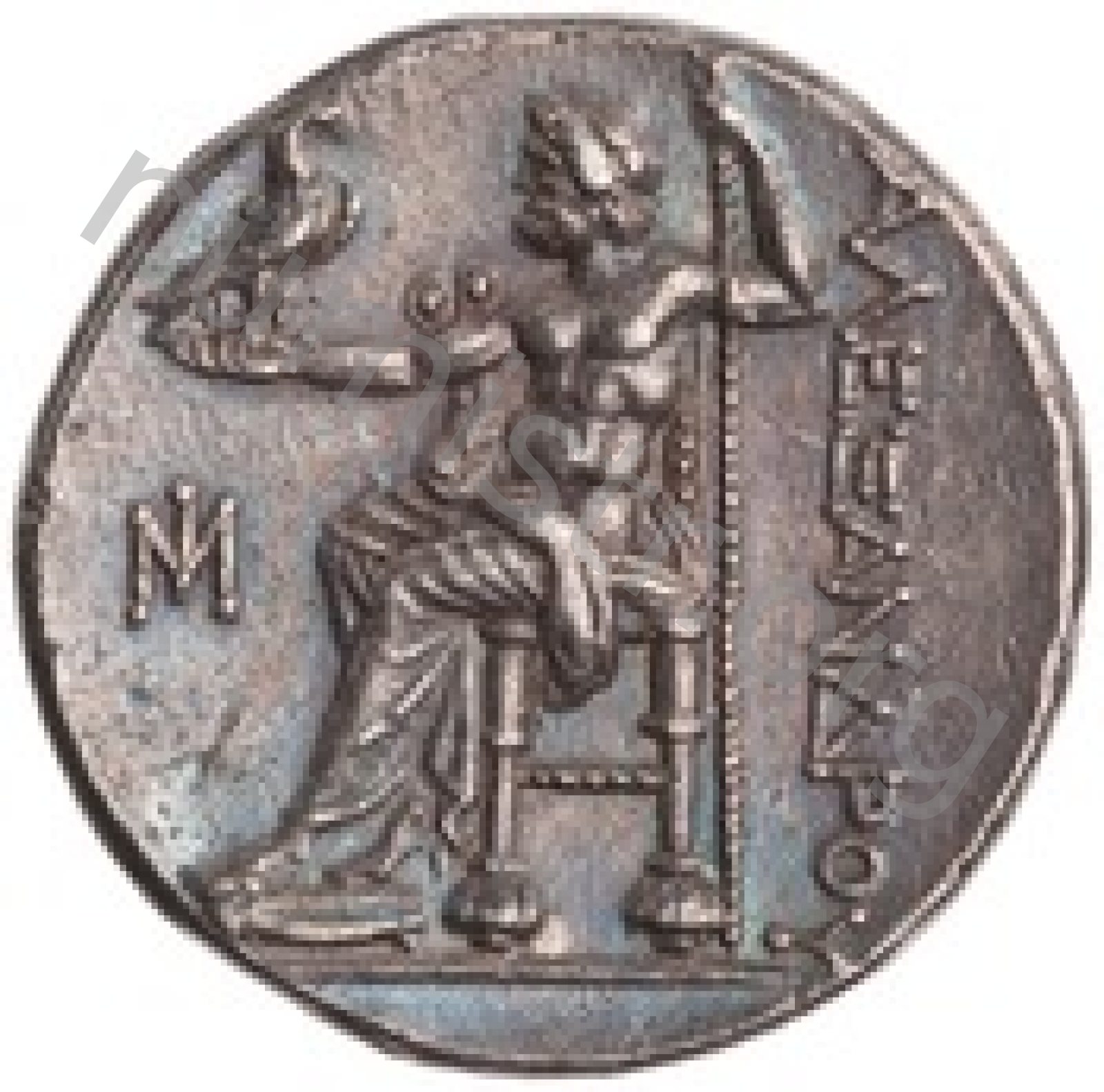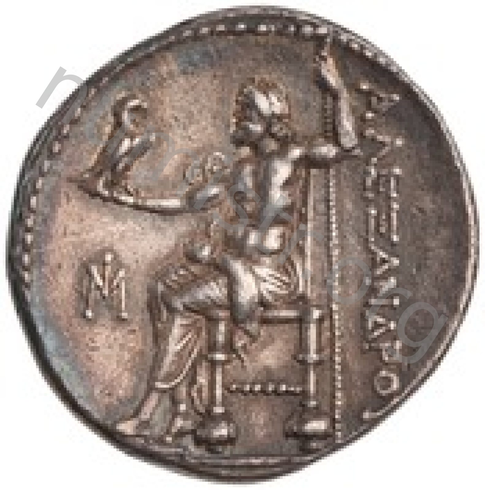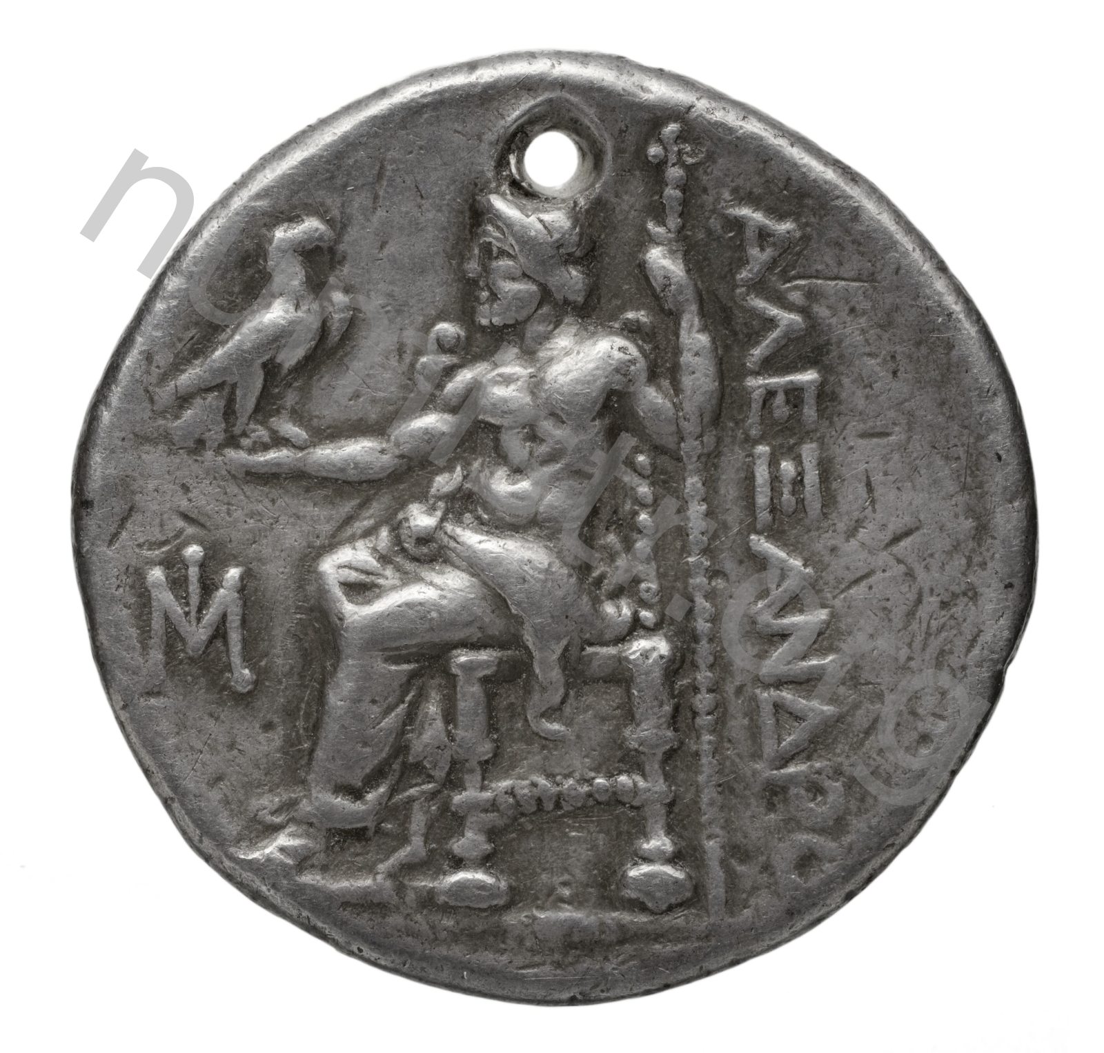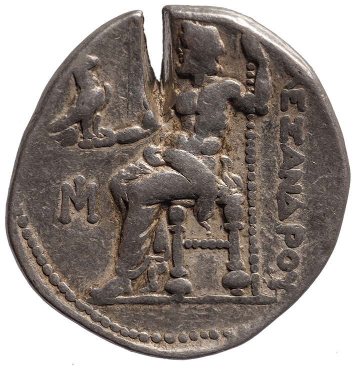 Zeus tabure-tahtta oturuyor sol elinde kartal sağ elinde asa var.