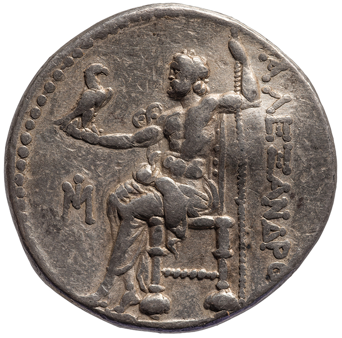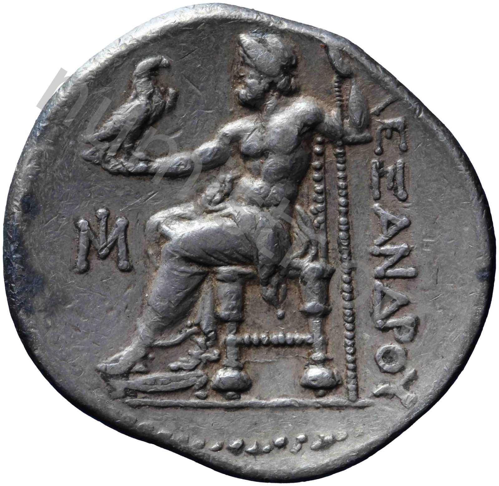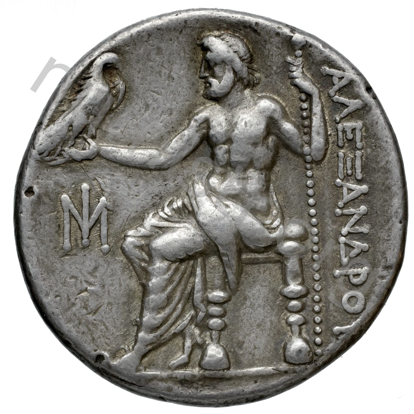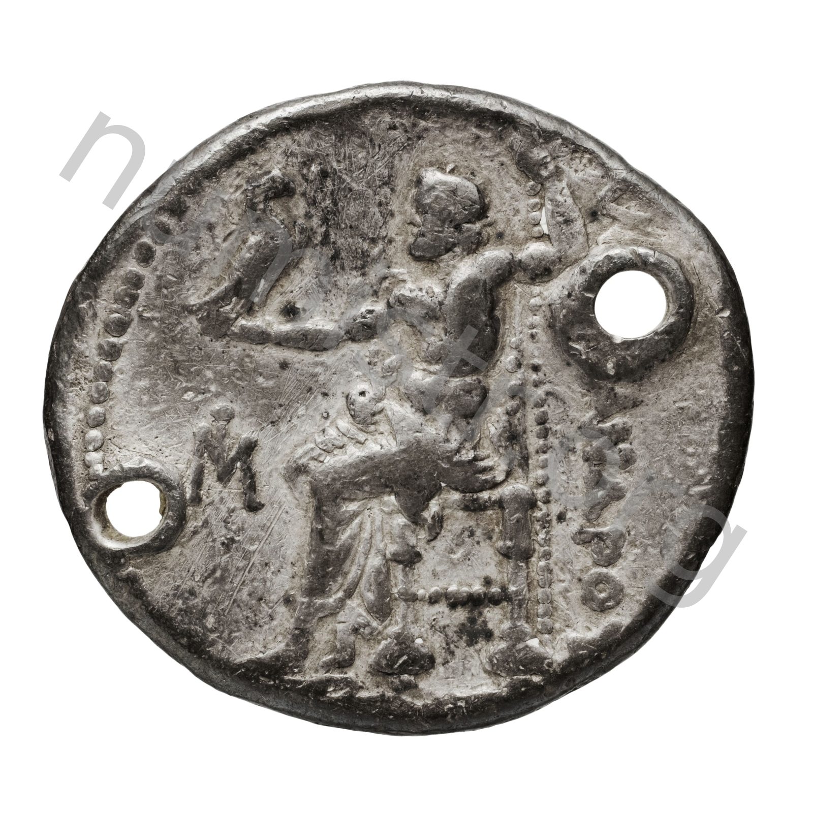 Zeus tabure-tahtta oturuyor sol elinde kartal sağ elinde asa var.