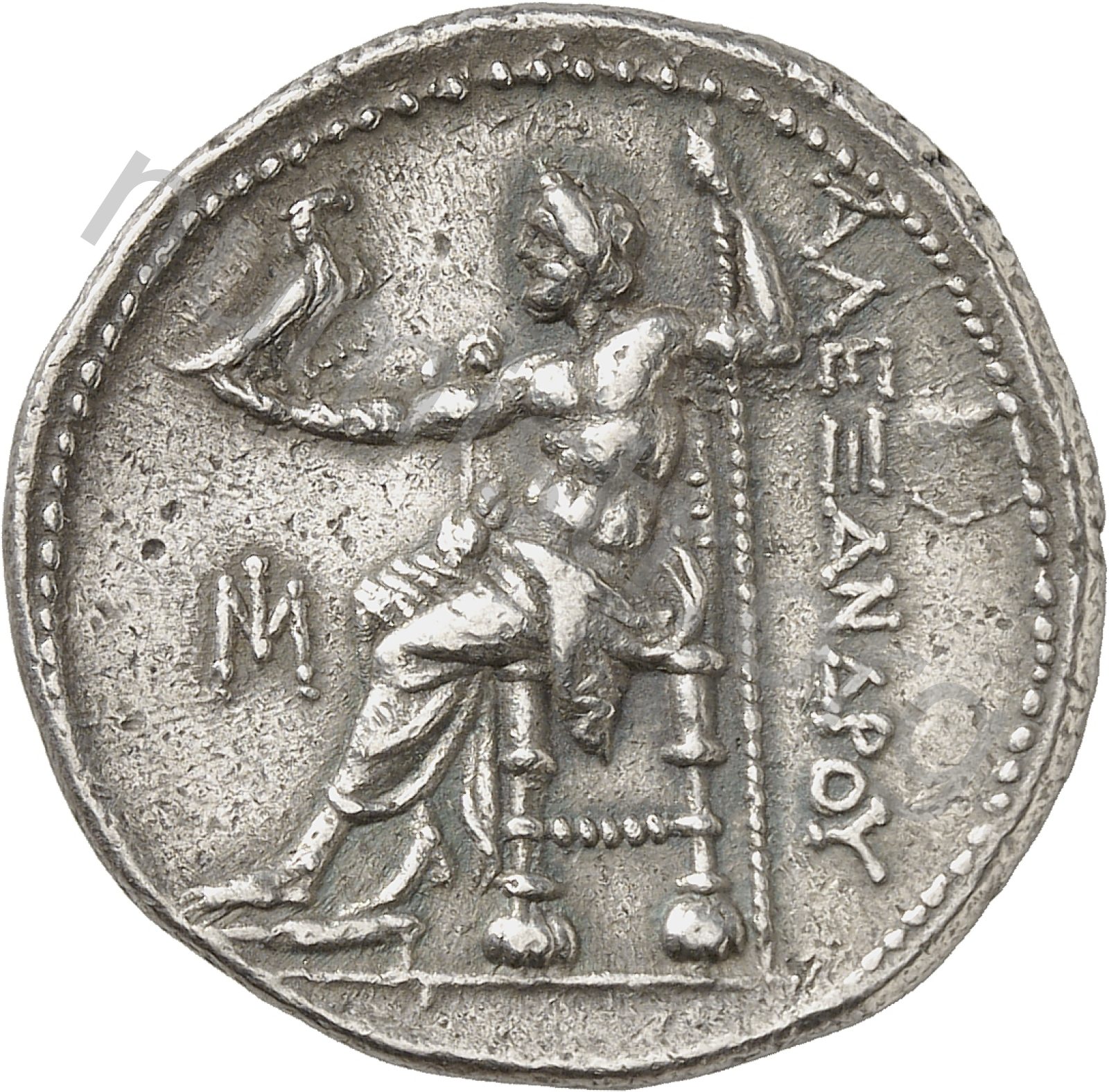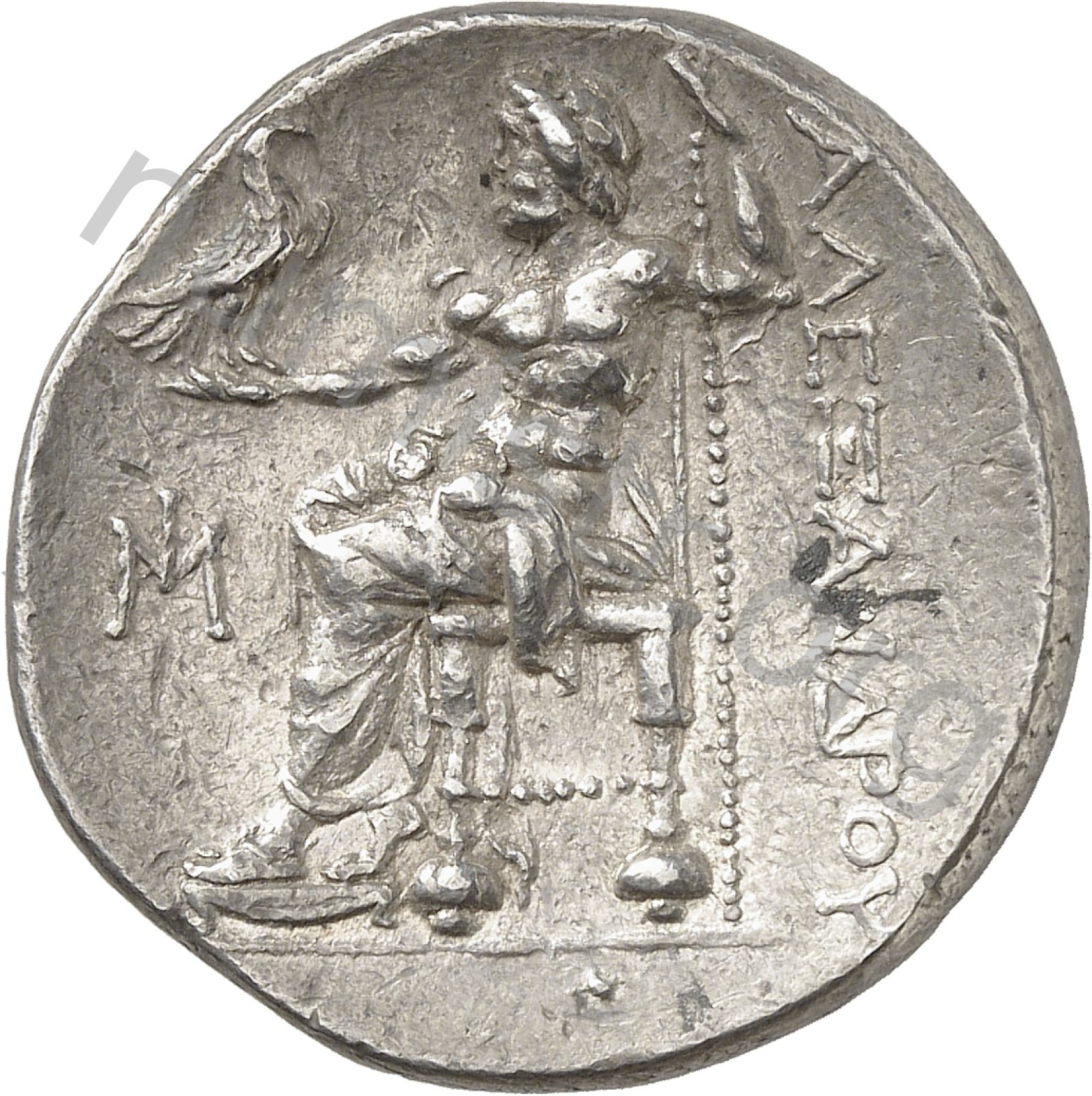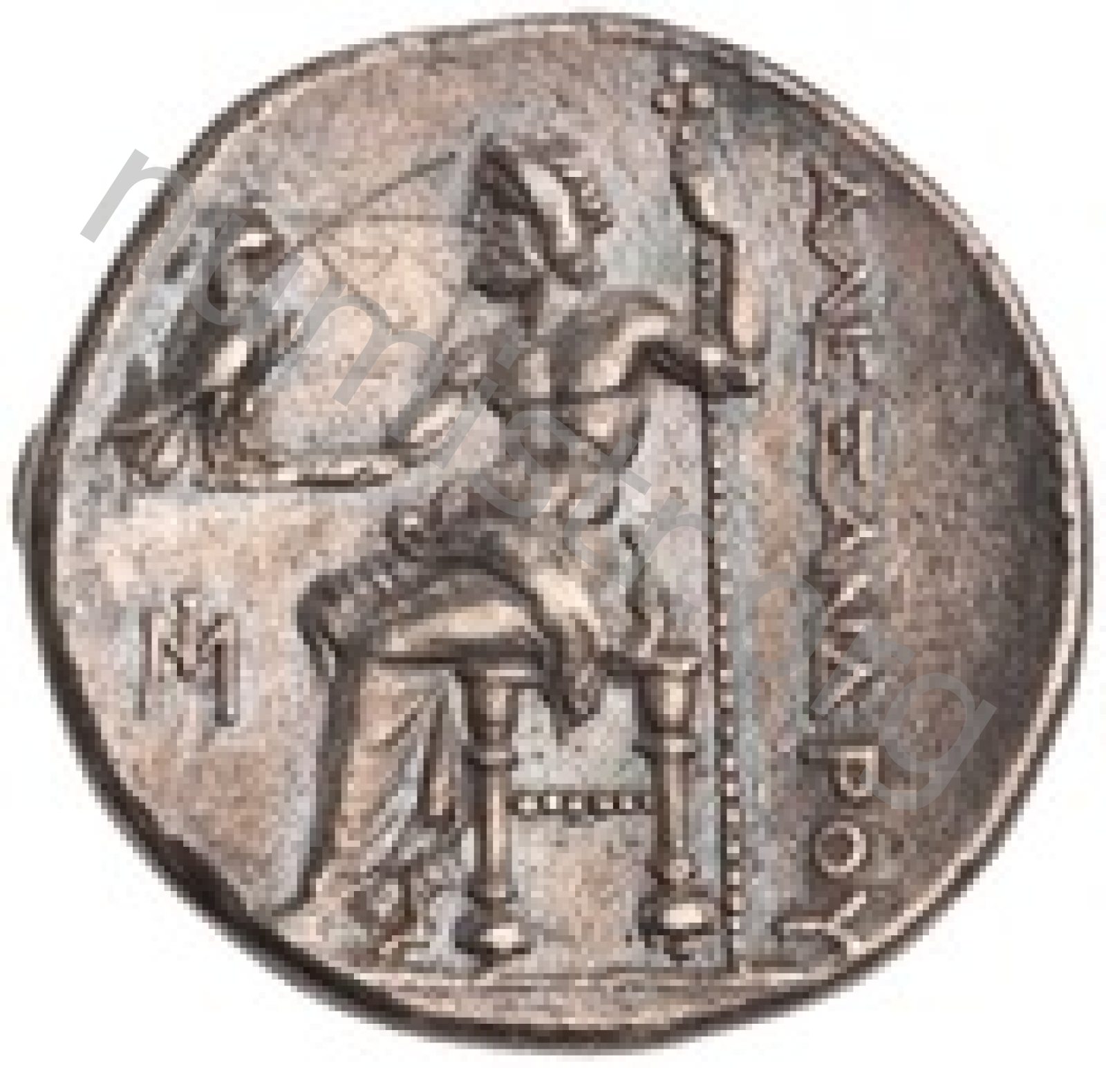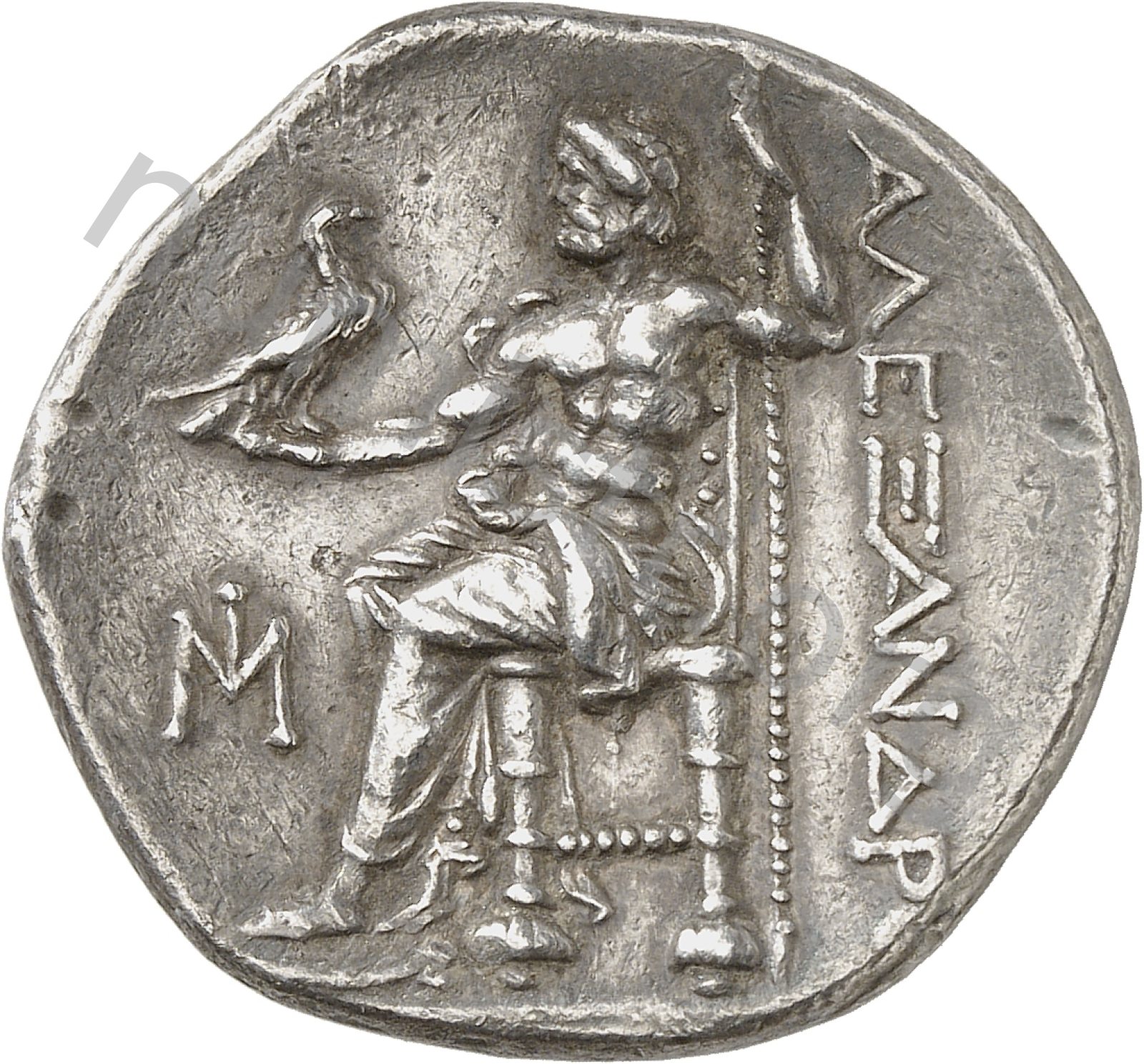 Zeus seated on stool-throne left eagle on outstretched right hand sceptre in left hand -[en]