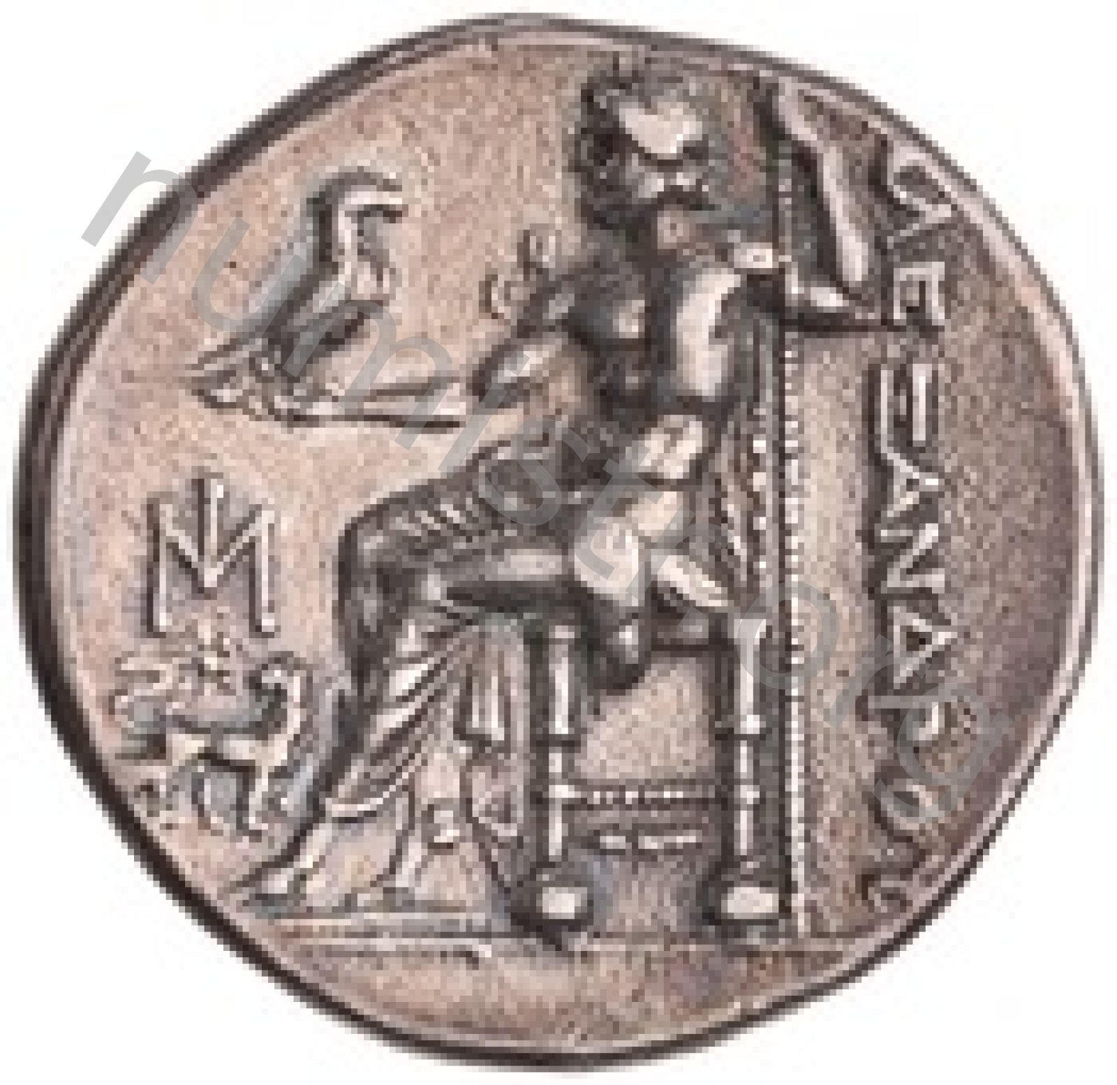 Zeus tabure-tahtta oturuyor sol elinde kartal sağ elinde asa var.