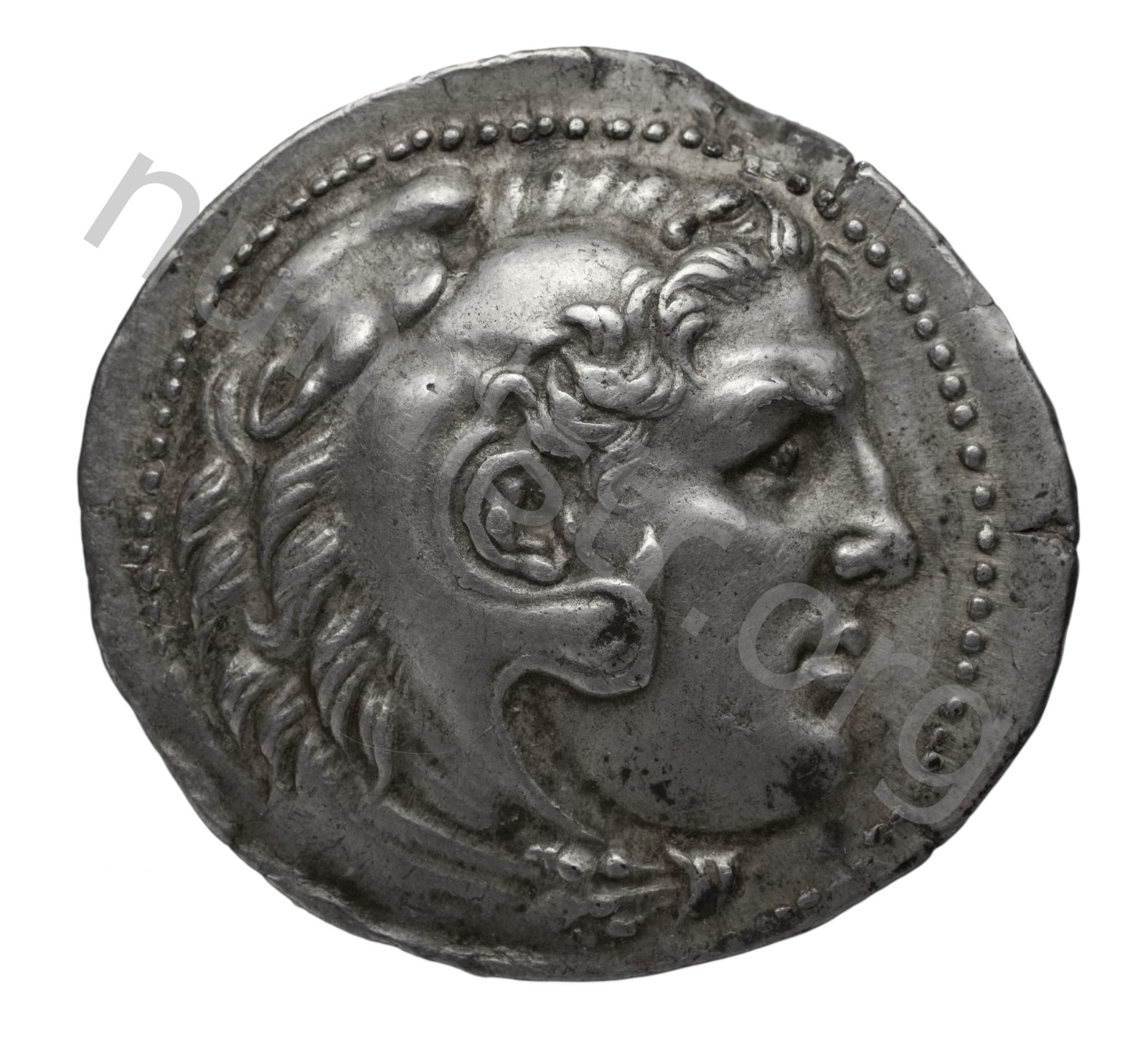 Head of beardless Heracles right wearing lion skin headdress -[en]