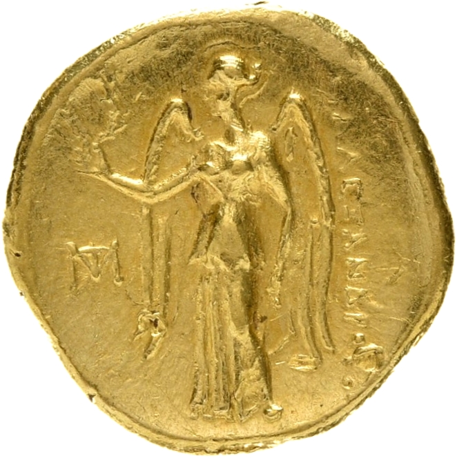 Solda duran ve elinde çelenk ve palmiye dalı tutan Nike